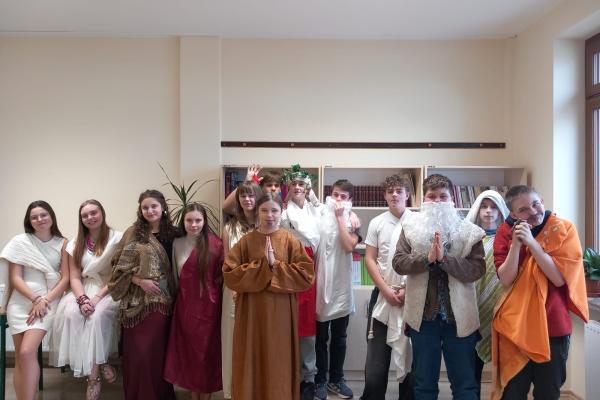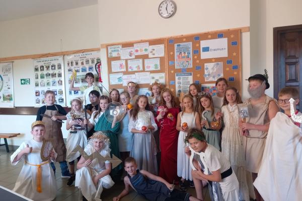 dodano dnia: 30 listopada 2025 / 21:50Czytaj więcejW listopadzie uczniowie klasy Vb zrealizowali fascynujący projekt międzyprzedmiotowy „Z wizytą na Olimpie”. W trakcie zajęć z języka polskiego i historii poznawali mity greckie oraz wcielali się w role greckich bogów i bogiń. Każdy uczeń przygotował strój i charakterystyczne atrybuty swojej postaci, a następnie zaprezentował przed klasą informacje o wybranym bóstwie.