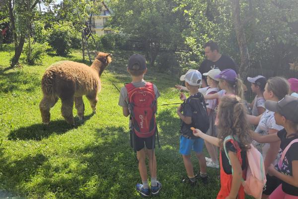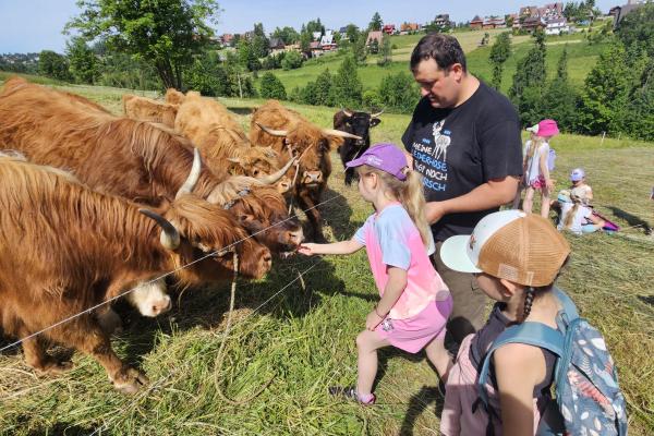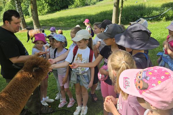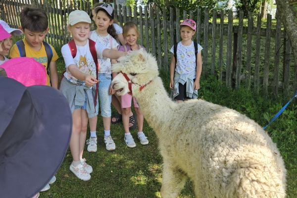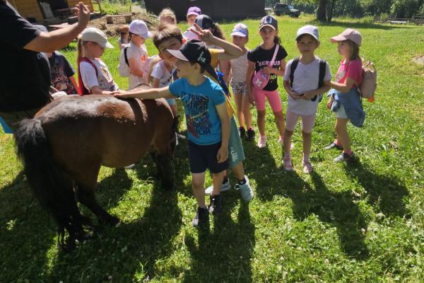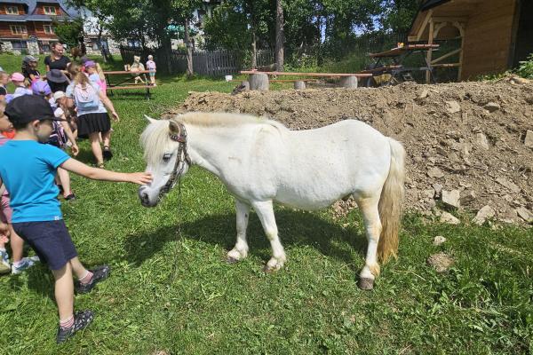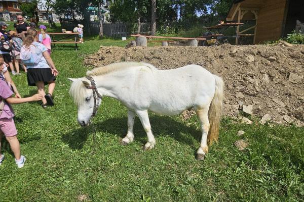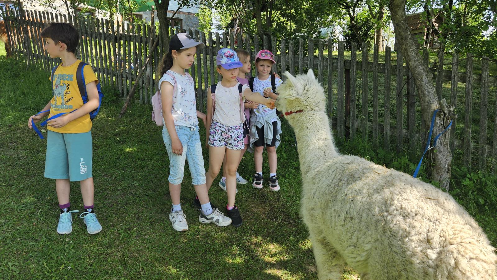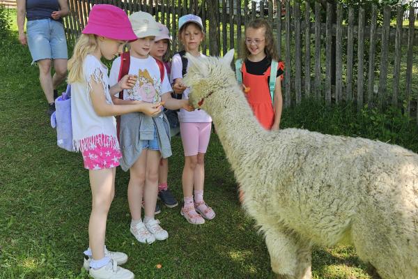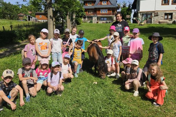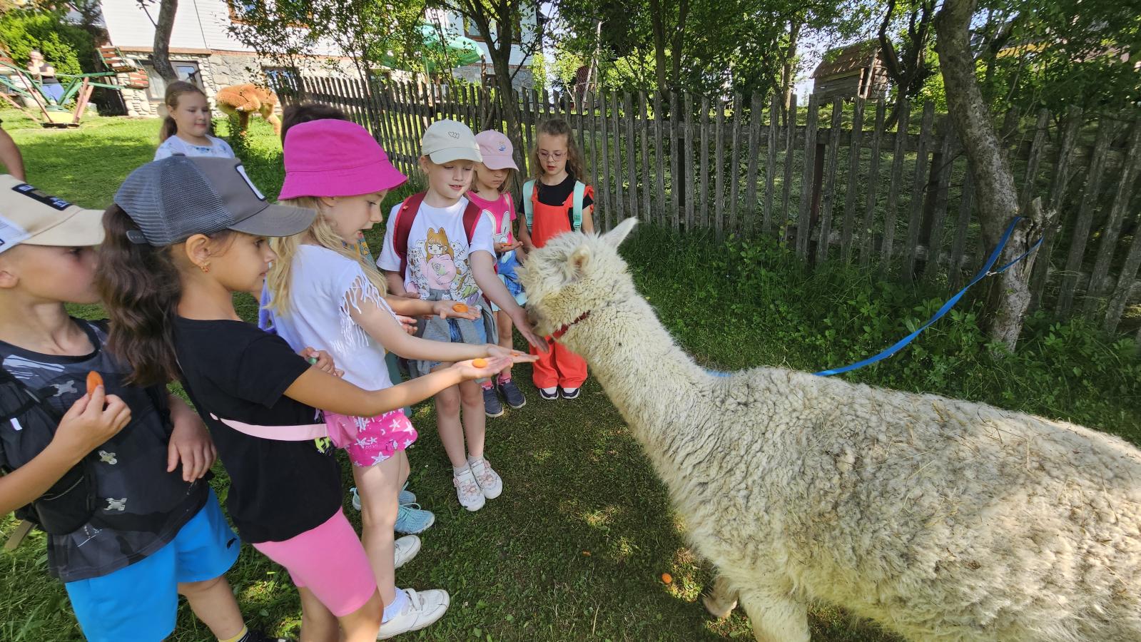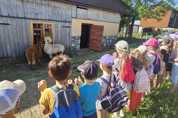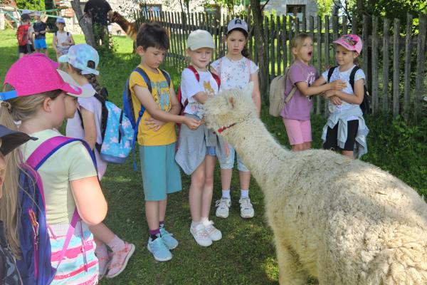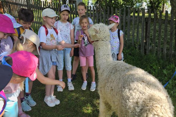 Dzieci miały okazję zobaczyć z bliska zwierzęta hodowlane, takie jak: kozy, owce, krowy, alpaki, kucyki, a także wyjątkowe krowy z długą sierścią. Największą radość sprawiła możliwość pogłaskania i nakarmienia zwierząt, a niektóre dzieci po raz pierwszy w życiu mogły poczuć, jak to jest jechać na kucyku! Nie zabrakło również akcentów ogrodniczych – dzieci zwiedziły piękny ogródek, pełen różnorodnych warzyw, a następnie wzięły udział w zabawnym quizie „Co to za warzywo?”, który wywołał wiele śmiechu i radości. Po pełnym wrażeń zwiedzaniu przyszedł czas na zabawy na świeżym powietrzu oraz wspólne ognisko z pieczeniem kiełbasek, które smakowały wyjątkowo po tak aktywnym dniu.