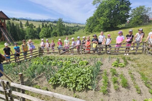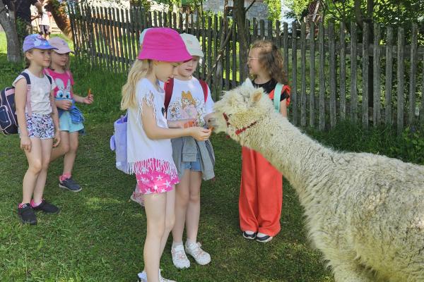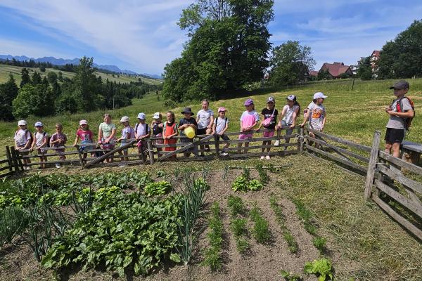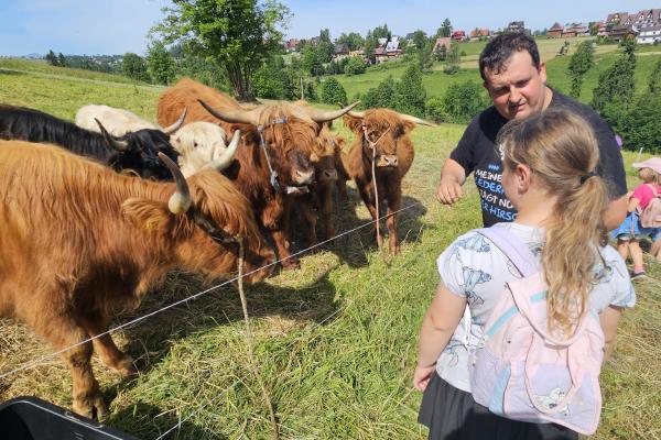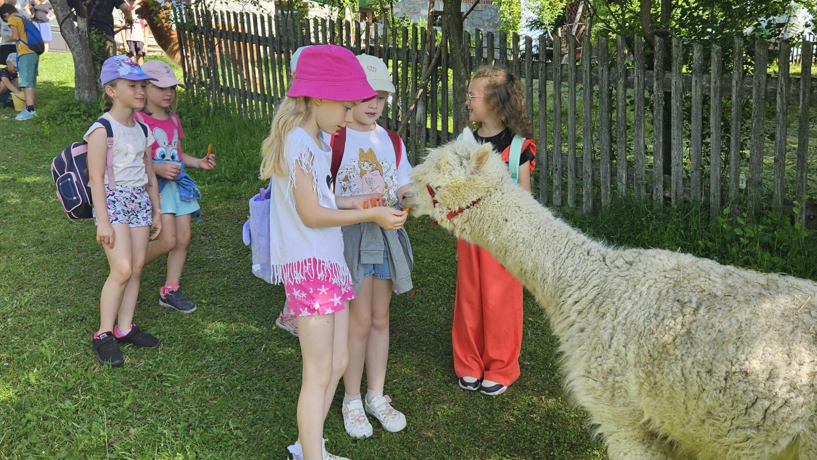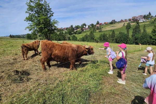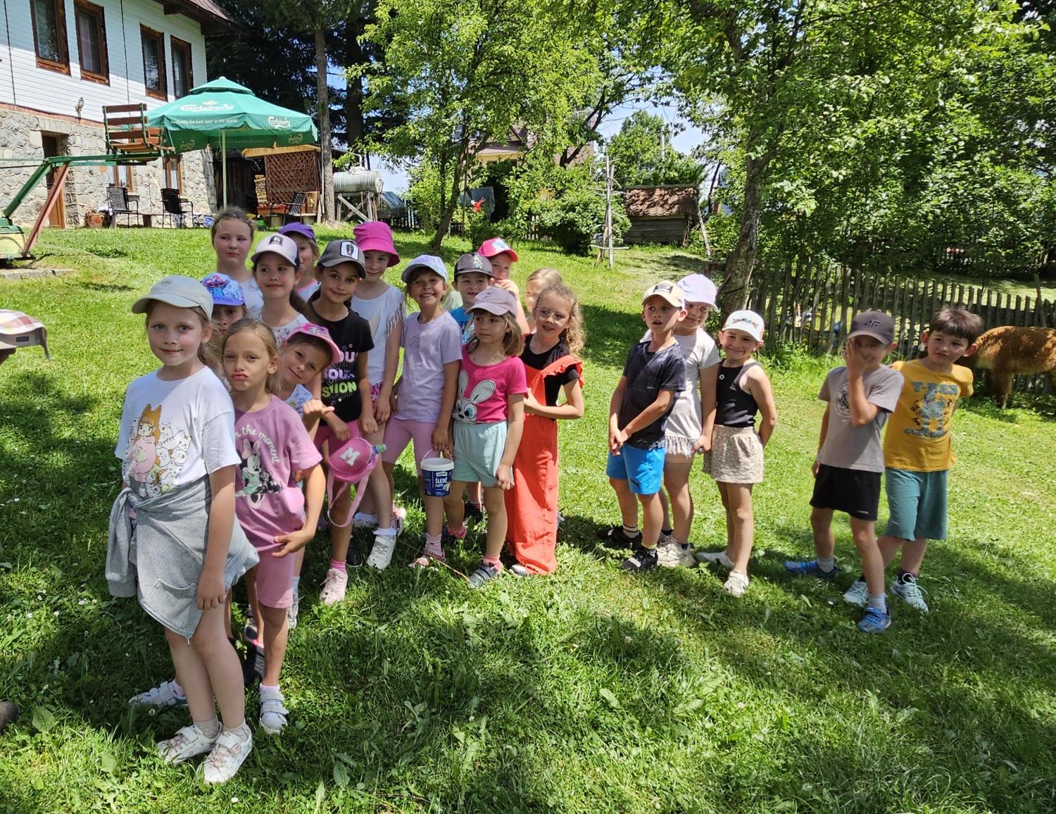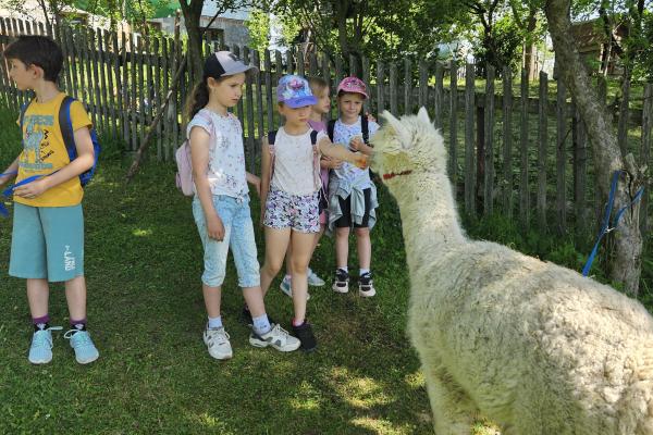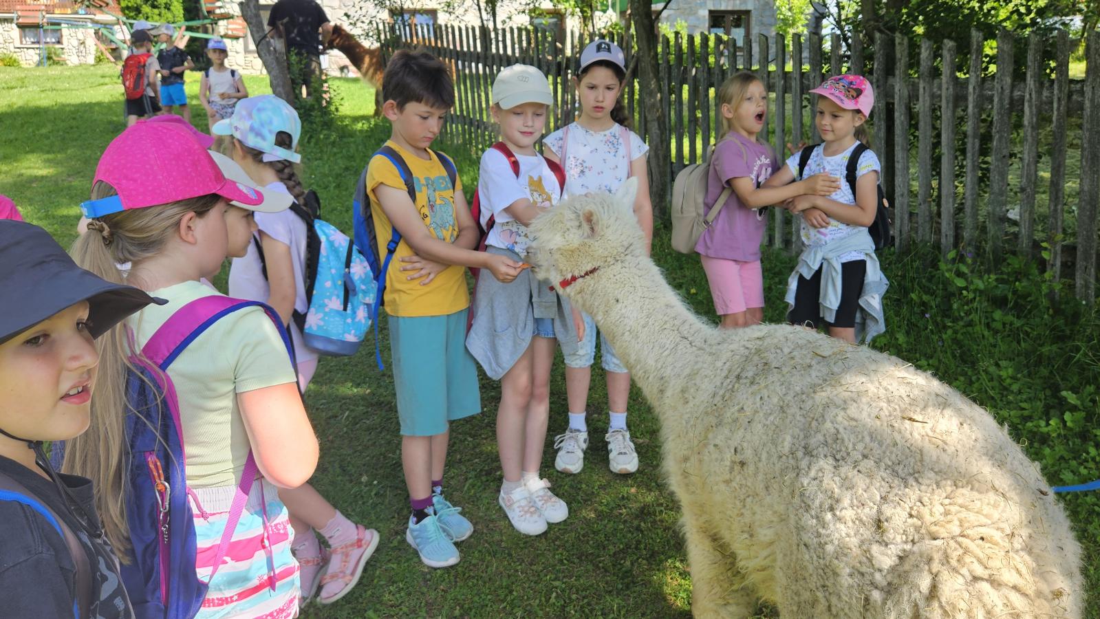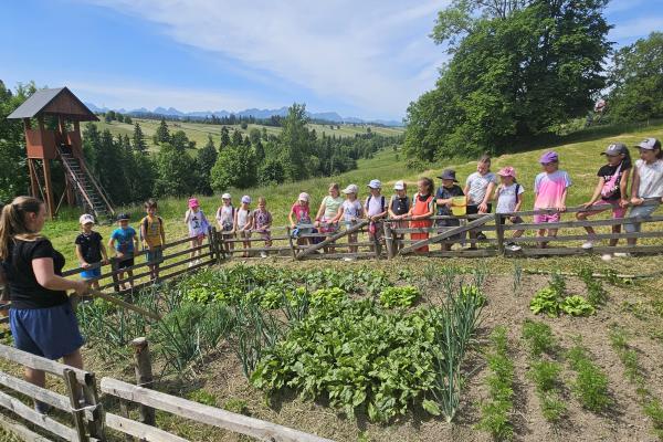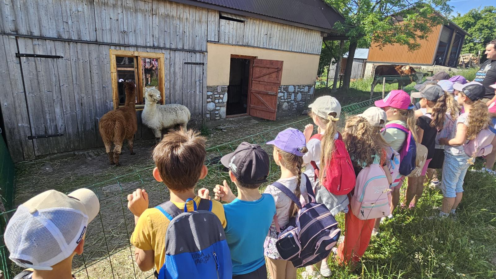Dzieci miały okazję zobaczyć z bliska zwierzęta hodowlane, takie jak: kozy, owce, krowy, alpaki, kucyki, a także wyjątkowe krowy z długą sierścią. Największą radość sprawiła możliwość pogłaskania i nakarmienia zwierząt, a niektóre dzieci po raz pierwszy w życiu mogły poczuć, jak to jest jechać na kucyku! Nie zabrakło również akcentów ogrodniczych – dzieci zwiedziły piękny ogródek, pełen różnorodnych warzyw, a następnie wzięły udział w zabawnym quizie „Co to za warzywo?”, który wywołał wiele śmiechu i radości. Po pełnym wrażeń zwiedzaniu przyszedł czas na zabawy na świeżym powietrzu oraz wspólne ognisko z pieczeniem kiełbasek, które smakowały wyjątkowo po tak aktywnym dniu.