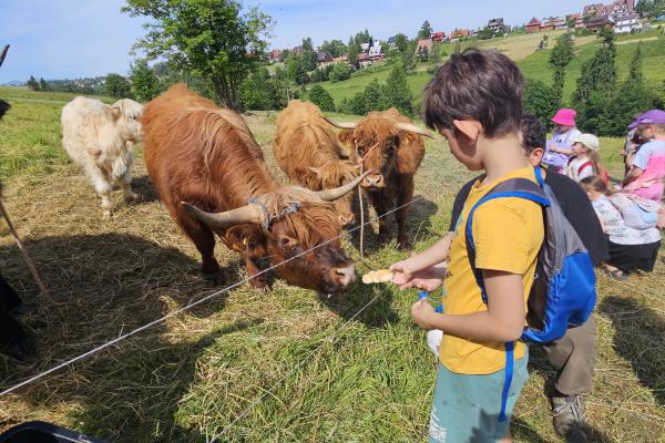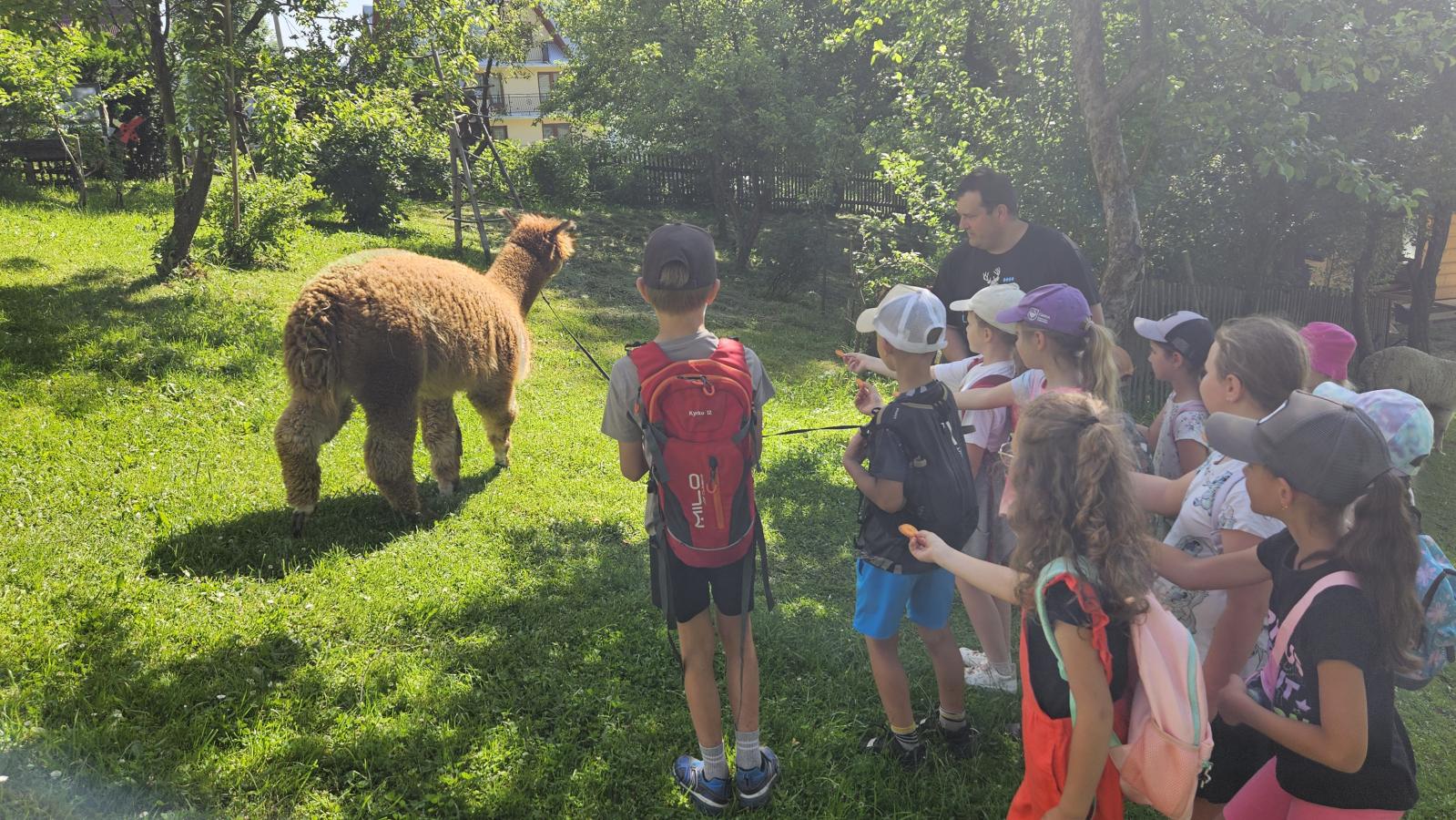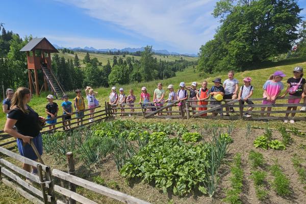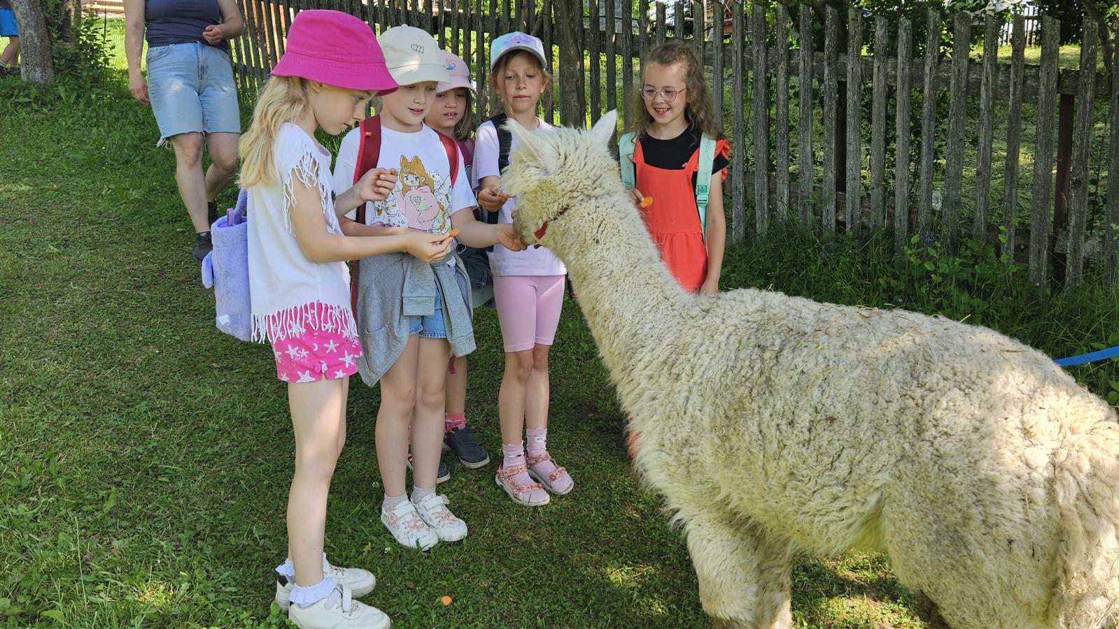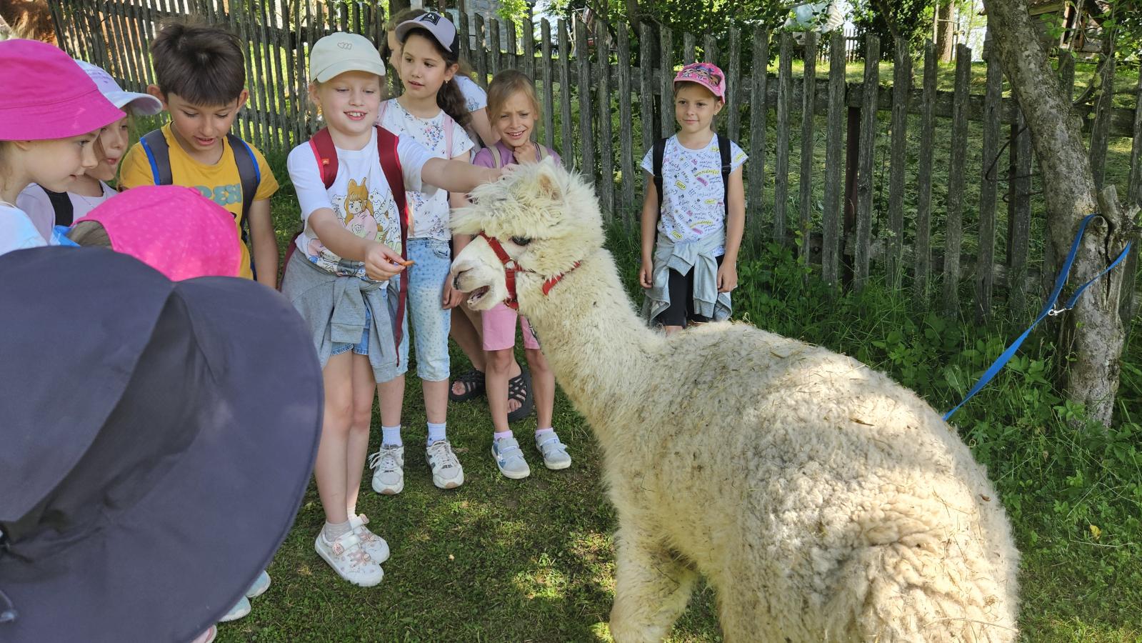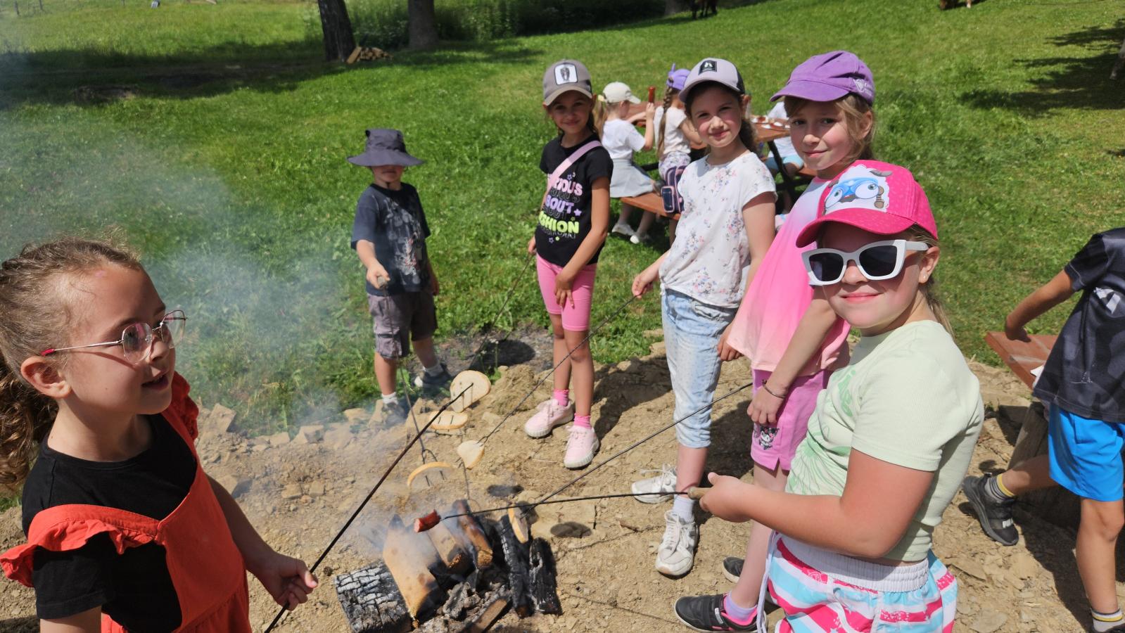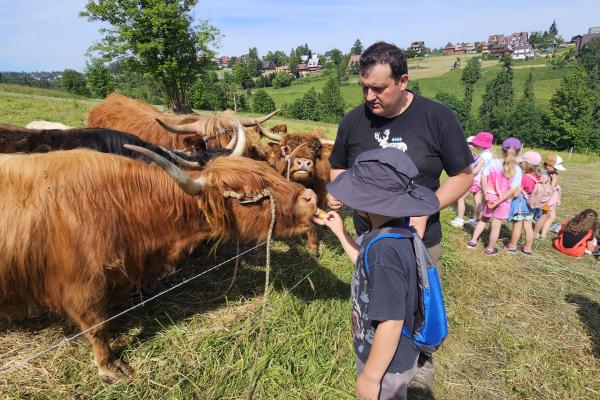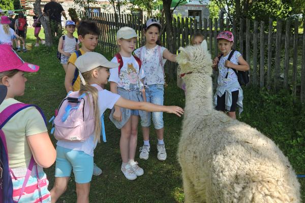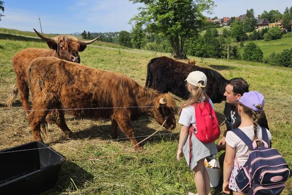 Dzieci miały okazję zobaczyć z bliska zwierzęta hodowlane, takie jak: kozy, owce, krowy, alpaki, kucyki, a także wyjątkowe krowy z długą sierścią. Największą radość sprawiła możliwość pogłaskania i nakarmienia zwierząt, a niektóre dzieci po raz pierwszy w życiu mogły poczuć, jak to jest jechać na kucyku! Nie zabrakło również akcentów ogrodniczych – dzieci zwiedziły piękny ogródek, pełen różnorodnych warzyw, a następnie wzięły udział w zabawnym quizie „Co to za warzywo?”, który wywołał wiele śmiechu i radości. Po pełnym wrażeń zwiedzaniu przyszedł czas na zabawy na świeżym powietrzu oraz wspólne ognisko z pieczeniem kiełbasek, które smakowały wyjątkowo po tak aktywnym dniu.