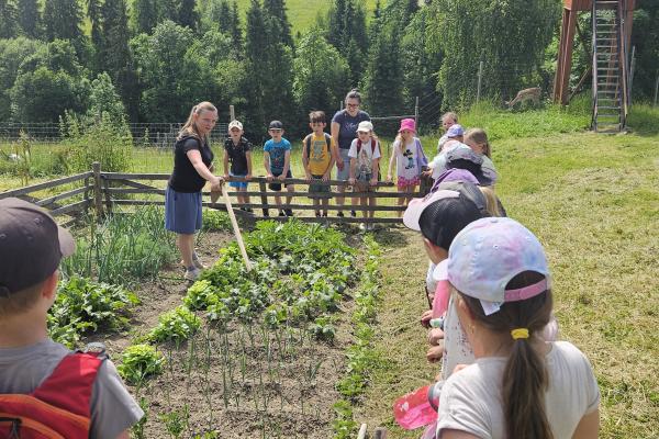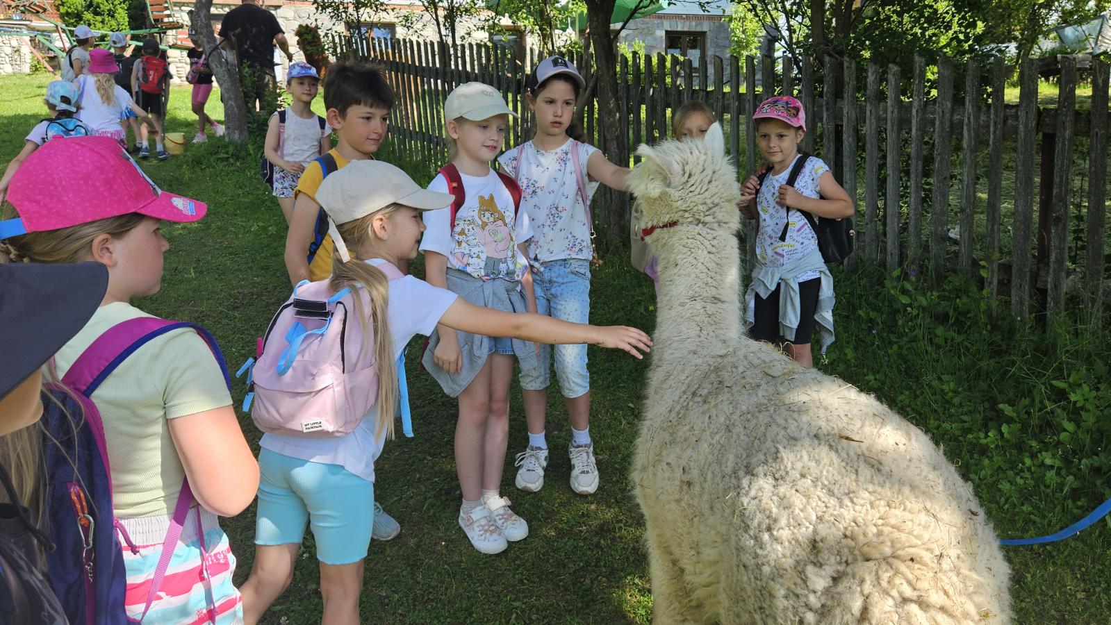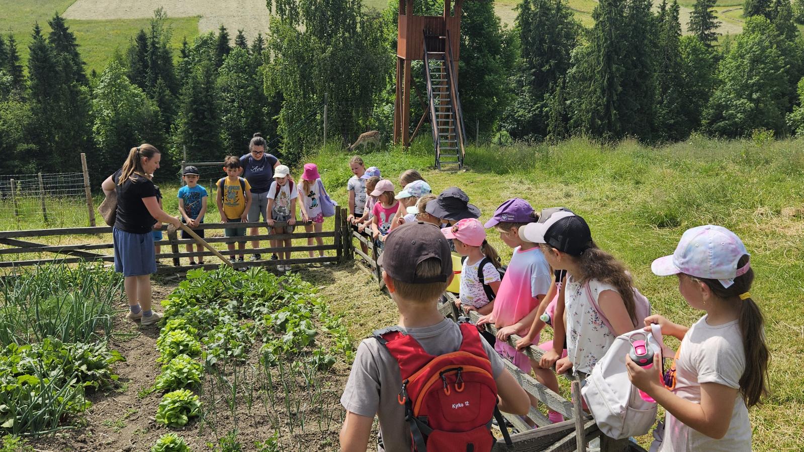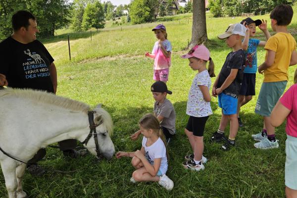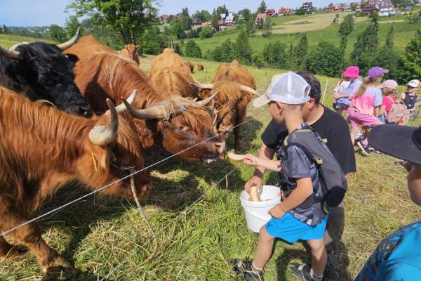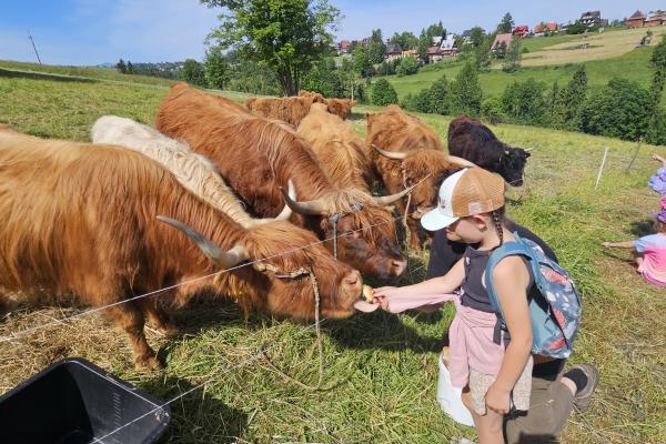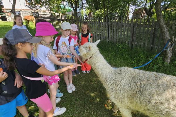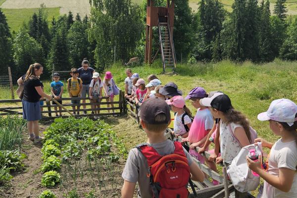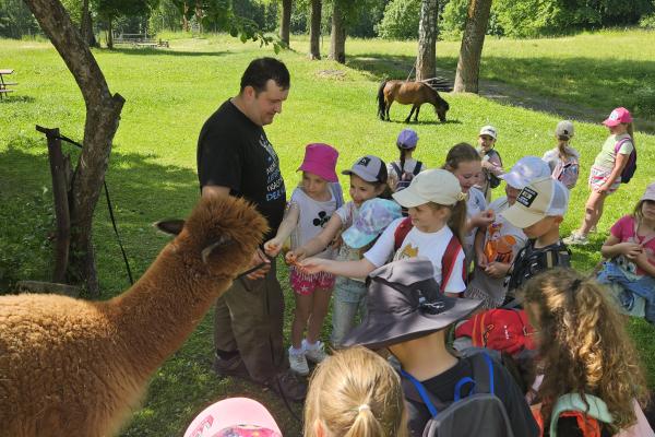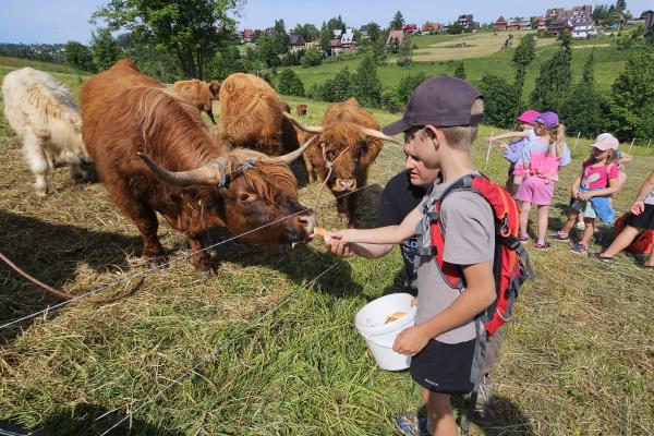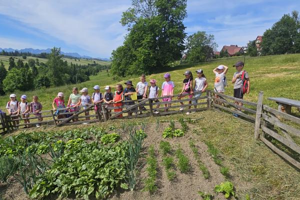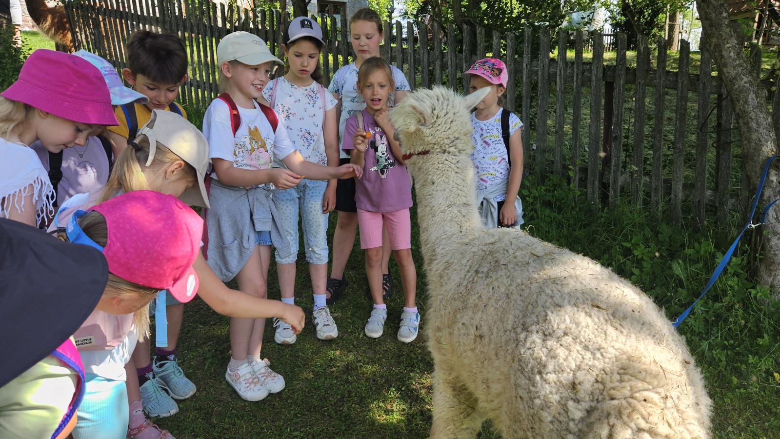 Dzieci miały okazję zobaczyć z bliska zwierzęta hodowlane, takie jak: kozy, owce, krowy, alpaki, kucyki, a także wyjątkowe krowy z długą sierścią. Największą radość sprawiła możliwość pogłaskania i nakarmienia zwierząt, a niektóre dzieci po raz pierwszy w życiu mogły poczuć, jak to jest jechać na kucyku! Nie zabrakło również akcentów ogrodniczych – dzieci zwiedziły piękny ogródek, pełen różnorodnych warzyw, a następnie wzięły udział w zabawnym quizie „Co to za warzywo?”, który wywołał wiele śmiechu i radości. Po pełnym wrażeń zwiedzaniu przyszedł czas na zabawy na świeżym powietrzu oraz wspólne ognisko z pieczeniem kiełbasek, które smakowały wyjątkowo po tak aktywnym dniu.