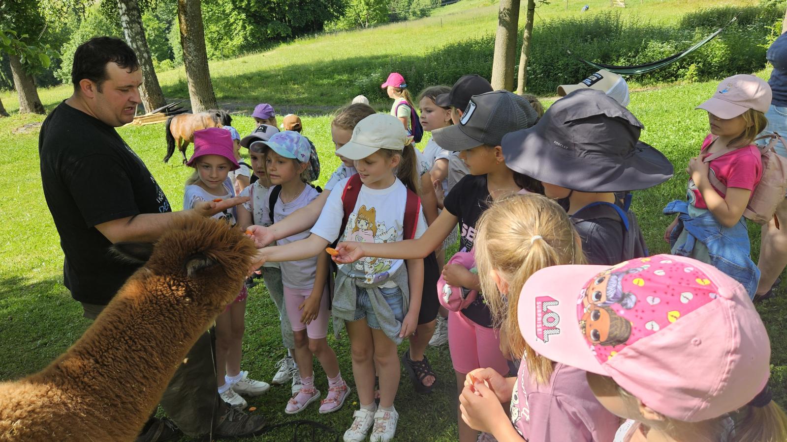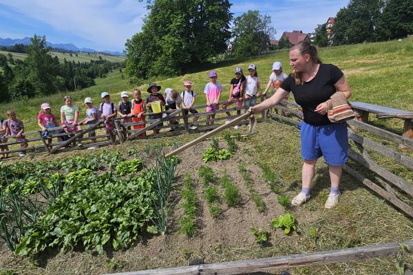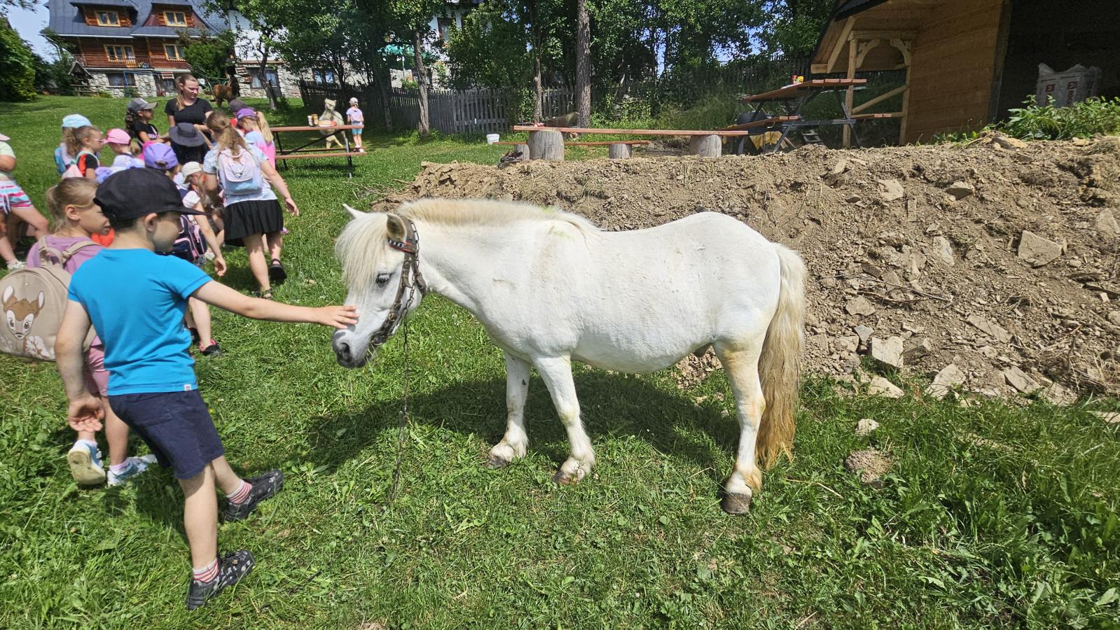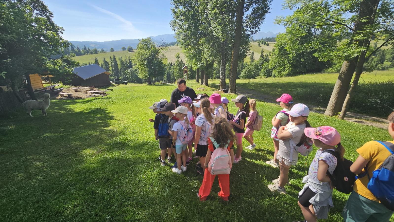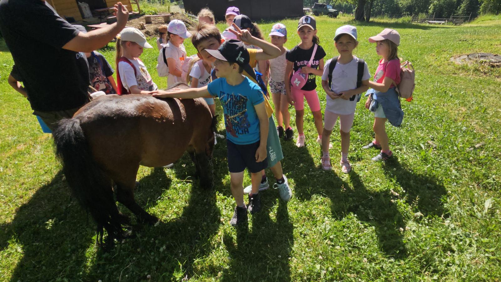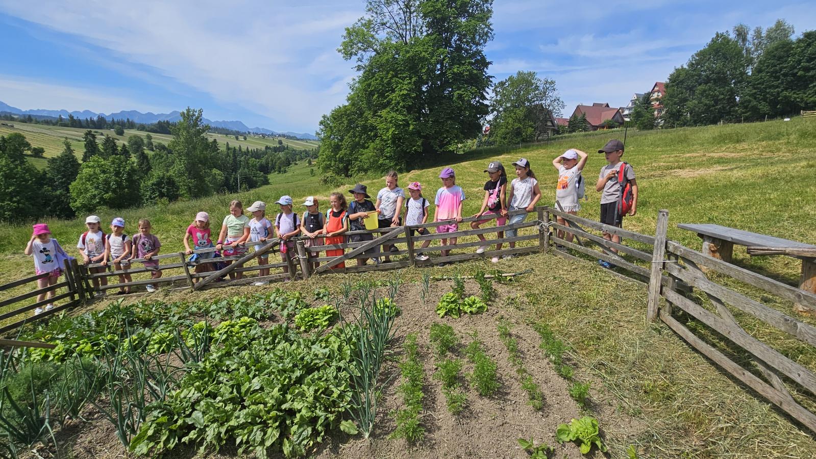 Dzieci miały okazję zobaczyć z bliska zwierzęta hodowlane, takie jak: kozy, owce, krowy, alpaki, kucyki, a także wyjątkowe krowy z długą sierścią. Największą radość sprawiła możliwość pogłaskania i nakarmienia zwierząt, a niektóre dzieci po raz pierwszy w życiu mogły poczuć, jak to jest jechać na kucyku! Nie zabrakło również akcentów ogrodniczych – dzieci zwiedziły piękny ogródek, pełen różnorodnych warzyw, a następnie wzięły udział w zabawnym quizie „Co to za warzywo?”, który wywołał wiele śmiechu i radości. Po pełnym wrażeń zwiedzaniu przyszedł czas na zabawy na świeżym powietrzu oraz wspólne ognisko z pieczeniem kiełbasek, które smakowały wyjątkowo po tak aktywnym dniu.