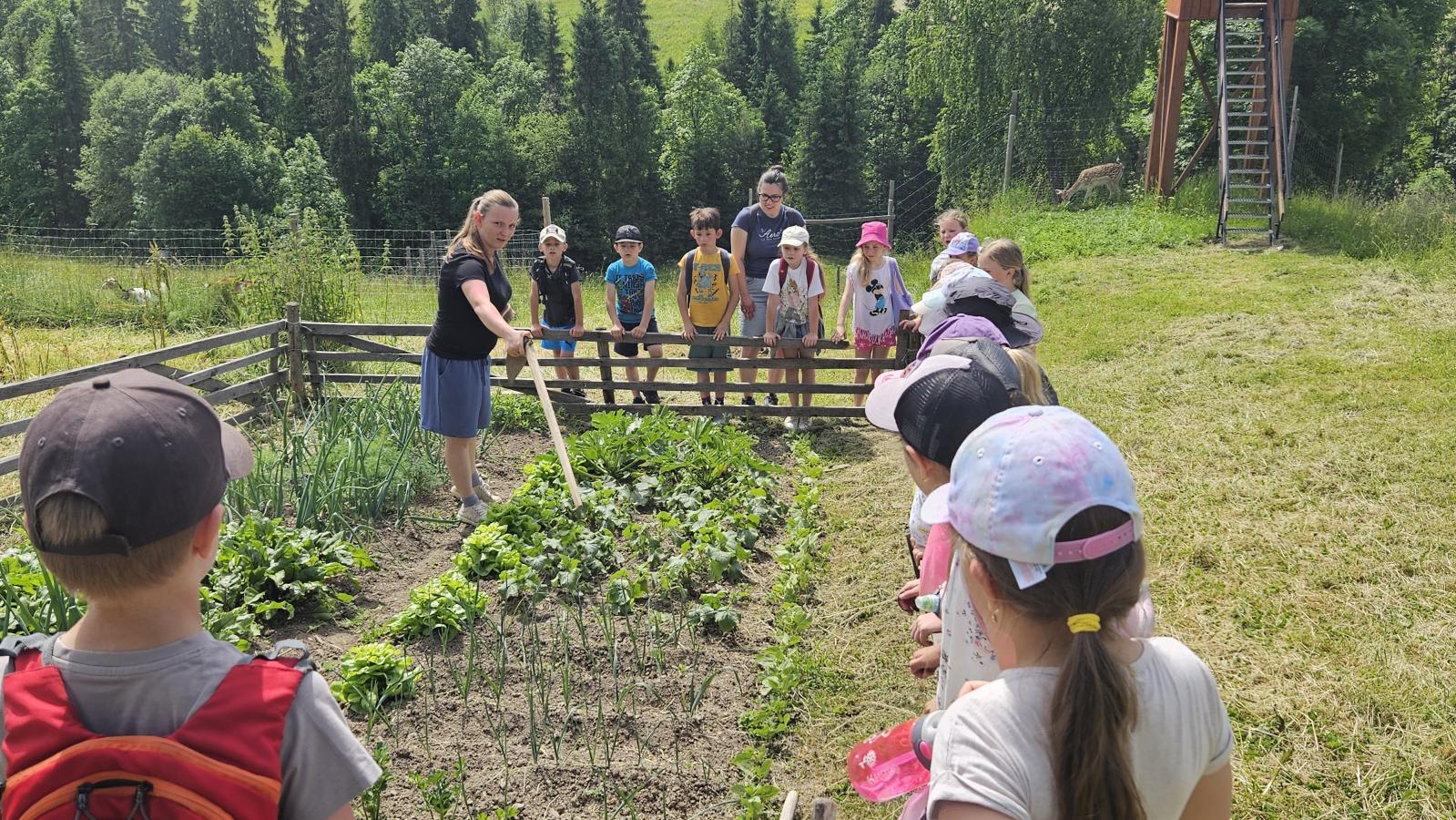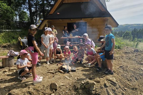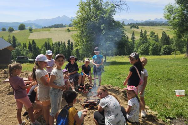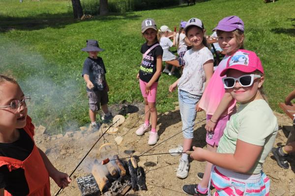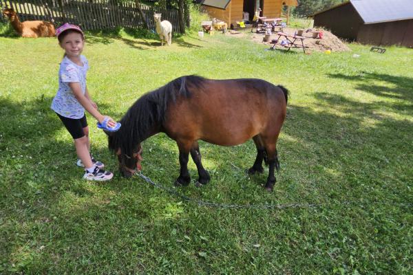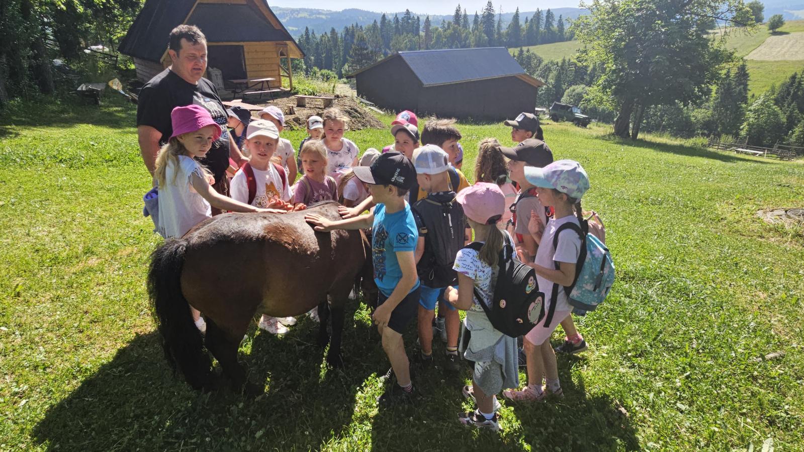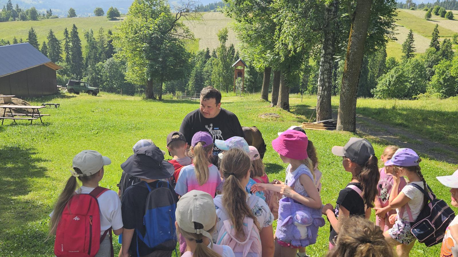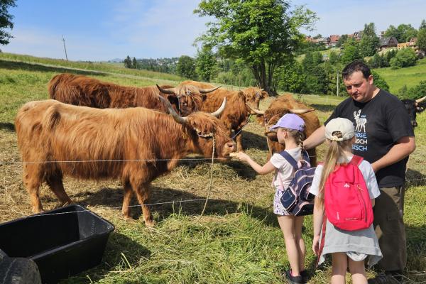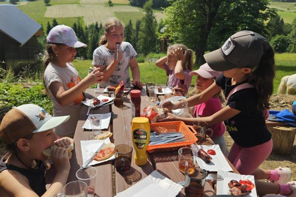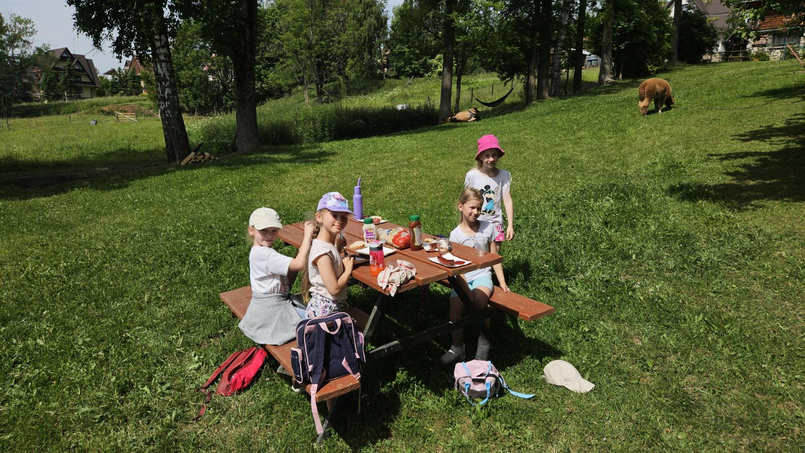 Dzieci miały okazję zobaczyć z bliska zwierzęta hodowlane, takie jak: kozy, owce, krowy, alpaki, kucyki, a także wyjątkowe krowy z długą sierścią. Największą radość sprawiła możliwość pogłaskania i nakarmienia zwierząt, a niektóre dzieci po raz pierwszy w życiu mogły poczuć, jak to jest jechać na kucyku! Nie zabrakło również akcentów ogrodniczych – dzieci zwiedziły piękny ogródek, pełen różnorodnych warzyw, a następnie wzięły udział w zabawnym quizie „Co to za warzywo?”, który wywołał wiele śmiechu i radości. Po pełnym wrażeń zwiedzaniu przyszedł czas na zabawy na świeżym powietrzu oraz wspólne ognisko z pieczeniem kiełbasek, które smakowały wyjątkowo po tak aktywnym dniu.