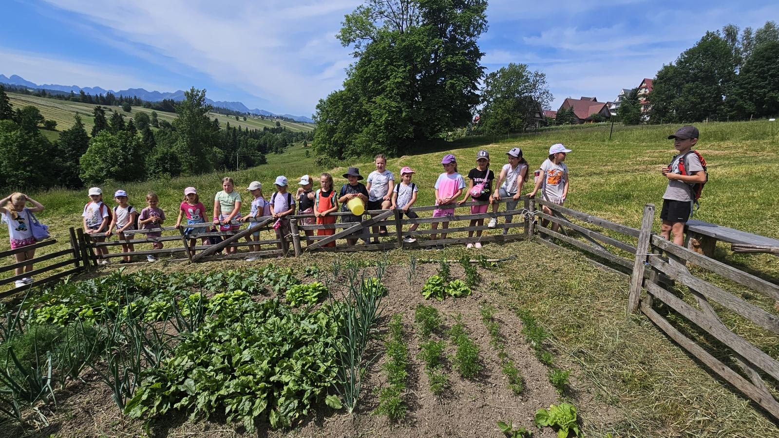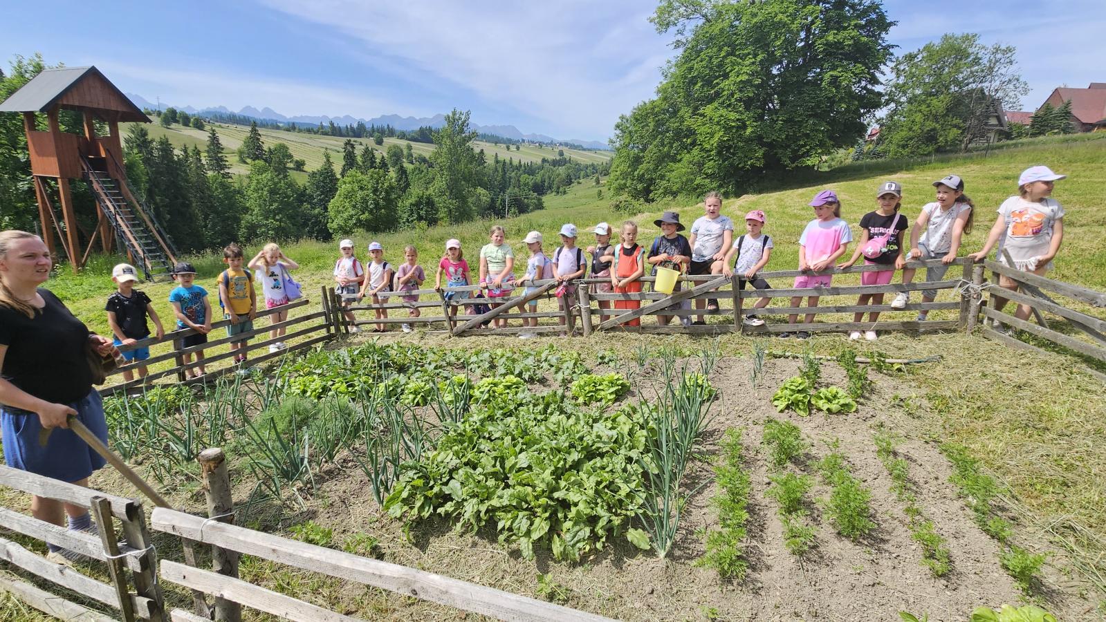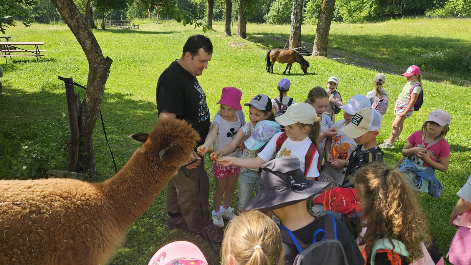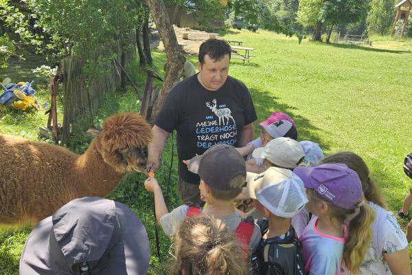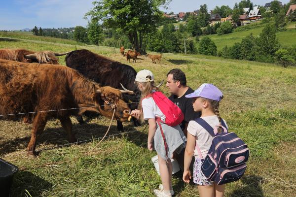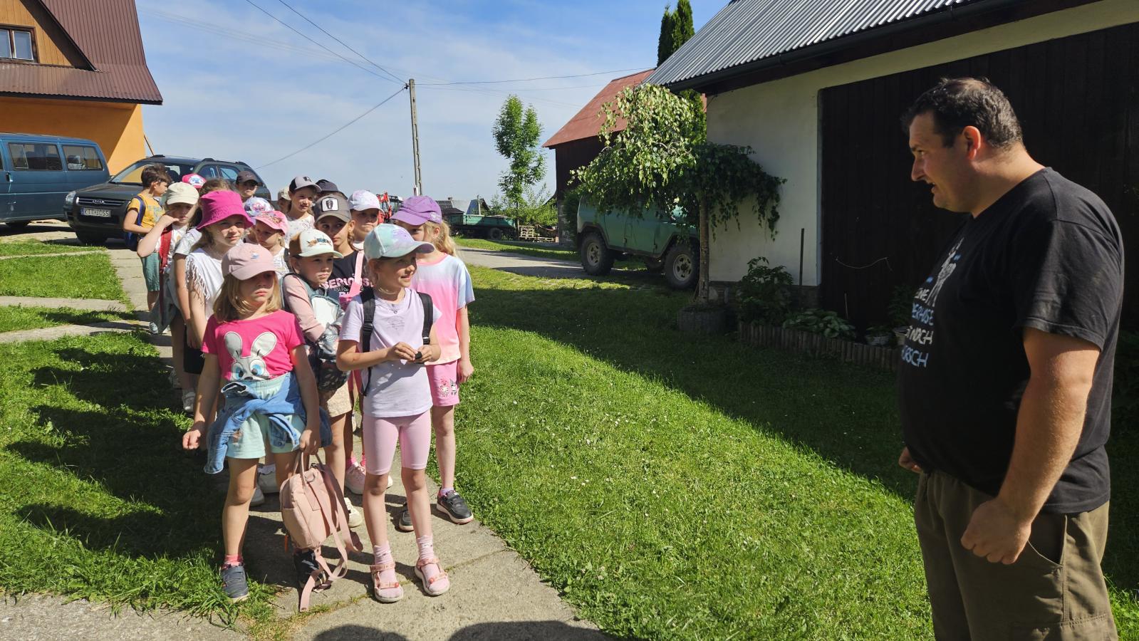Dzieci miały okazję zobaczyć z bliska zwierzęta hodowlane, takie jak: kozy, owce, krowy, alpaki, kucyki, a także wyjątkowe krowy z długą sierścią. Największą radość sprawiła możliwość pogłaskania i nakarmienia zwierząt, a niektóre dzieci po raz pierwszy w życiu mogły poczuć, jak to jest jechać na kucyku! Nie zabrakło również akcentów ogrodniczych – dzieci zwiedziły piękny ogródek, pełen różnorodnych warzyw, a następnie wzięły udział w zabawnym quizie „Co to za warzywo?”, który wywołał wiele śmiechu i radości. Po pełnym wrażeń zwiedzaniu przyszedł czas na zabawy na świeżym powietrzu oraz wspólne ognisko z pieczeniem kiełbasek, które smakowały wyjątkowo po tak aktywnym dniu.