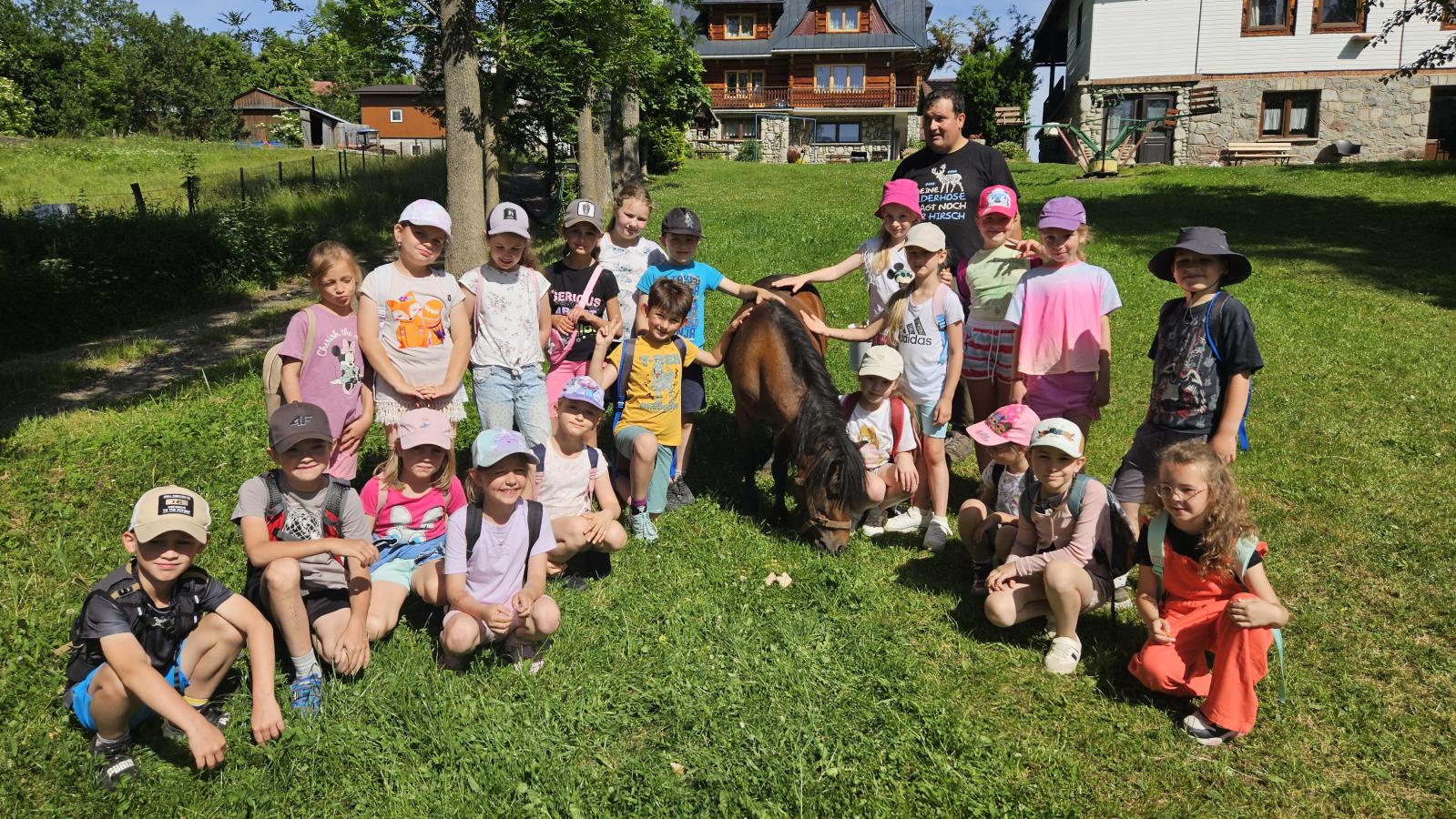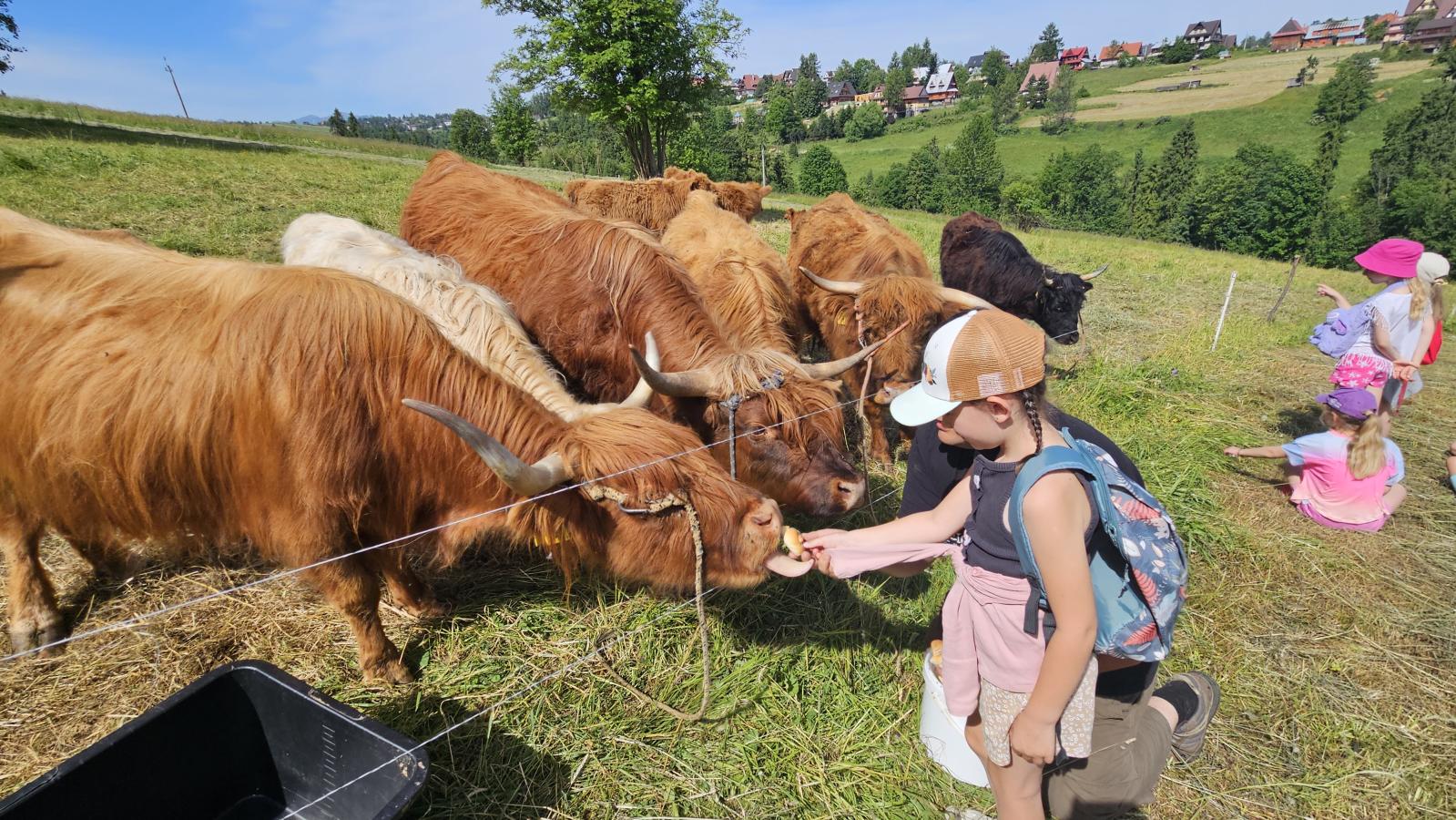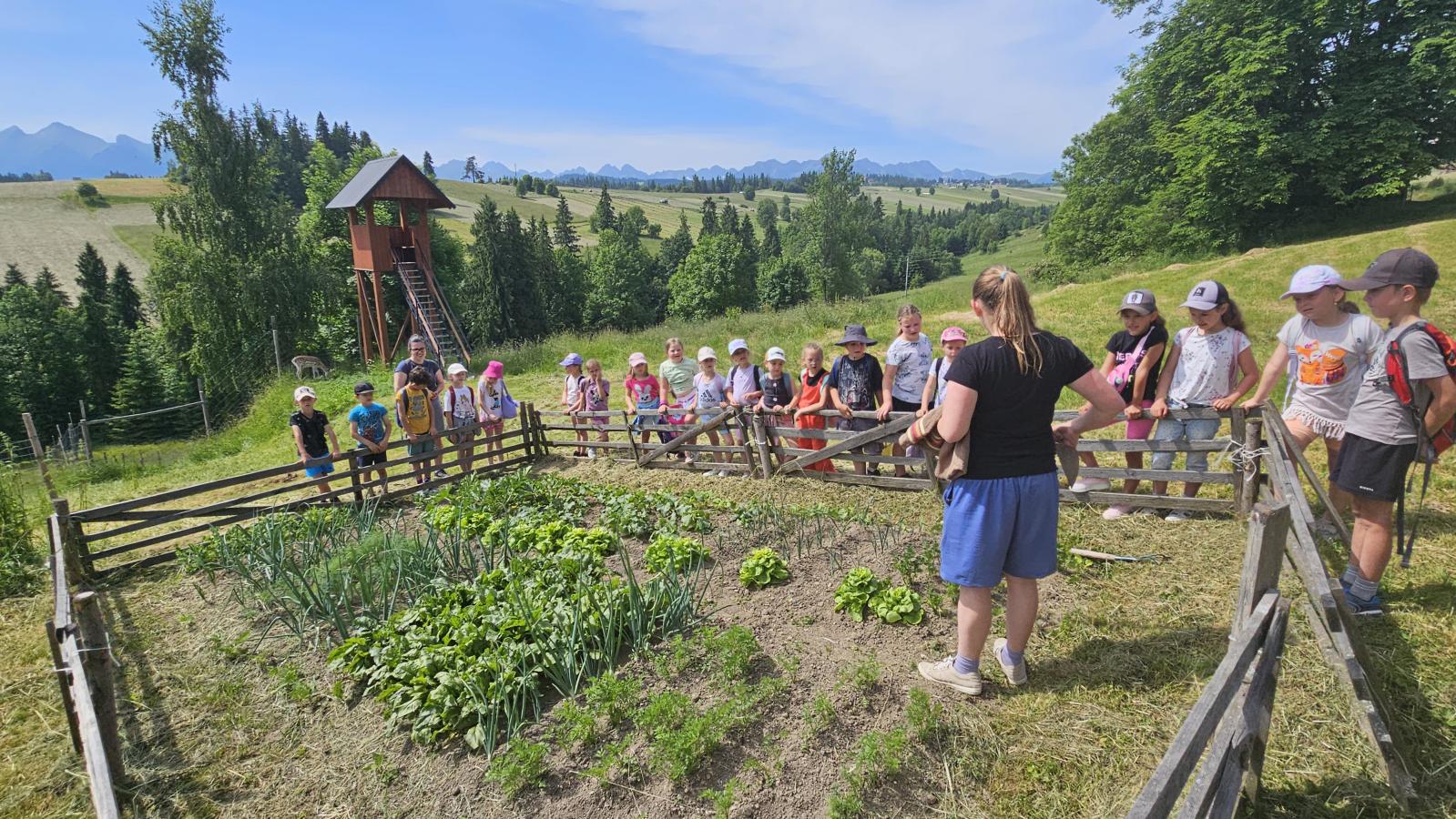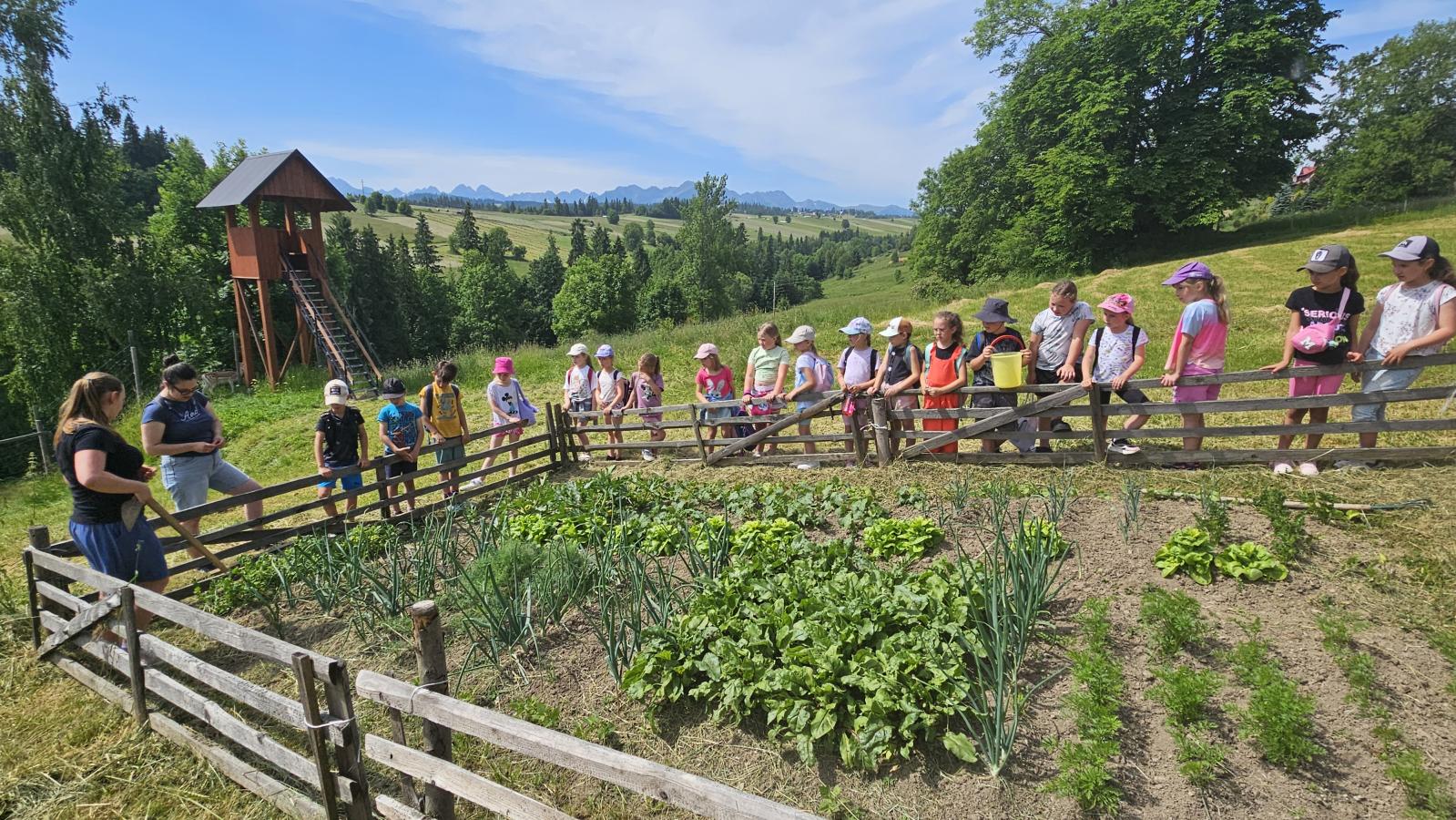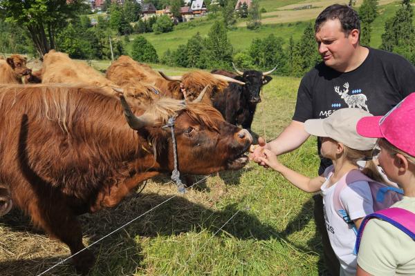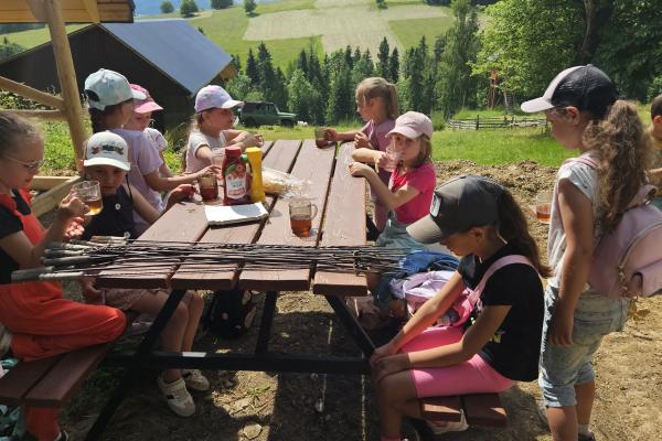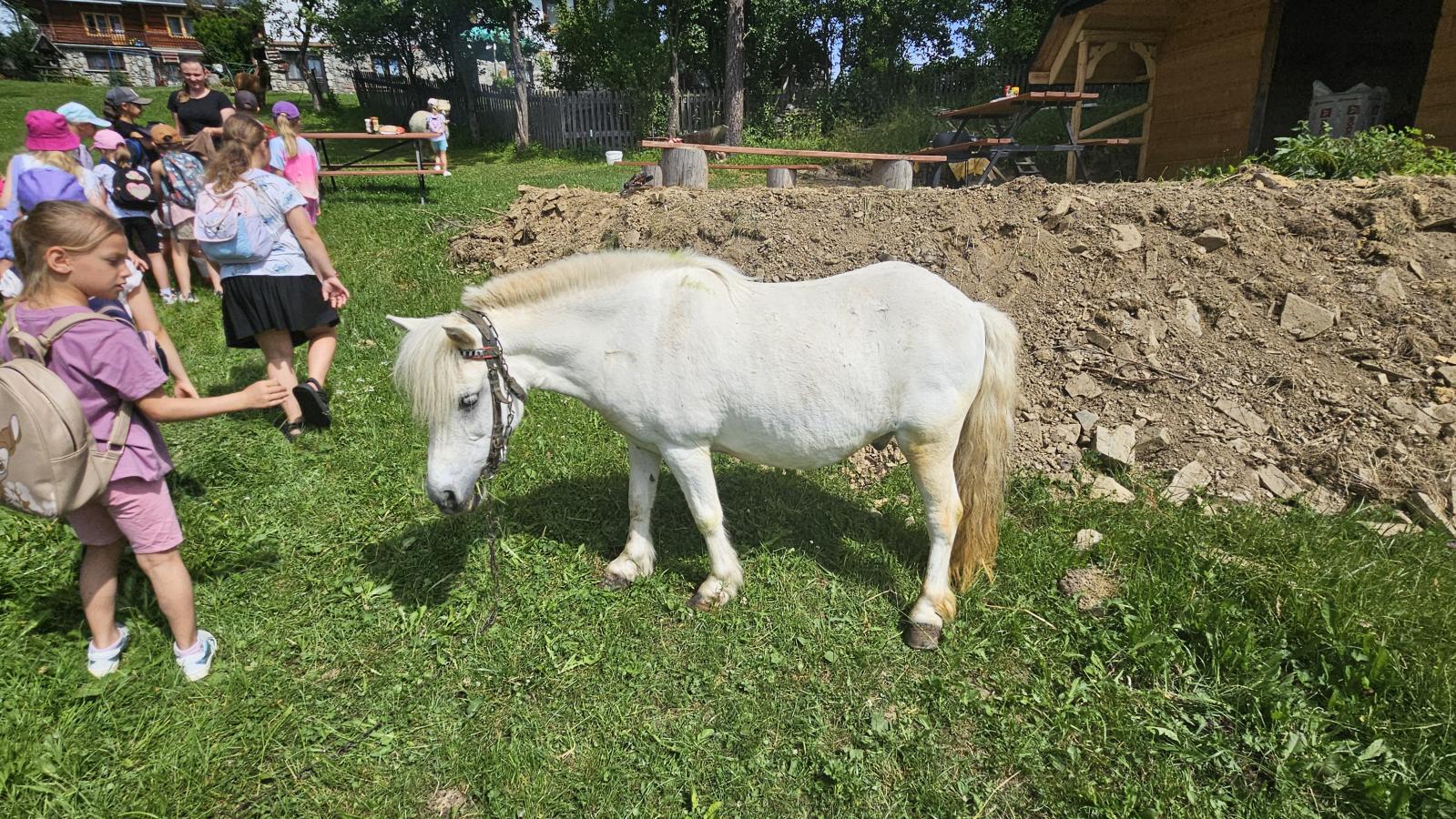 Dzieci miały okazję zobaczyć z bliska zwierzęta hodowlane, takie jak: kozy, owce, krowy, alpaki, kucyki, a także wyjątkowe krowy z długą sierścią. Największą radość sprawiła możliwość pogłaskania i nakarmienia zwierząt, a niektóre dzieci po raz pierwszy w życiu mogły poczuć, jak to jest jechać na kucyku! Nie zabrakło również akcentów ogrodniczych – dzieci zwiedziły piękny ogródek, pełen różnorodnych warzyw, a następnie wzięły udział w zabawnym quizie „Co to za warzywo?”, który wywołał wiele śmiechu i radości. Po pełnym wrażeń zwiedzaniu przyszedł czas na zabawy na świeżym powietrzu oraz wspólne ognisko z pieczeniem kiełbasek, które smakowały wyjątkowo po tak aktywnym dniu.