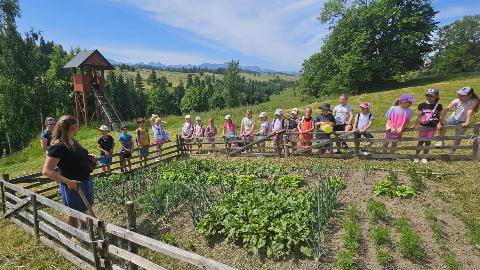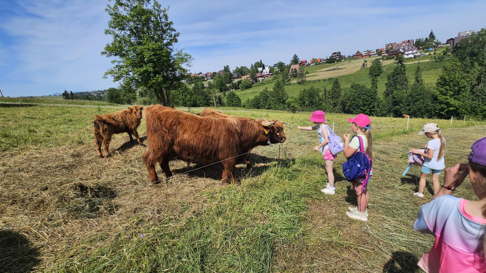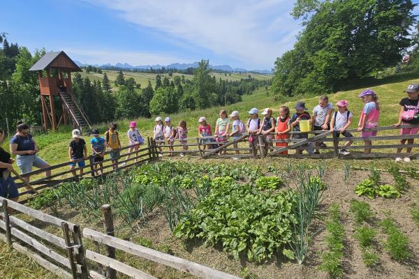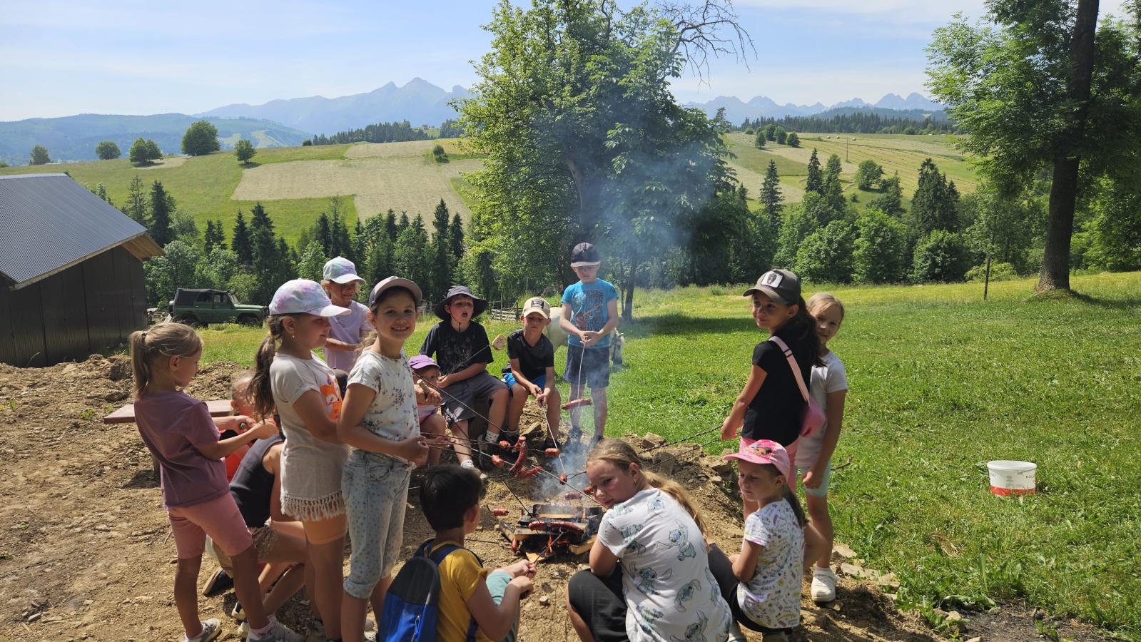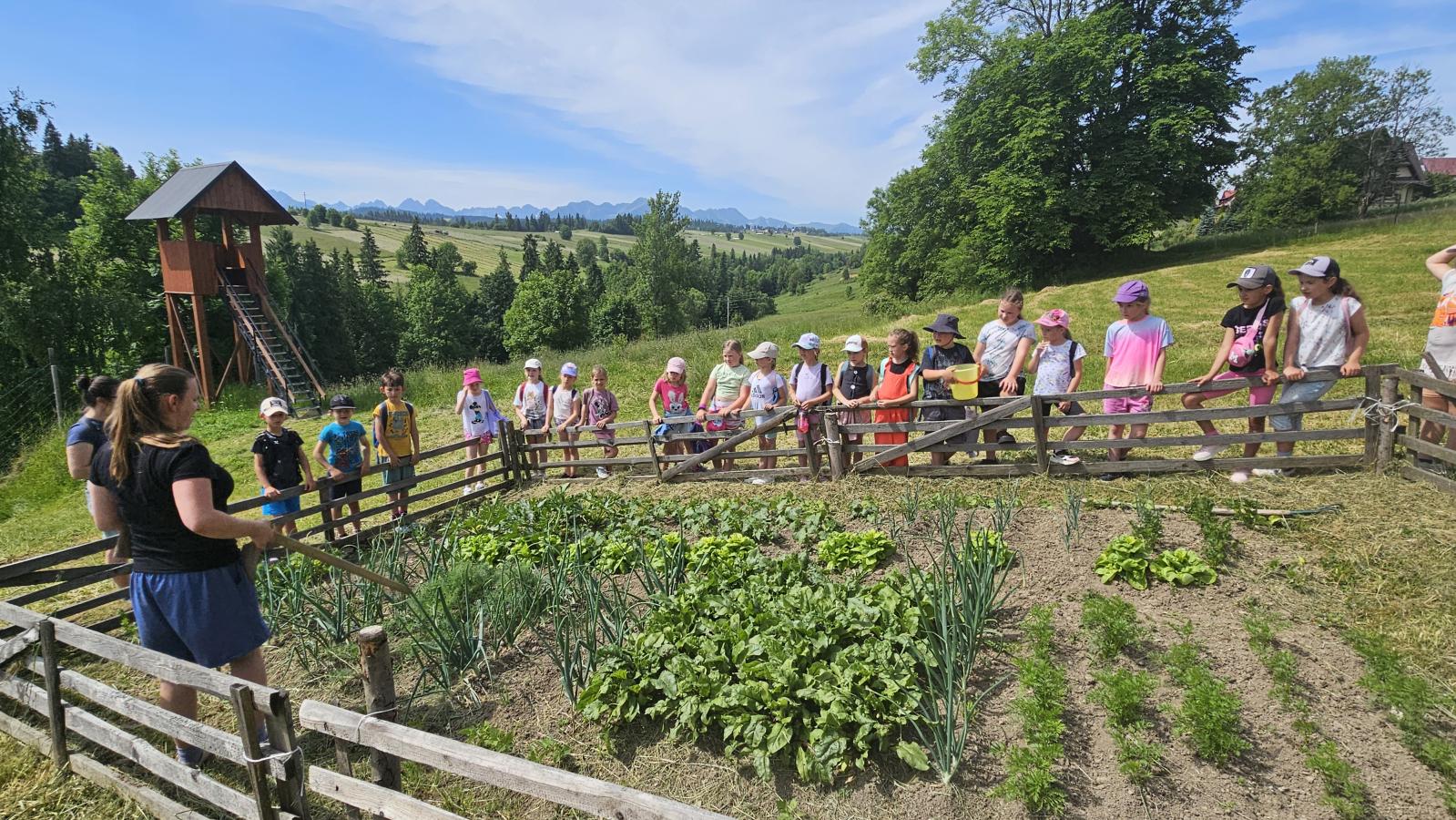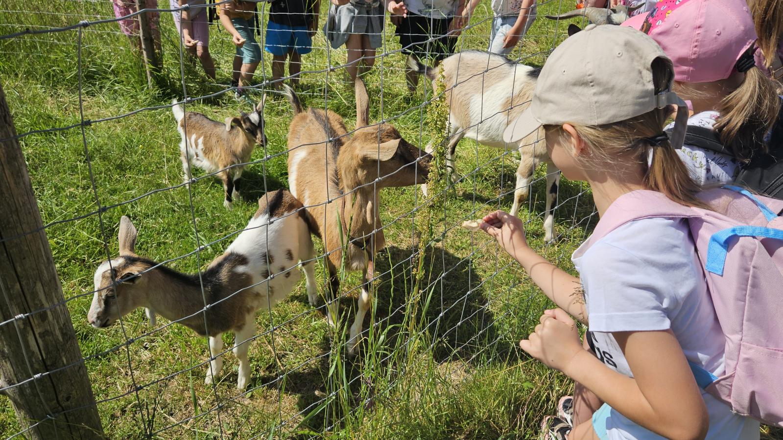 Dzieci miały okazję zobaczyć z bliska zwierzęta hodowlane, takie jak: kozy, owce, krowy, alpaki, kucyki, a także wyjątkowe krowy z długą sierścią. Największą radość sprawiła możliwość pogłaskania i nakarmienia zwierząt, a niektóre dzieci po raz pierwszy w życiu mogły poczuć, jak to jest jechać na kucyku! Nie zabrakło również akcentów ogrodniczych – dzieci zwiedziły piękny ogródek, pełen różnorodnych warzyw, a następnie wzięły udział w zabawnym quizie „Co to za warzywo?”, który wywołał wiele śmiechu i radości. Po pełnym wrażeń zwiedzaniu przyszedł czas na zabawy na świeżym powietrzu oraz wspólne ognisko z pieczeniem kiełbasek, które smakowały wyjątkowo po tak aktywnym dniu.