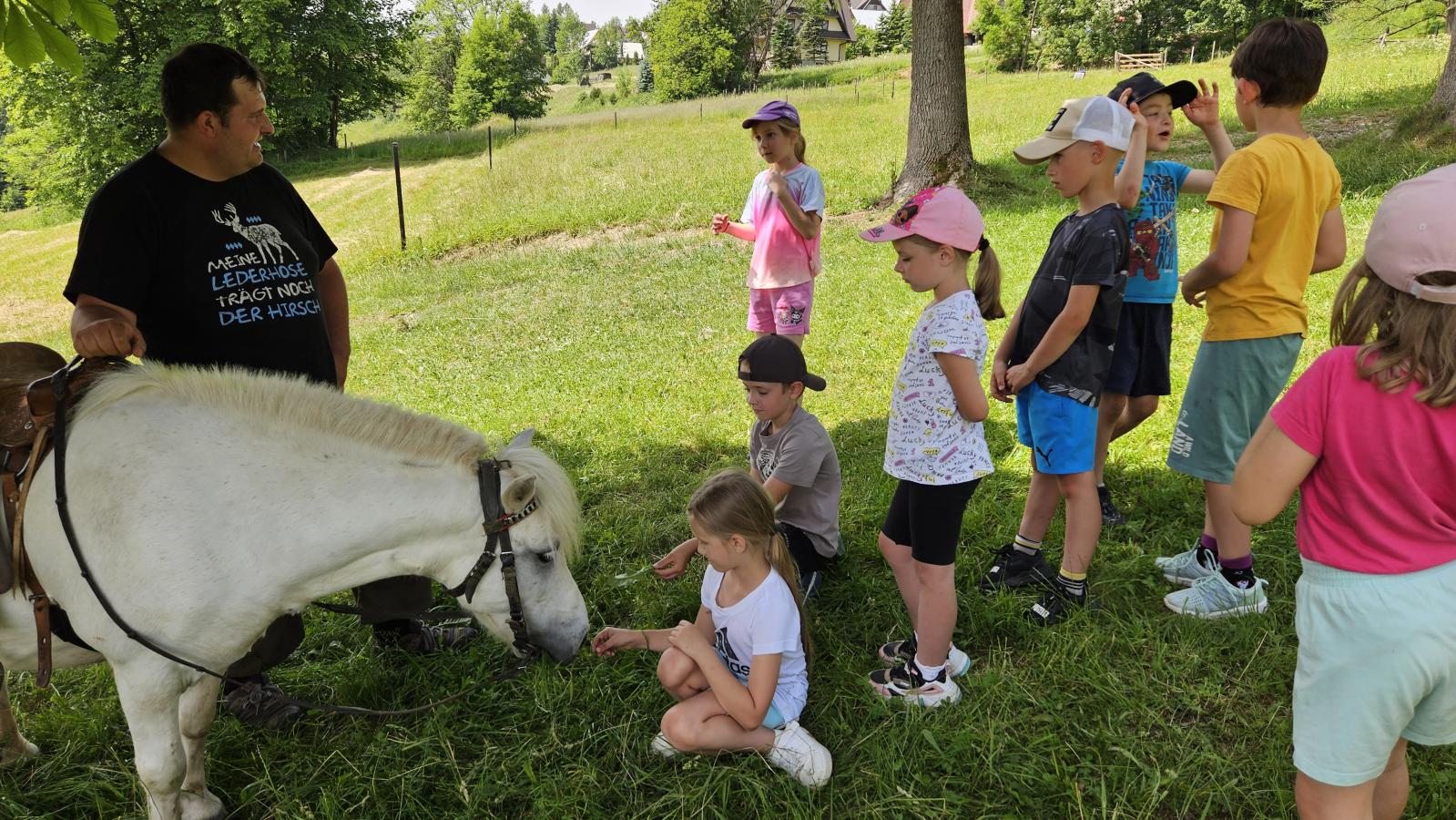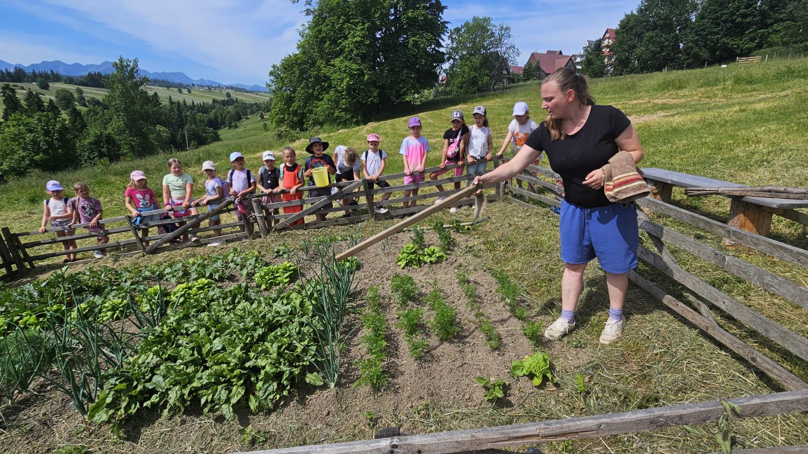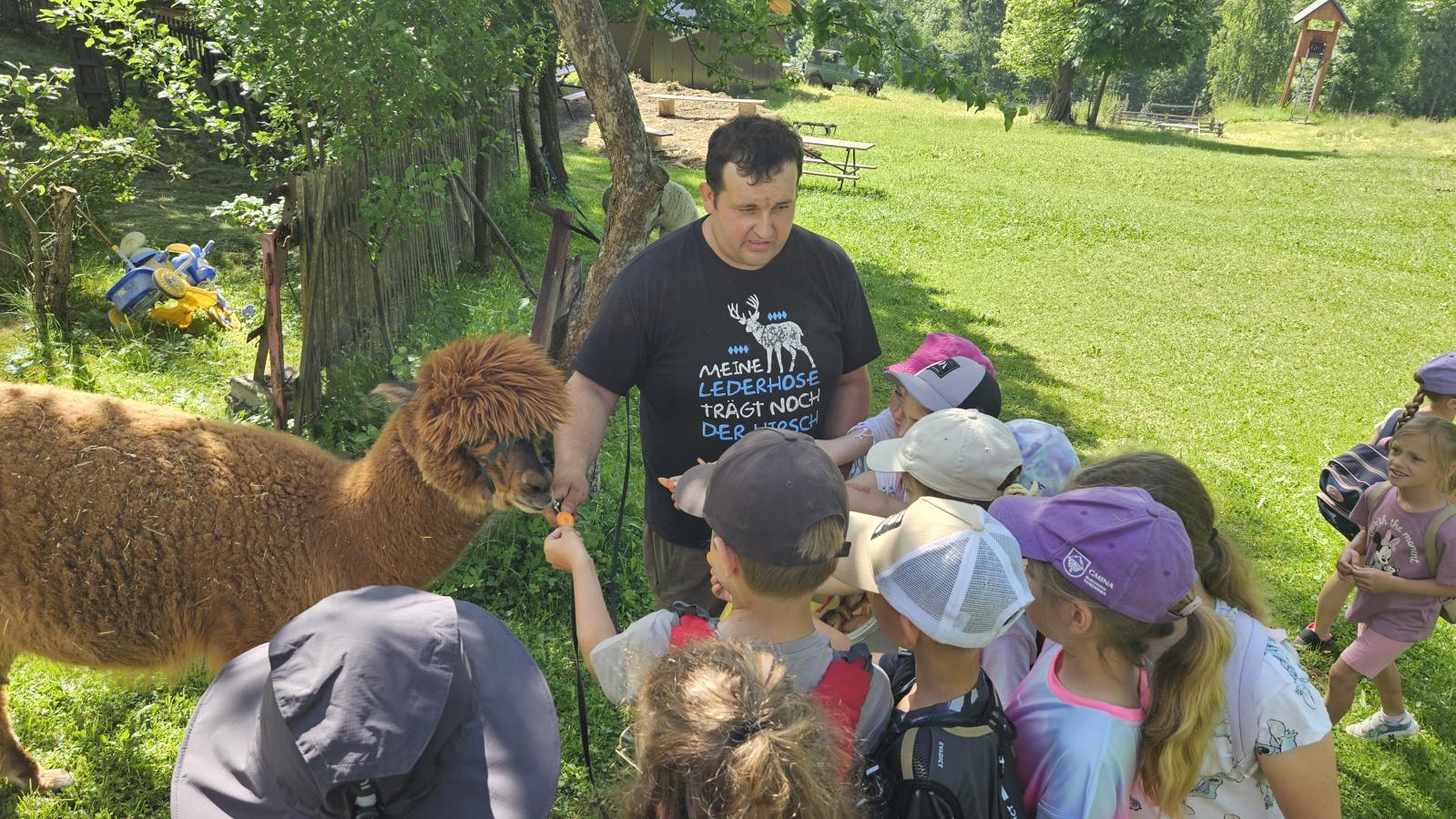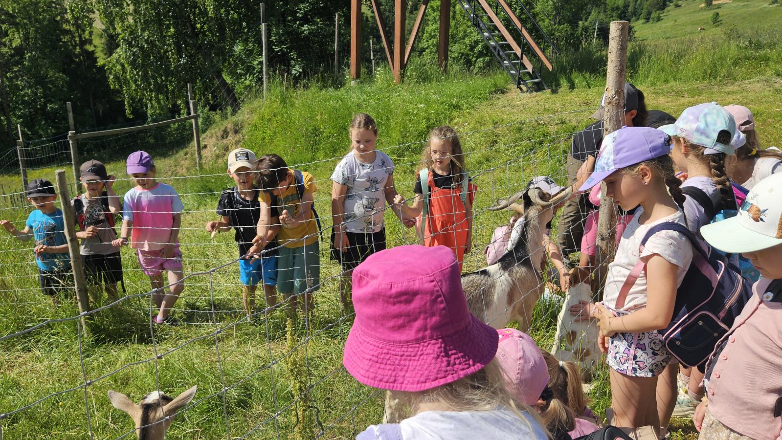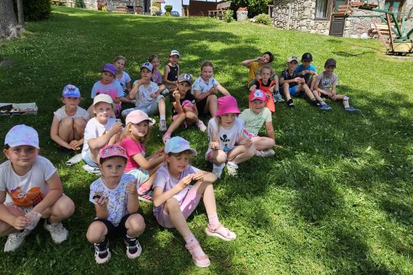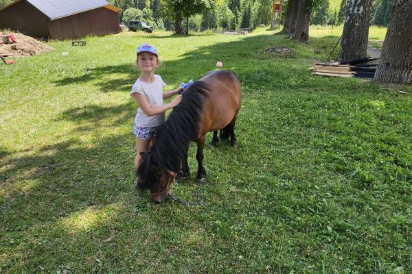 Dzieci miały okazję zobaczyć z bliska zwierzęta hodowlane, takie jak: kozy, owce, krowy, alpaki, kucyki, a także wyjątkowe krowy z długą sierścią. Największą radość sprawiła możliwość pogłaskania i nakarmienia zwierząt, a niektóre dzieci po raz pierwszy w życiu mogły poczuć, jak to jest jechać na kucyku! Nie zabrakło również akcentów ogrodniczych – dzieci zwiedziły piękny ogródek, pełen różnorodnych warzyw, a następnie wzięły udział w zabawnym quizie „Co to za warzywo?”, który wywołał wiele śmiechu i radości. Po pełnym wrażeń zwiedzaniu przyszedł czas na zabawy na świeżym powietrzu oraz wspólne ognisko z pieczeniem kiełbasek, które smakowały wyjątkowo po tak aktywnym dniu.