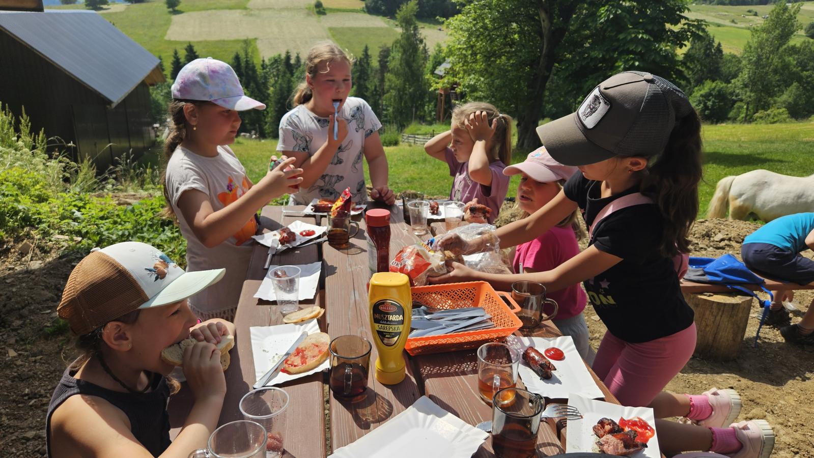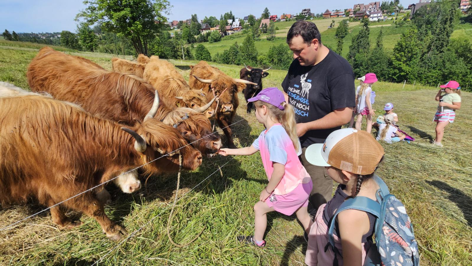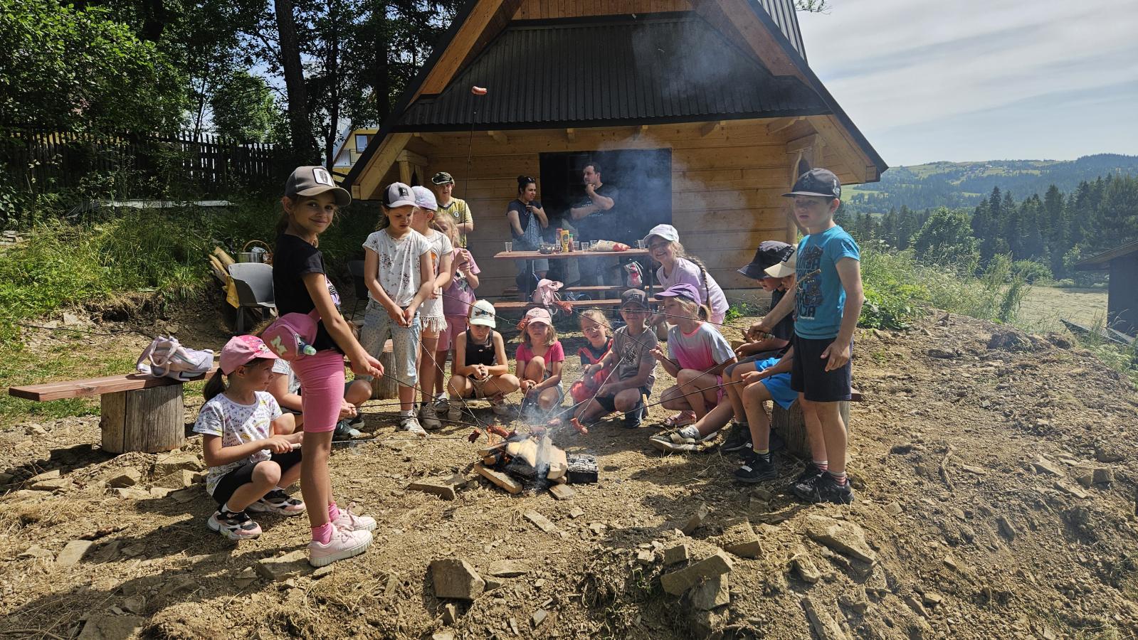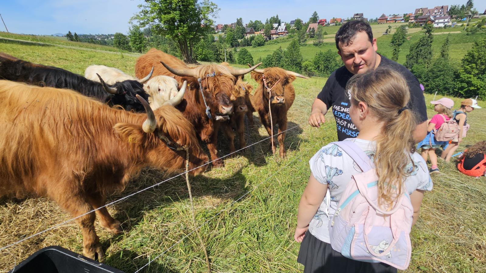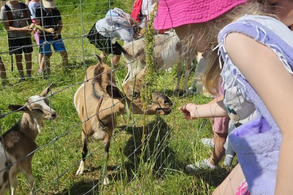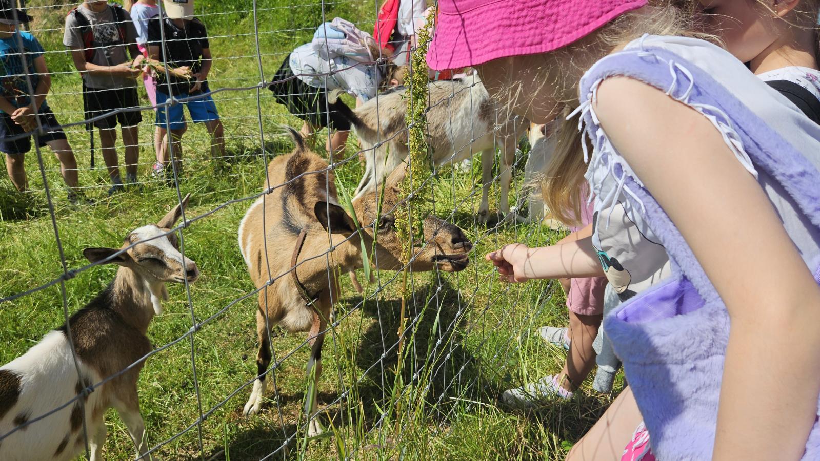 Dzieci miały okazję zobaczyć z bliska zwierzęta hodowlane, takie jak: kozy, owce, krowy, alpaki, kucyki, a także wyjątkowe krowy z długą sierścią. Największą radość sprawiła możliwość pogłaskania i nakarmienia zwierząt, a niektóre dzieci po raz pierwszy w życiu mogły poczuć, jak to jest jechać na kucyku! Nie zabrakło również akcentów ogrodniczych – dzieci zwiedziły piękny ogródek, pełen różnorodnych warzyw, a następnie wzięły udział w zabawnym quizie „Co to za warzywo?”, który wywołał wiele śmiechu i radości. Po pełnym wrażeń zwiedzaniu przyszedł czas na zabawy na świeżym powietrzu oraz wspólne ognisko z pieczeniem kiełbasek, które smakowały wyjątkowo po tak aktywnym dniu.