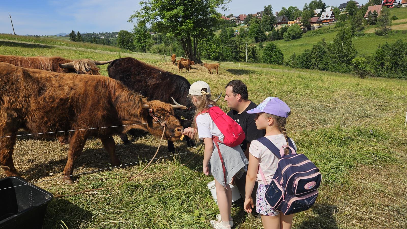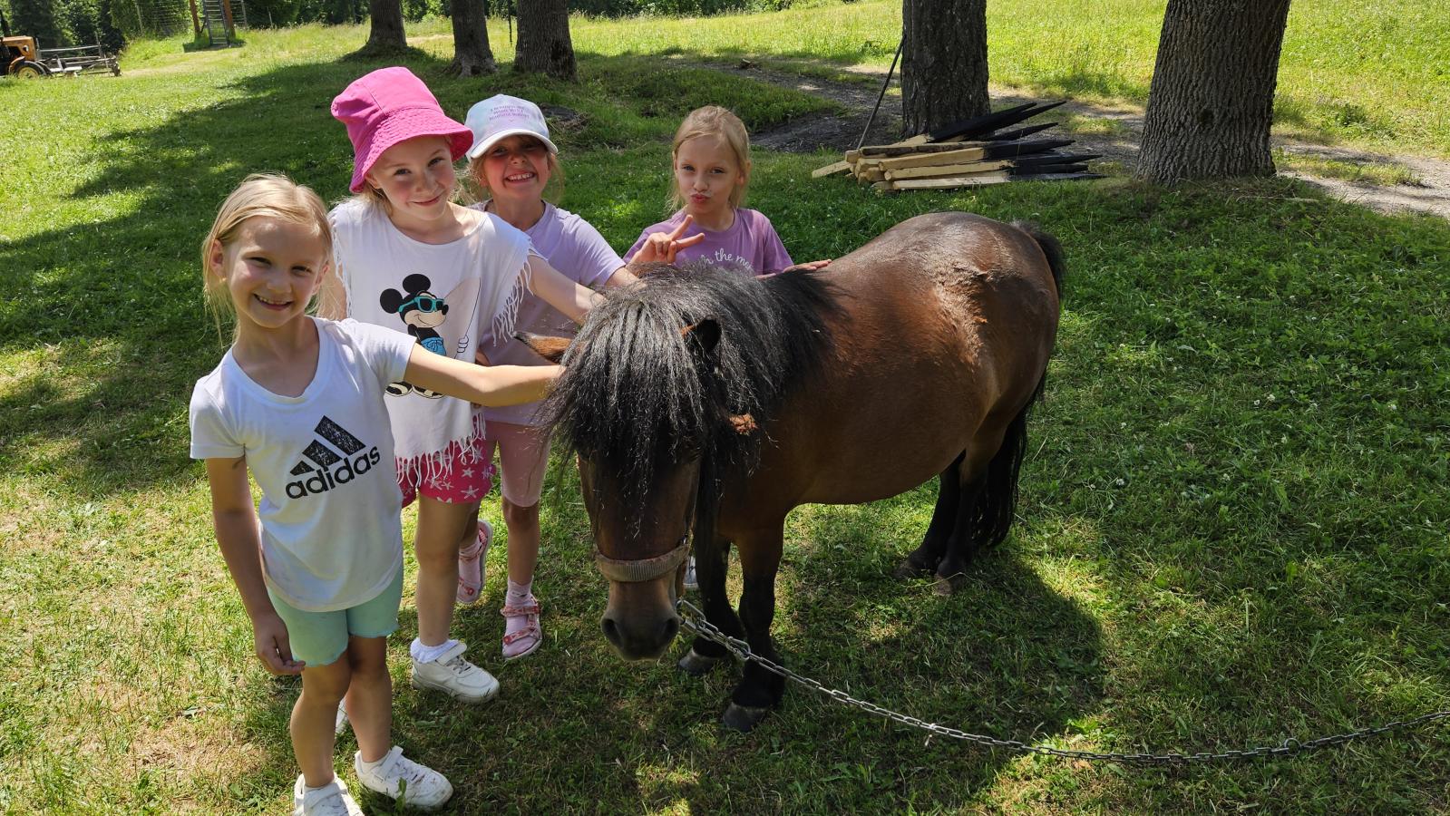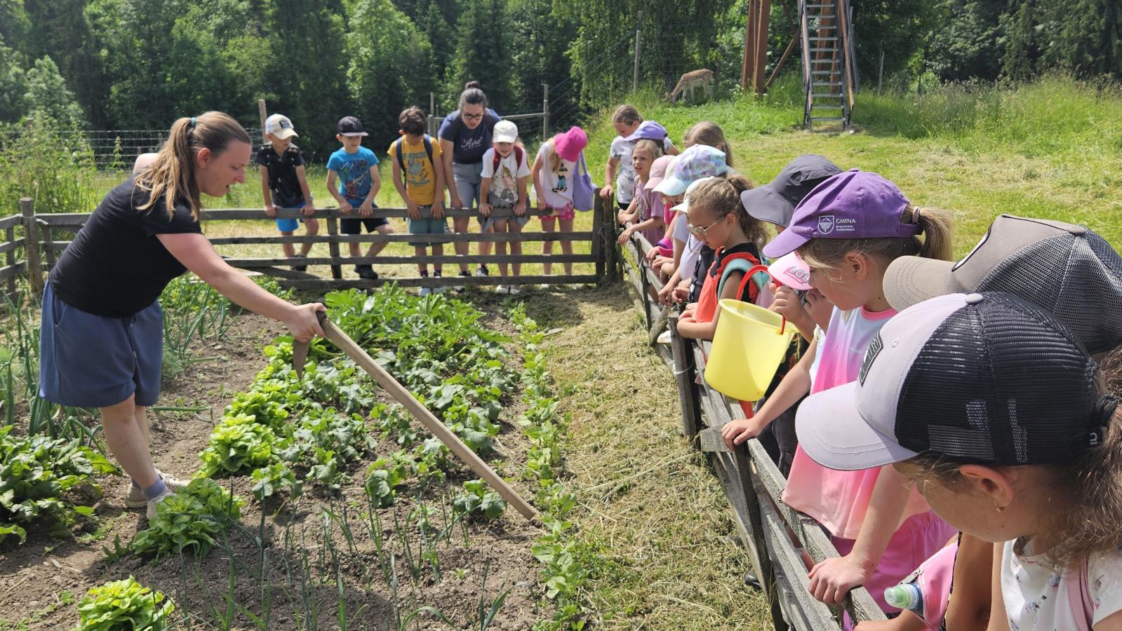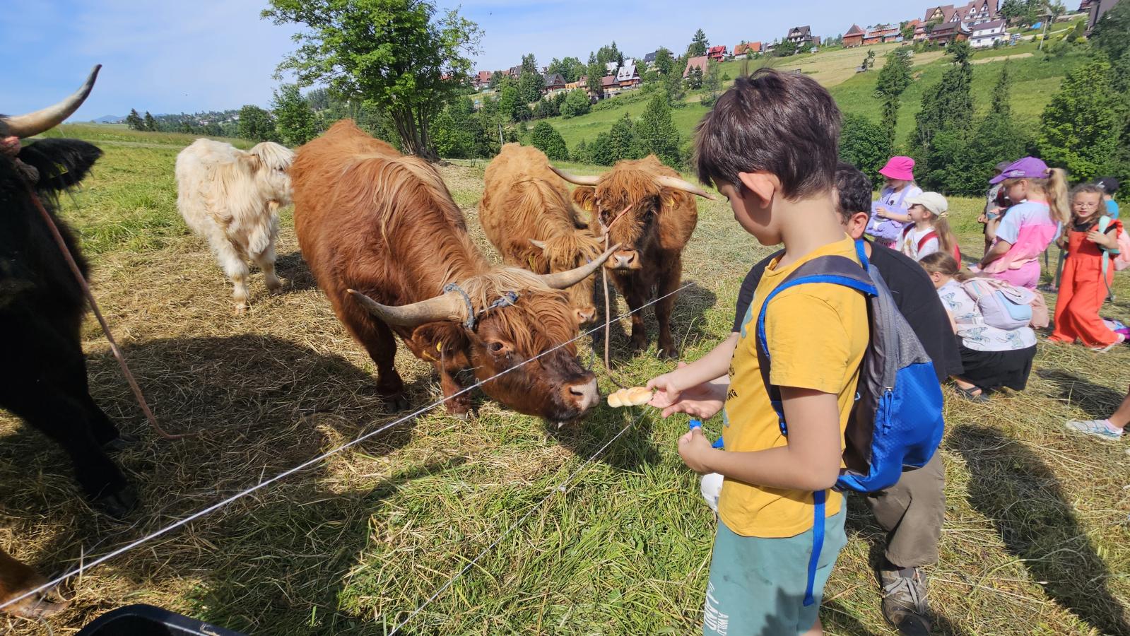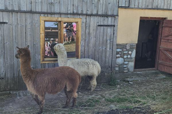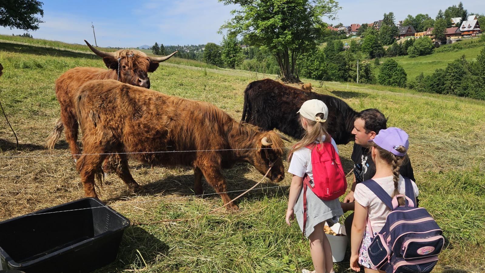 Dzieci miały okazję zobaczyć z bliska zwierzęta hodowlane, takie jak: kozy, owce, krowy, alpaki, kucyki, a także wyjątkowe krowy z długą sierścią. Największą radość sprawiła możliwość pogłaskania i nakarmienia zwierząt, a niektóre dzieci po raz pierwszy w życiu mogły poczuć, jak to jest jechać na kucyku! Nie zabrakło również akcentów ogrodniczych – dzieci zwiedziły piękny ogródek, pełen różnorodnych warzyw, a następnie wzięły udział w zabawnym quizie „Co to za warzywo?”, który wywołał wiele śmiechu i radości. Po pełnym wrażeń zwiedzaniu przyszedł czas na zabawy na świeżym powietrzu oraz wspólne ognisko z pieczeniem kiełbasek, które smakowały wyjątkowo po tak aktywnym dniu.