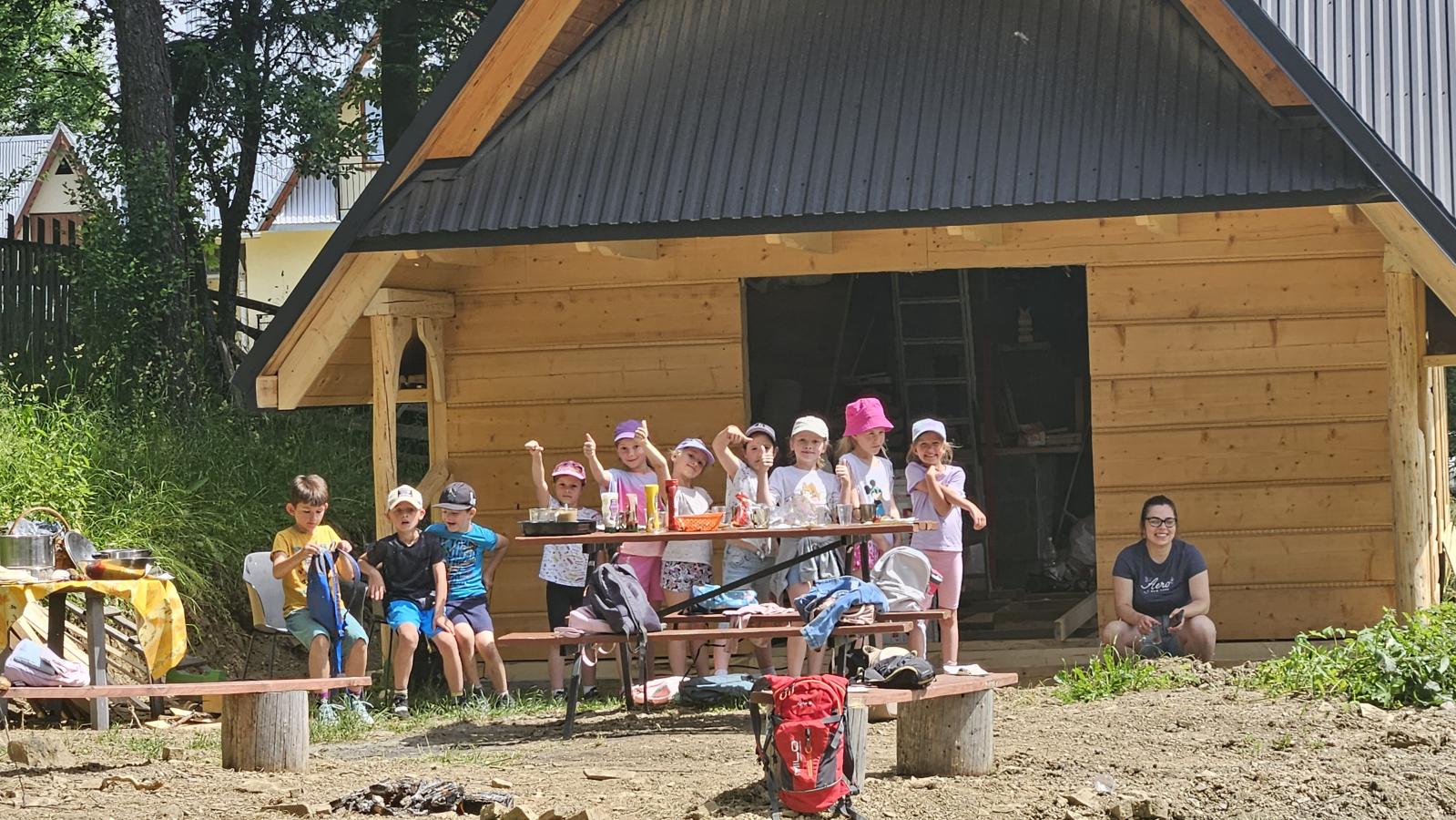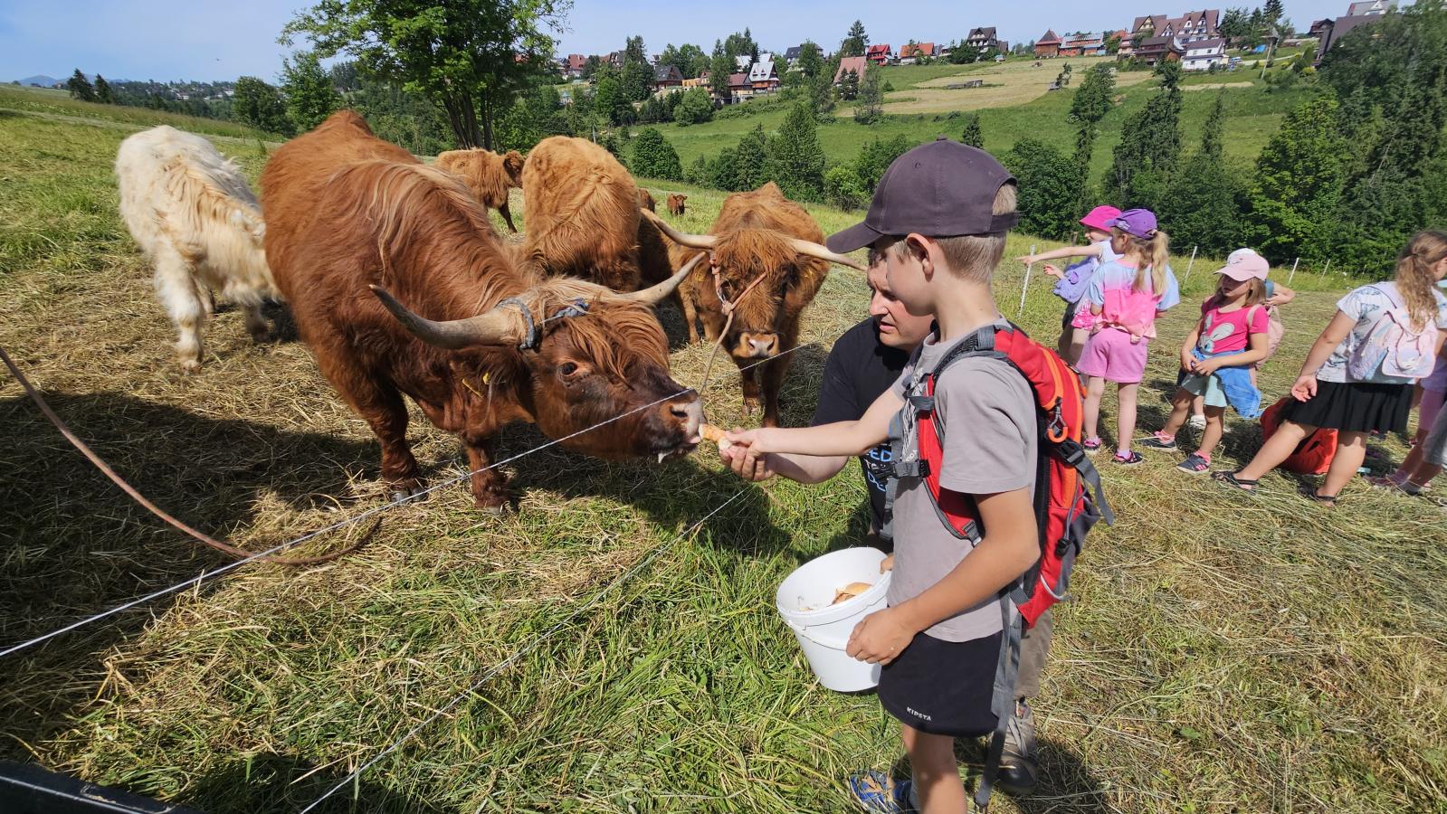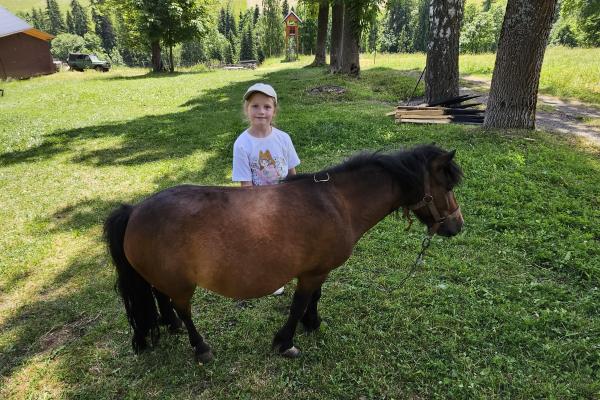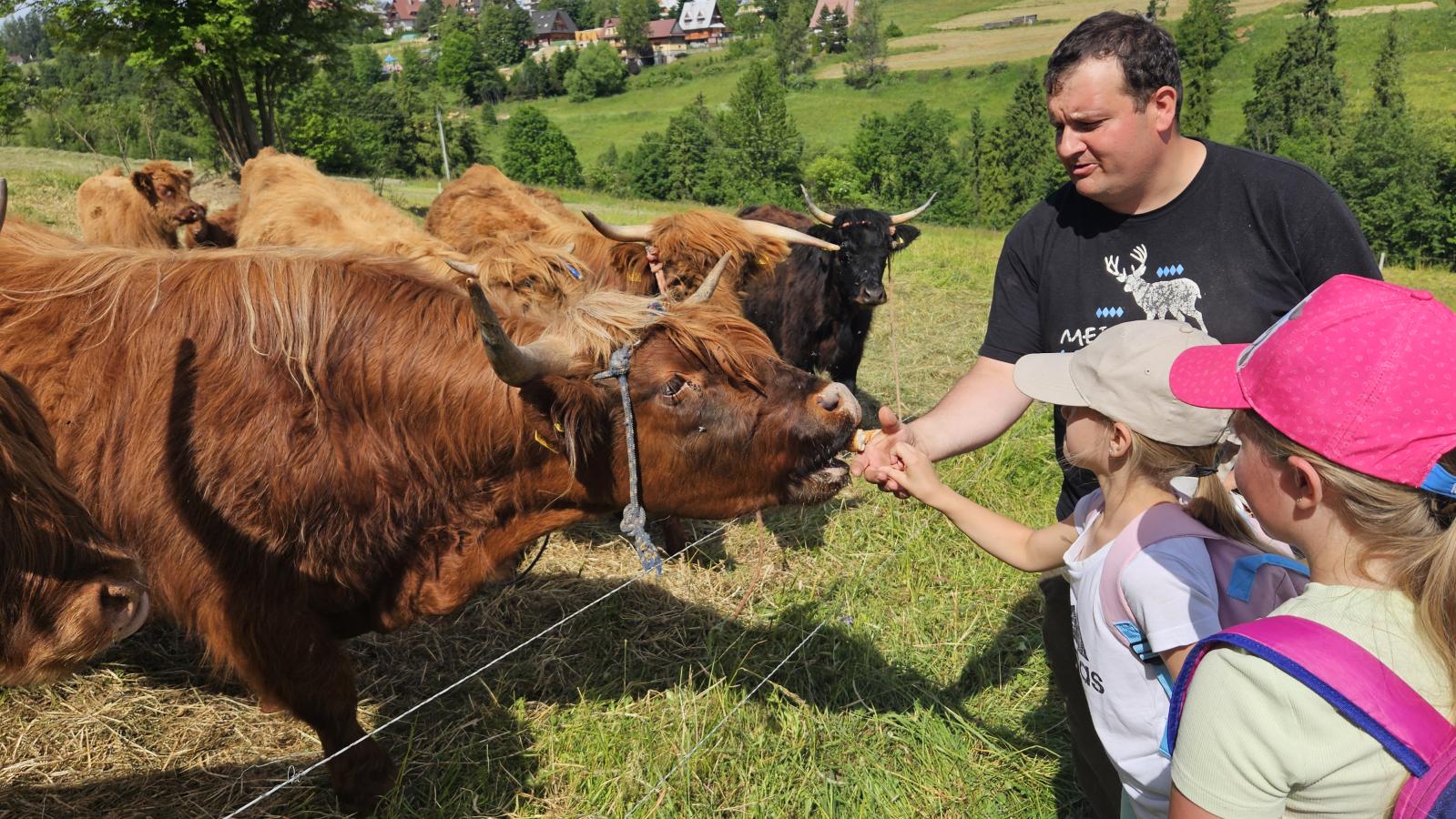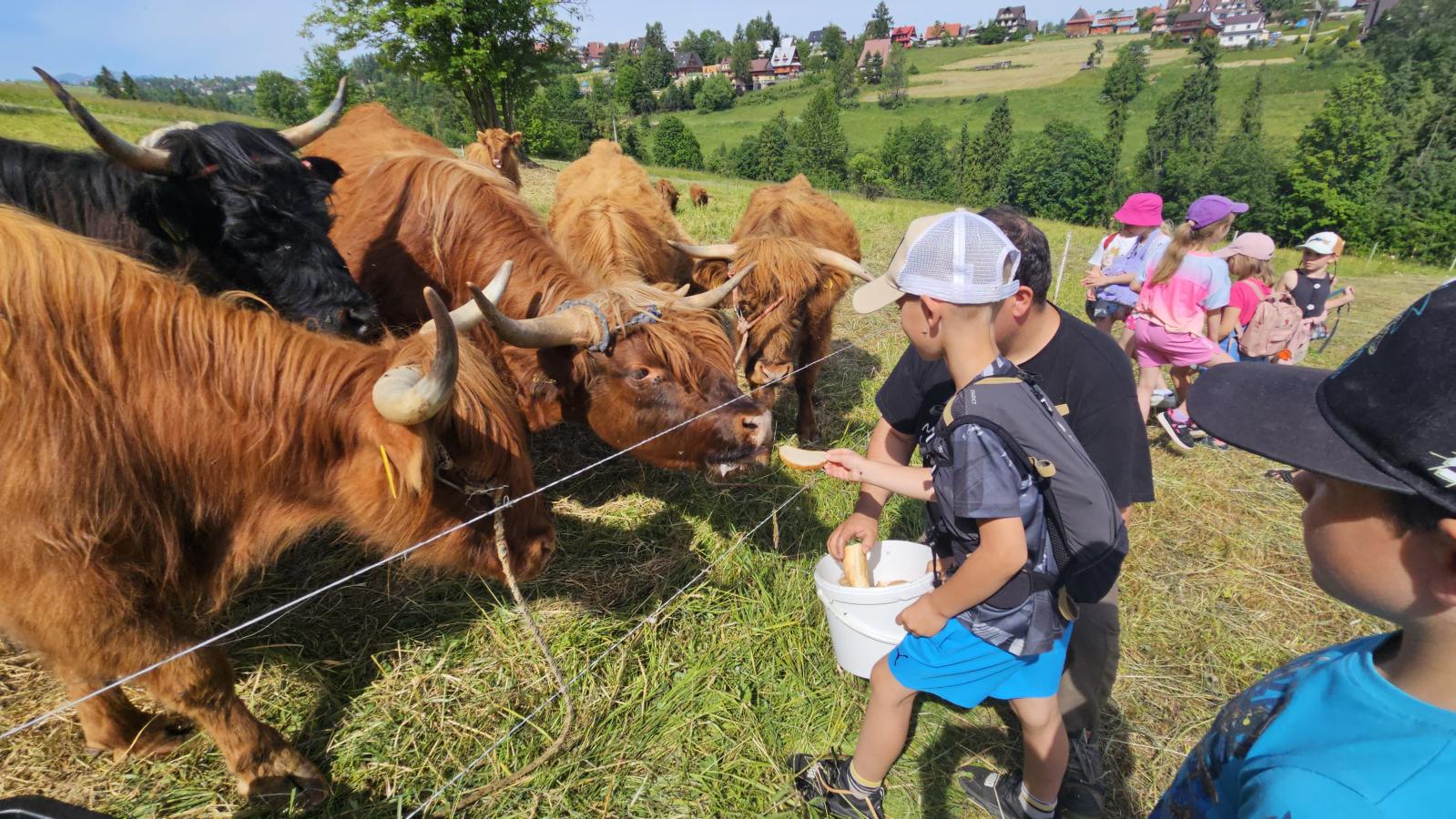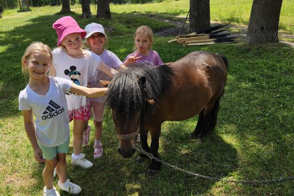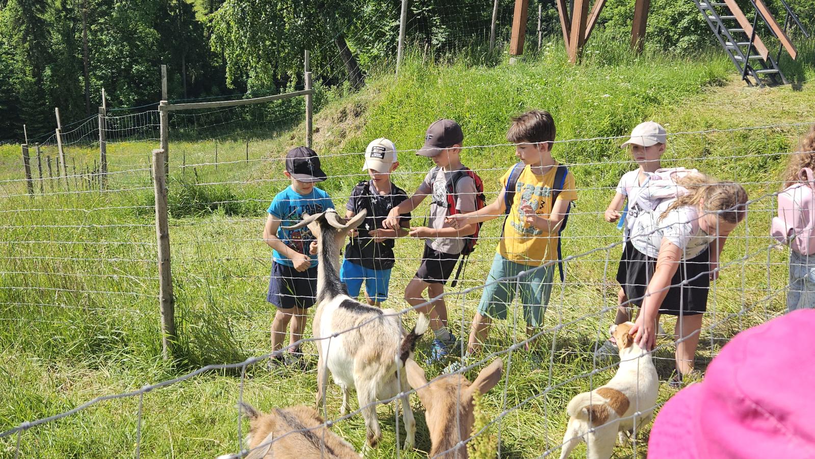 Dzieci miały okazję zobaczyć z bliska zwierzęta hodowlane, takie jak: kozy, owce, krowy, alpaki, kucyki, a także wyjątkowe krowy z długą sierścią. Największą radość sprawiła możliwość pogłaskania i nakarmienia zwierząt, a niektóre dzieci po raz pierwszy w życiu mogły poczuć, jak to jest jechać na kucyku! Nie zabrakło również akcentów ogrodniczych – dzieci zwiedziły piękny ogródek, pełen różnorodnych warzyw, a następnie wzięły udział w zabawnym quizie „Co to za warzywo?”, który wywołał wiele śmiechu i radości. Po pełnym wrażeń zwiedzaniu przyszedł czas na zabawy na świeżym powietrzu oraz wspólne ognisko z pieczeniem kiełbasek, które smakowały wyjątkowo po tak aktywnym dniu.