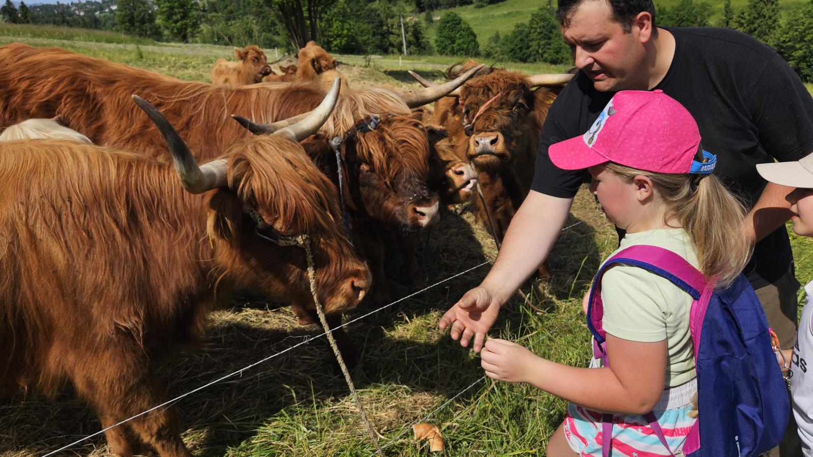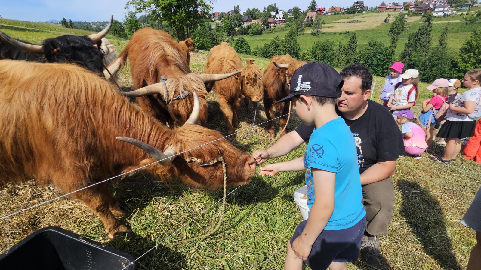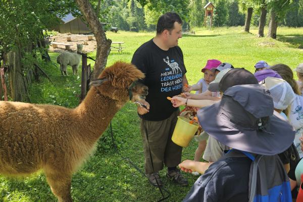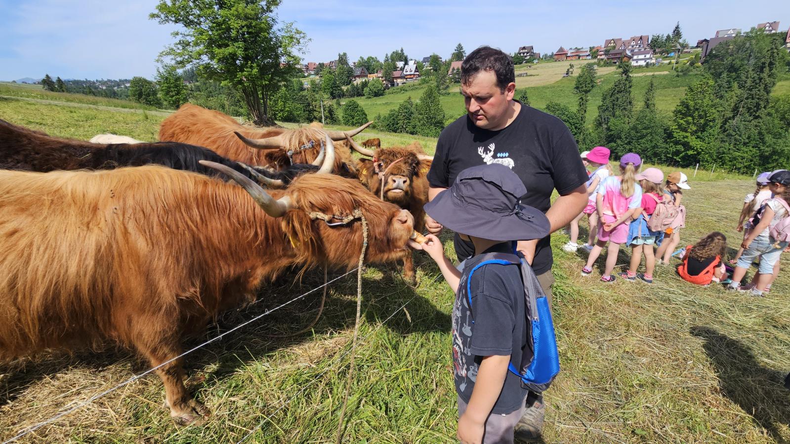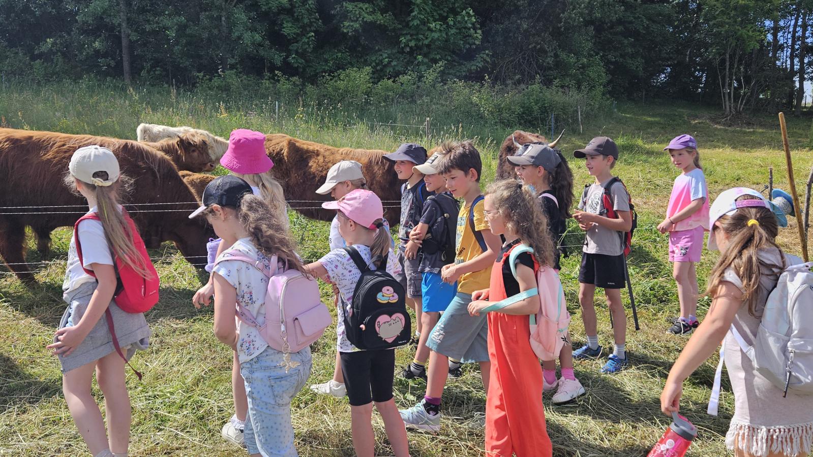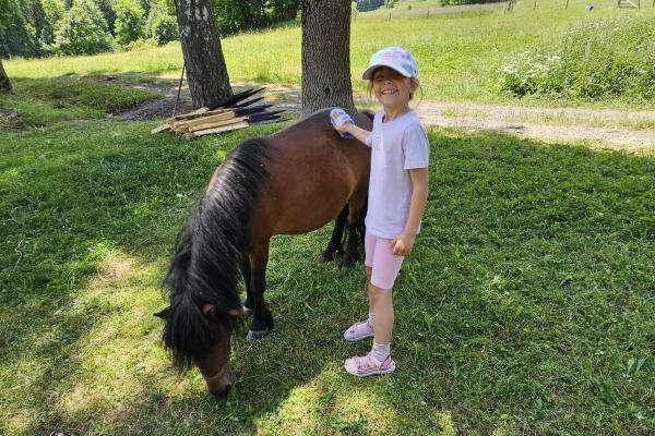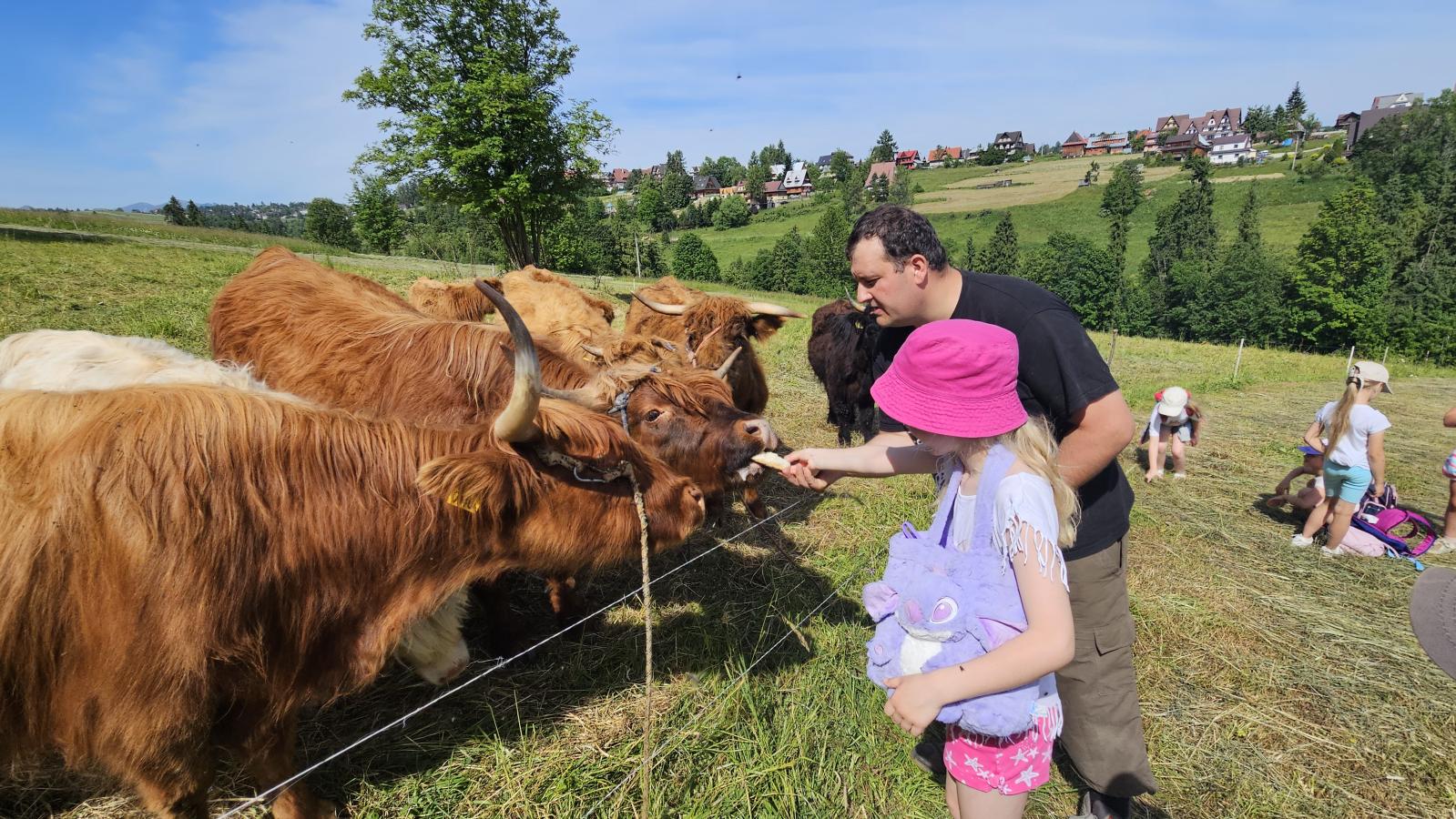 Dzieci miały okazję zobaczyć z bliska zwierzęta hodowlane, takie jak: kozy, owce, krowy, alpaki, kucyki, a także wyjątkowe krowy z długą sierścią. Największą radość sprawiła możliwość pogłaskania i nakarmienia zwierząt, a niektóre dzieci po raz pierwszy w życiu mogły poczuć, jak to jest jechać na kucyku! Nie zabrakło również akcentów ogrodniczych – dzieci zwiedziły piękny ogródek, pełen różnorodnych warzyw, a następnie wzięły udział w zabawnym quizie „Co to za warzywo?”, który wywołał wiele śmiechu i radości. Po pełnym wrażeń zwiedzaniu przyszedł czas na zabawy na świeżym powietrzu oraz wspólne ognisko z pieczeniem kiełbasek, które smakowały wyjątkowo po tak aktywnym dniu.