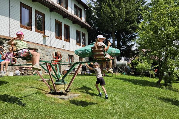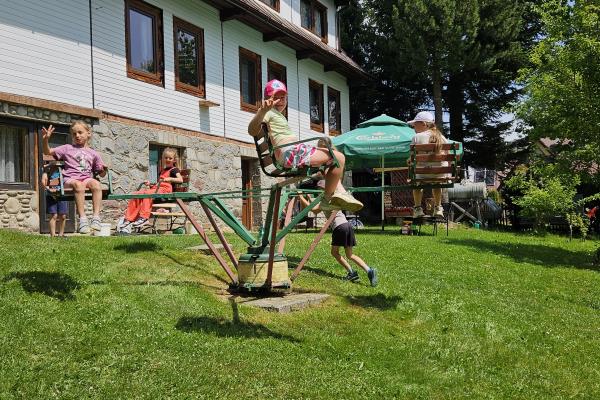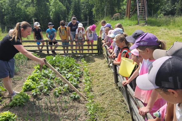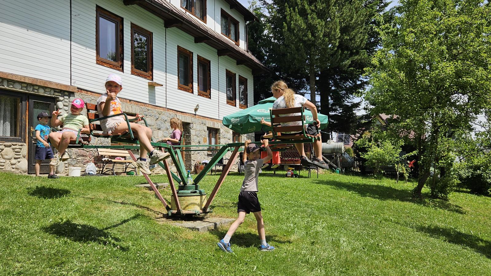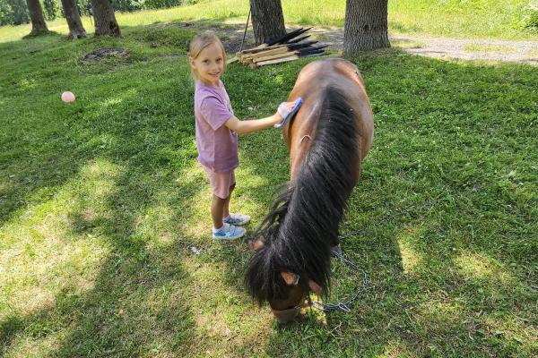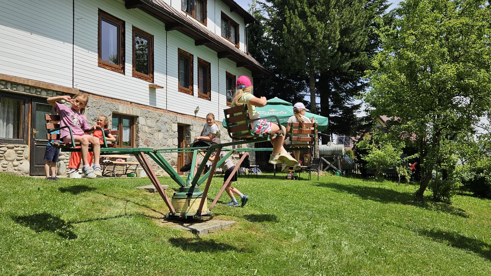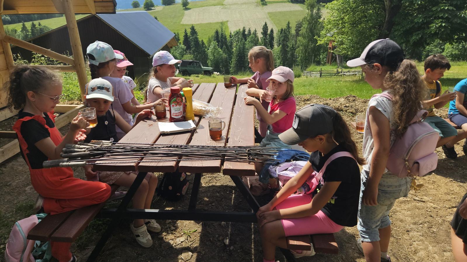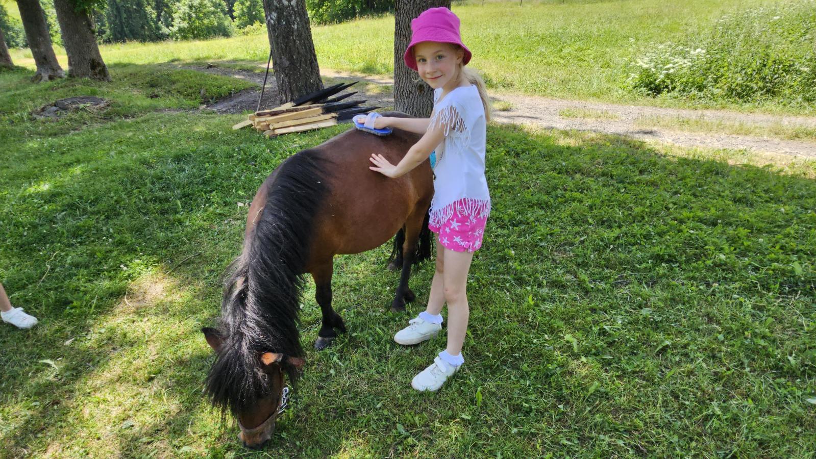 Dzieci miały okazję zobaczyć z bliska zwierzęta hodowlane, takie jak: kozy, owce, krowy, alpaki, kucyki, a także wyjątkowe krowy z długą sierścią. Największą radość sprawiła możliwość pogłaskania i nakarmienia zwierząt, a niektóre dzieci po raz pierwszy w życiu mogły poczuć, jak to jest jechać na kucyku! Nie zabrakło również akcentów ogrodniczych – dzieci zwiedziły piękny ogródek, pełen różnorodnych warzyw, a następnie wzięły udział w zabawnym quizie „Co to za warzywo?”, który wywołał wiele śmiechu i radości. Po pełnym wrażeń zwiedzaniu przyszedł czas na zabawy na świeżym powietrzu oraz wspólne ognisko z pieczeniem kiełbasek, które smakowały wyjątkowo po tak aktywnym dniu.