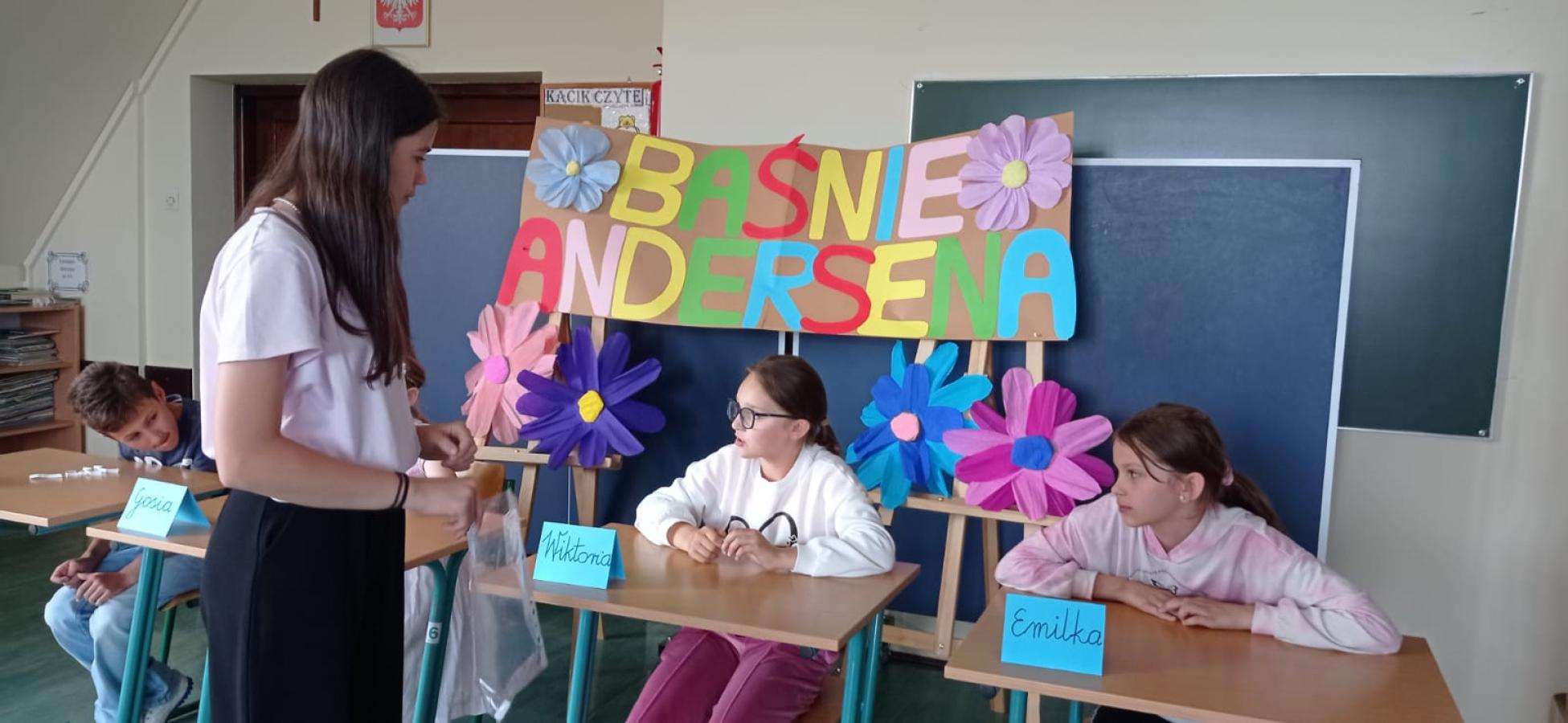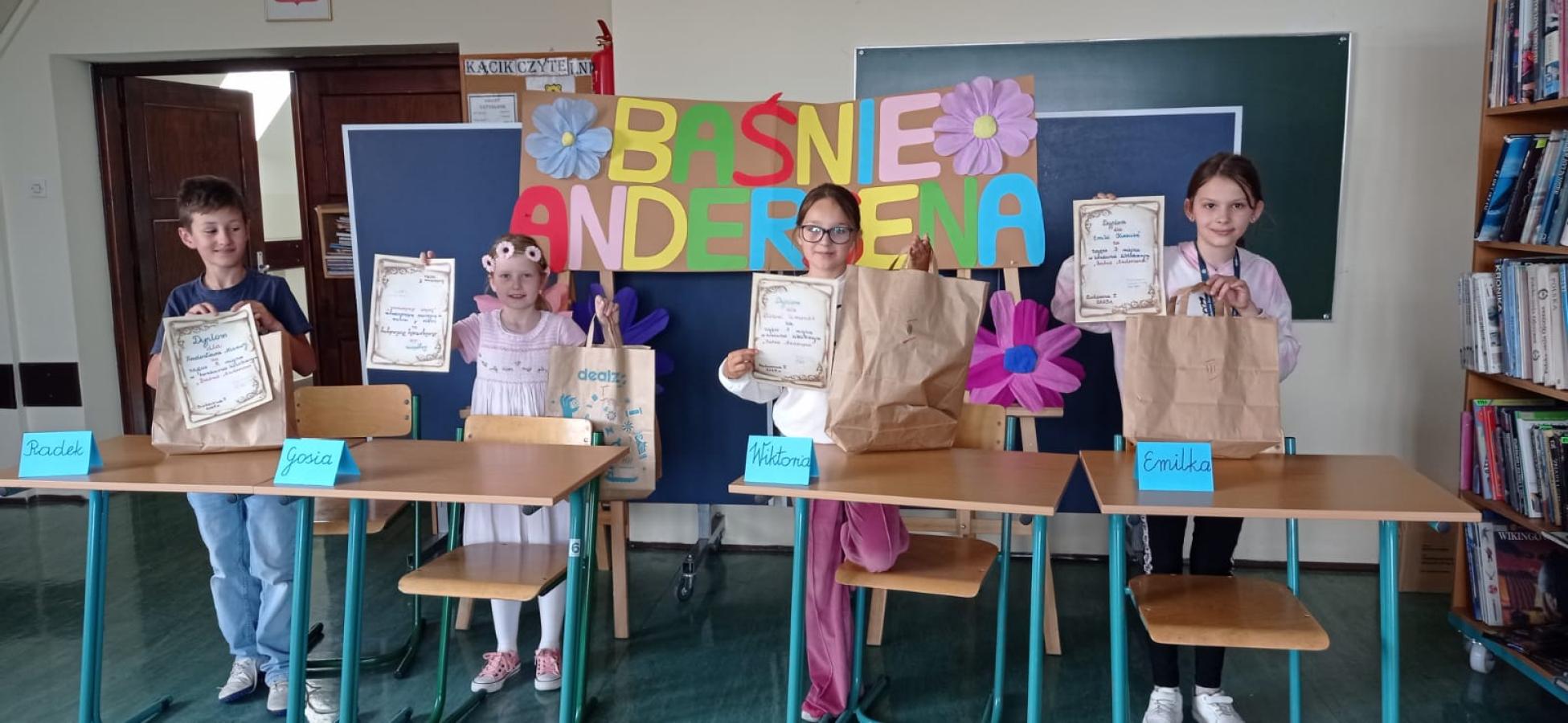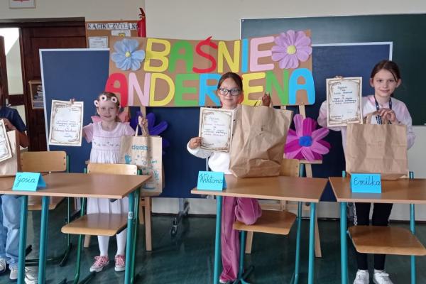 Konkurs odbywa się w naszej szkole co roku i jest przeznaczony dla uczniów klas trzecich. W bieżącym roku szkolnym przebiegał w trzech etapach. W I etapie uczestnicy rozwiązywali test i krzyżówkę, wykorzystując znajomość baśni Andersena. Do II etapu zakwalifikowali się uczniowie z najwyższą liczbą punktów. W drugim etapie uczestnicy wykonali ilustrację do wcześniej wylosowanej baśni, posługując się dowolną techniką plastyczną. W III etapie uczniowie musieli wykazać się znajomością treści wszystkich wskazanych baśni Andersena, rozwiązując zadania polegające na układaniu puzzli, rozpoznawaniu eksponatów, przyporządkowaniu ptaków do baśni oraz rozpoznawaniu postaci przedstawionych za pomocą pantomimy.