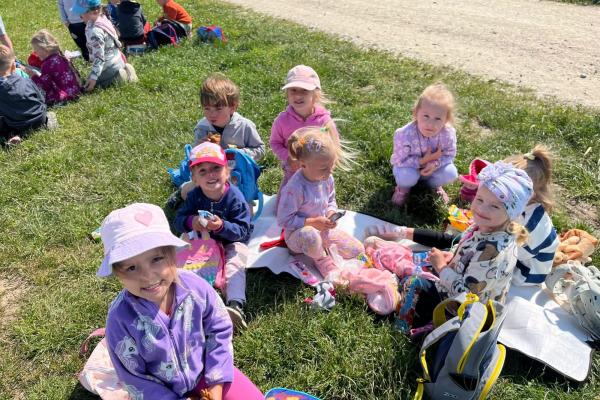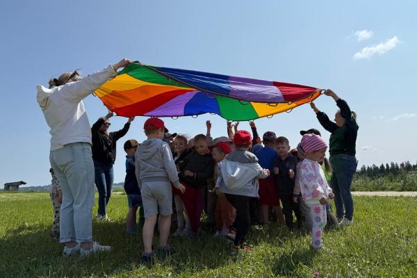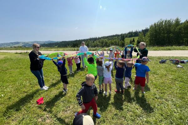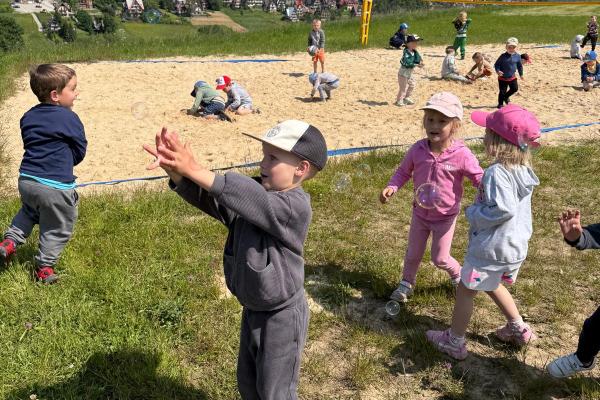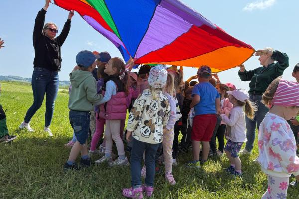 Po smacznym posiłku przyszedł czas na zabawę! Dzieci radośnie bawiły się piłką, chustą animacyjną oraz gumą sensoryczną. Nie zabrakło także ulubionych baniek mydlanych, które unosiły się nad łąką, wywołując mnóstwo uśmiechów i zachwyt. To był dzień pełen radości, ruchu i wspólnej zabawy na świeżym powietrzu!