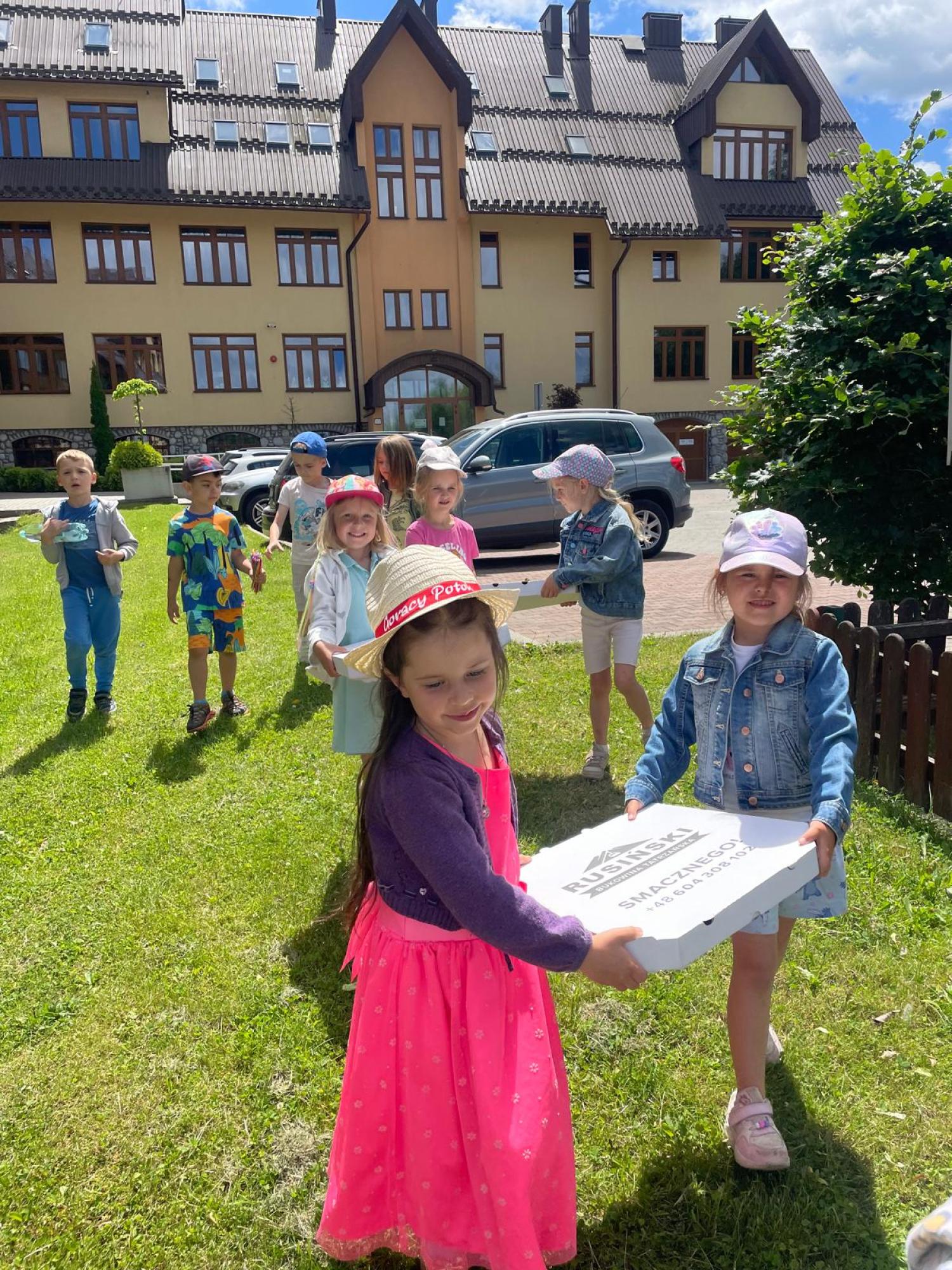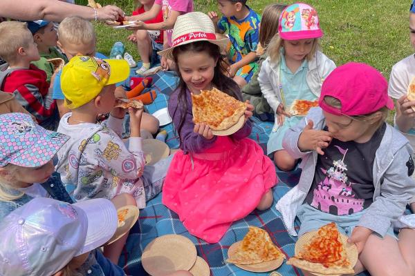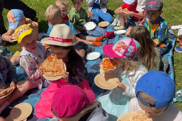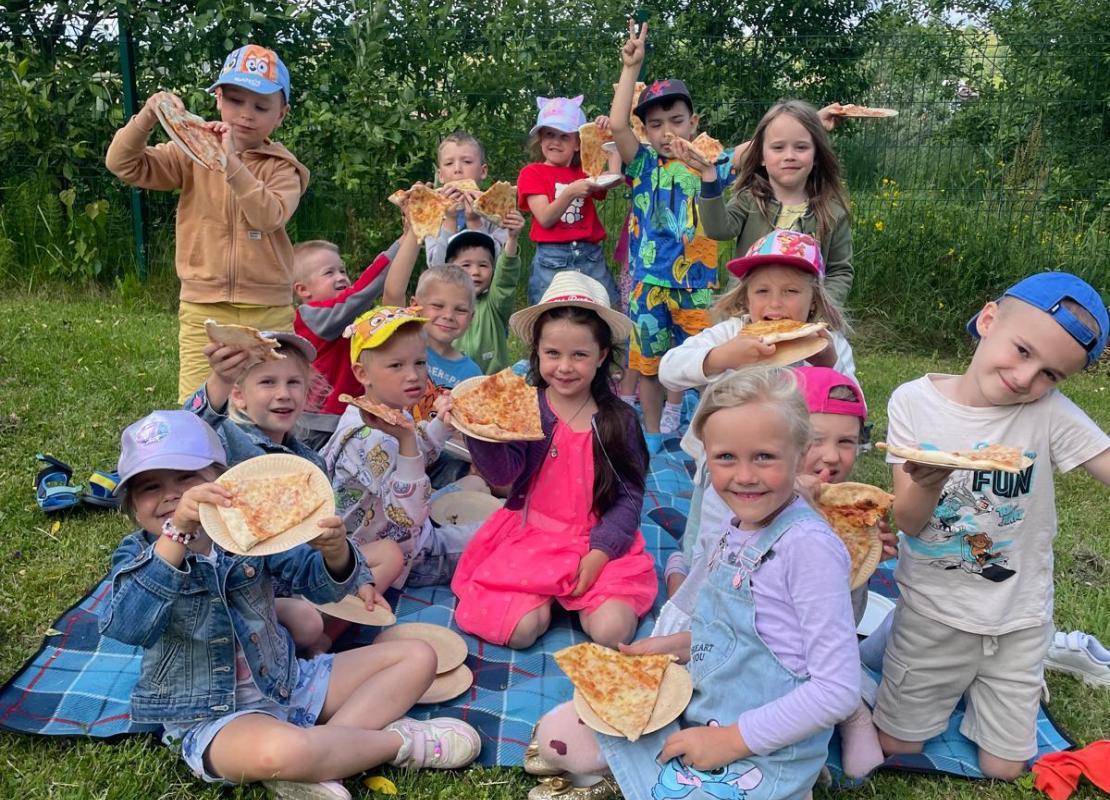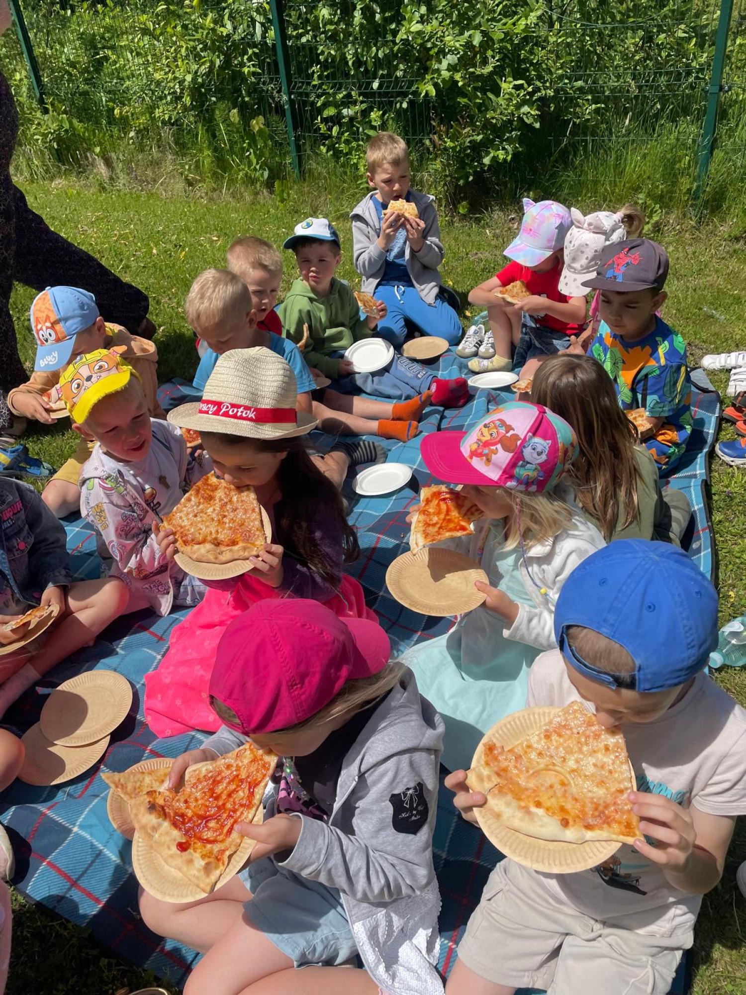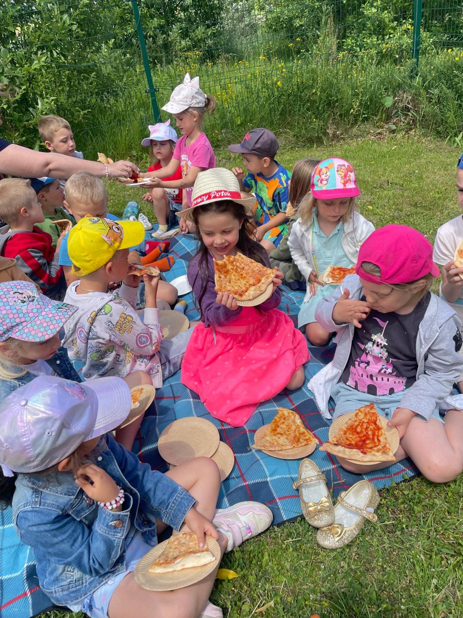 Największą atrakcją tego dnia była oczywiście pyszna pizza! Wspólne jedzenie na kocu smakowało wszystkim jeszcze bardziej niż zwykle. Było dużo śmiechu, rozmów i radości.
