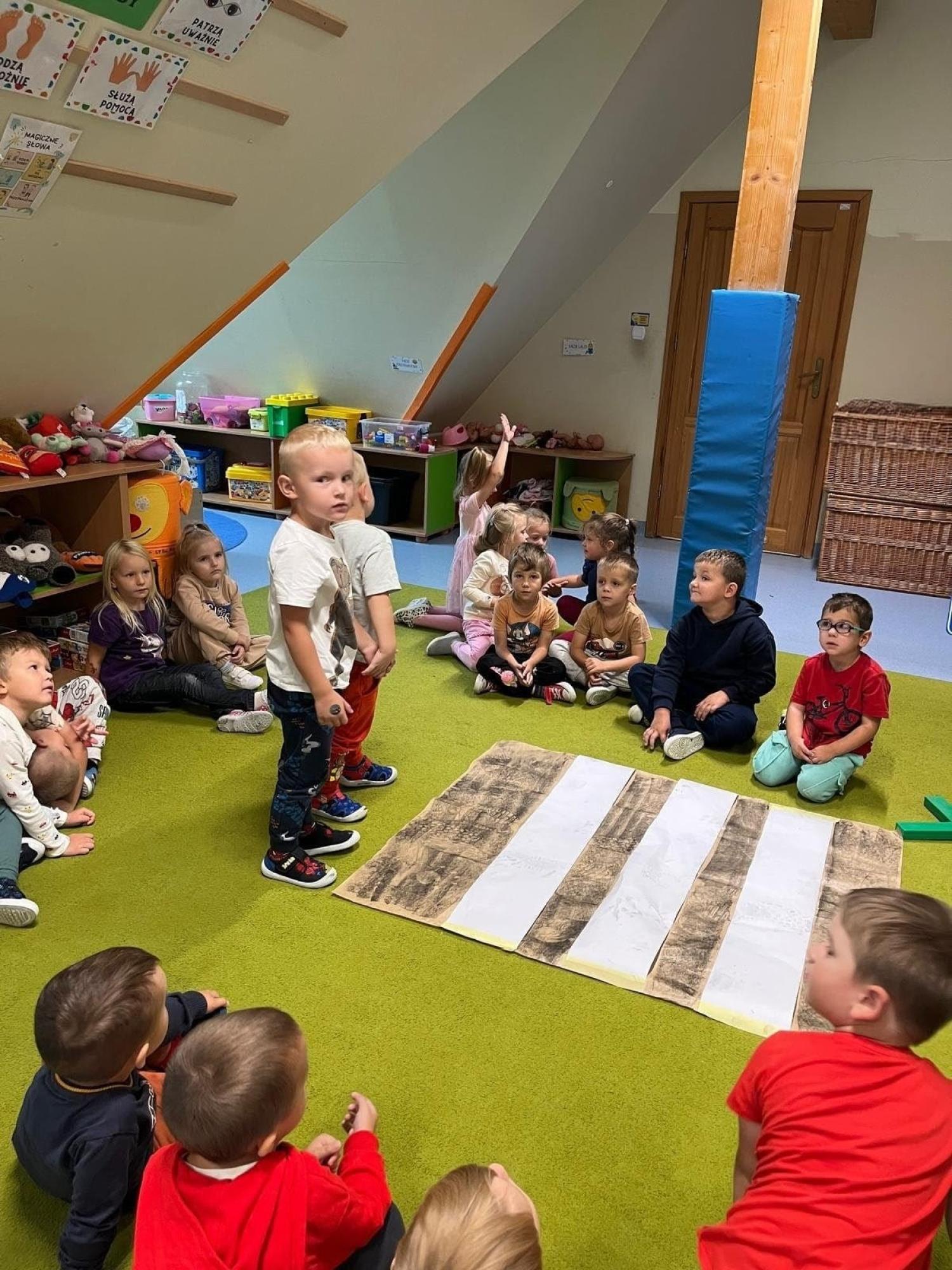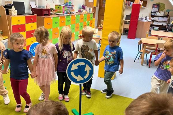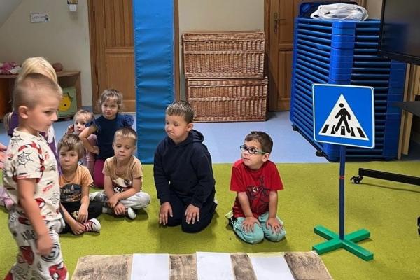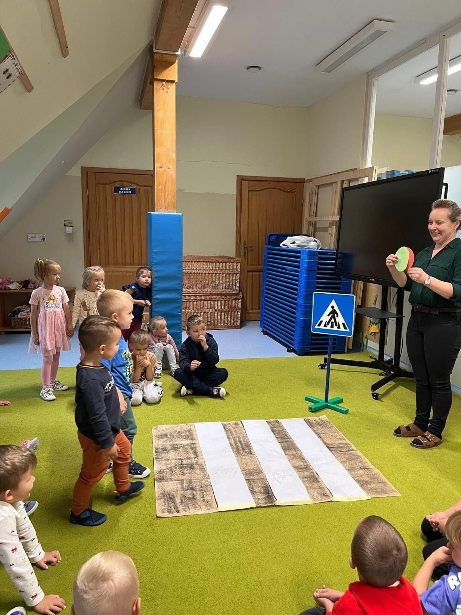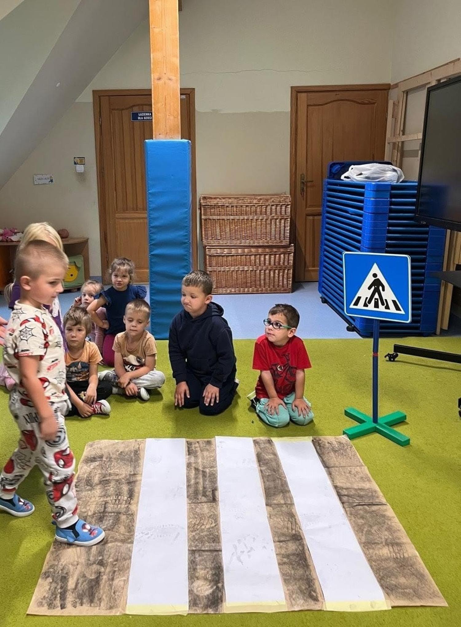 We wrześniu dzieci z grupy „Migotki Radości” uczestniczyły w zajęciach dotyczących bezpieczeństwa na drodze. Uczyły się, jak prawidłowo przechodzić przez ulicę, rozpoznawać podstawowe znaki drogowe i nosić odblaski, aby być dobrze widocznym.