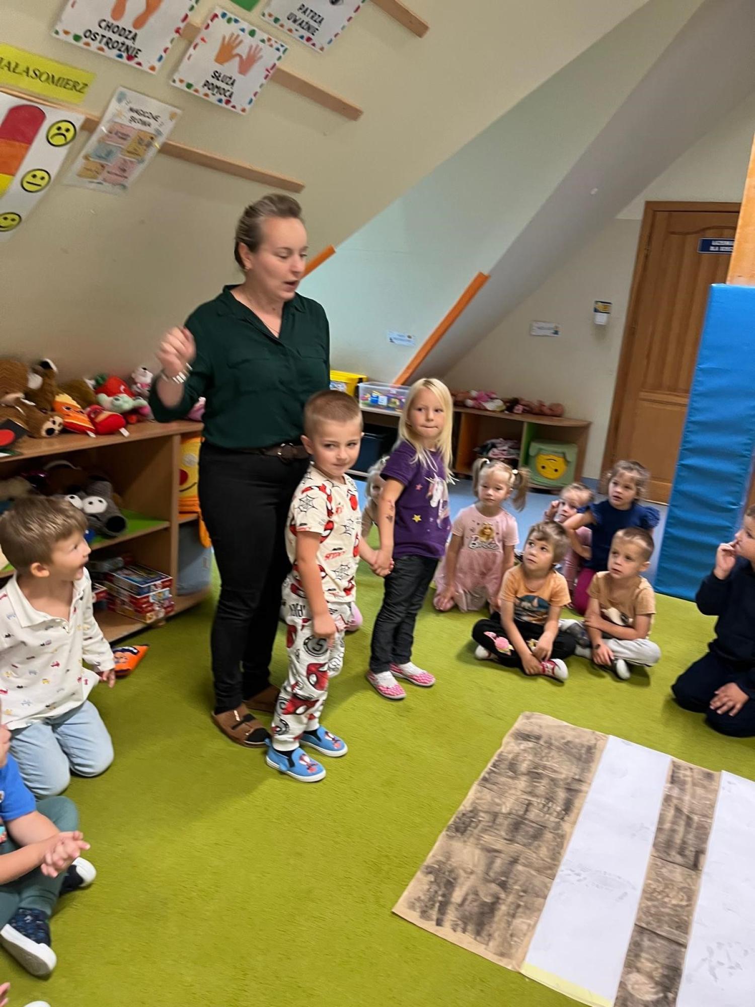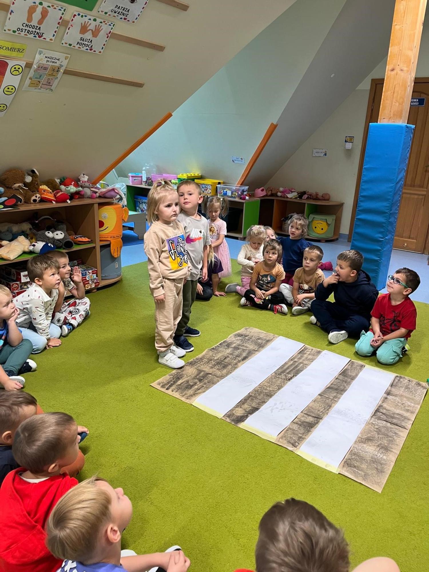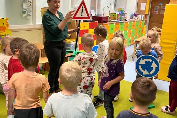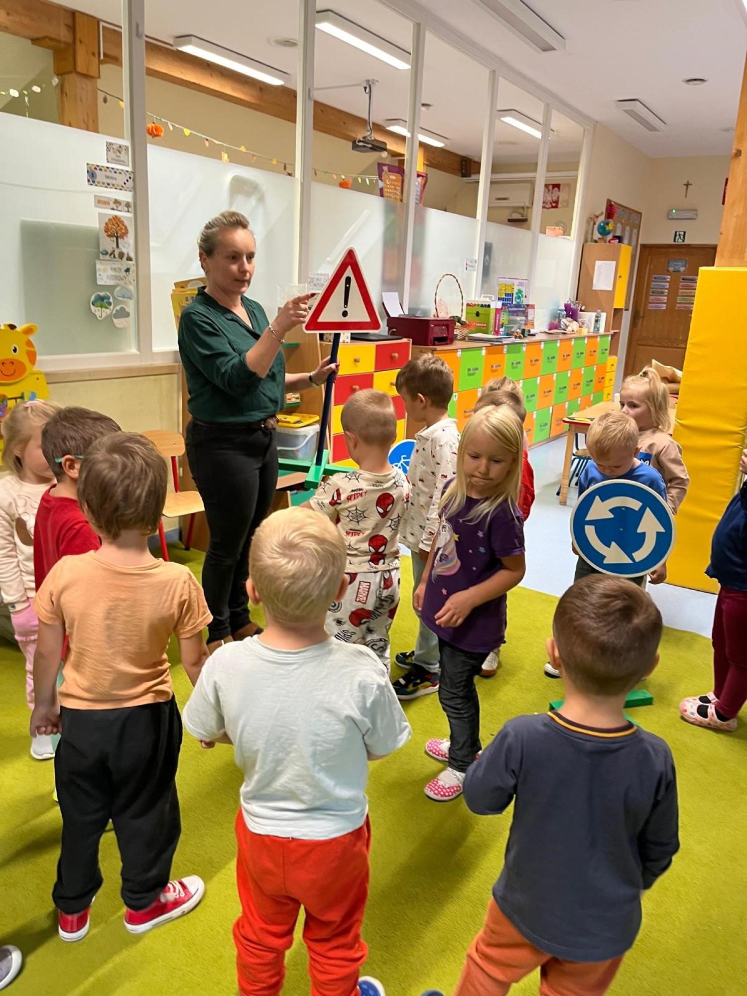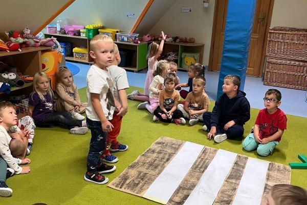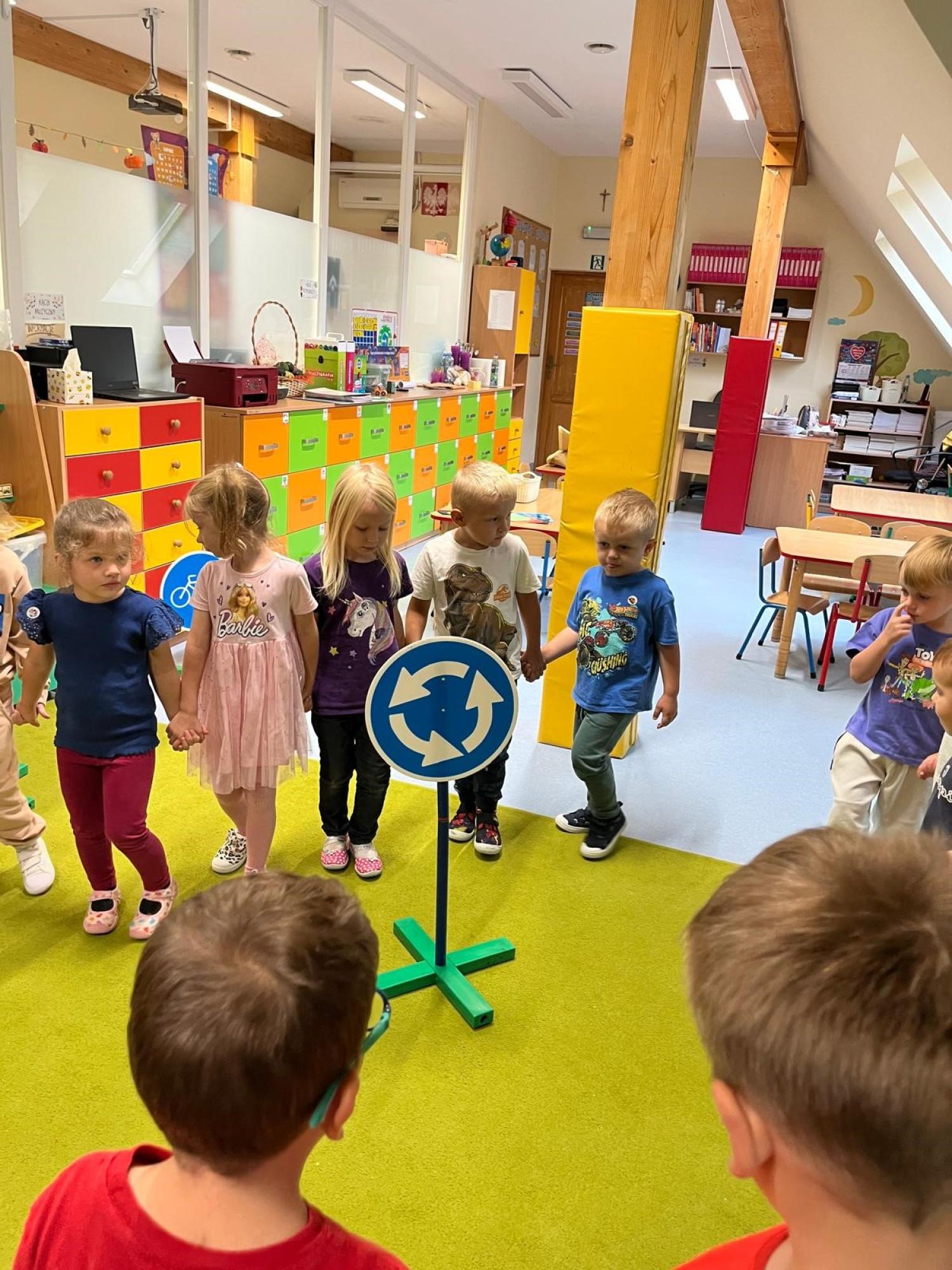 We wrześniu dzieci z grupy „Migotki Radości” uczestniczyły w zajęciach dotyczących bezpieczeństwa na drodze. Uczyły się, jak prawidłowo przechodzić przez ulicę, rozpoznawać podstawowe znaki drogowe i nosić odblaski, aby być dobrze widocznym.