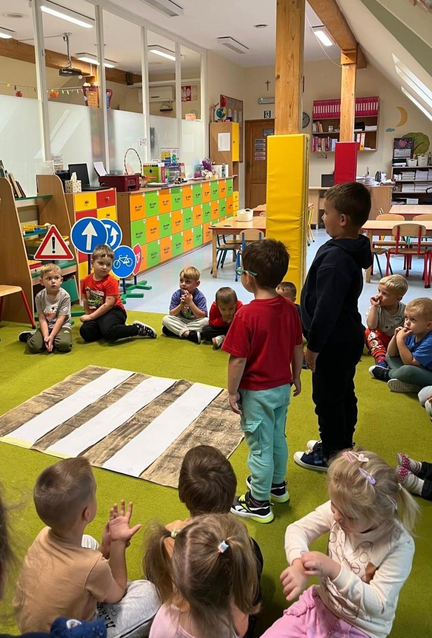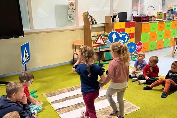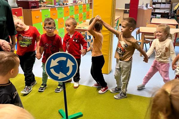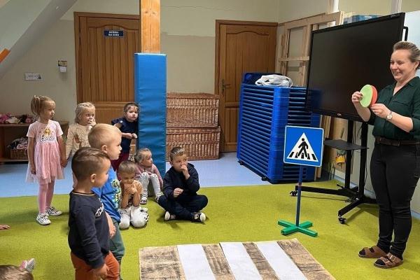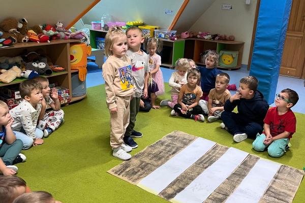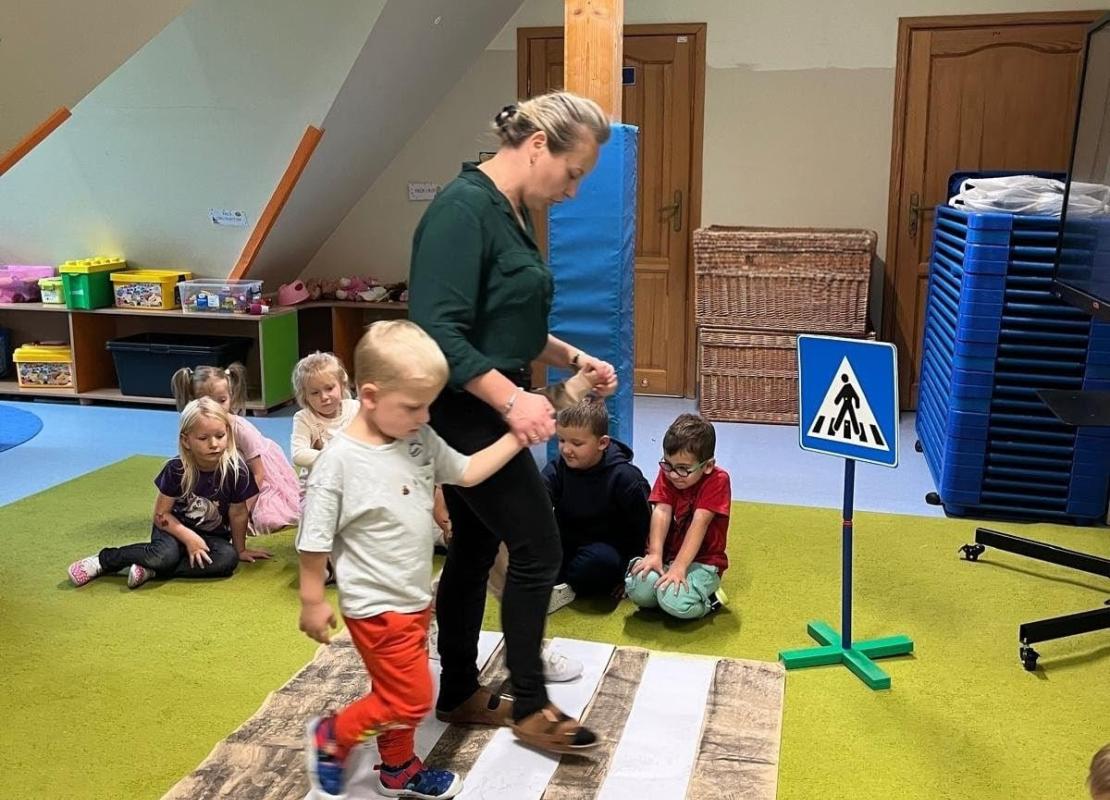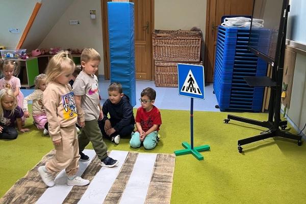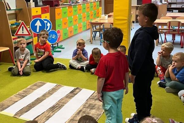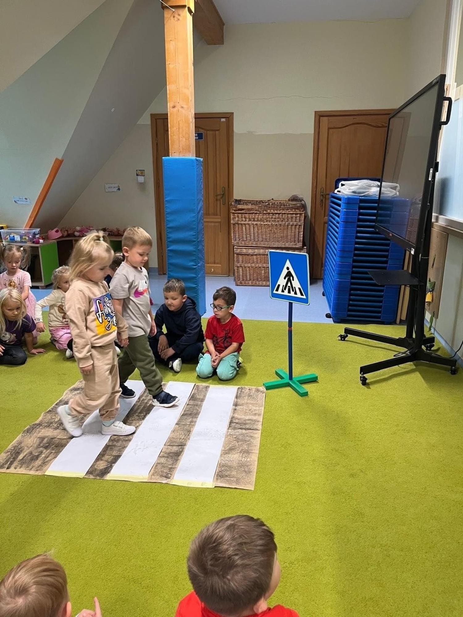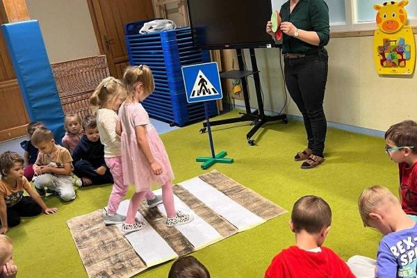 Zajęcia były pełne zabaw, gier i scenek, dzięki którym dzieci mogły aktywnie utrwalać zdobytą wiedzę. Przedszkolaki chętnie odpowiadały na pytania i ćwiczyły prawidłowe przechodzenie przez ulicę.