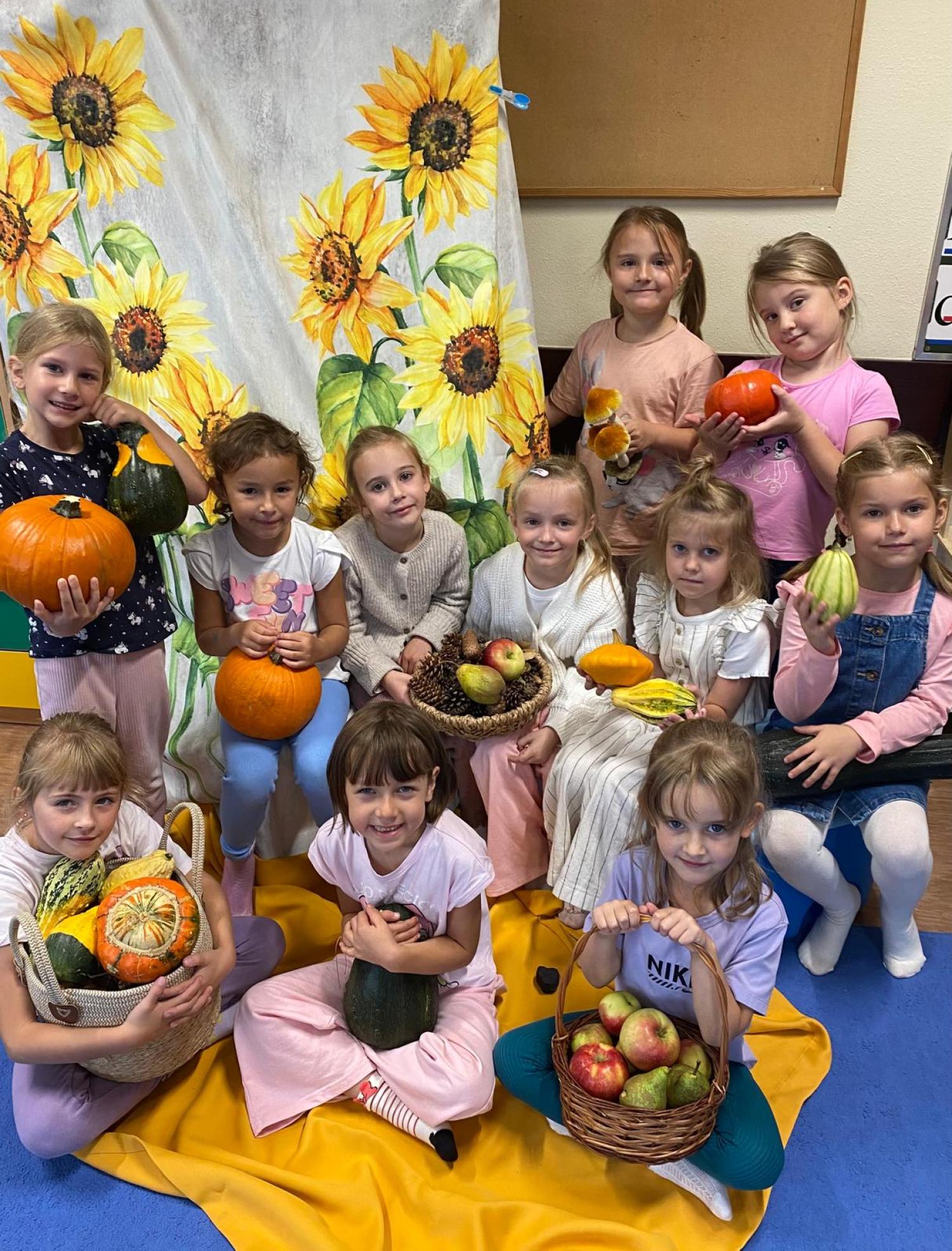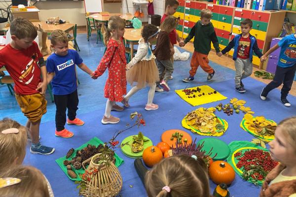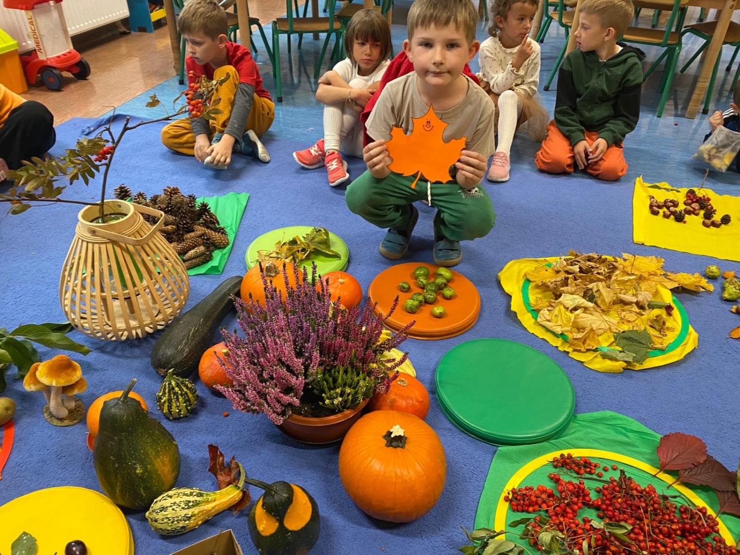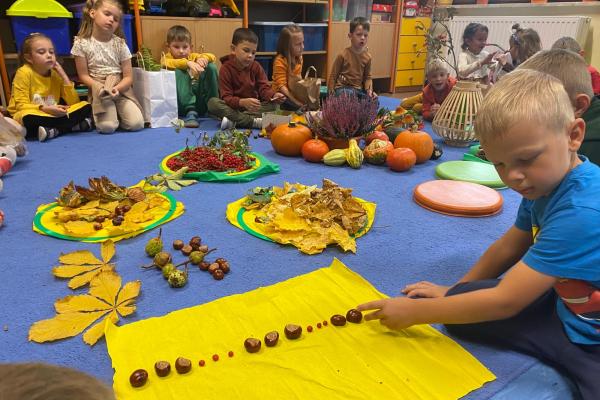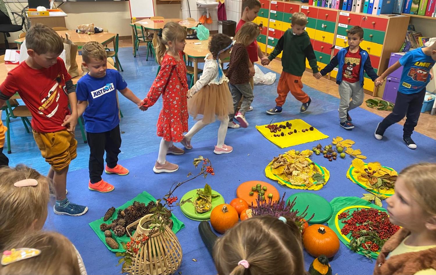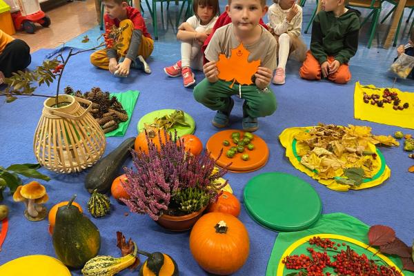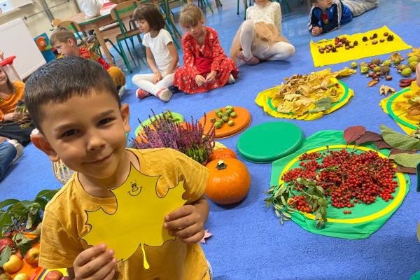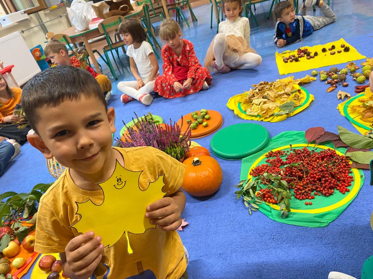 Pierwszy dzień jesieni był w naszym przedszkolu pełen uśmiechów i zabawy. Dzieci z grup 0a i 0b odkrywały uroki nowej pory roku – oglądały jej dary, rysowały Panią Jesień, przeliczały jej skarby, tańczyły i wspólnie świętowały. To był wyjątkowy dzień, który na długo zostanie w pamięci przedszkolaków.