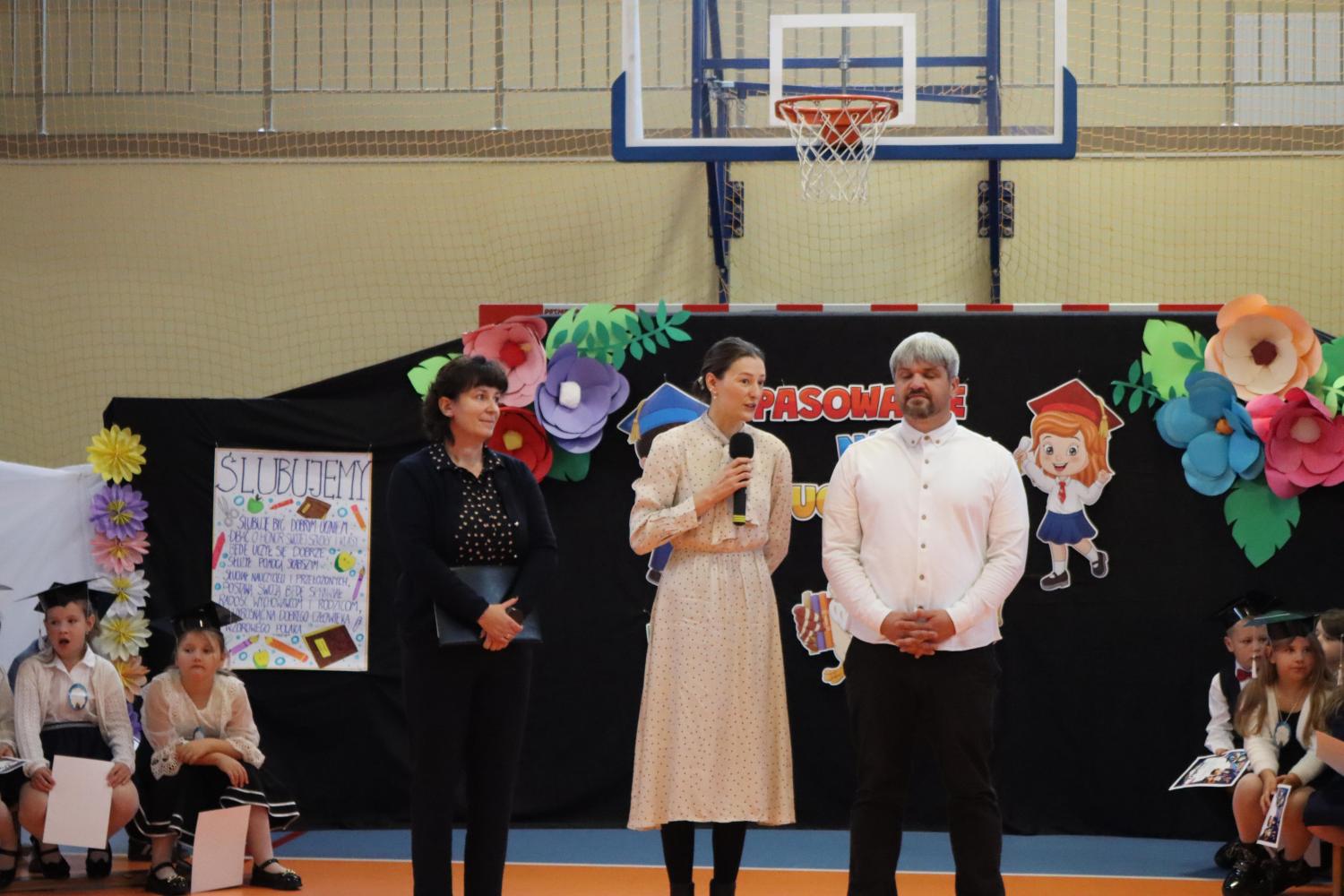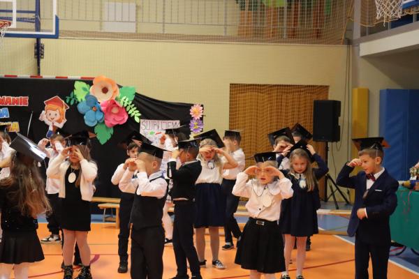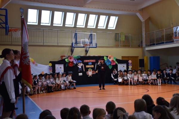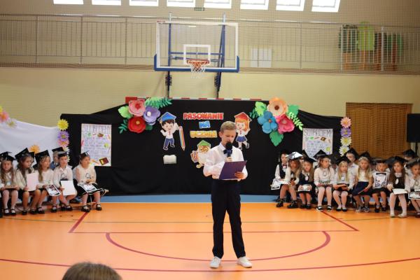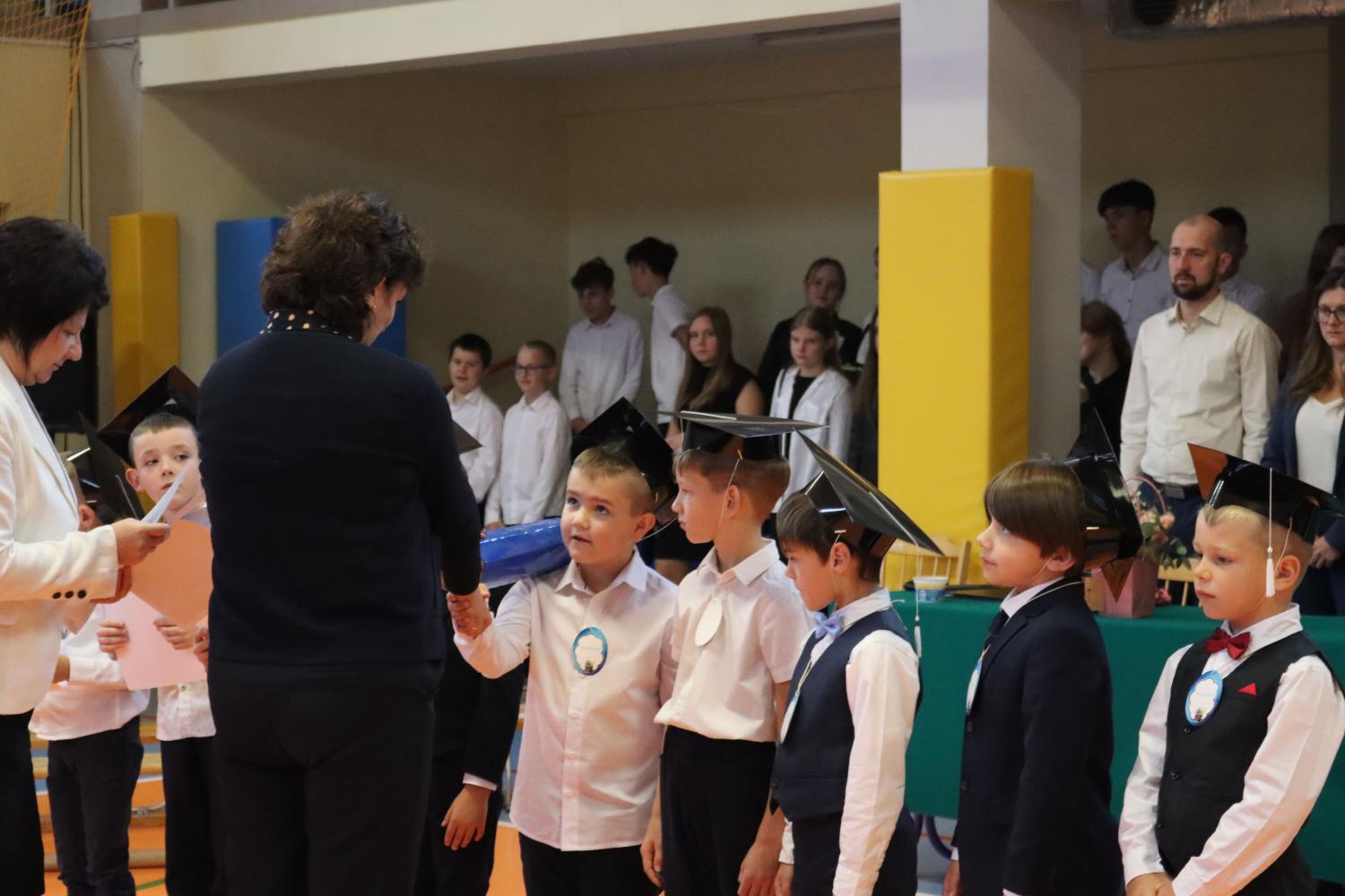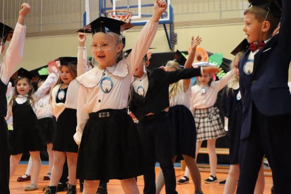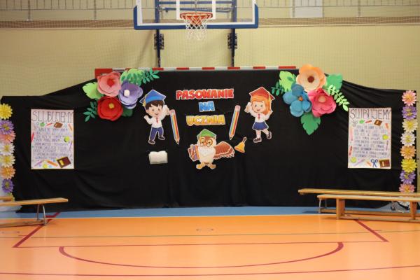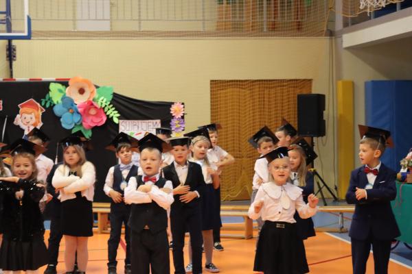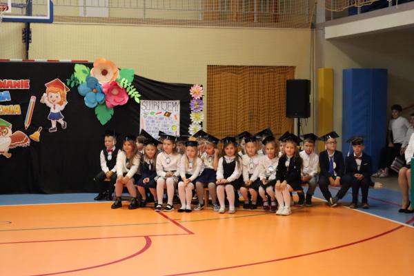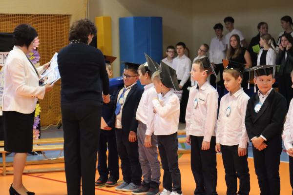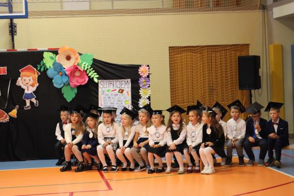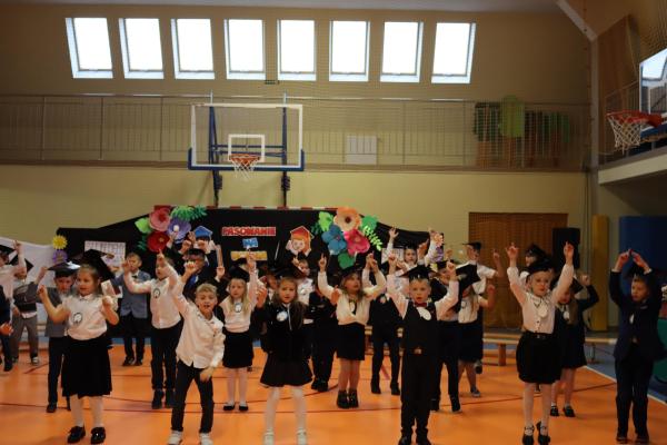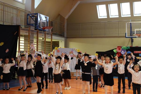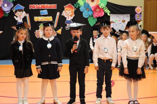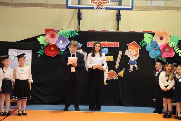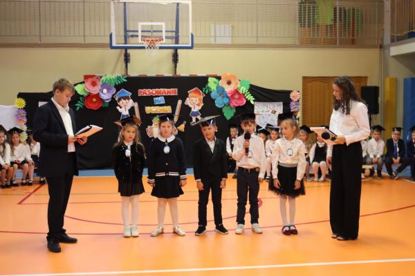 Uroczystość rozpoczęła się od części artystycznej przygotowanej przez uczniów klas VIII pod kierunkiem pani Małgorzaty Budz i pani Doroty Sztokfisz. Ósmoklasiści, przebrani za postacie z popularnych bajek, wprowadzili publiczność w radosny i zabawny nastrój. Później scenę przejęli bohaterowie dnia – uczniowie klas pierwszych. W odświętnych strojach, z uśmiechem i ogromnym przejęciem, zaprezentowali swój program artystyczny. Recytowali wiersze, śpiewali piosenki i tańczyli, pokazując, że są już gotowi, aby stać się pełnoprawnymi uczniami. Następnie nadszedł najbardziej uroczysty moment całego dnia – ślubowanie pierwszoklasistów. Dzieci wypowiedziały słowa przysięgi, a pani dyrektor dokonała aktu pasowania na ucznia, dotykając ramienia każdego pierwszaka dużym, symbolicznym ołówkiem. Świeżo pasowani pierwszoklasiści otrzymali pamiątkowe dyplomy oraz drobne upominki, które będą im przypominać o tym wyjątkowym dniu.