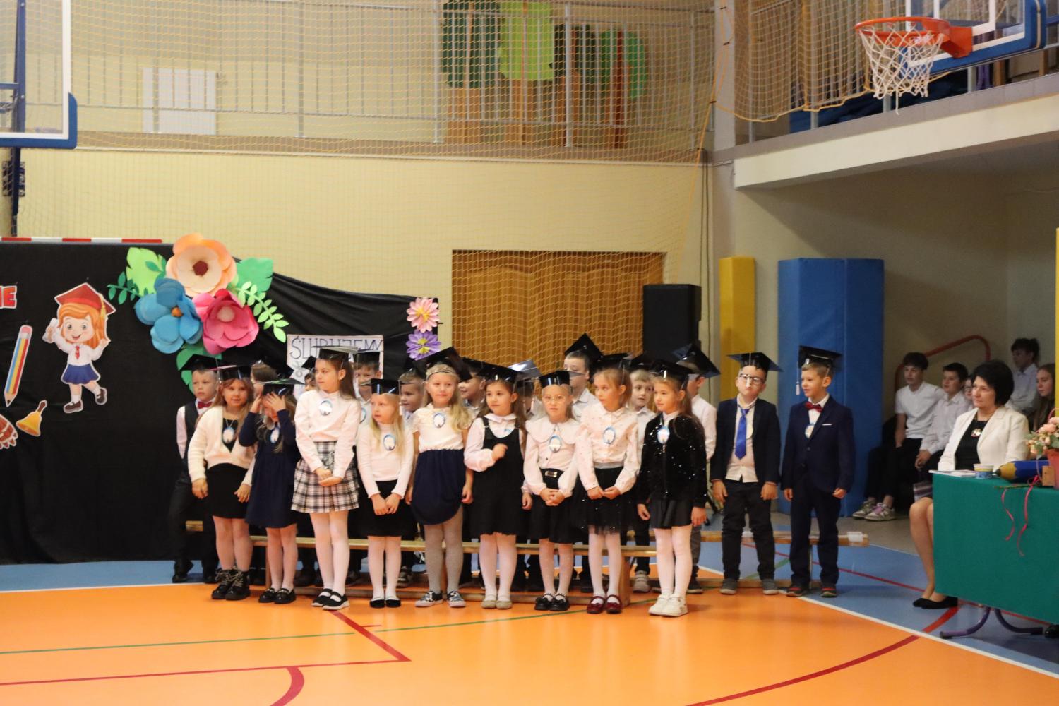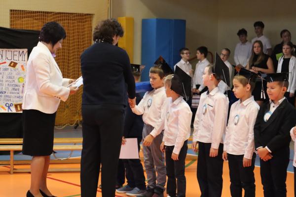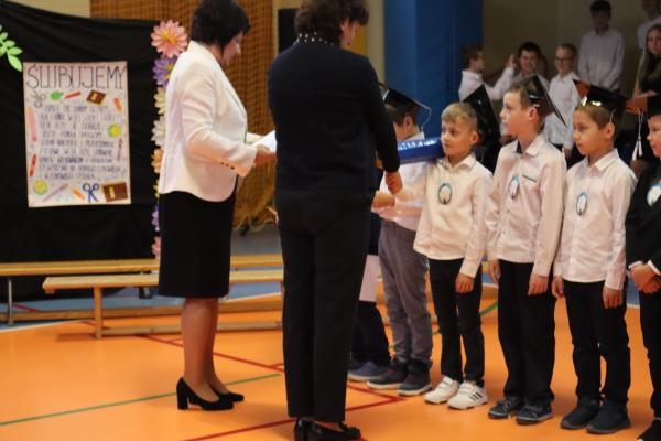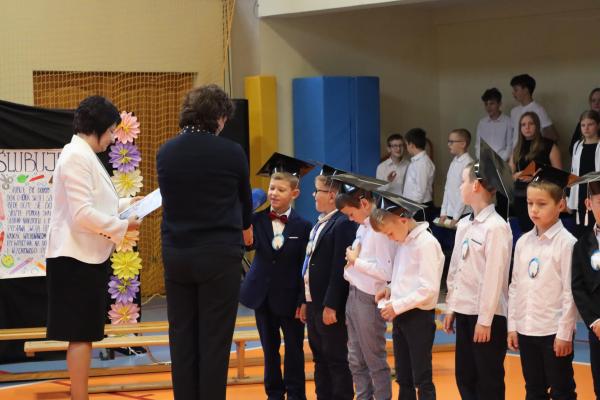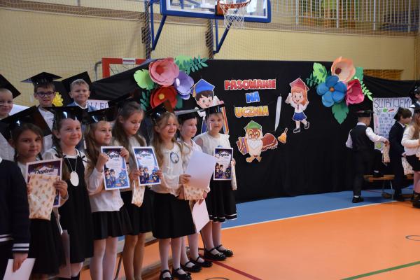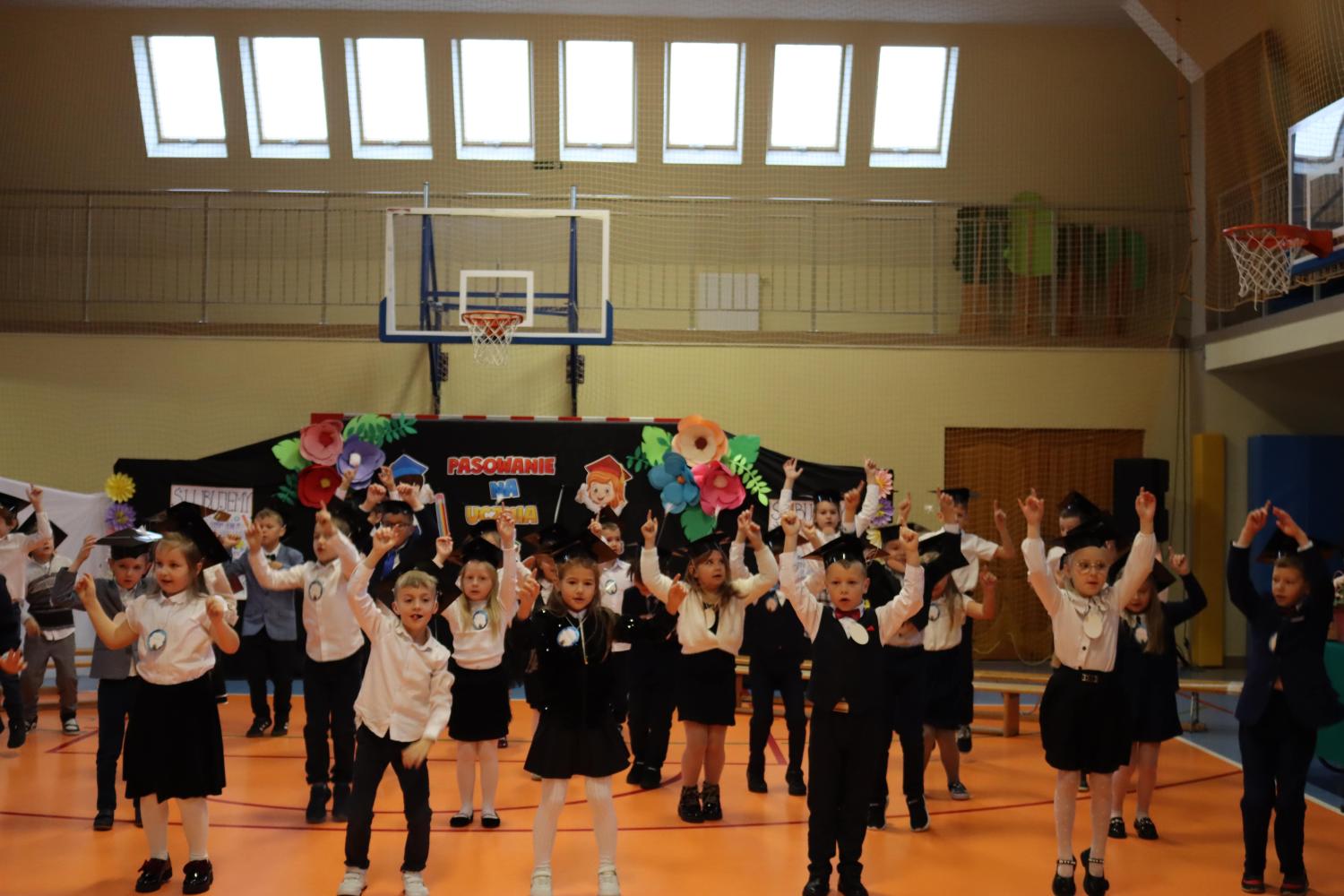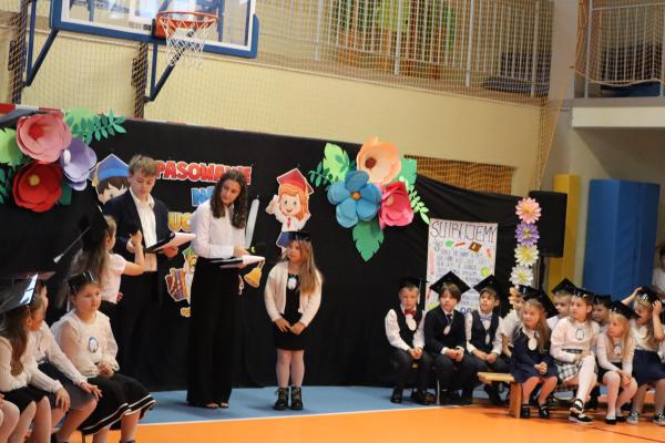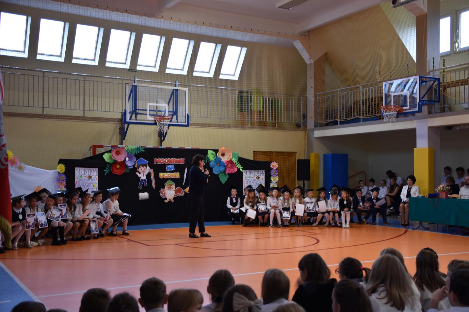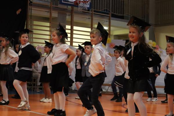 Uroczystość rozpoczęła się od części artystycznej przygotowanej przez uczniów klas VIII pod kierunkiem pani Małgorzaty Budz i pani Doroty Sztokfisz. Ósmoklasiści, przebrani za postacie z popularnych bajek, wprowadzili publiczność w radosny i zabawny nastrój. Później scenę przejęli bohaterowie dnia – uczniowie klas pierwszych. W odświętnych strojach, z uśmiechem i ogromnym przejęciem, zaprezentowali swój program artystyczny. Recytowali wiersze, śpiewali piosenki i tańczyli, pokazując, że są już gotowi, aby stać się pełnoprawnymi uczniami. Następnie nadszedł najbardziej uroczysty moment całego dnia – ślubowanie pierwszoklasistów. Dzieci wypowiedziały słowa przysięgi, a pani dyrektor dokonała aktu pasowania na ucznia, dotykając ramienia każdego pierwszaka dużym, symbolicznym ołówkiem. Świeżo pasowani pierwszoklasiści otrzymali pamiątkowe dyplomy oraz drobne upominki, które będą im przypominać o tym wyjątkowym dniu.