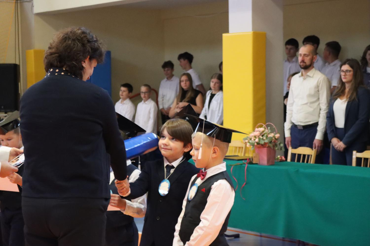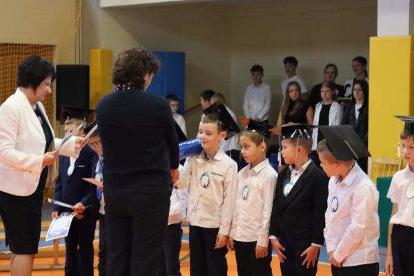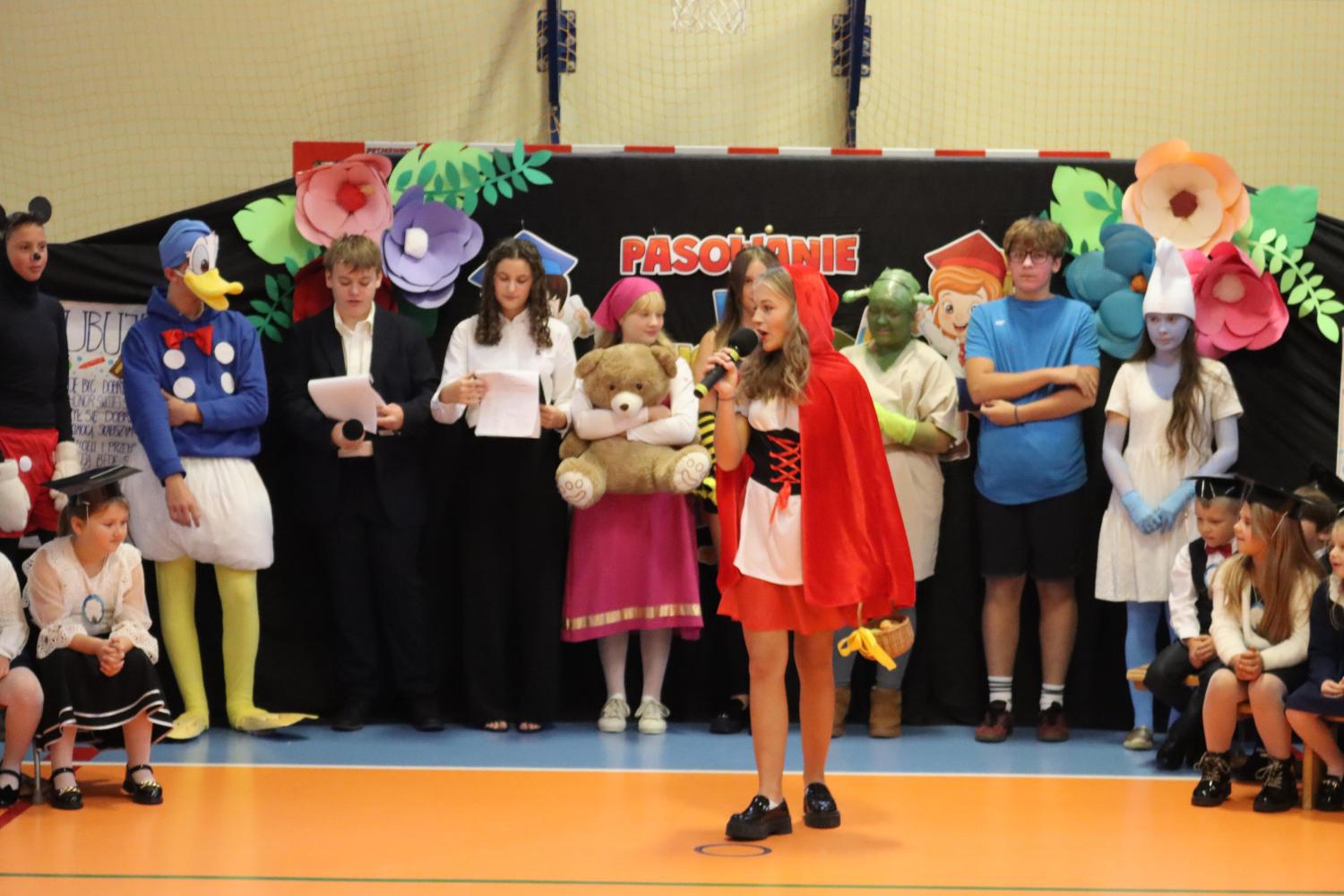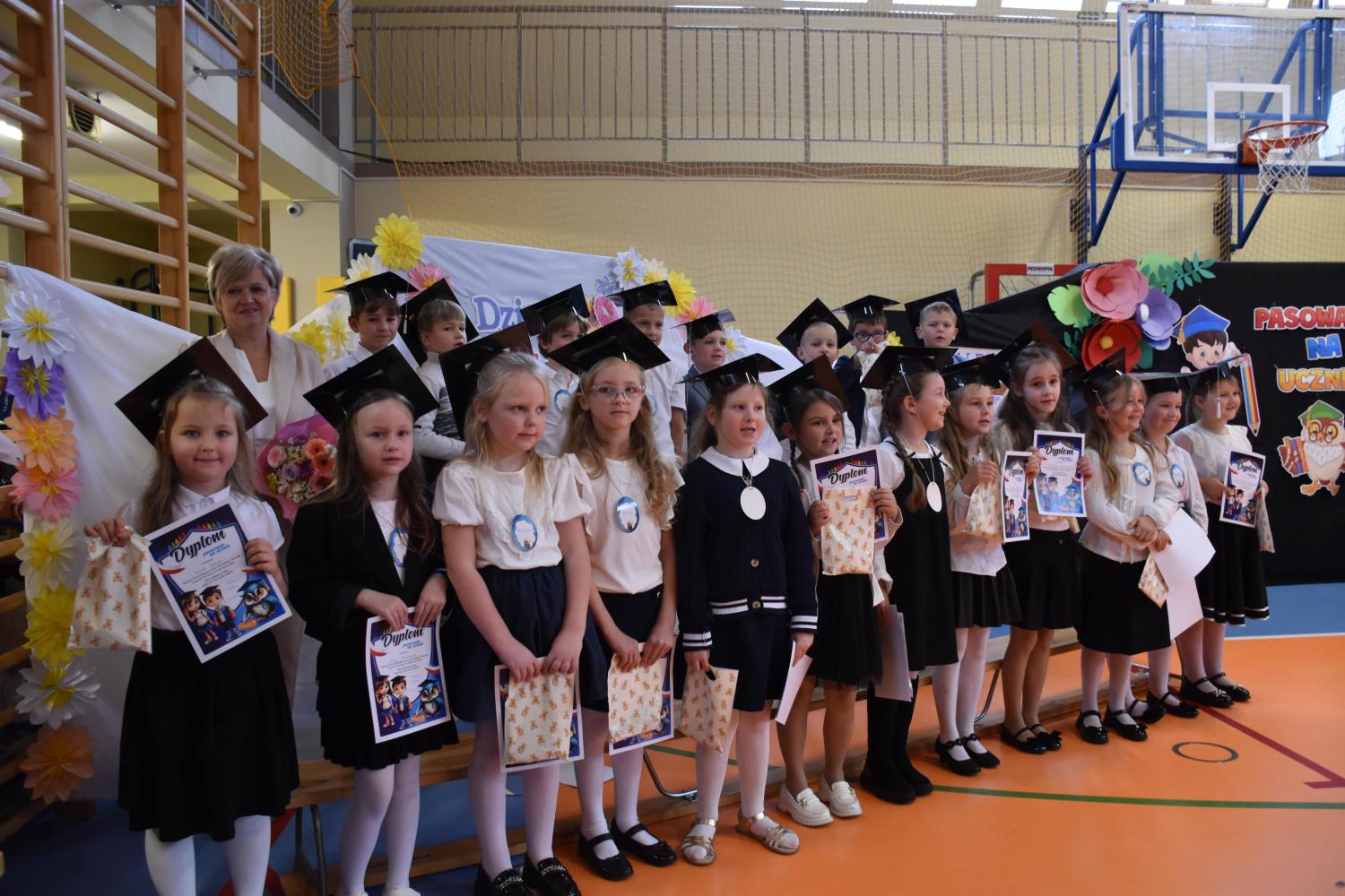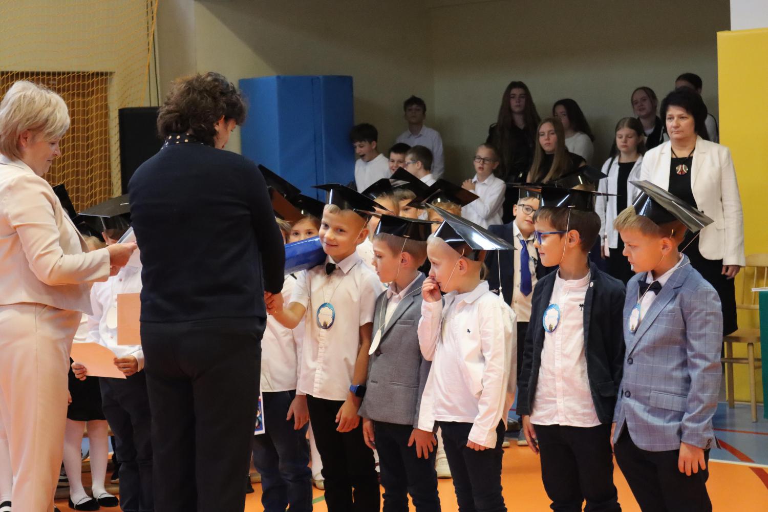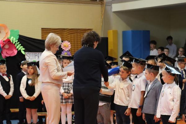 Uroczystość rozpoczęła się od części artystycznej przygotowanej przez uczniów klas VIII pod kierunkiem pani Małgorzaty Budz i pani Doroty Sztokfisz. Ósmoklasiści, przebrani za postacie z popularnych bajek, wprowadzili publiczność w radosny i zabawny nastrój. Później scenę przejęli bohaterowie dnia – uczniowie klas pierwszych. W odświętnych strojach, z uśmiechem i ogromnym przejęciem, zaprezentowali swój program artystyczny. Recytowali wiersze, śpiewali piosenki i tańczyli, pokazując, że są już gotowi, aby stać się pełnoprawnymi uczniami. Następnie nadszedł najbardziej uroczysty moment całego dnia – ślubowanie pierwszoklasistów. Dzieci wypowiedziały słowa przysięgi, a pani dyrektor dokonała aktu pasowania na ucznia, dotykając ramienia każdego pierwszaka dużym, symbolicznym ołówkiem. Świeżo pasowani pierwszoklasiści otrzymali pamiątkowe dyplomy oraz drobne upominki, które będą im przypominać o tym wyjątkowym dniu.
