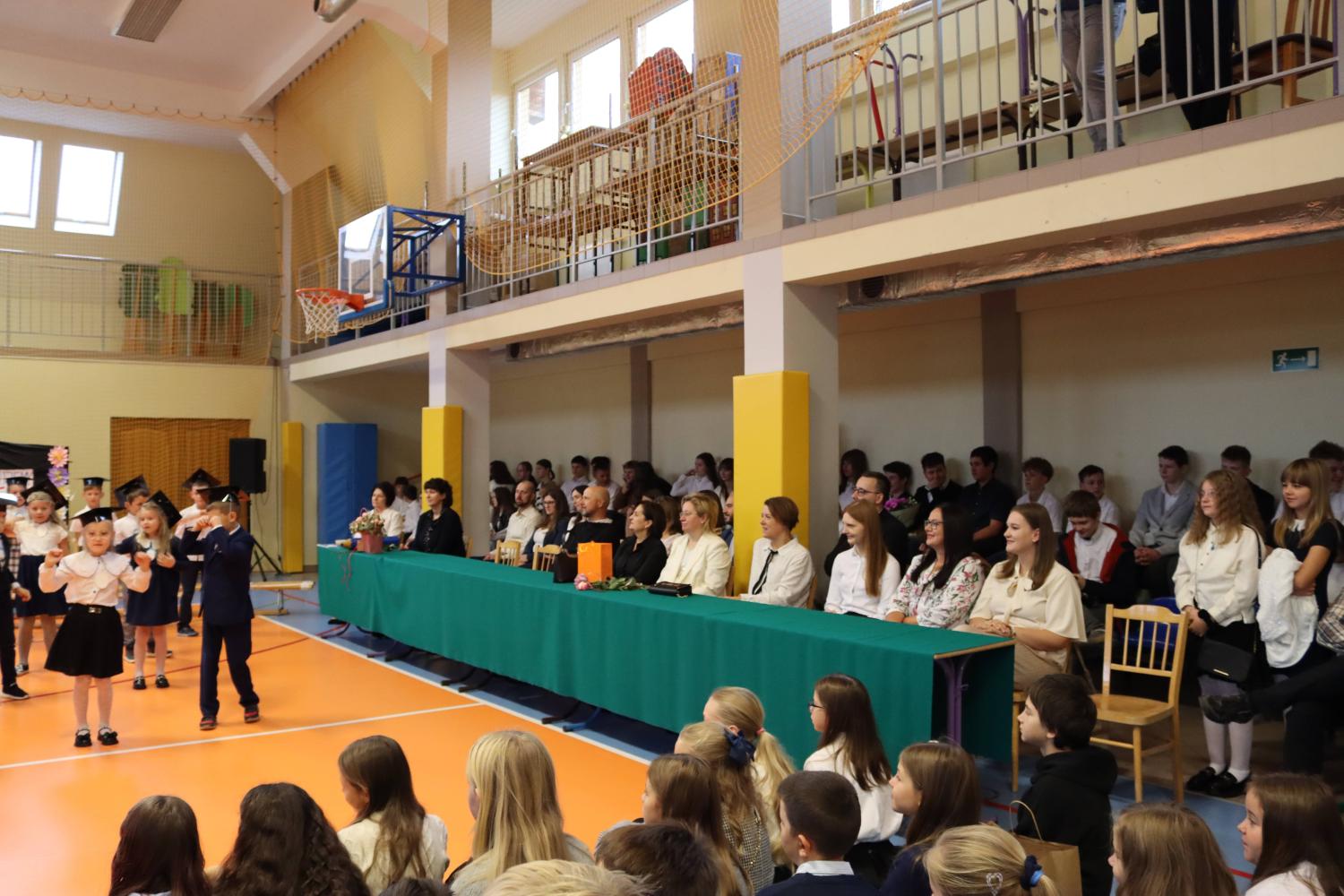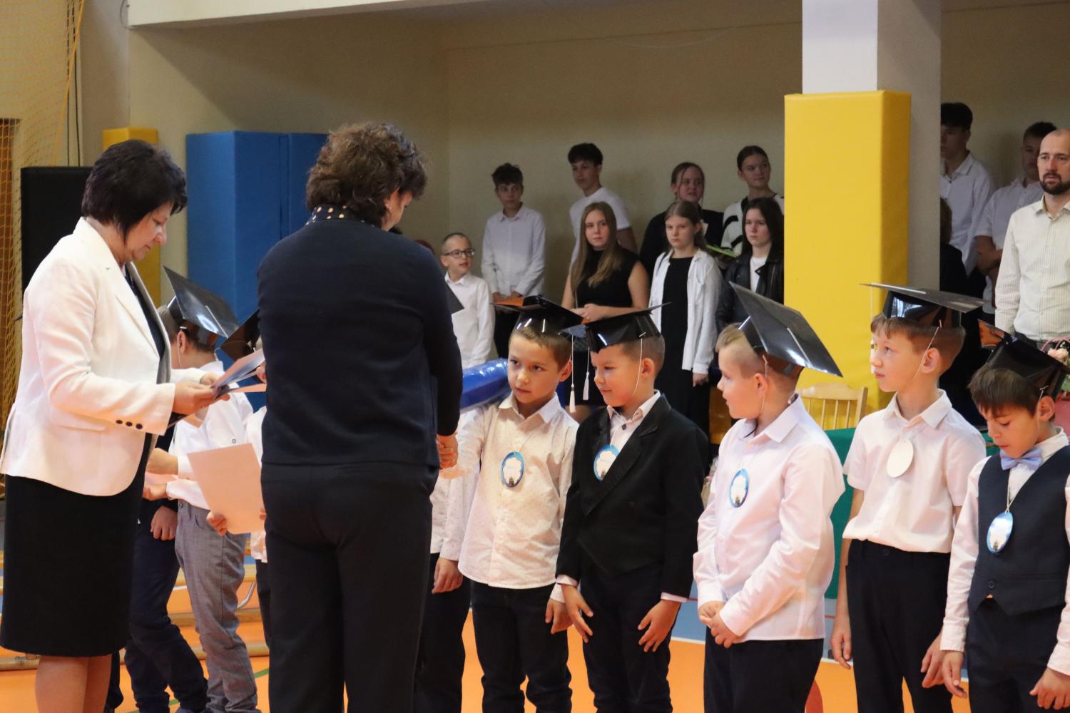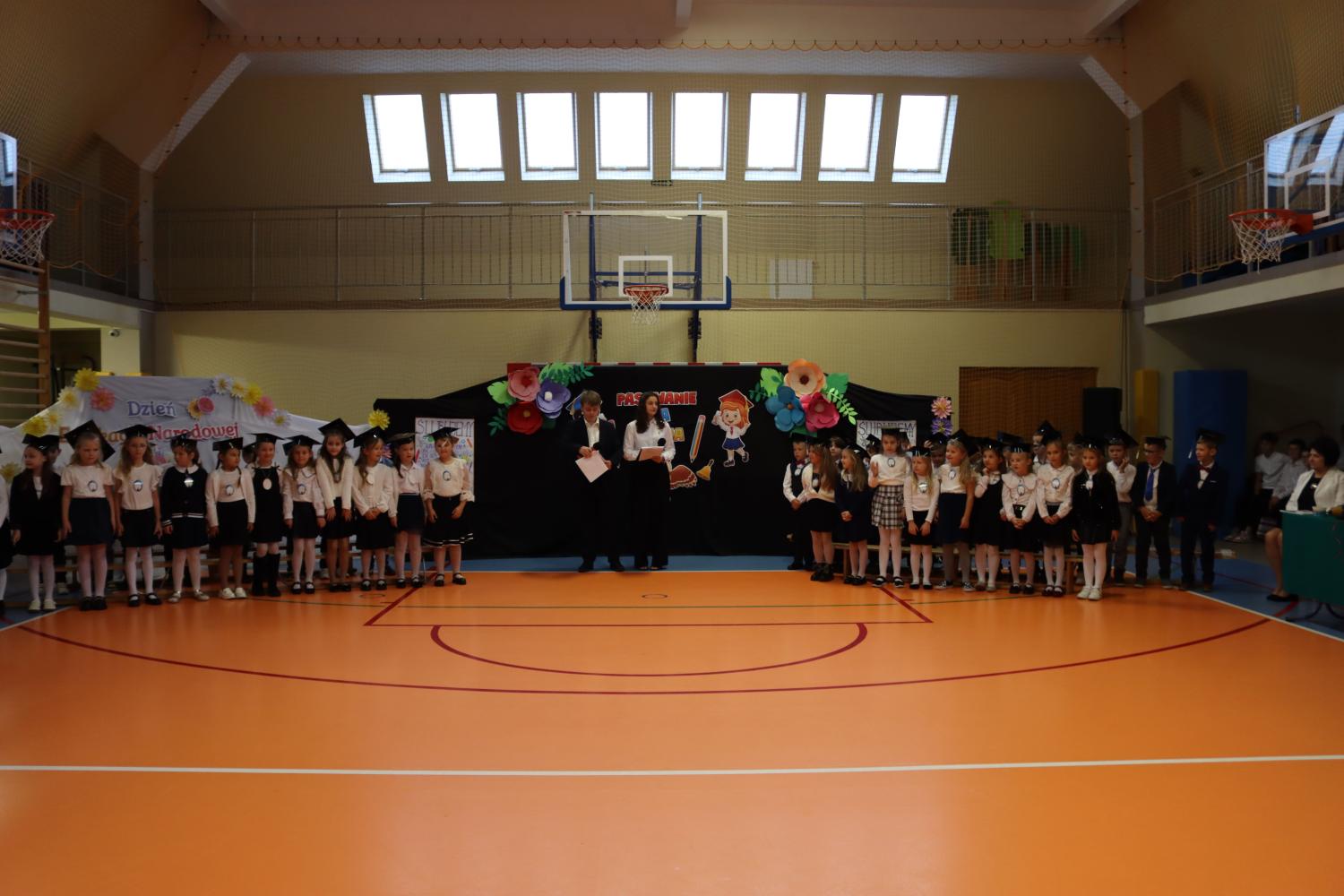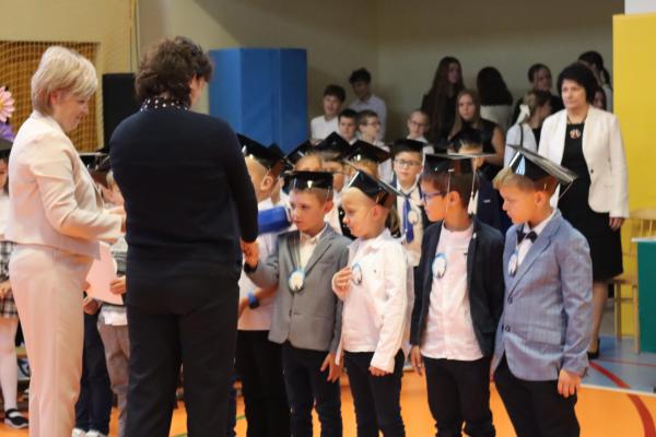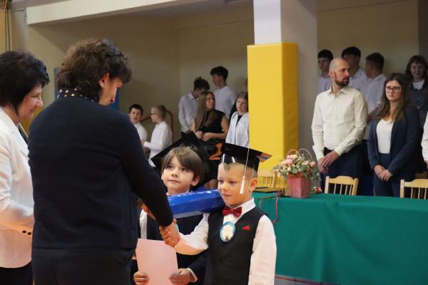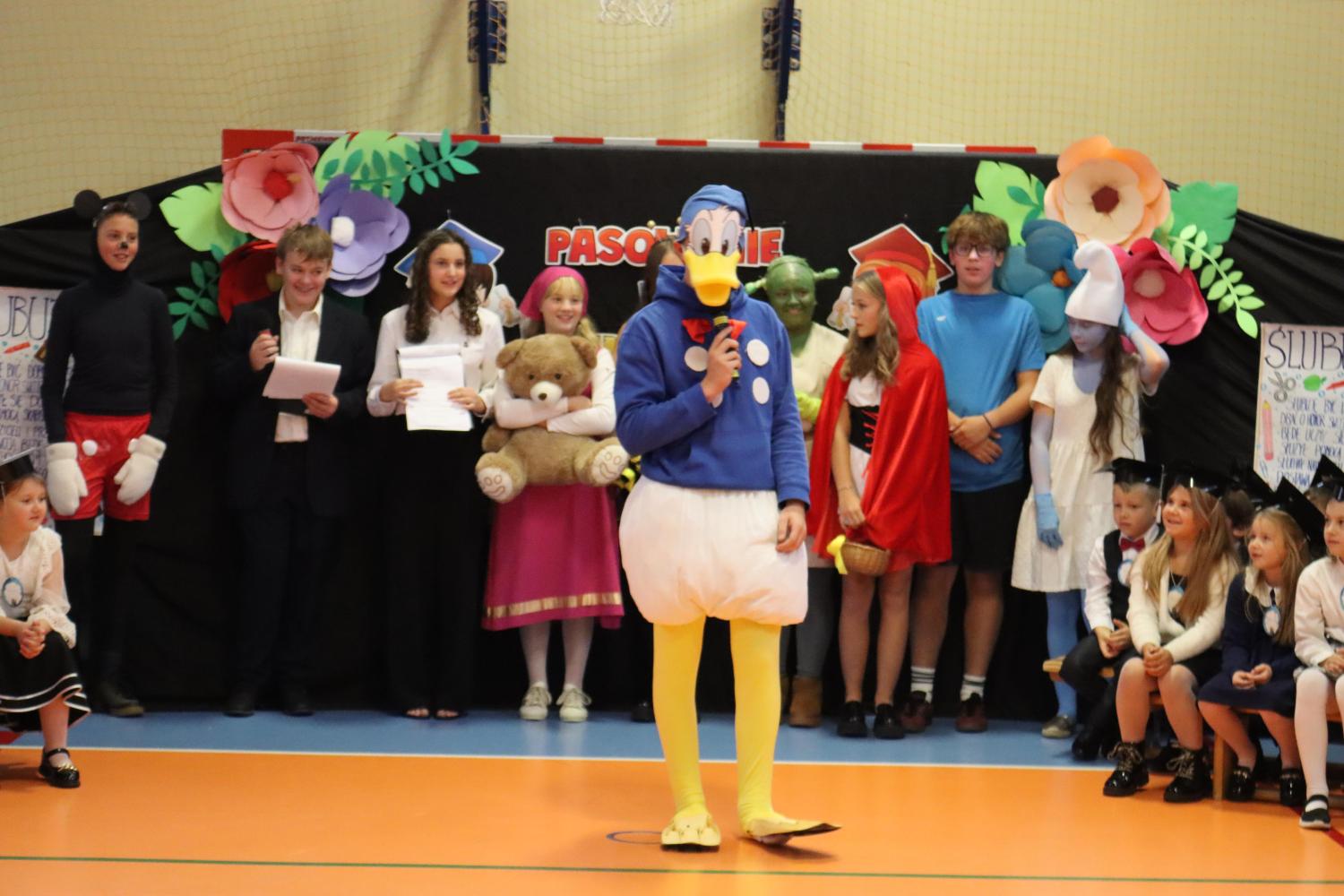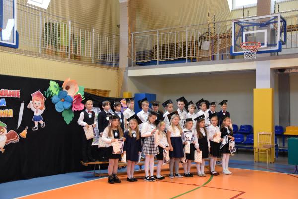 Uroczystość rozpoczęła się od części artystycznej przygotowanej przez uczniów klas VIII pod kierunkiem pani Małgorzaty Budz i pani Doroty Sztokfisz. Ósmoklasiści, przebrani za postacie z popularnych bajek, wprowadzili publiczność w radosny i zabawny nastrój. Później scenę przejęli bohaterowie dnia – uczniowie klas pierwszych. W odświętnych strojach, z uśmiechem i ogromnym przejęciem, zaprezentowali swój program artystyczny. Recytowali wiersze, śpiewali piosenki i tańczyli, pokazując, że są już gotowi, aby stać się pełnoprawnymi uczniami. Następnie nadszedł najbardziej uroczysty moment całego dnia – ślubowanie pierwszoklasistów. Dzieci wypowiedziały słowa przysięgi, a pani dyrektor dokonała aktu pasowania na ucznia, dotykając ramienia każdego pierwszaka dużym, symbolicznym ołówkiem. Świeżo pasowani pierwszoklasiści otrzymali pamiątkowe dyplomy oraz drobne upominki, które będą im przypominać o tym wyjątkowym dniu.
