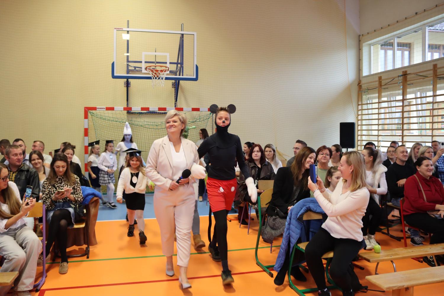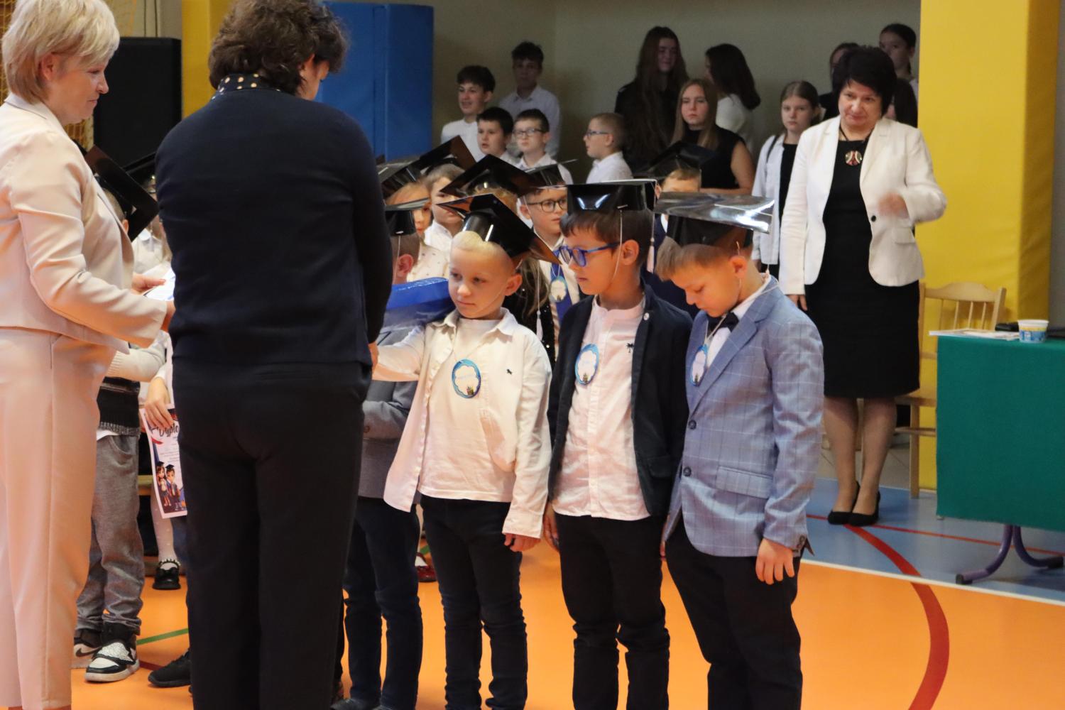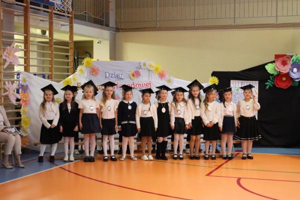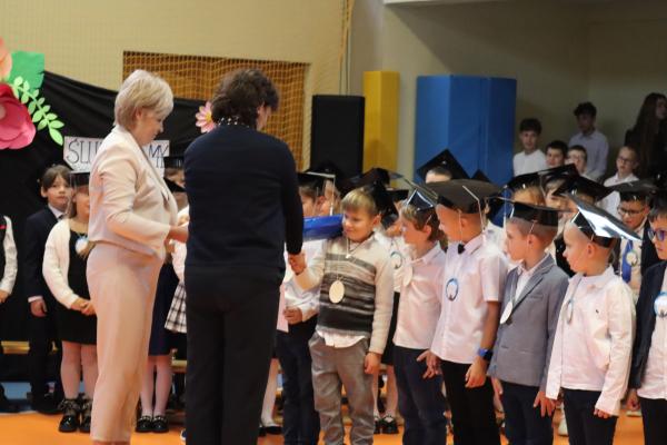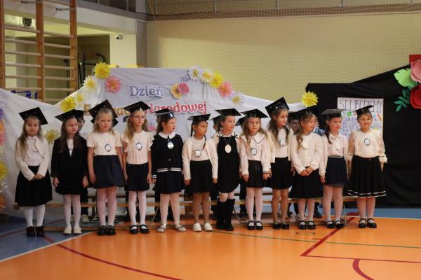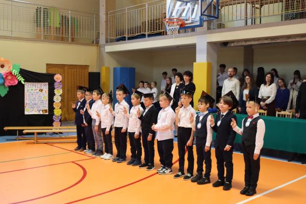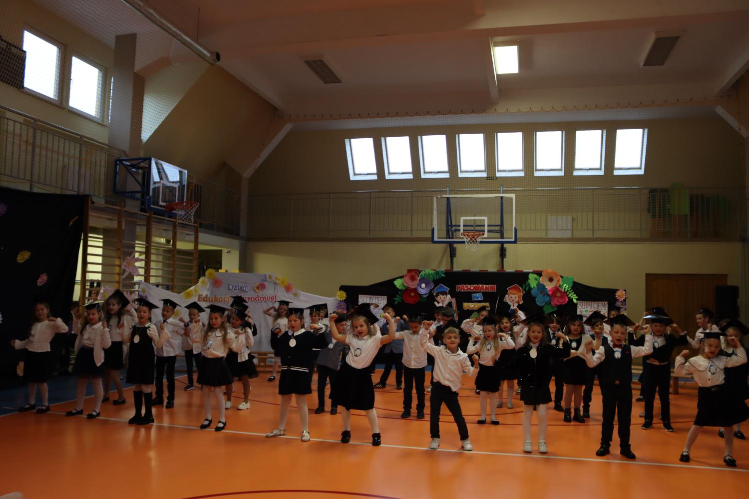 Uroczystość rozpoczęła się od części artystycznej przygotowanej przez uczniów klas VIII pod kierunkiem pani Małgorzaty Budz i pani Doroty Sztokfisz. Ósmoklasiści, przebrani za postacie z popularnych bajek, wprowadzili publiczność w radosny i zabawny nastrój. Później scenę przejęli bohaterowie dnia – uczniowie klas pierwszych. W odświętnych strojach, z uśmiechem i ogromnym przejęciem, zaprezentowali swój program artystyczny. Recytowali wiersze, śpiewali piosenki i tańczyli, pokazując, że są już gotowi, aby stać się pełnoprawnymi uczniami. Następnie nadszedł najbardziej uroczysty moment całego dnia – ślubowanie pierwszoklasistów. Dzieci wypowiedziały słowa przysięgi, a pani dyrektor dokonała aktu pasowania na ucznia, dotykając ramienia każdego pierwszaka dużym, symbolicznym ołówkiem. Świeżo pasowani pierwszoklasiści otrzymali pamiątkowe dyplomy oraz drobne upominki, które będą im przypominać o tym wyjątkowym dniu.