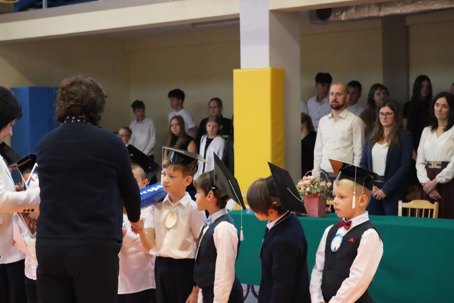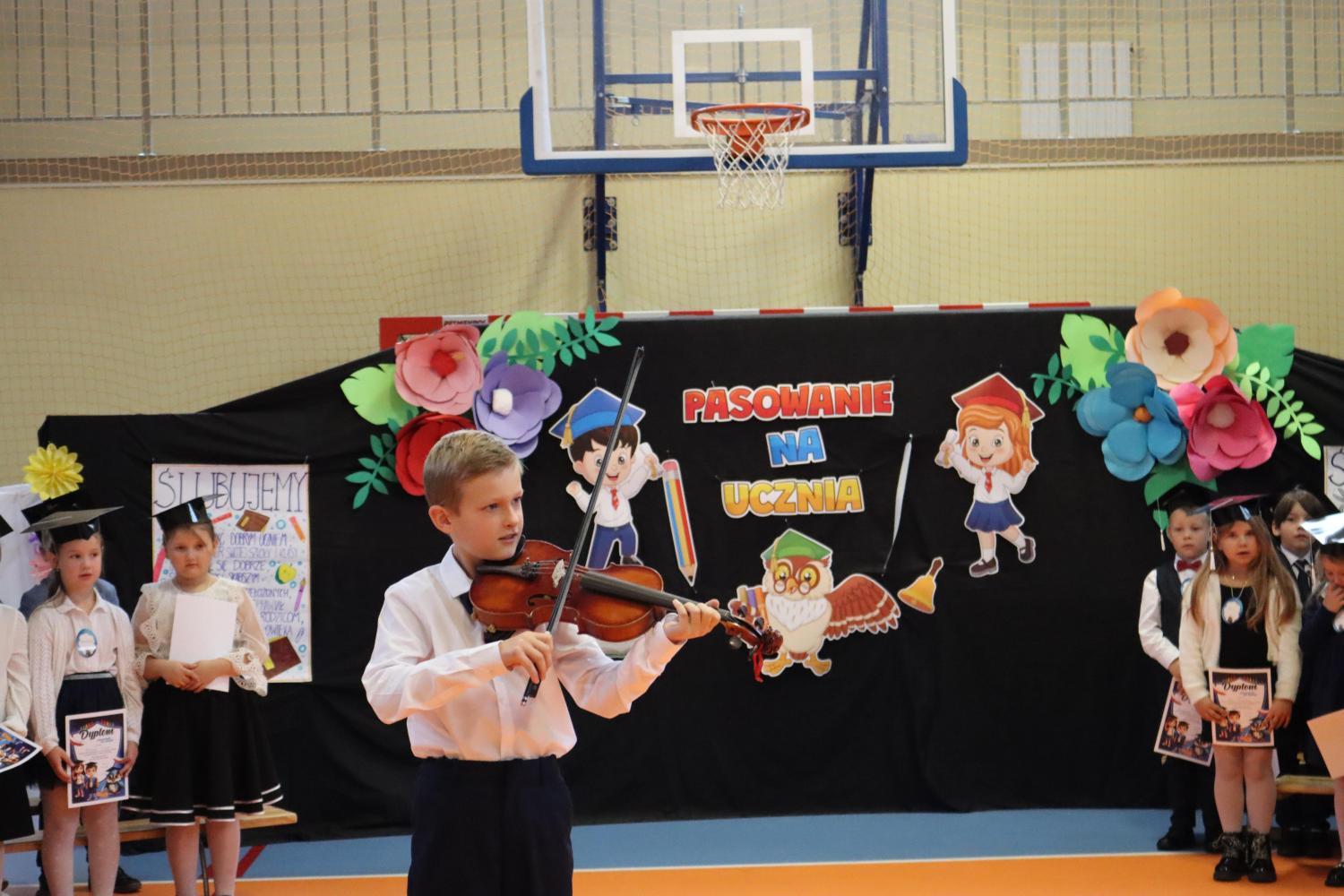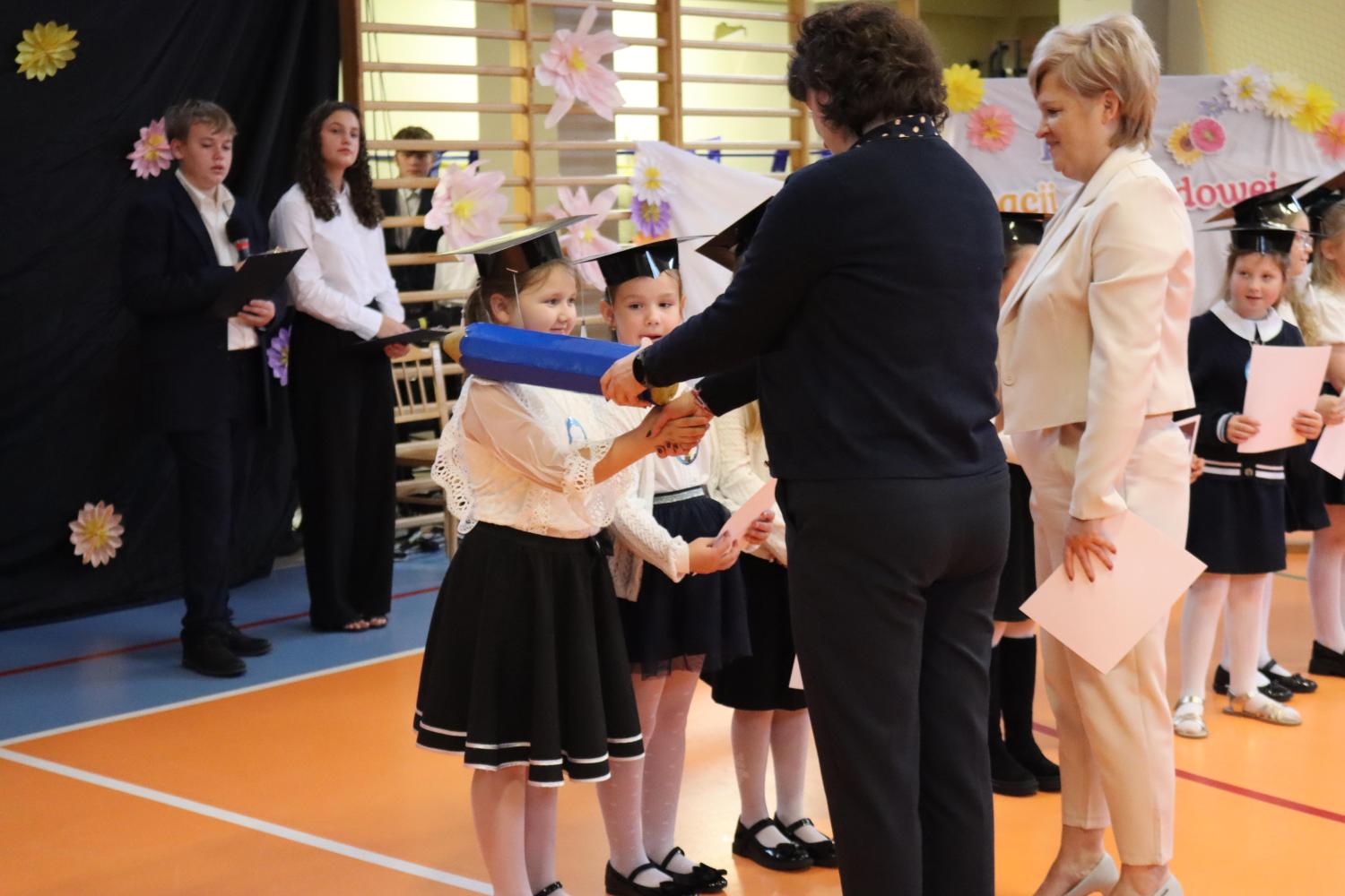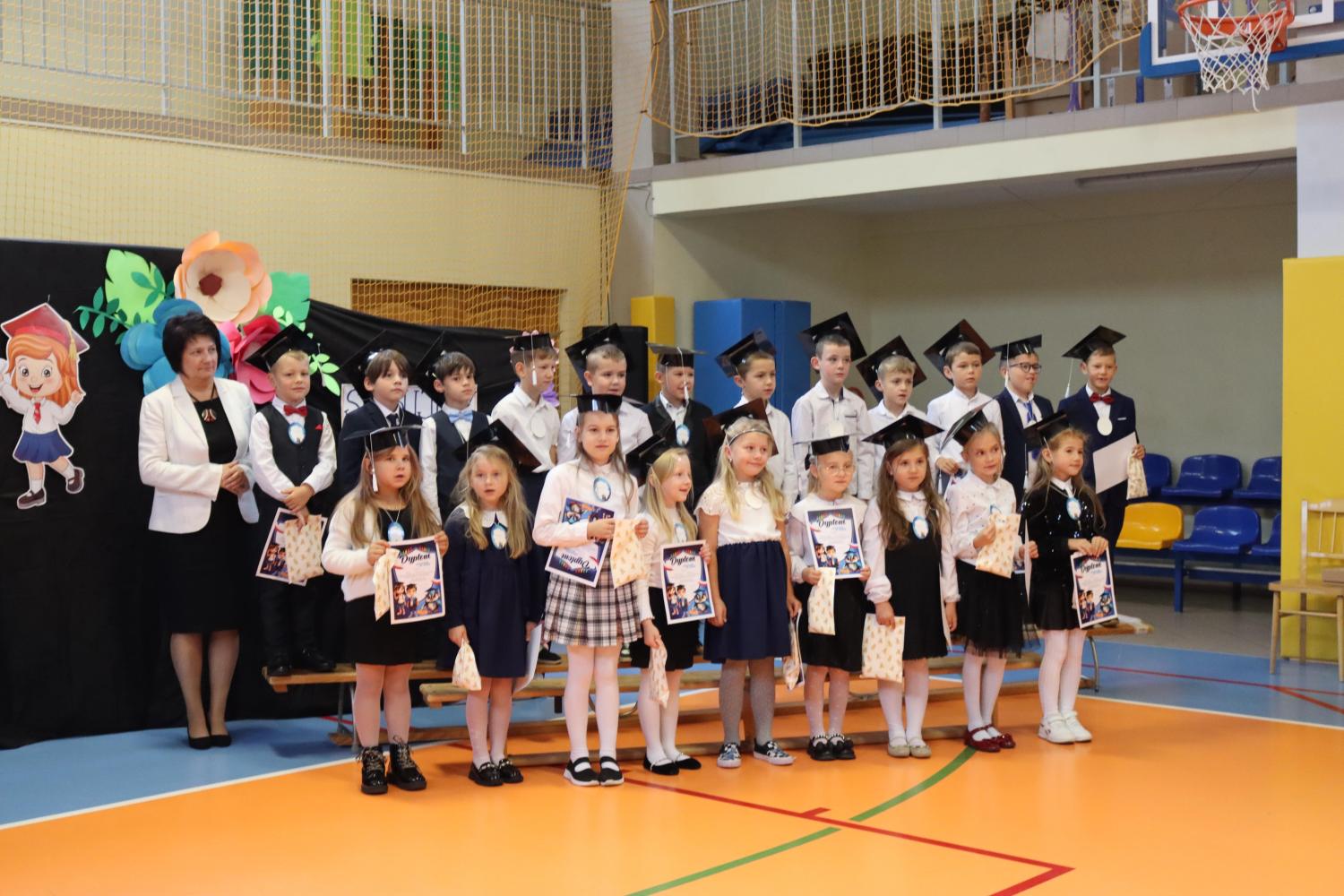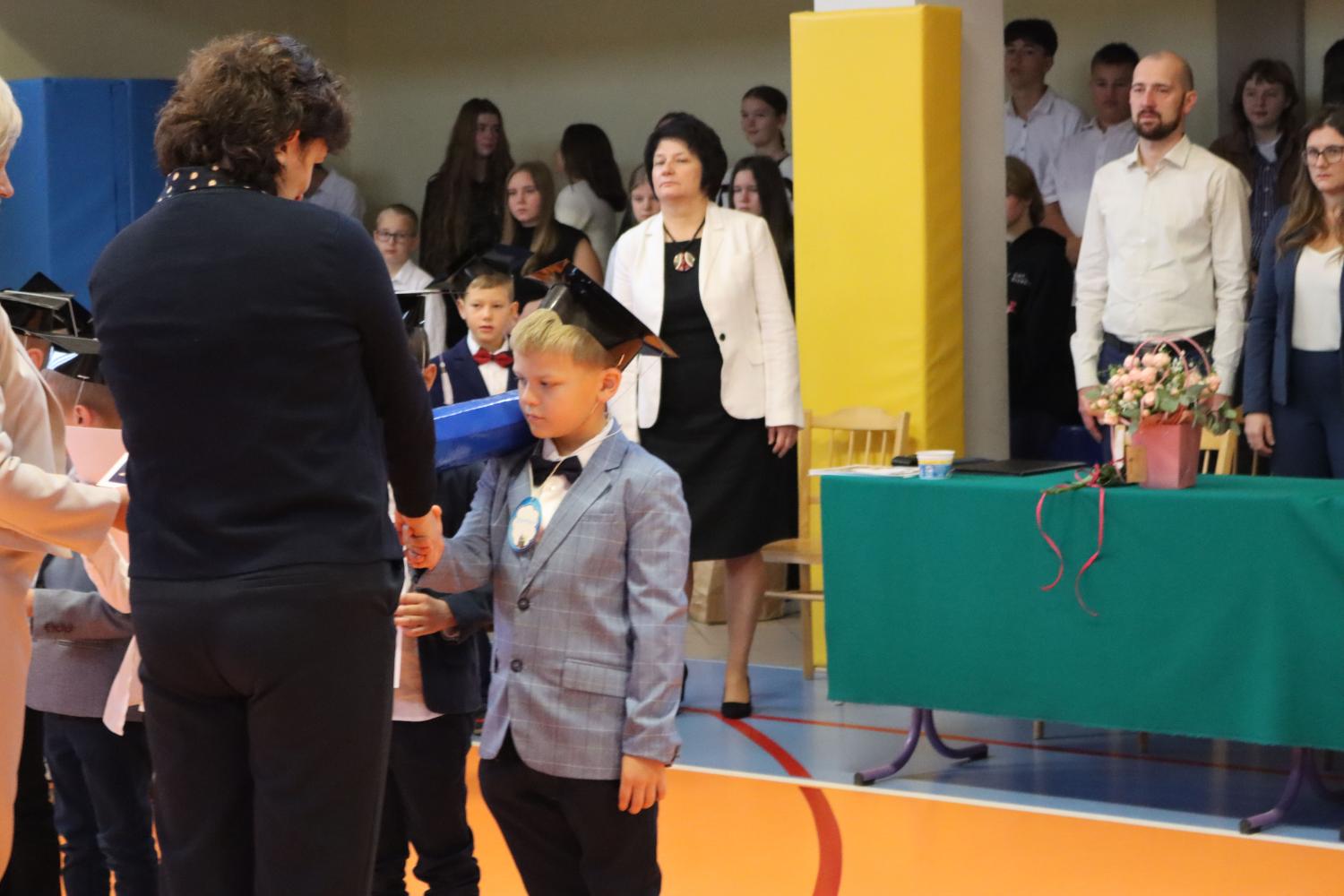 Uroczystość rozpoczęła się od części artystycznej przygotowanej przez uczniów klas VIII pod kierunkiem pani Małgorzaty Budz i pani Doroty Sztokfisz. Ósmoklasiści, przebrani za postacie z popularnych bajek, wprowadzili publiczność w radosny i zabawny nastrój. Później scenę przejęli bohaterowie dnia – uczniowie klas pierwszych. W odświętnych strojach, z uśmiechem i ogromnym przejęciem, zaprezentowali swój program artystyczny. Recytowali wiersze, śpiewali piosenki i tańczyli, pokazując, że są już gotowi, aby stać się pełnoprawnymi uczniami. Następnie nadszedł najbardziej uroczysty moment całego dnia – ślubowanie pierwszoklasistów. Dzieci wypowiedziały słowa przysięgi, a pani dyrektor dokonała aktu pasowania na ucznia, dotykając ramienia każdego pierwszaka dużym, symbolicznym ołówkiem. Świeżo pasowani pierwszoklasiści otrzymali pamiątkowe dyplomy oraz drobne upominki, które będą im przypominać o tym wyjątkowym dniu.