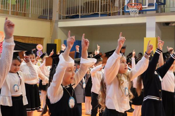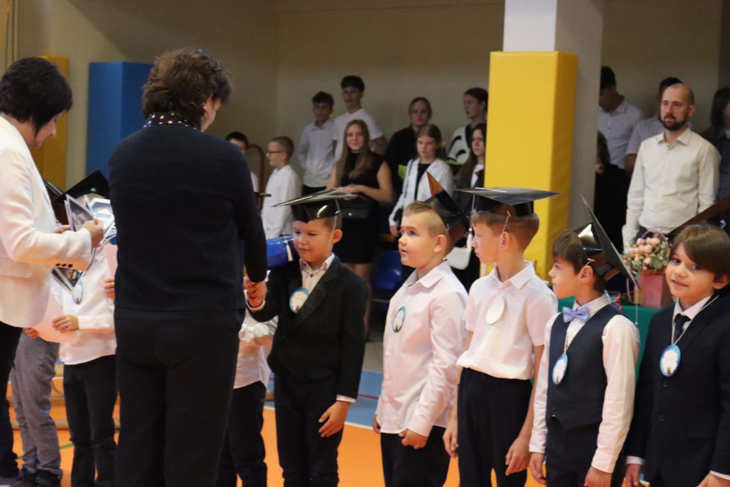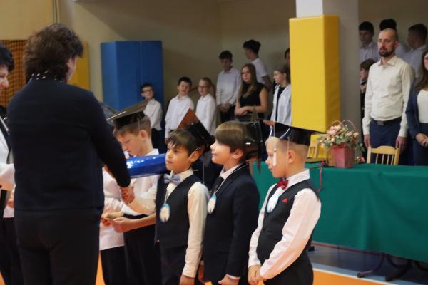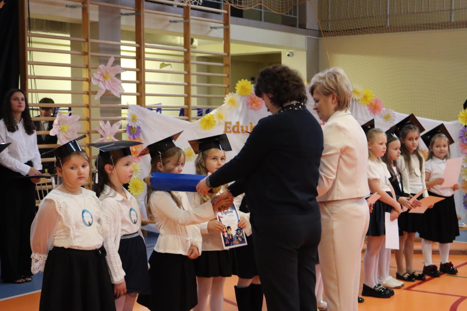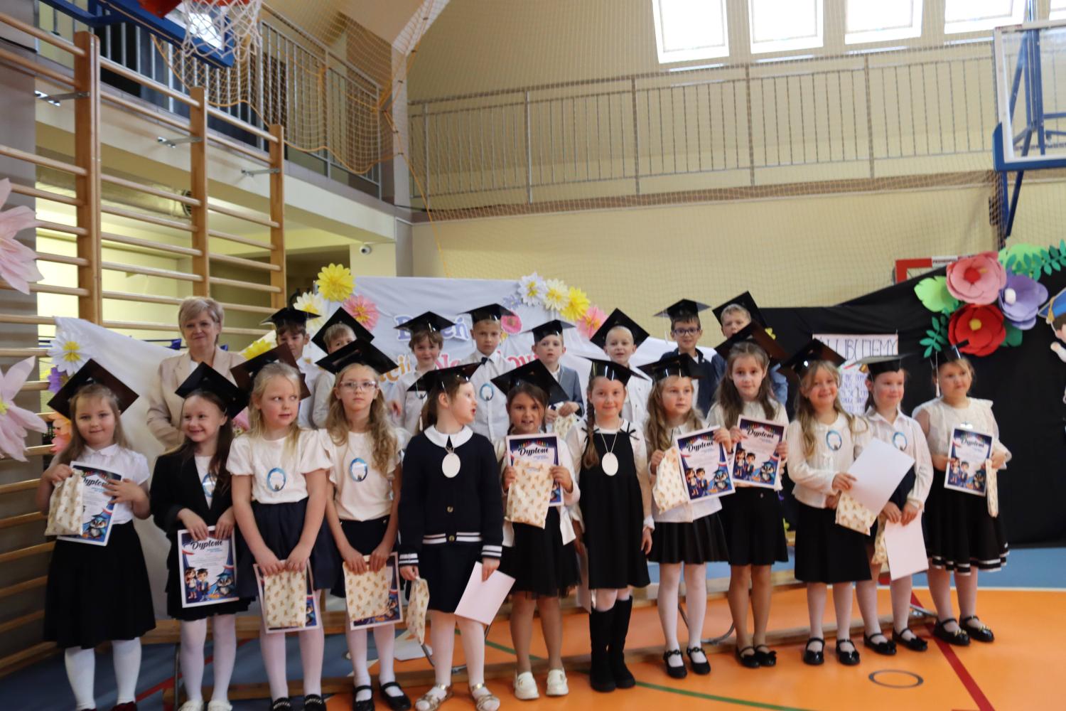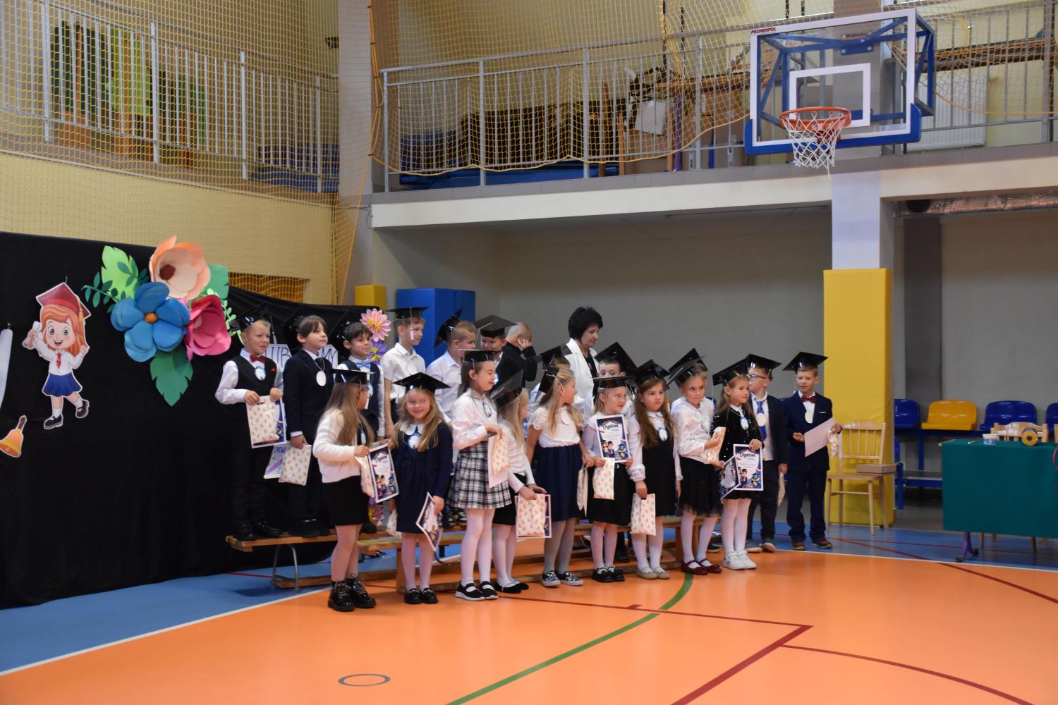 Uroczystość rozpoczęła się od części artystycznej przygotowanej przez uczniów klas VIII pod kierunkiem pani Małgorzaty Budz i pani Doroty Sztokfisz. Ósmoklasiści, przebrani za postacie z popularnych bajek, wprowadzili publiczność w radosny i zabawny nastrój. Później scenę przejęli bohaterowie dnia – uczniowie klas pierwszych. W odświętnych strojach, z uśmiechem i ogromnym przejęciem, zaprezentowali swój program artystyczny. Recytowali wiersze, śpiewali piosenki i tańczyli, pokazując, że są już gotowi, aby stać się pełnoprawnymi uczniami. Następnie nadszedł najbardziej uroczysty moment całego dnia – ślubowanie pierwszoklasistów. Dzieci wypowiedziały słowa przysięgi, a pani dyrektor dokonała aktu pasowania na ucznia, dotykając ramienia każdego pierwszaka dużym, symbolicznym ołówkiem. Świeżo pasowani pierwszoklasiści otrzymali pamiątkowe dyplomy oraz drobne upominki, które będą im przypominać o tym wyjątkowym dniu.
