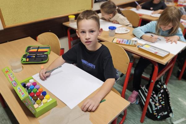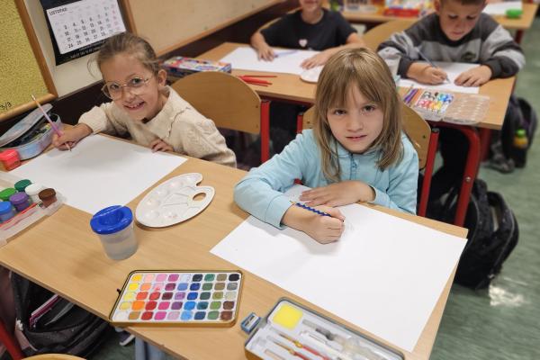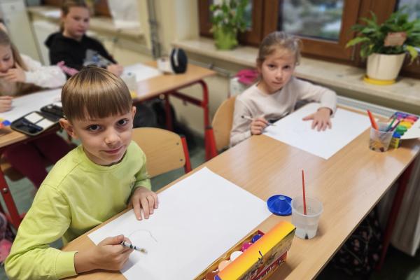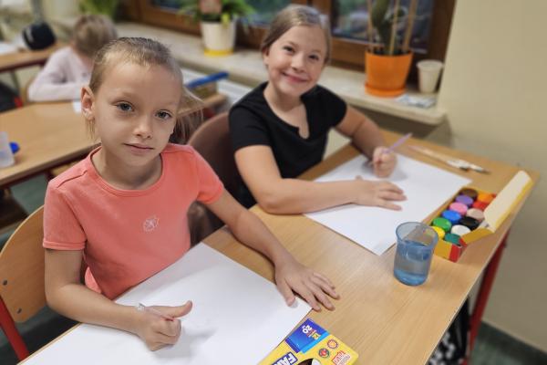 W części praktycznej uczniowie z zaangażowaniem tworzyli własne prace plastyczne, ilustrując poznane zasady. Podczas malowania towarzyszyła im muzyka klasyczna, która wprowadziła spokojny, twórczy nastrój i sprzyjała skupieniu.