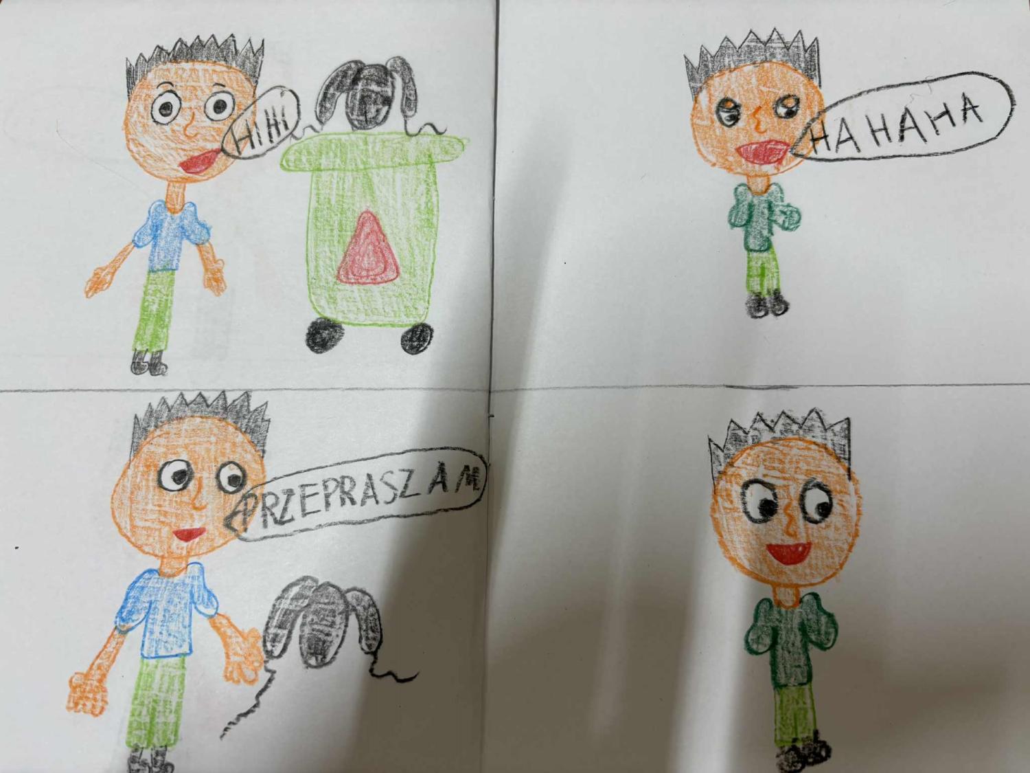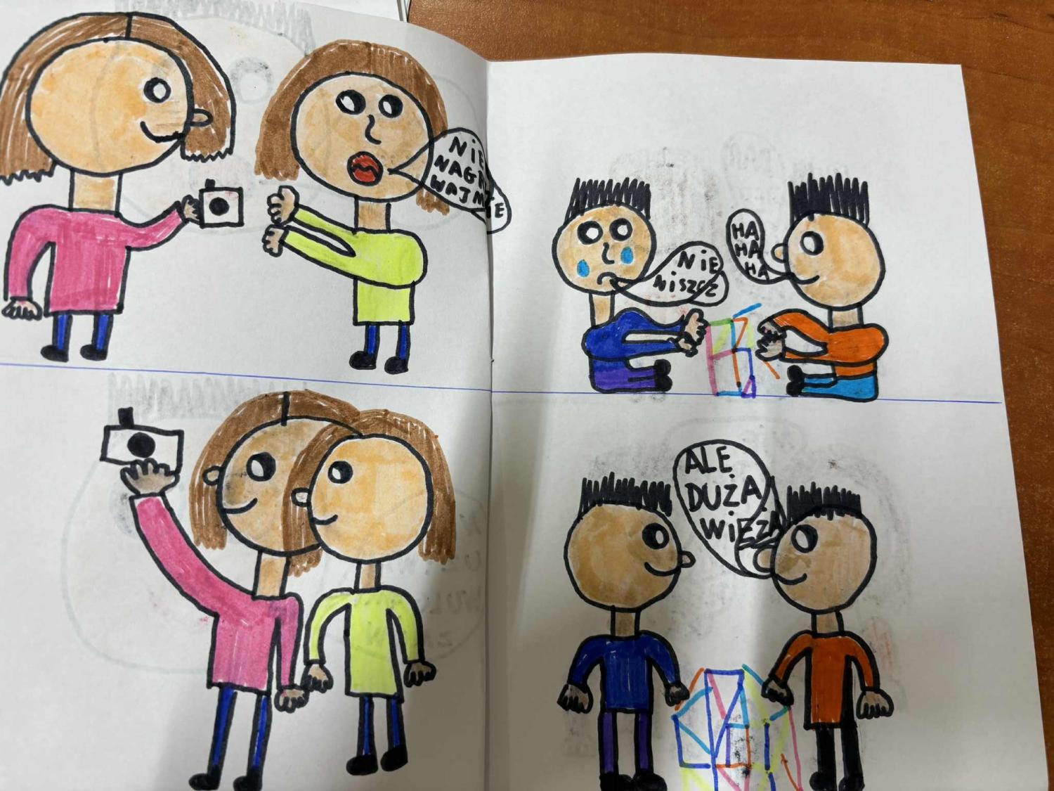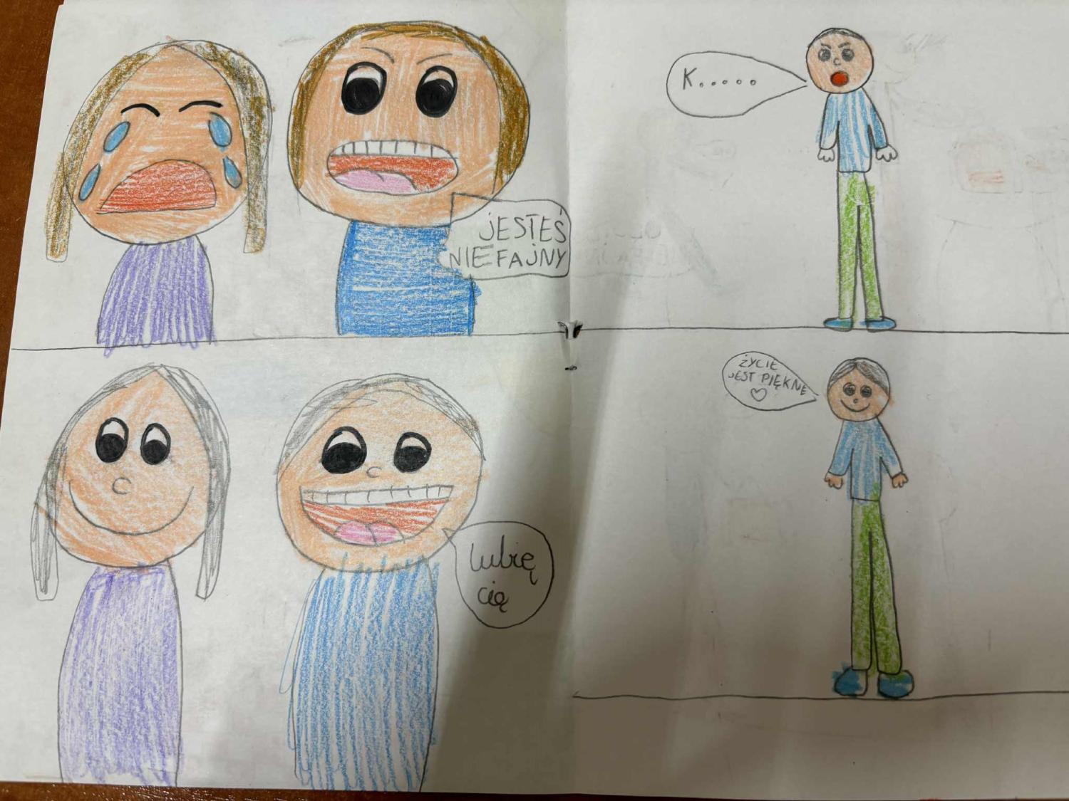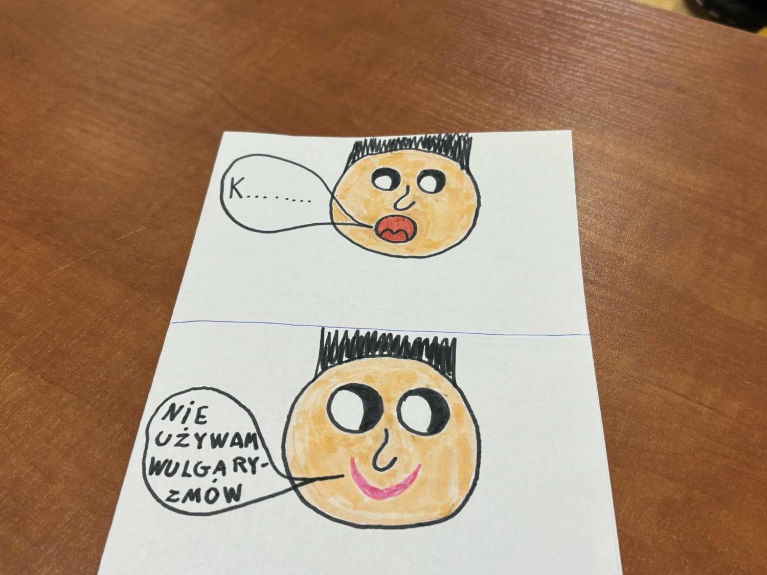 W klasach drugich poruszano tematykę hejtu, rówieśnictwa i właściwego zachowania w relacjach z innymi. Uczniowie rozmawiali o tym, jak reagować na przemoc słowną, jak wspierać kolegów i koleżanki oraz dlaczego warto być życzliwym wobec innych. Dzieci uczestniczyły w dyskusjach, scenkach dramowych i tworzyły hasła przeciwko hejtowi.