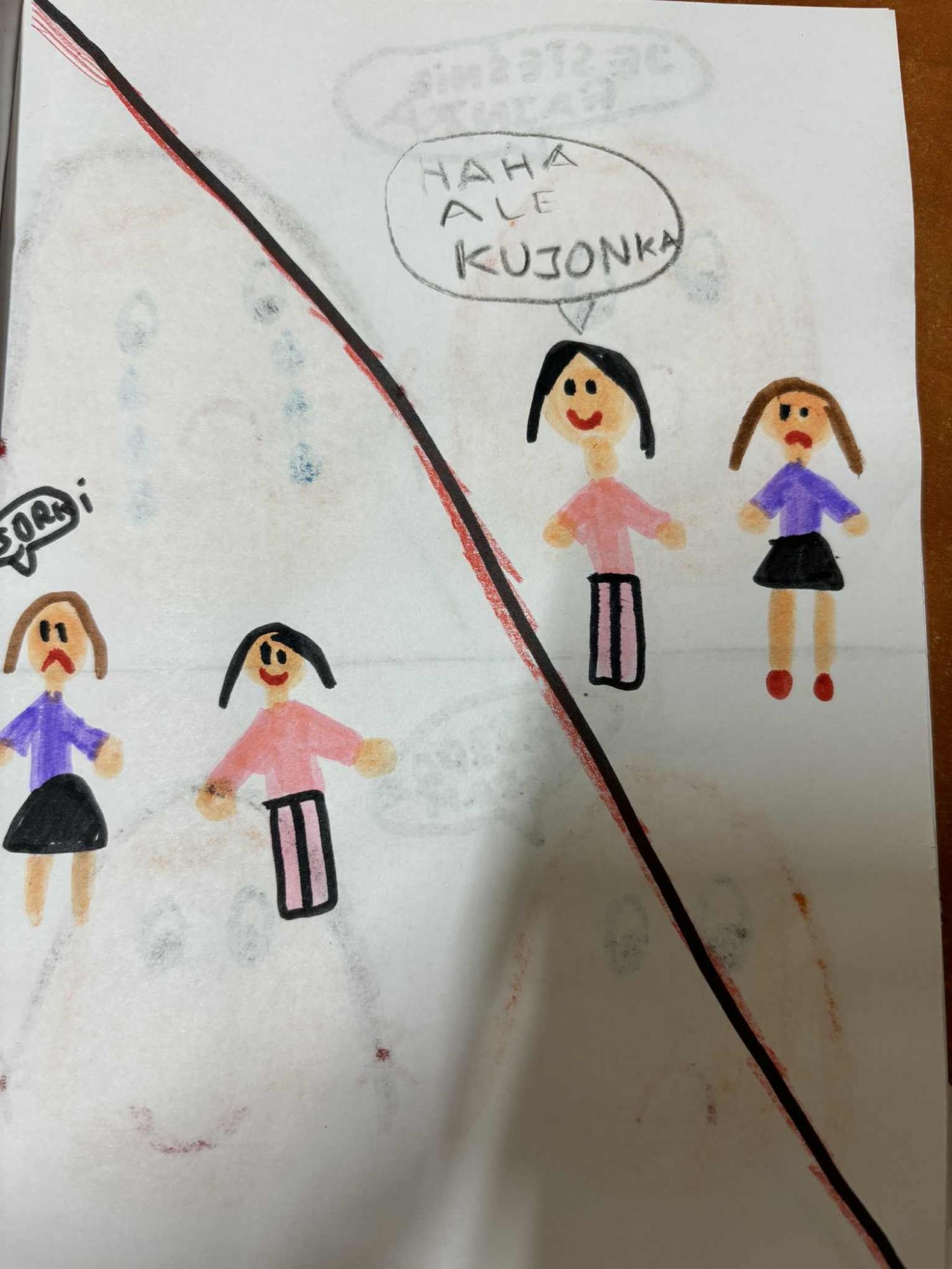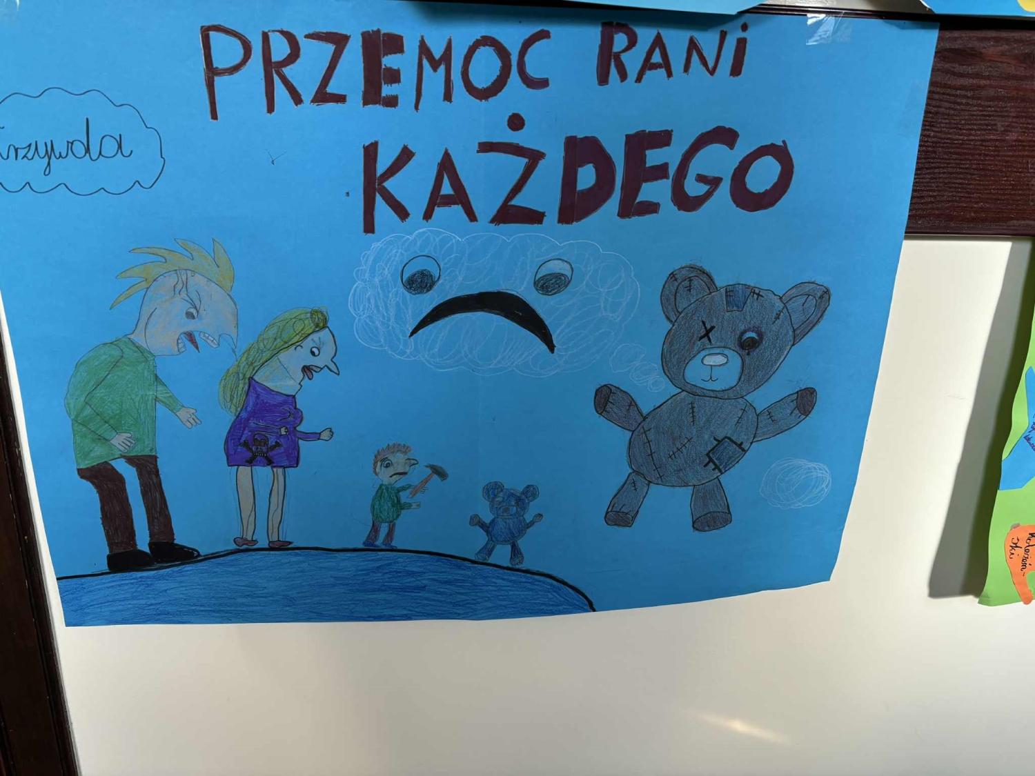W starszych klasach IV–VIII działania miały charakter jeszcze bardziej pogłębiony. Uczniowie uczestniczyli w pogadankach na temat różnych form przemocy, w tym przemocy psychicznej, cyberprzemocy oraz wykluczenia rówieśniczego. Podczas zajęć omawiano, jak mądrze korzystać z mediów społecznościowych, jak reagować na hejt w Internecie oraz gdzie szukać pomocy w sytuacjach trudnych. W ramach warsztatów uczniowie analizowali scenariusze sytuacji konfliktowych i wspólnie szukali sposobów ich rozwiązania. Rozmawiali także o roli świadków przemocy i o tym, że każda reakcja osoby obserwującej może mieć ogromne znaczenie dla osoby pokrzywdzonej. Młodzież przygotowała również plakaty promujące kulturę szacunku, tolerancji i empatii. W wielu klasach odbyły się debaty dotyczące wartości, jakimi warto kierować się w relacjach z innymi. Dzięki tym działaniom uczniowie klas starszych mieli możliwość nie tylko poszerzenia swojej wiedzy na temat przemocy rówieśniczej, lecz także uświadomienia sobie, jak ważna jest odpowiedzialność za słowa i zachowania oraz troska o dobrą atmosferę w grupie.