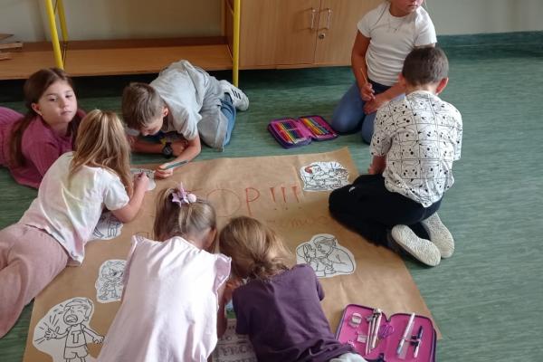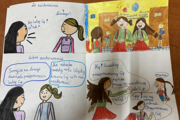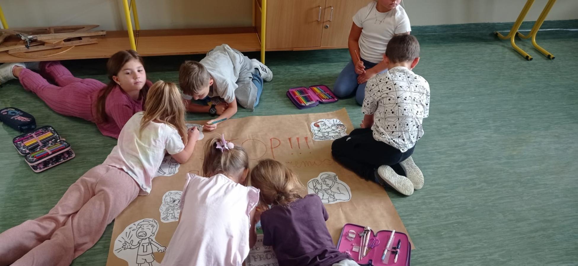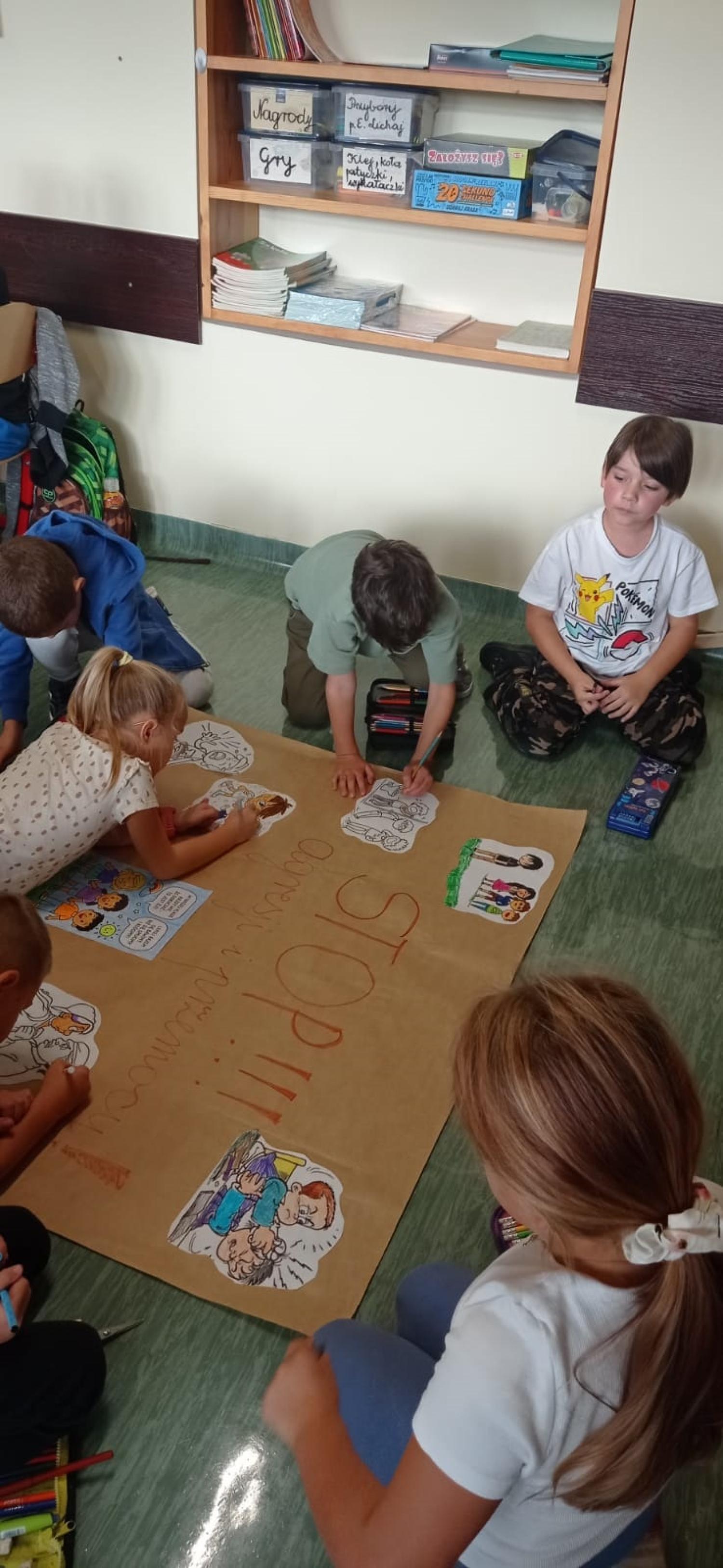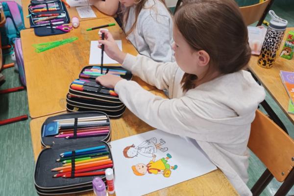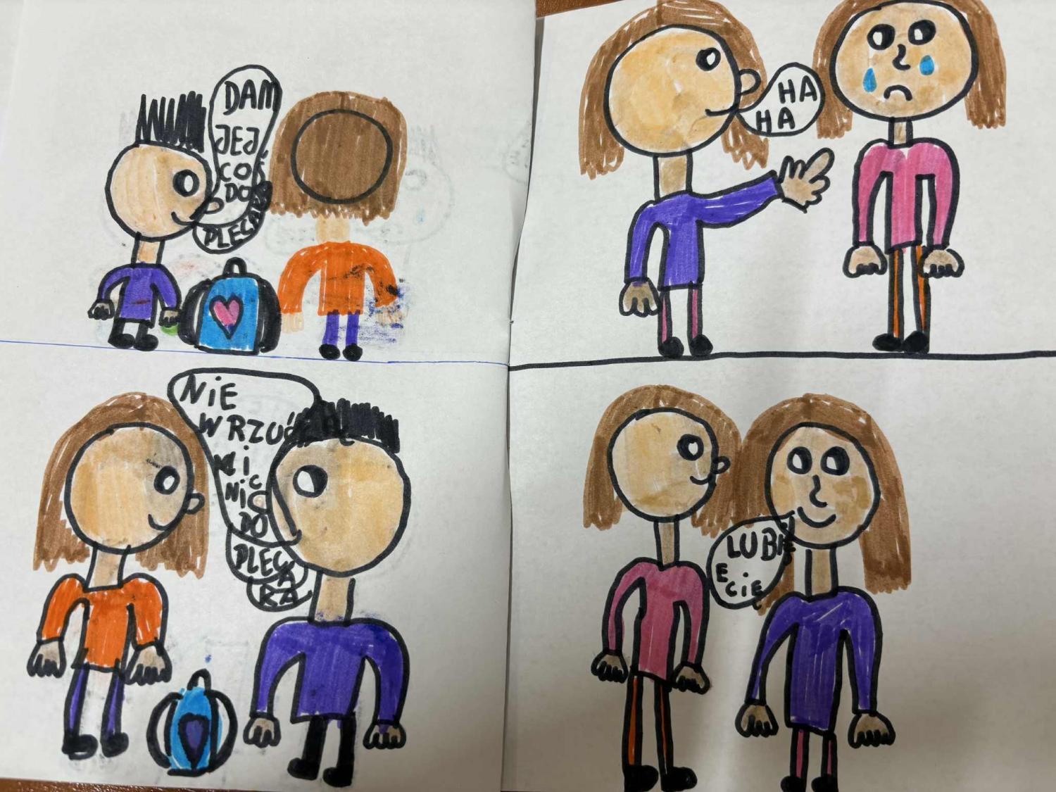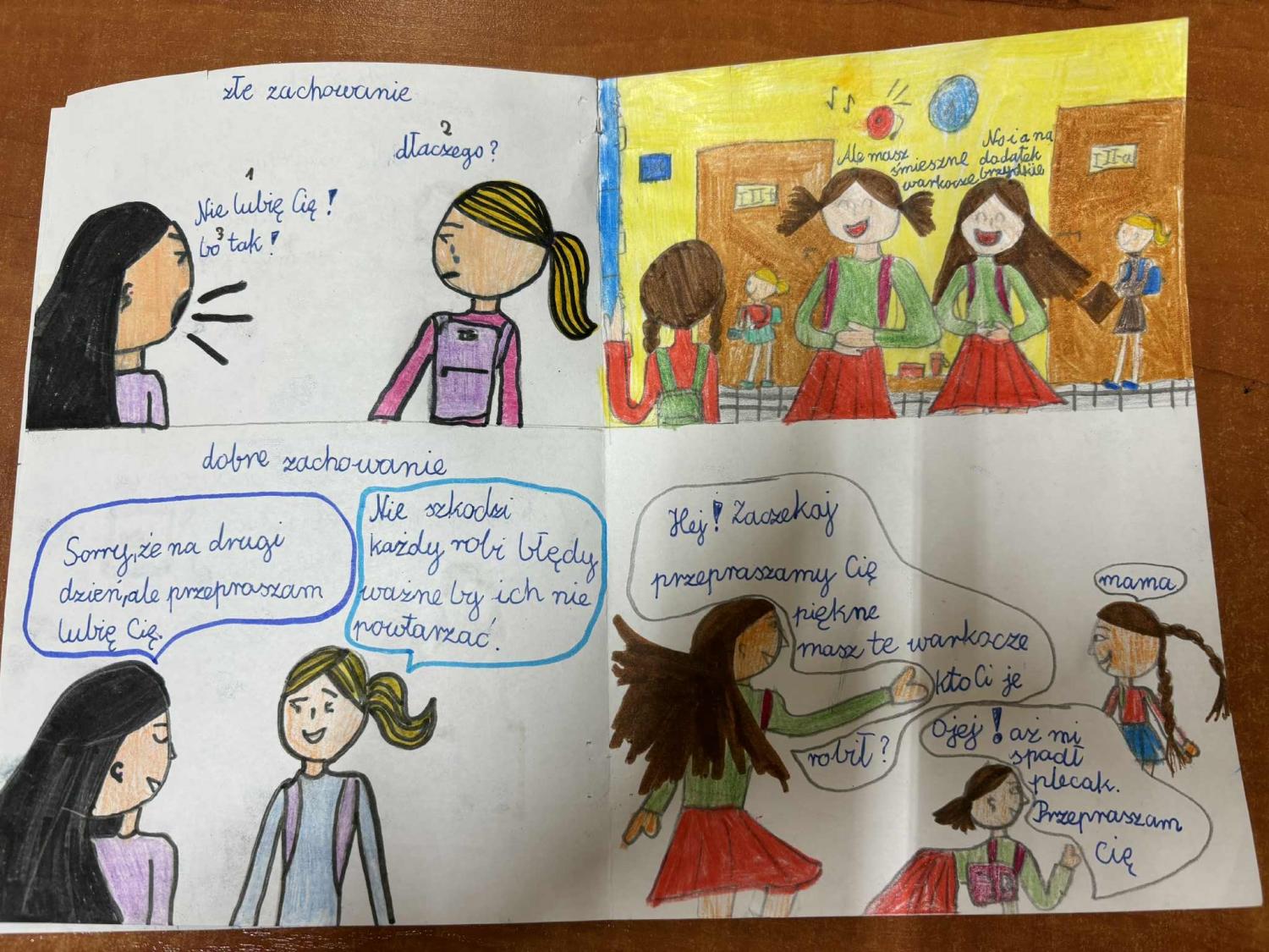 Natomiast uczniowie klas trzecich szczegółowo omawiali zagadnienia związane z przemocą rówieśniczą, sposobami jej rozpoznawania i przeciwdziałania. Na zakończenie zajęć wykonali plakaty i książeczki promujące przyjaźń, szacunek i wzajemną pomoc.