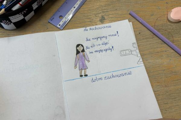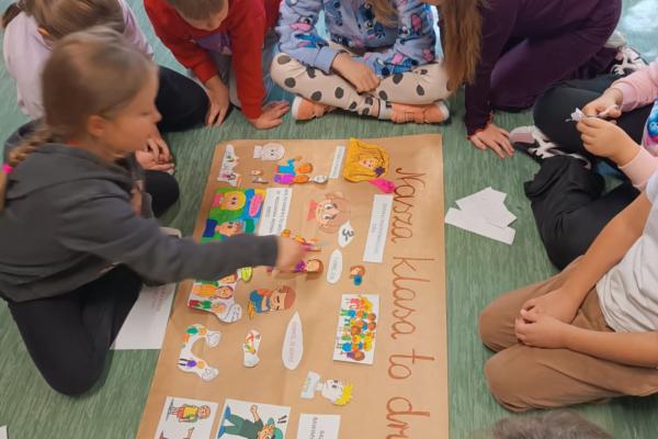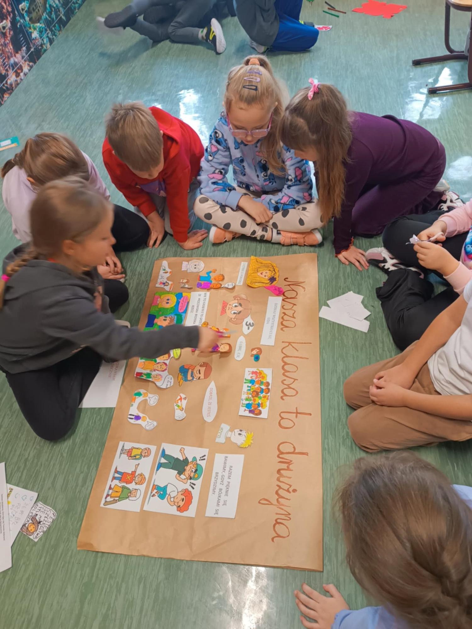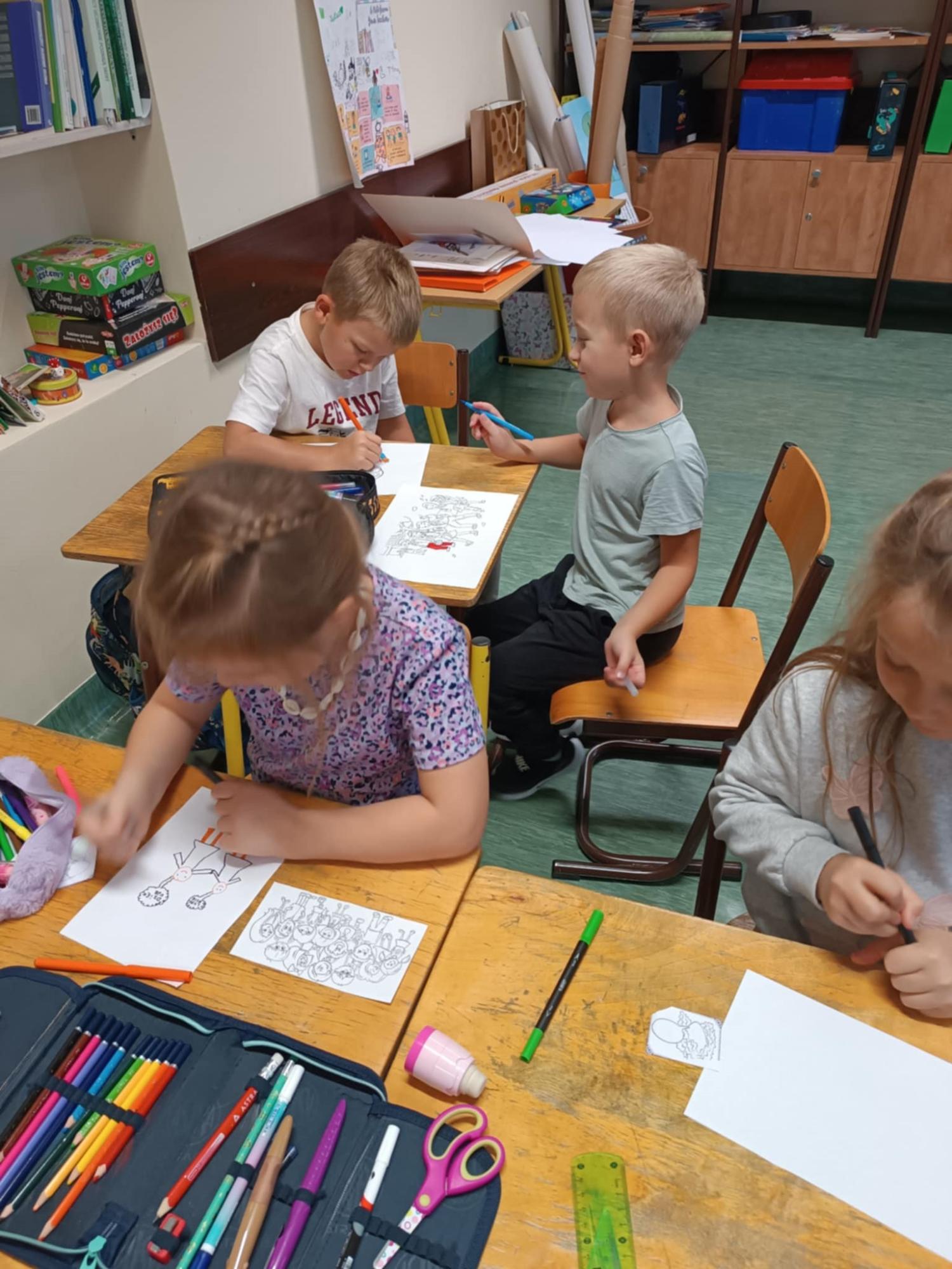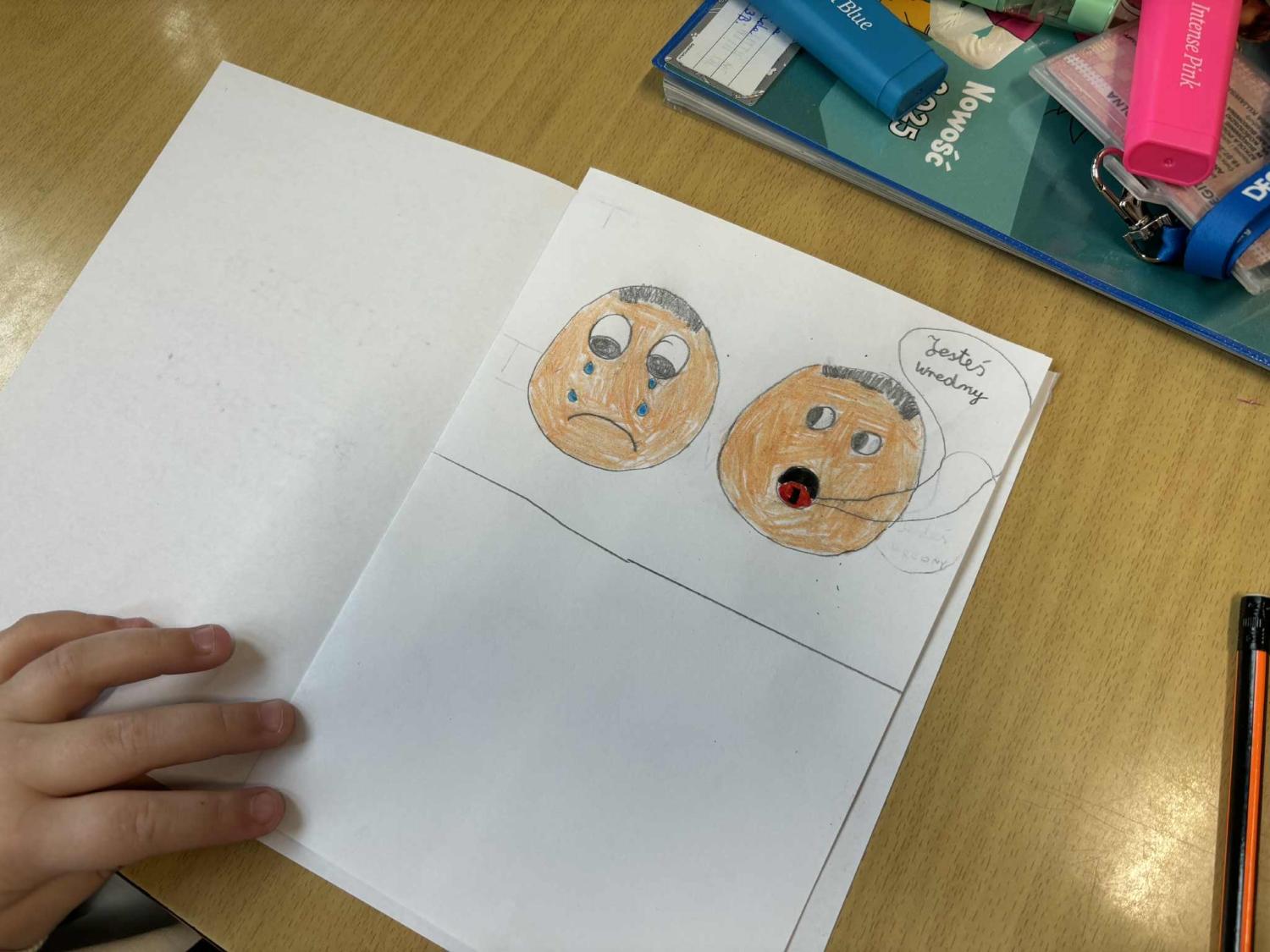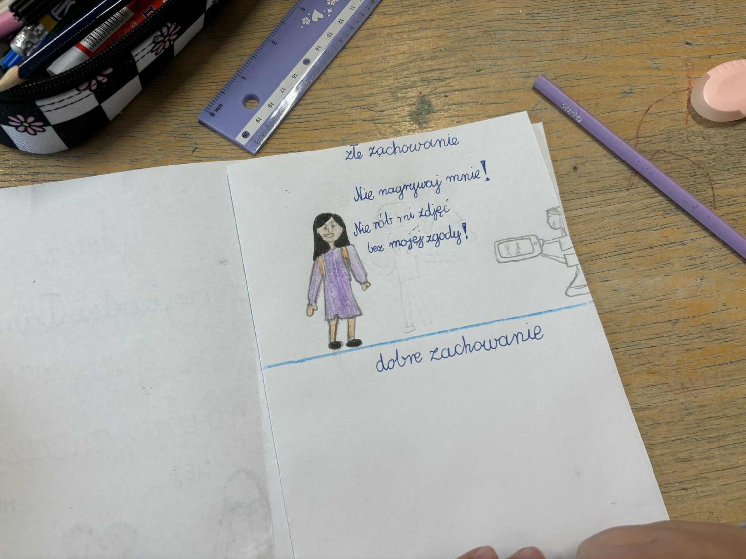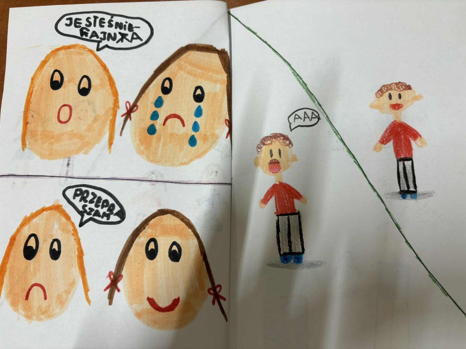 Natomiast uczniowie klas trzecich szczegółowo omawiali zagadnienia związane z przemocą rówieśniczą, sposobami jej rozpoznawania i przeciwdziałania. Na zakończenie zajęć wykonali plakaty i książeczki promujące przyjaźń, szacunek i wzajemną pomoc.