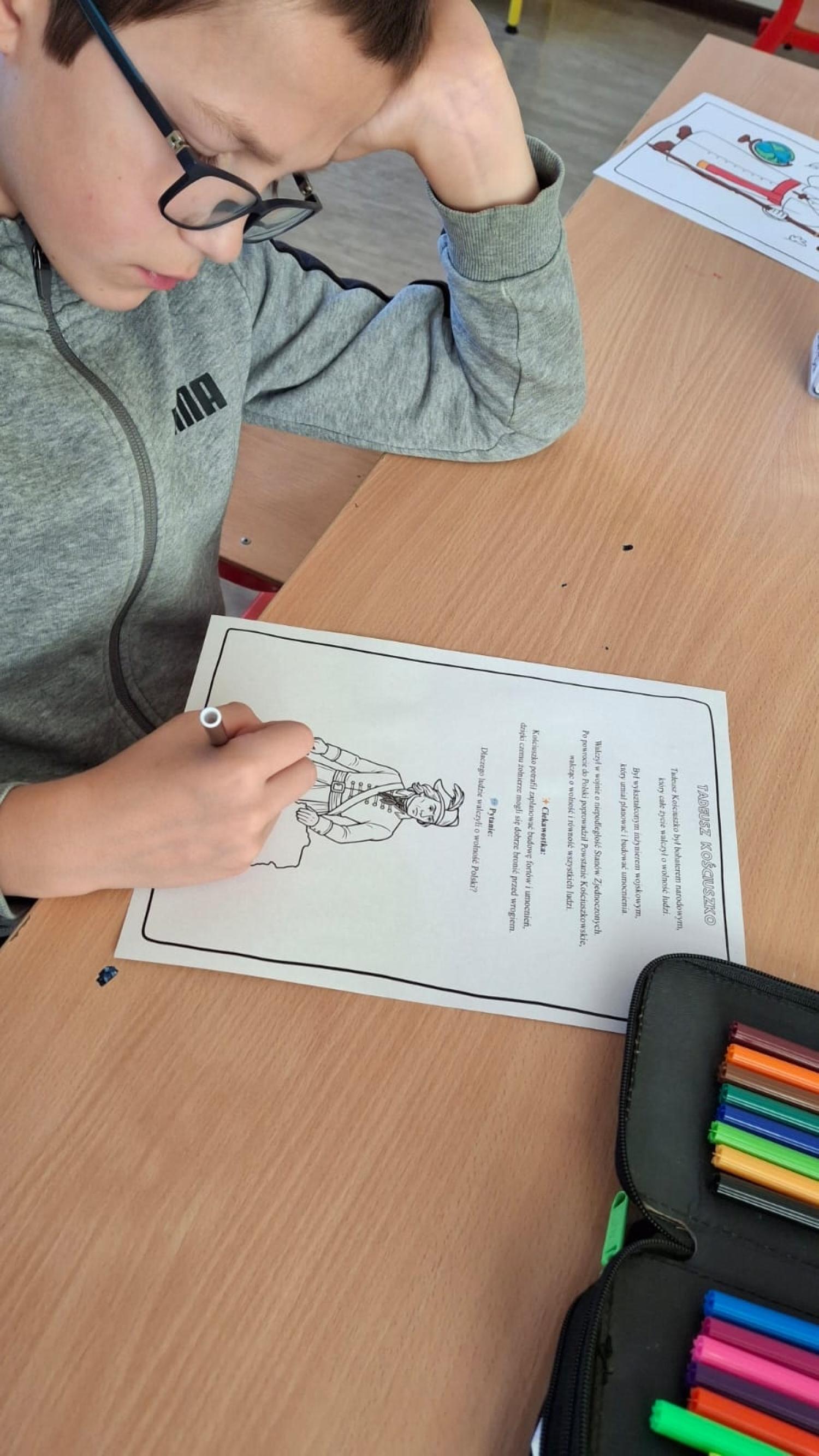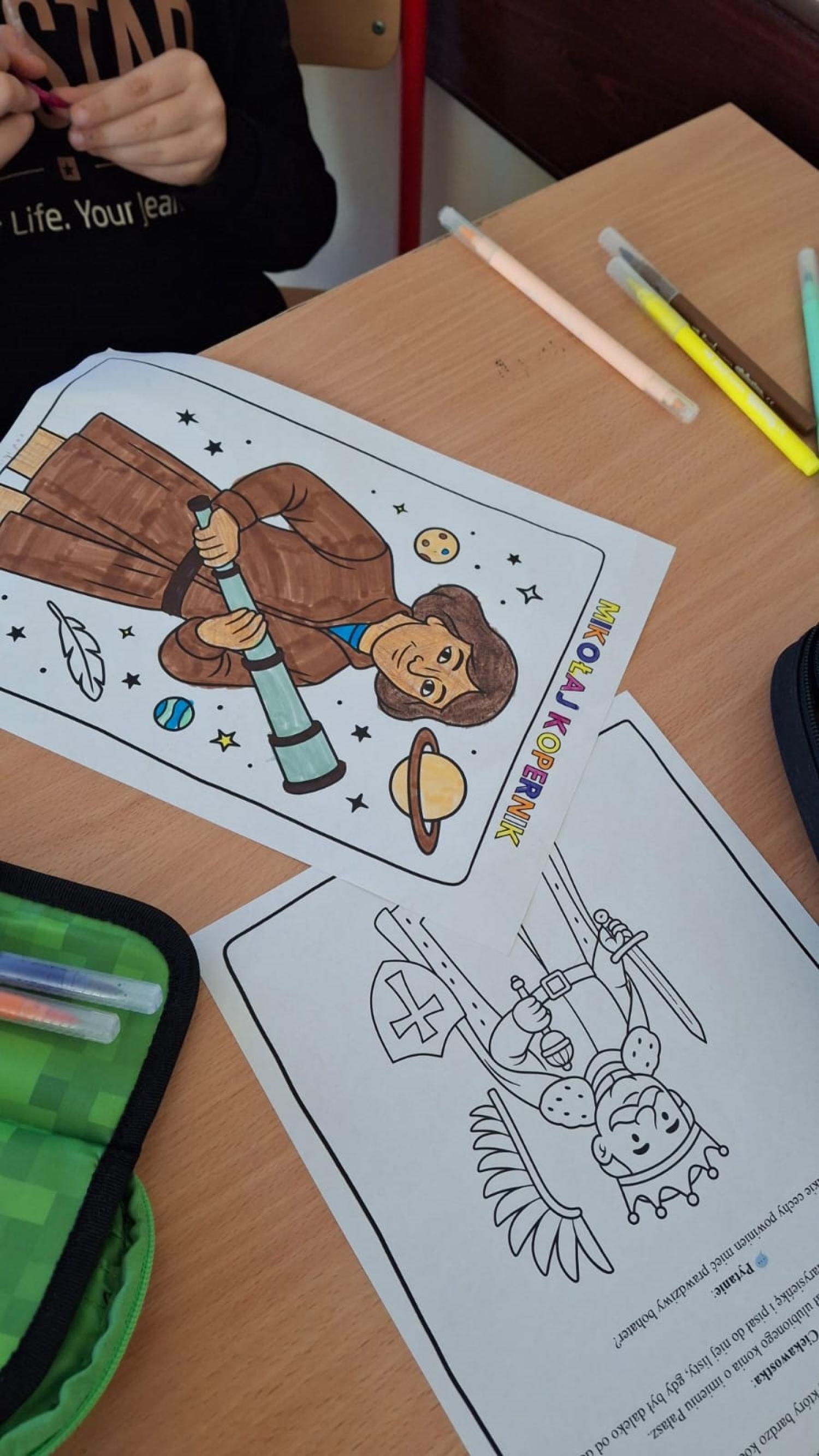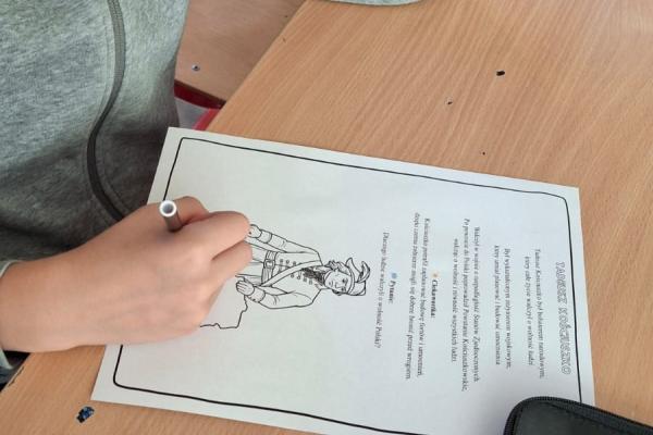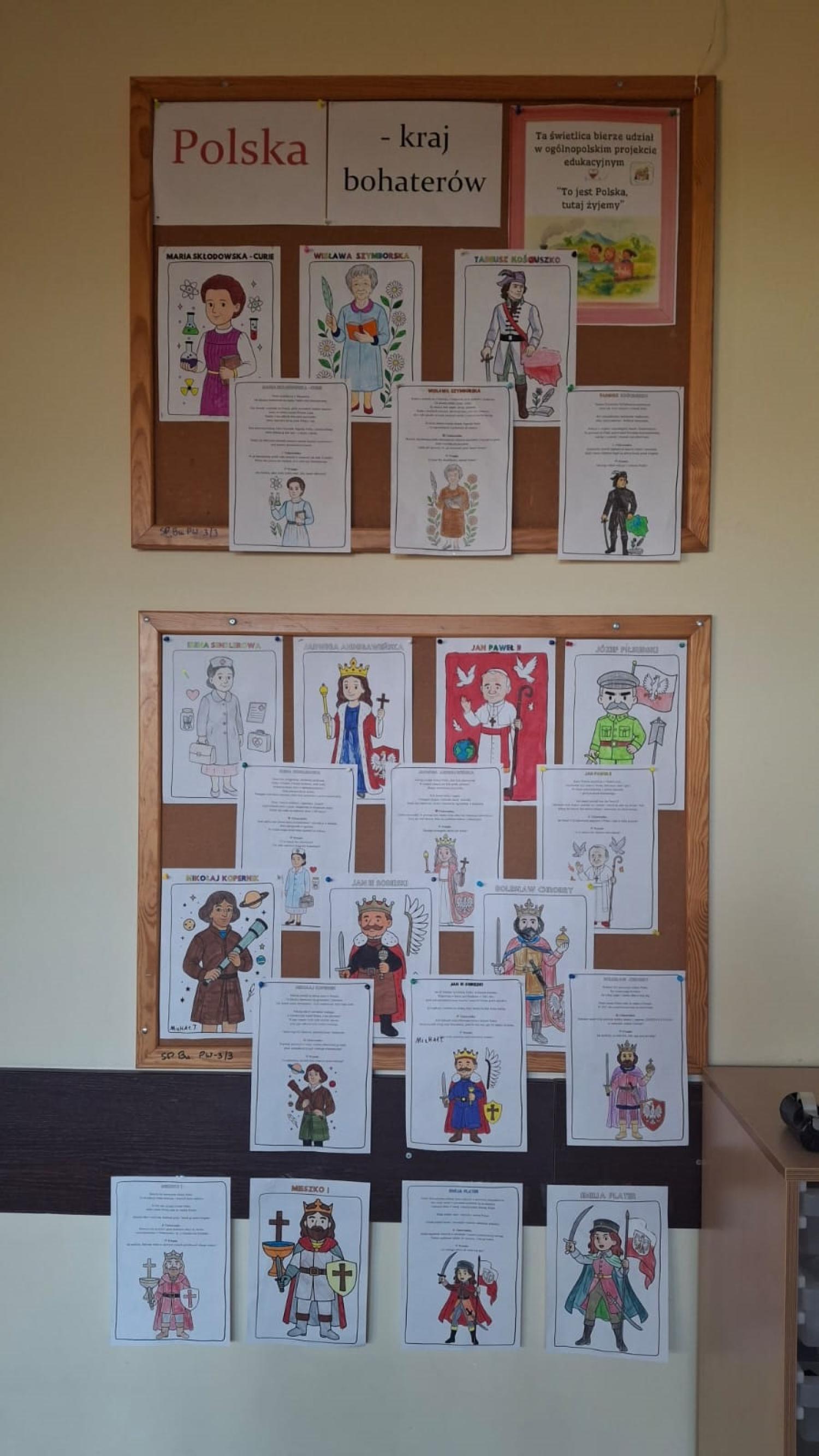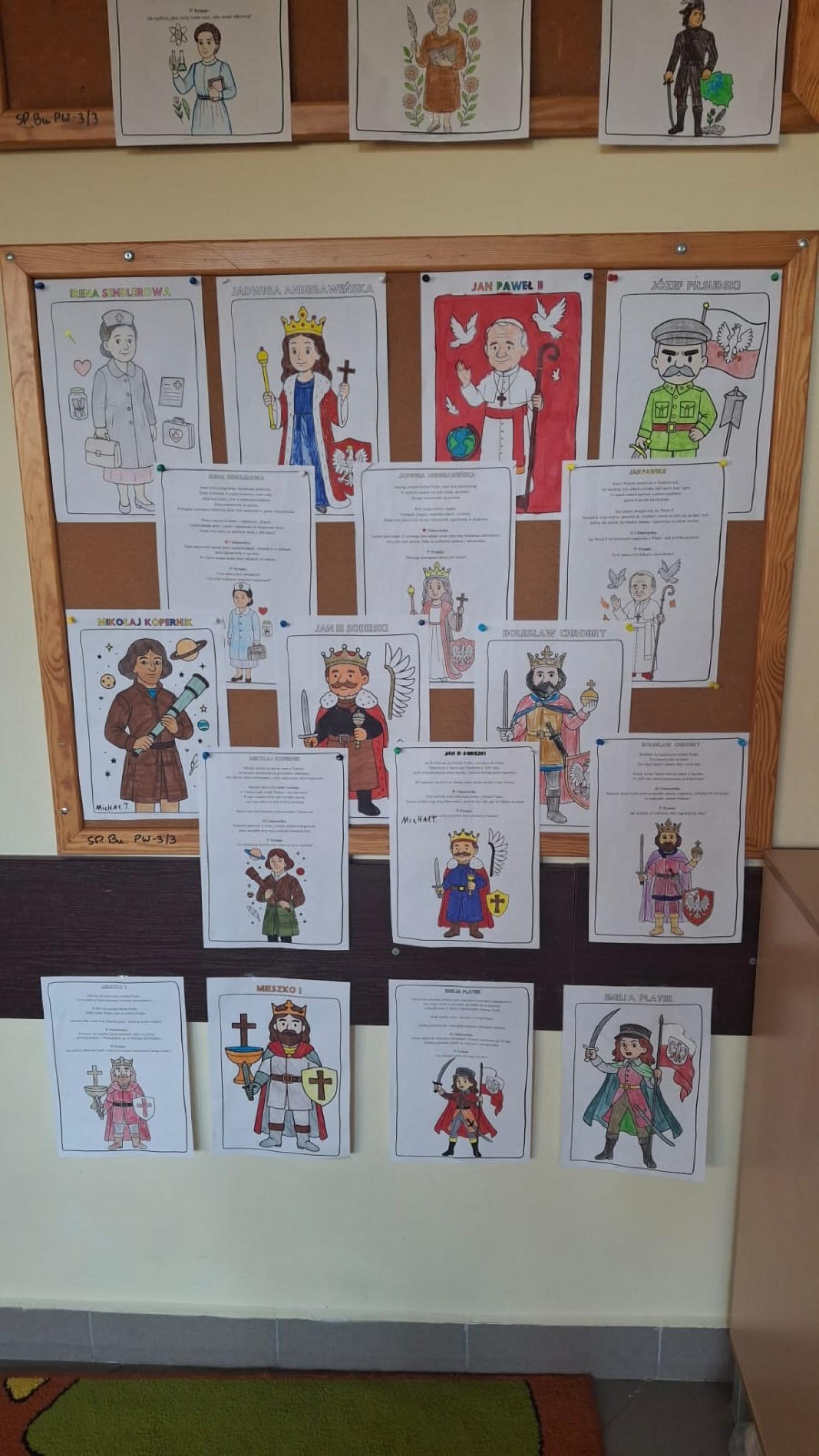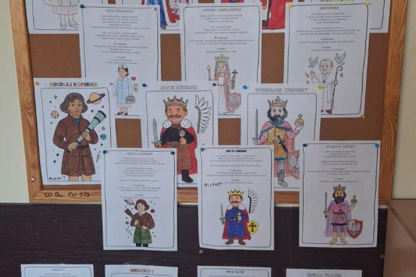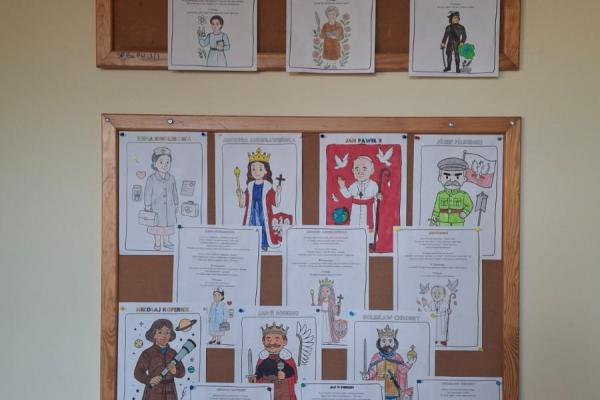 Na zakończenie zajęć powstała galeria prac, w której znalazły się sylwetki polskich bohaterów. Dzięki temu zadaniu uczniowie utrwalili wiedzę o historii Polski oraz rozwijali kreatywność.