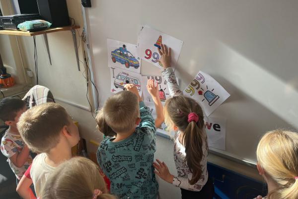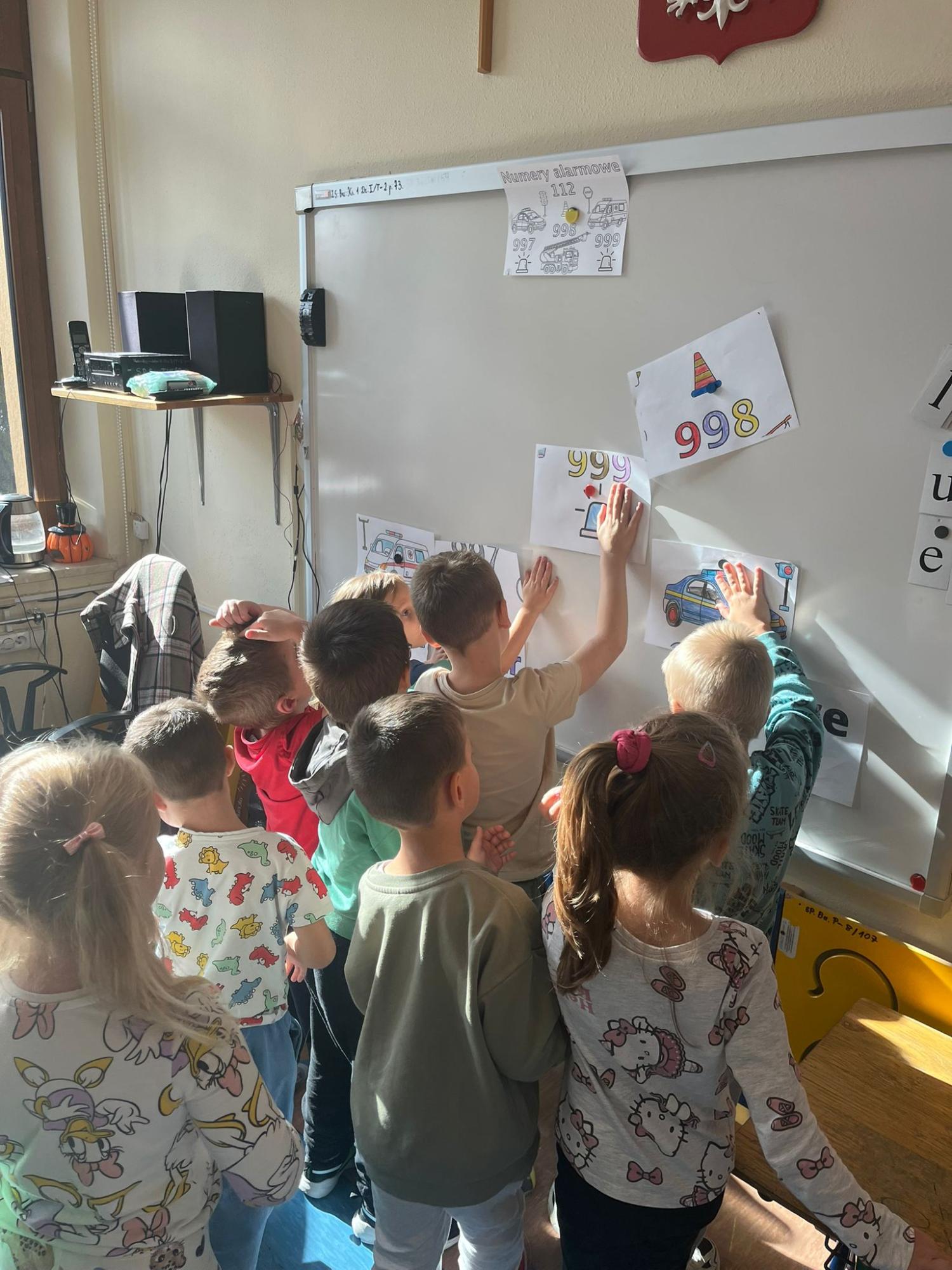 W październiku klasa 0b wzięła udział w bardzo ważnych zajęciach dotyczących numerów alarmowych i udzielania pomocy w nagłych sytuacjach. Dzieci poznały najważniejsze służby ratunkowe – policję, straż pożarną oraz pogotowie ratunkowe – i dopasowywały odpowiednie numery alarmowe do każdej z tych służb. Dowiedziały się również, że numer 112 to ogólny numer alarmowy, pod który można zadzwonić w każdej sytuacji zagrożenia życia lub zdrowia.