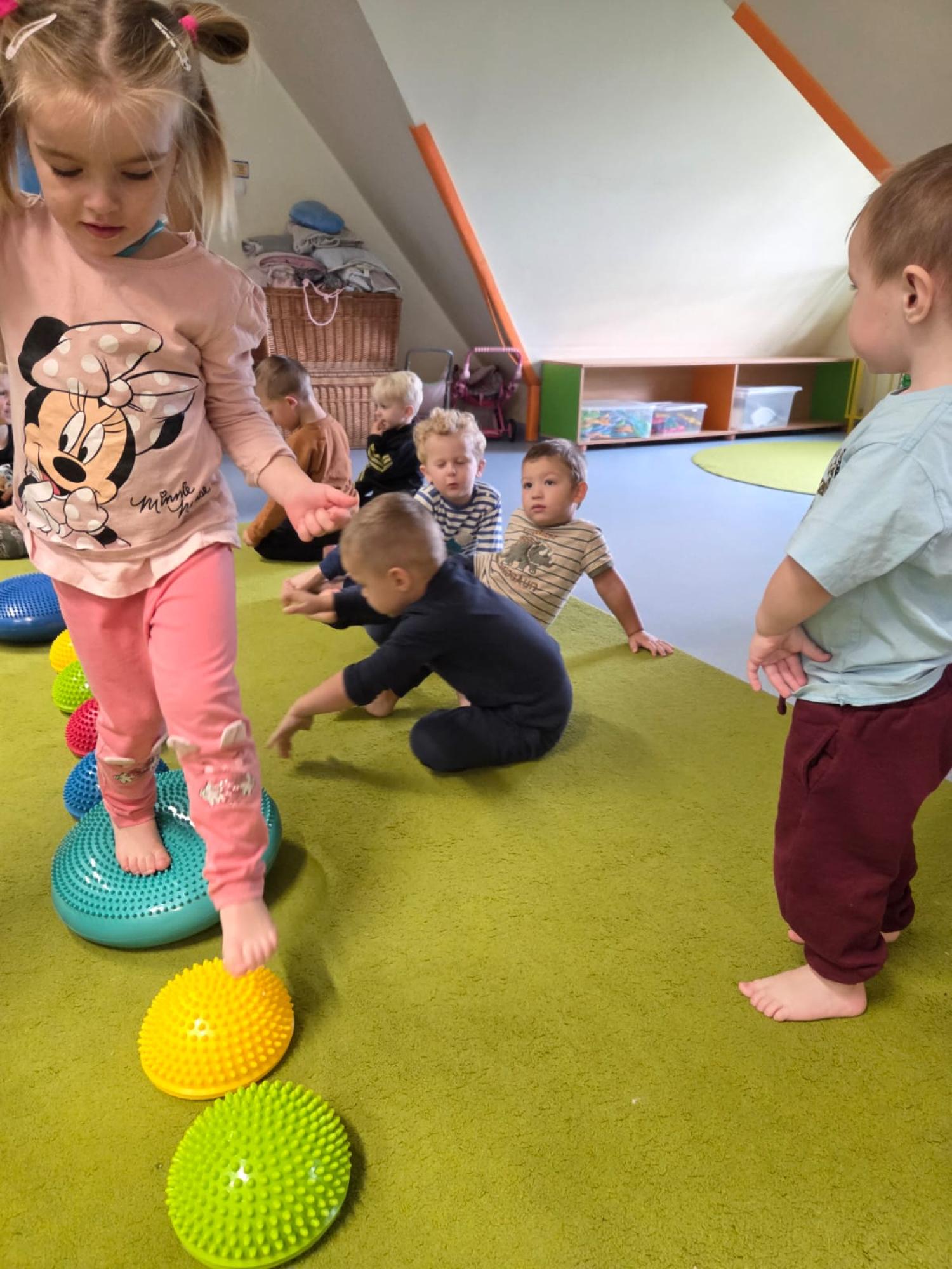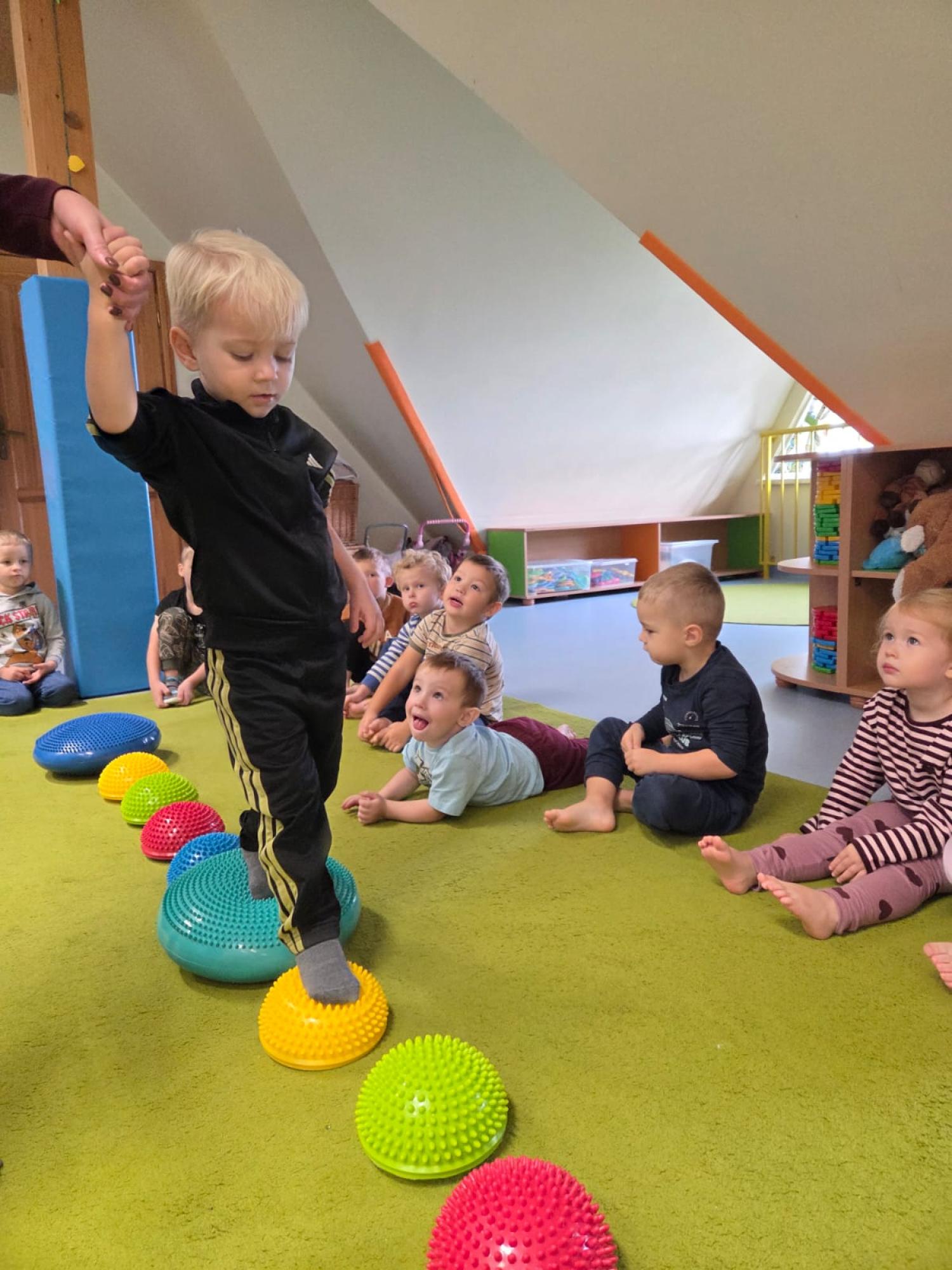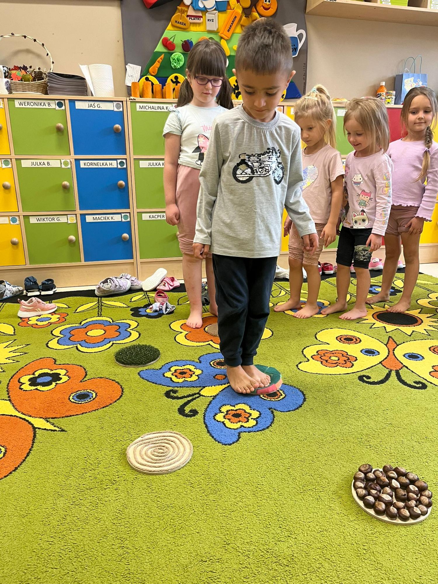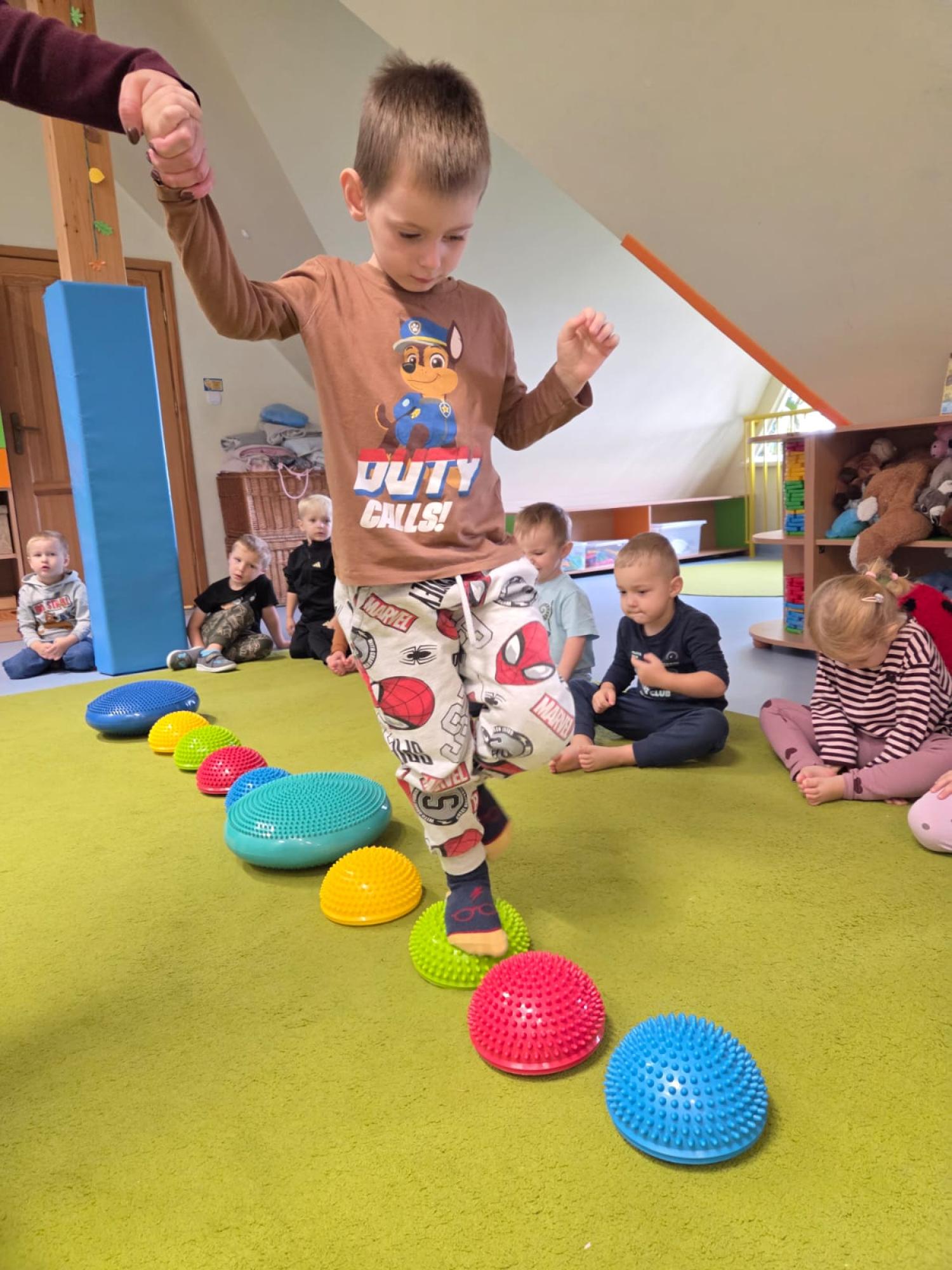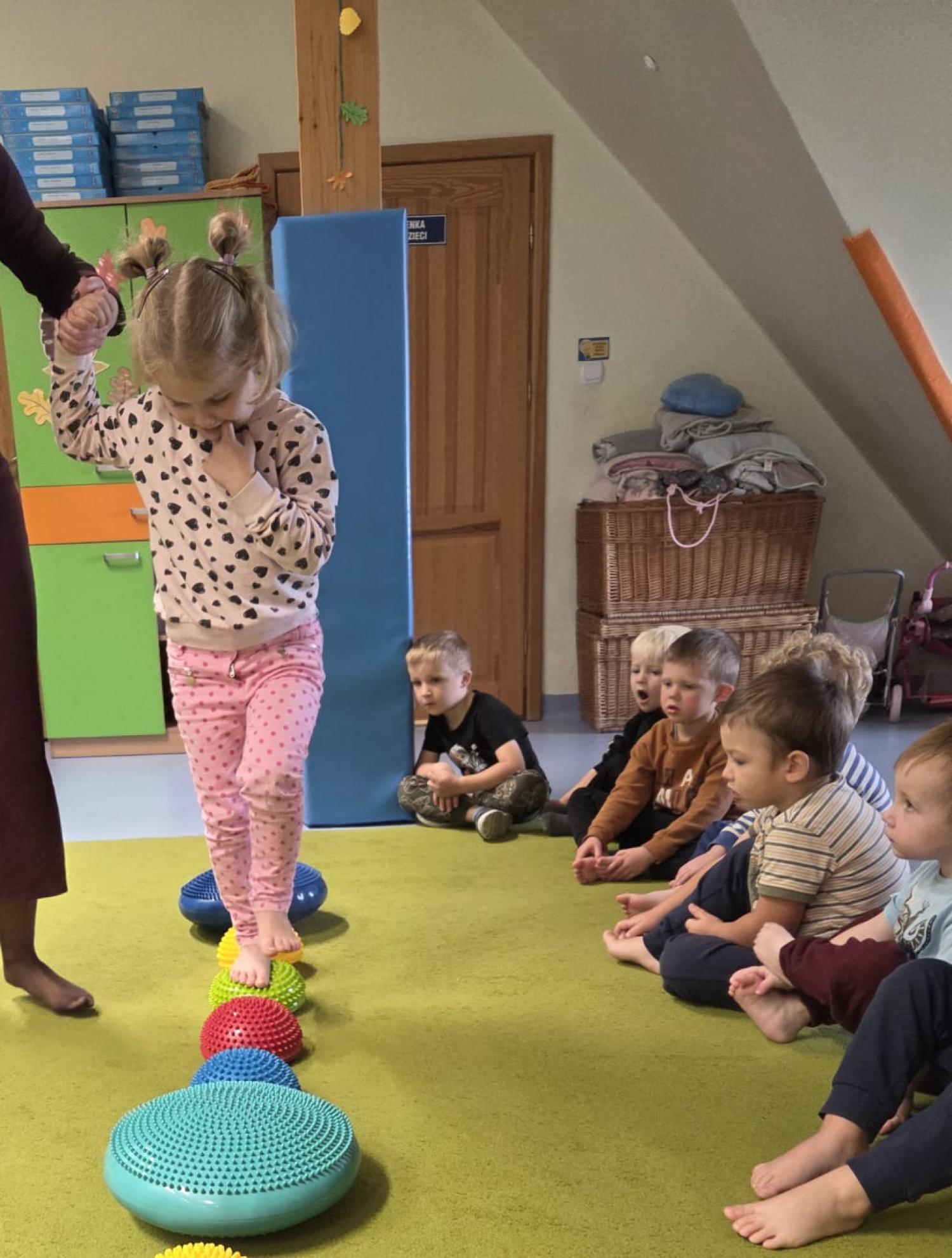 Na przedszkolaków czekała ścieżka sensoryczna, po której mogły przechodzić boso, odkrywając różne faktury – miękkie i szorstkie, chłodne i ciepłe. Dzieci uczestniczyły również w zabawie z piłkami. Każdy krok był nowym doświadczeniem, które nie tylko dostarczało radości, ale też wspierało rozwój równowagi i koordynacji.