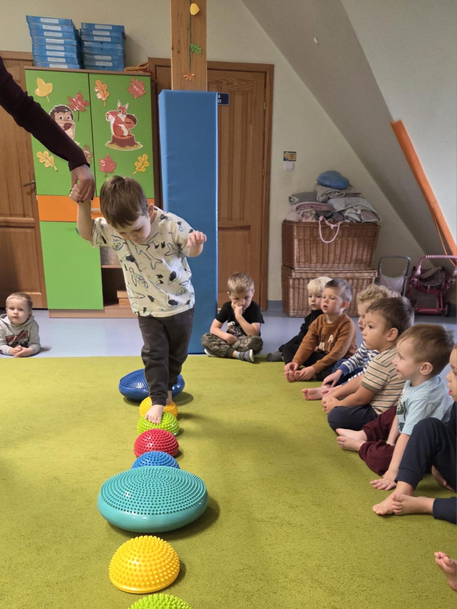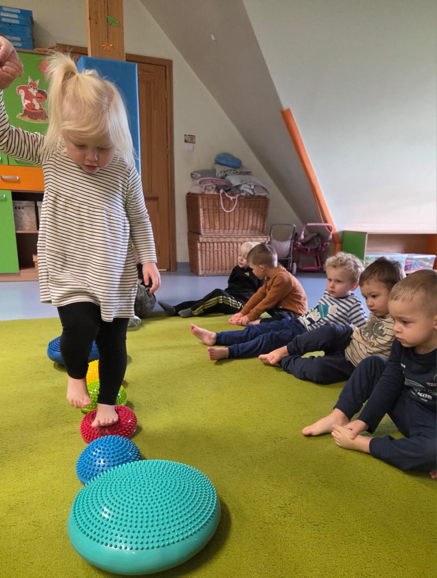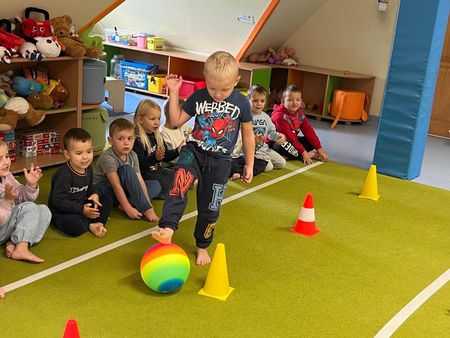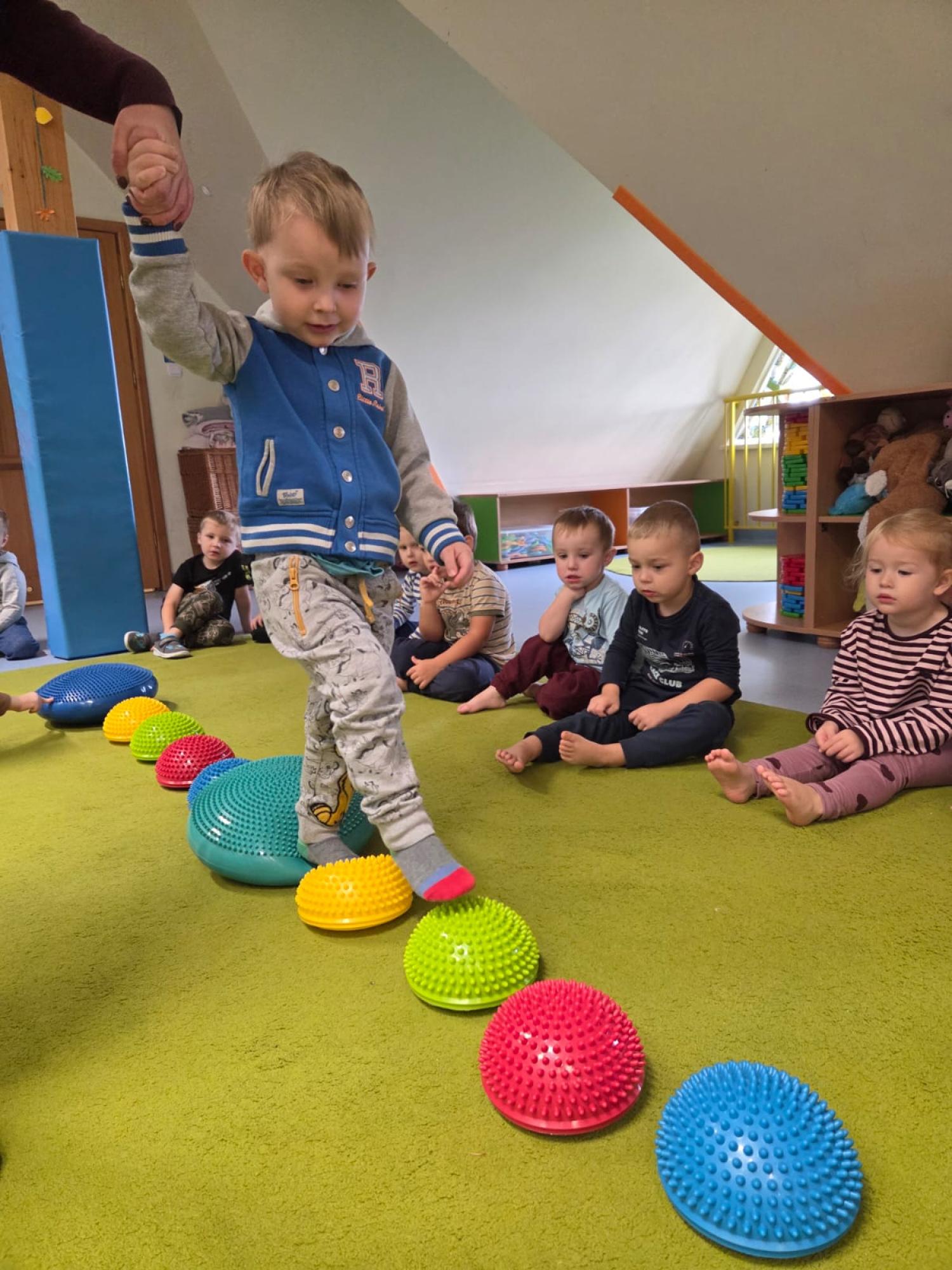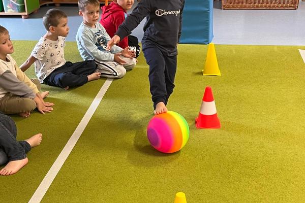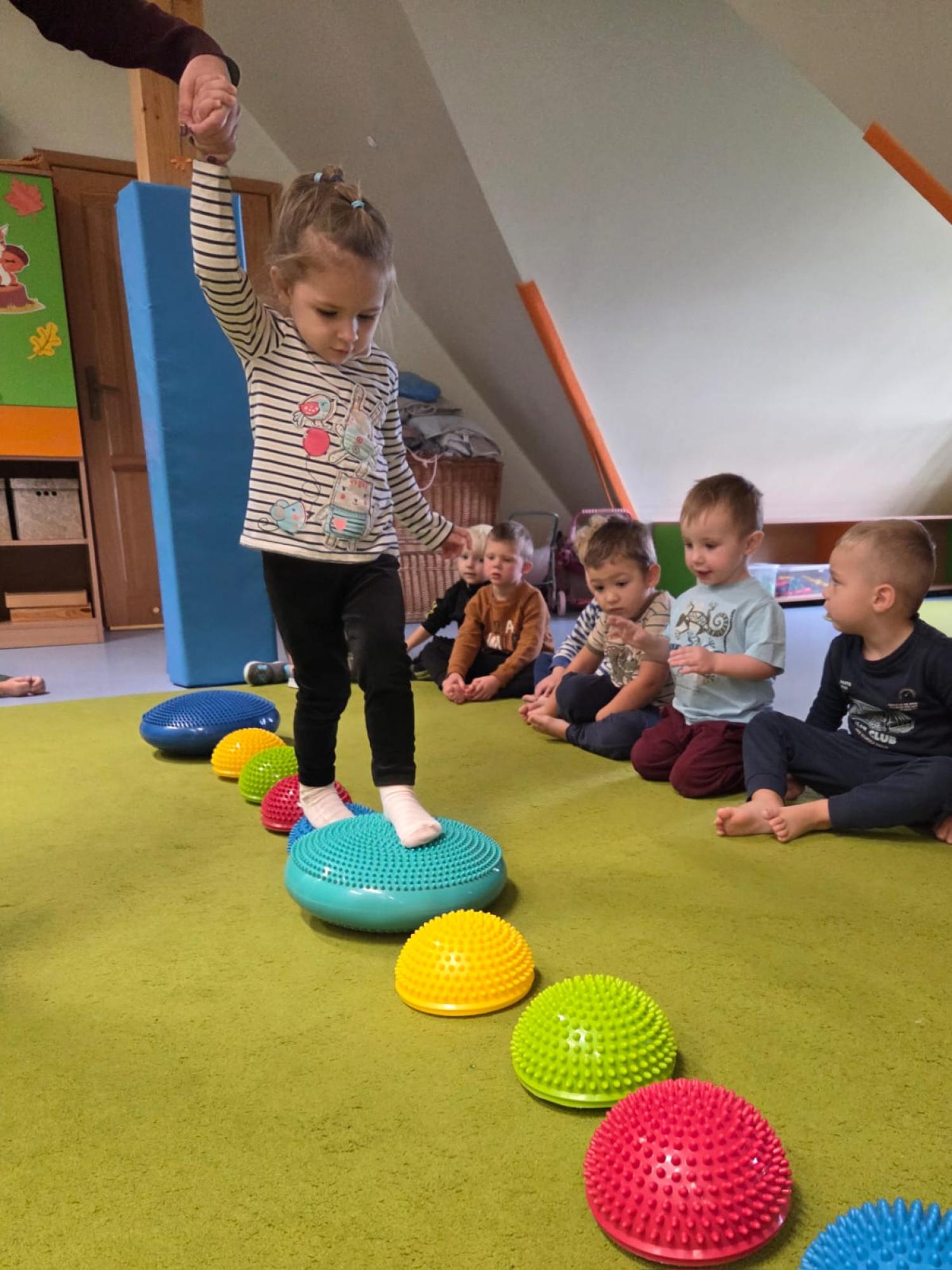 Na przedszkolaków czekała ścieżka sensoryczna, po której mogły przechodzić boso, odkrywając różne faktury – miękkie i szorstkie, chłodne i ciepłe. Dzieci uczestniczyły również w zabawie z piłkami. Każdy krok był nowym doświadczeniem, które nie tylko dostarczało radości, ale też wspierało rozwój równowagi i koordynacji.