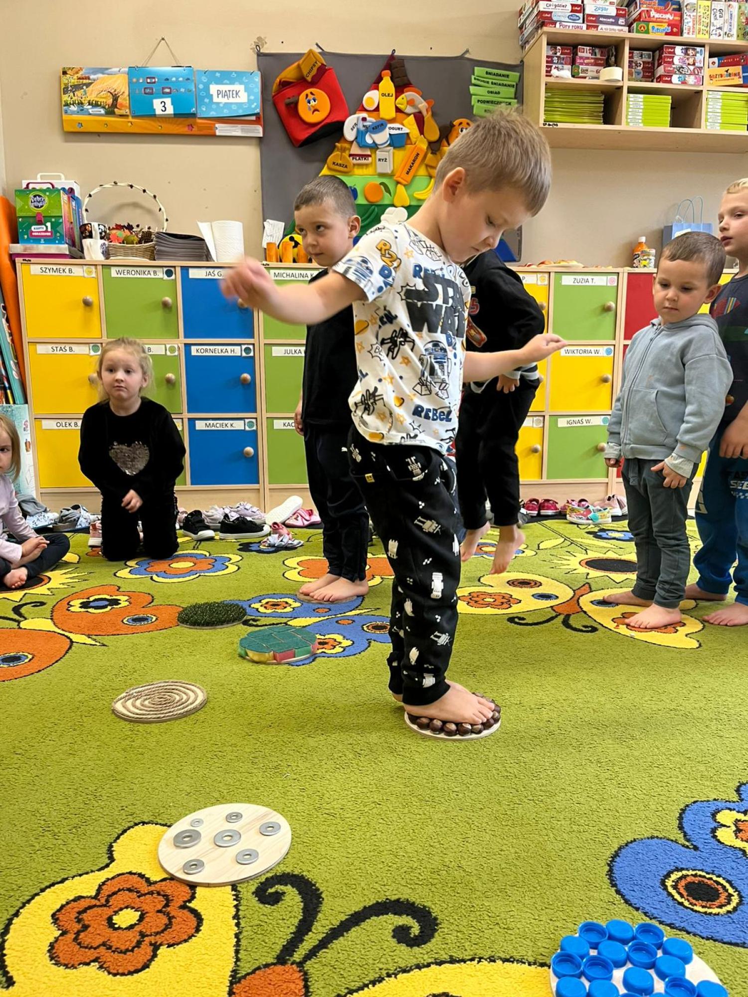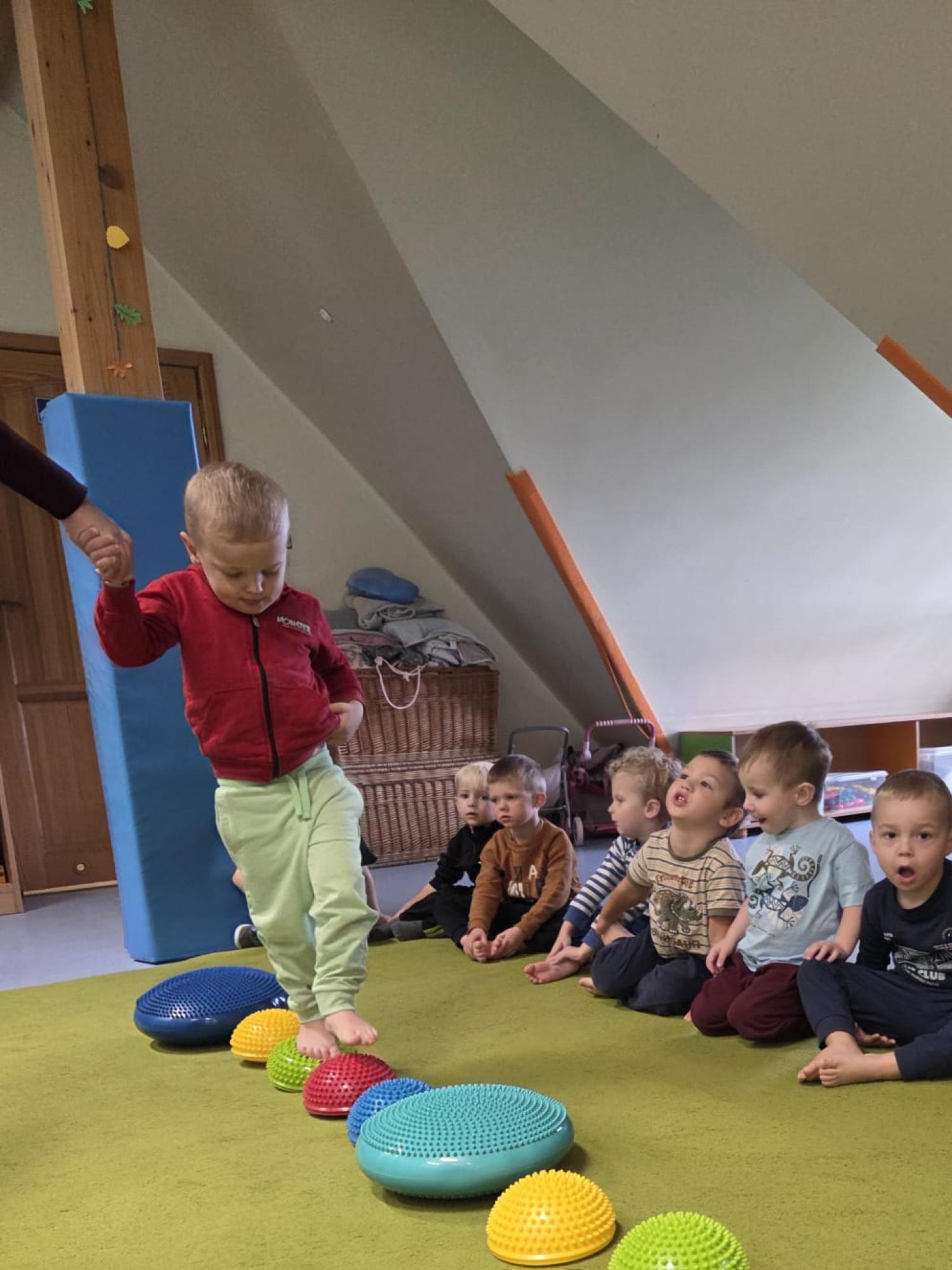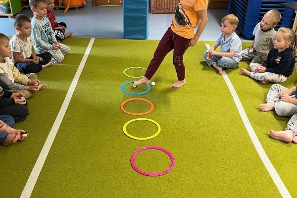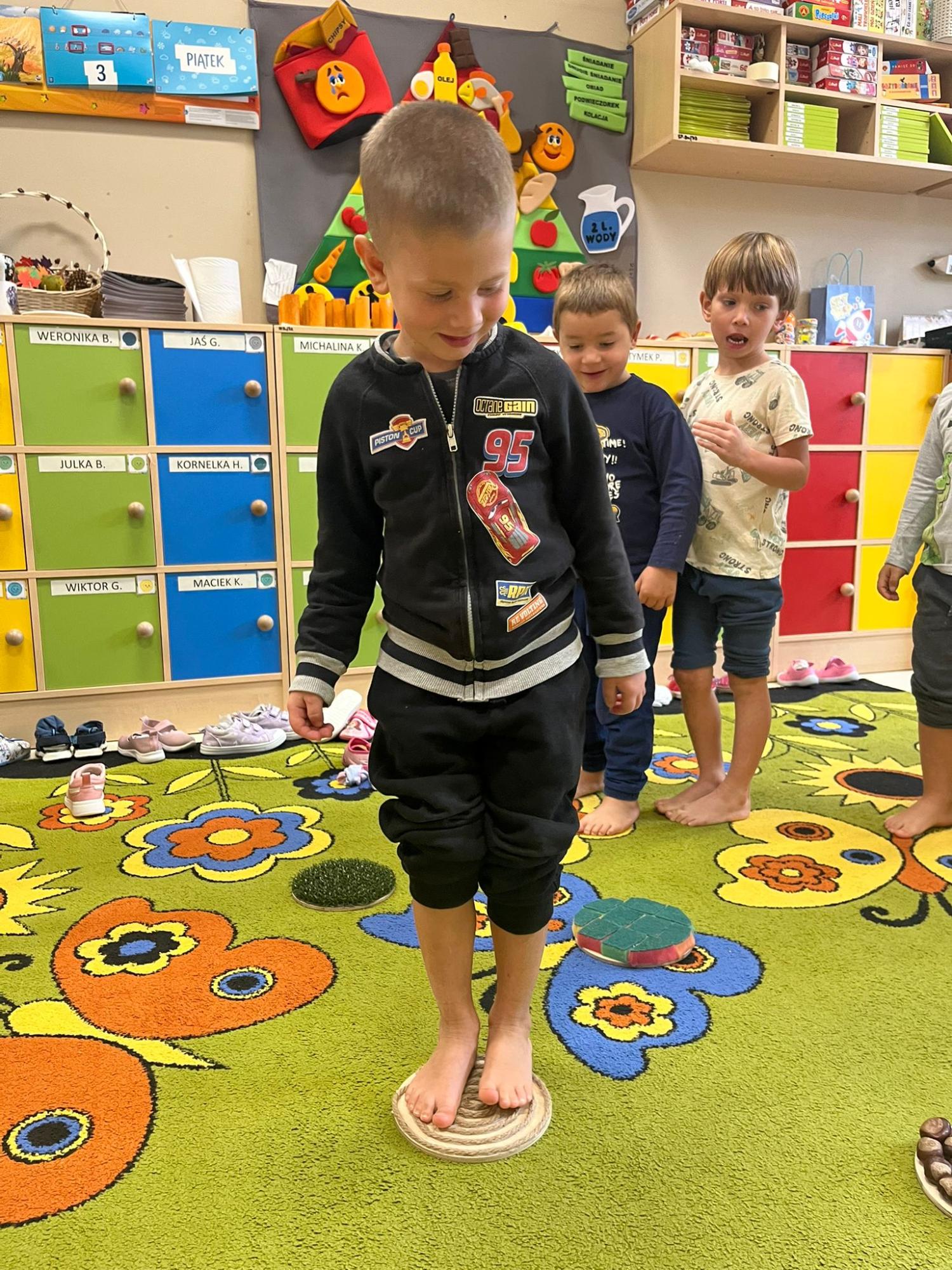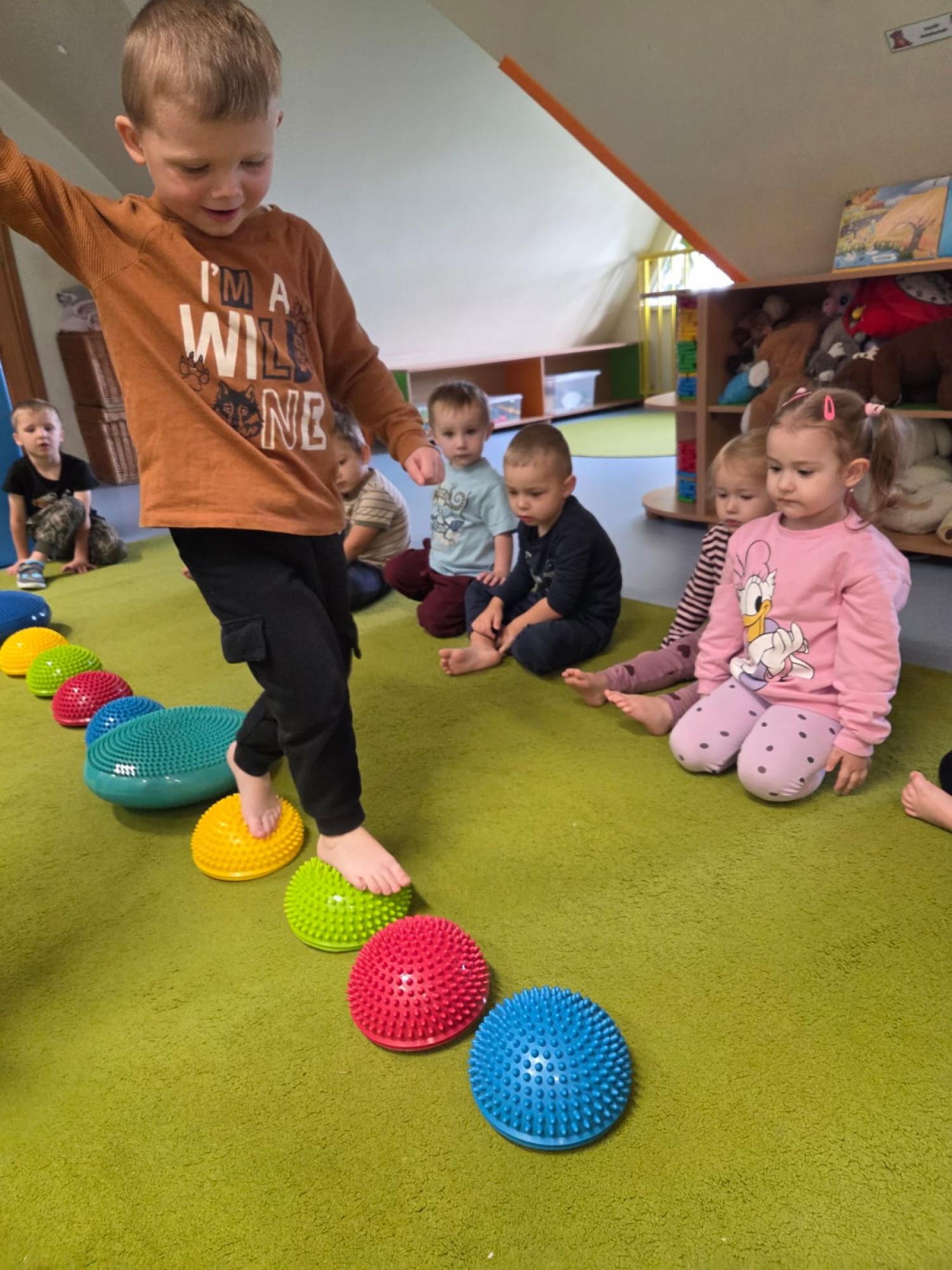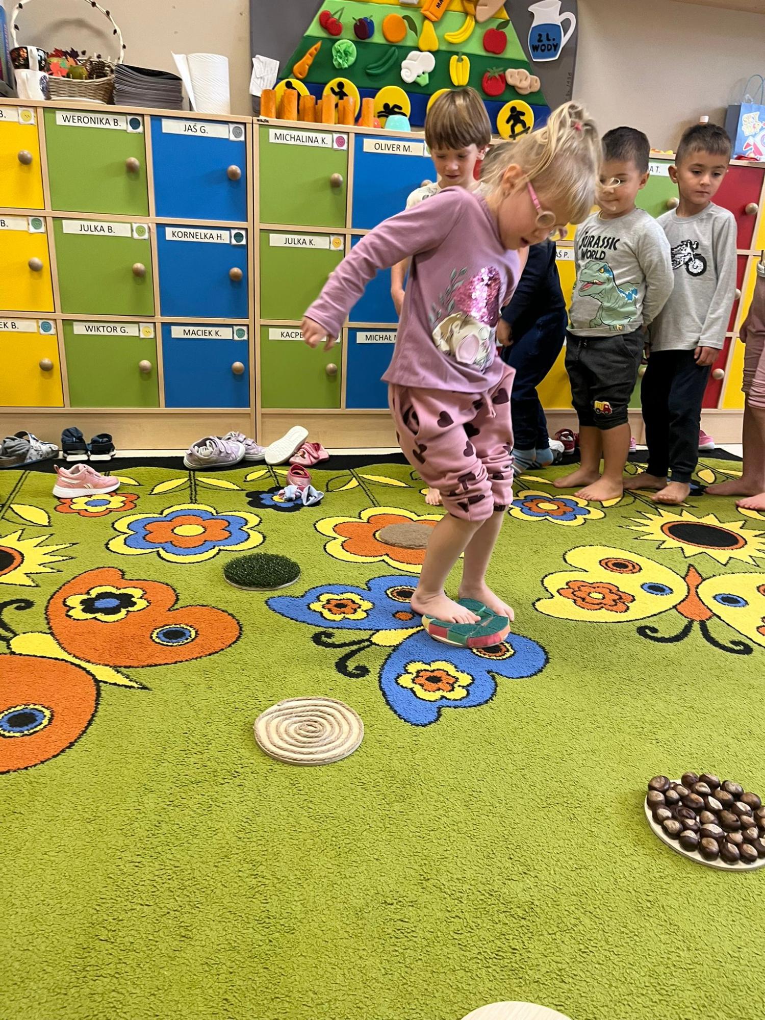 Na przedszkolaków czekała ścieżka sensoryczna, po której mogły przechodzić boso, odkrywając różne faktury – miękkie i szorstkie, chłodne i ciepłe. Dzieci uczestniczyły również w zabawie z piłkami. Każdy krok był nowym doświadczeniem, które nie tylko dostarczało radości, ale też wspierało rozwój równowagi i koordynacji.