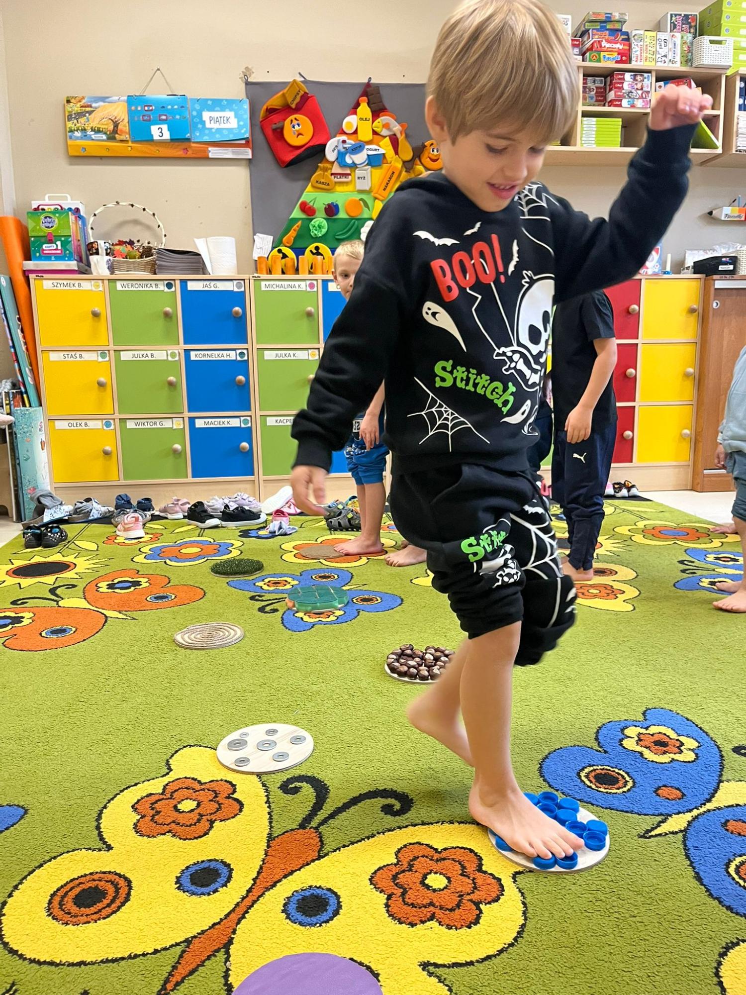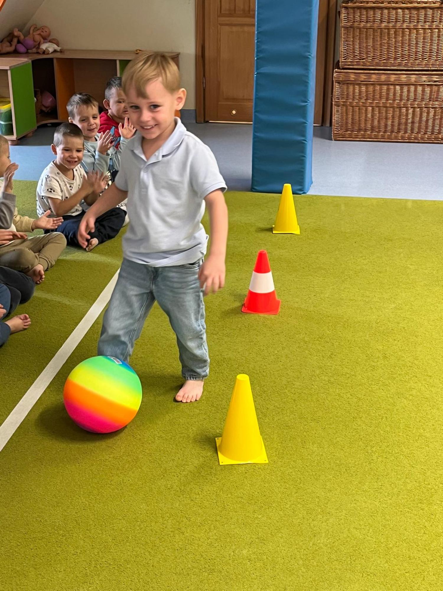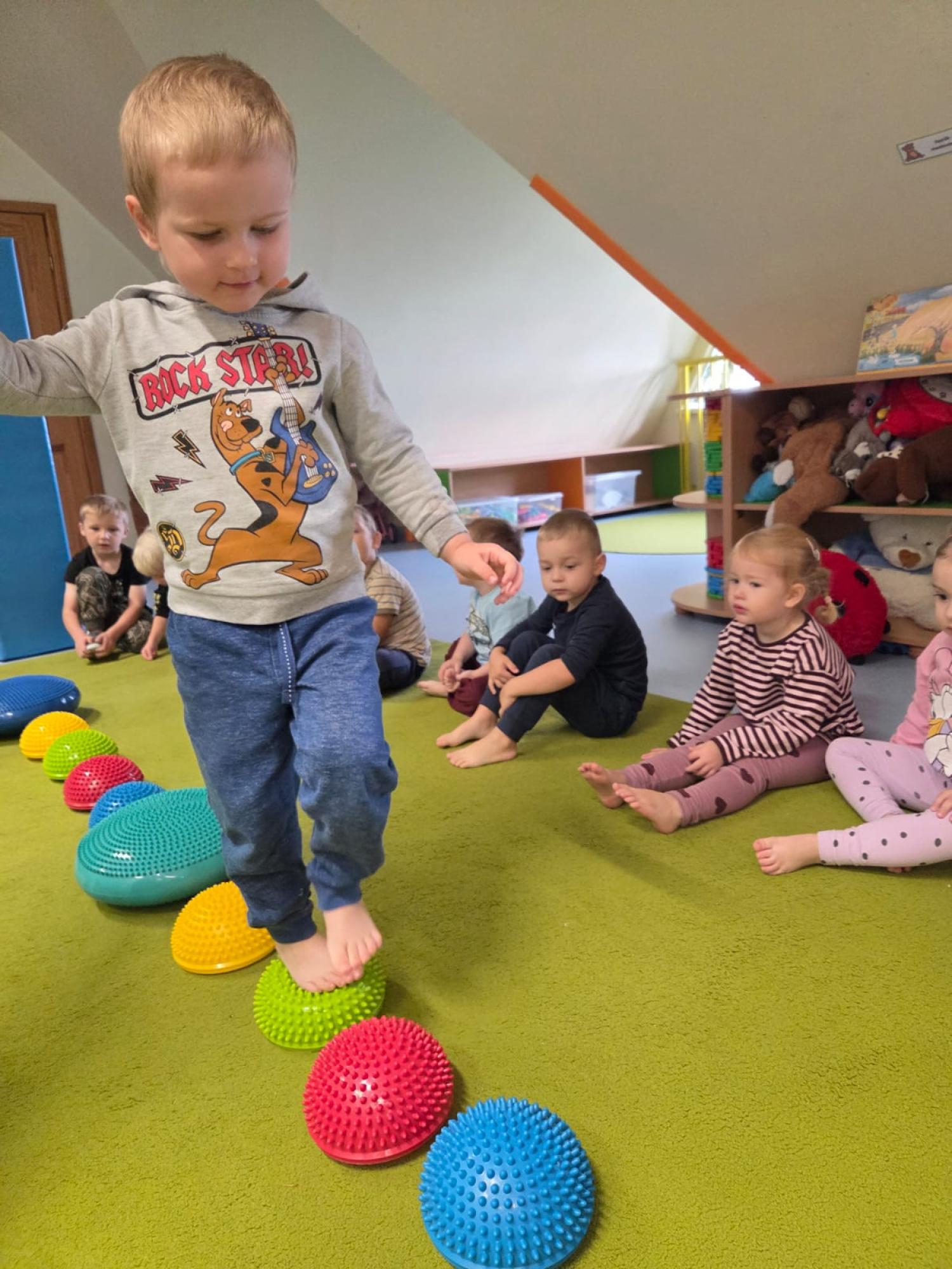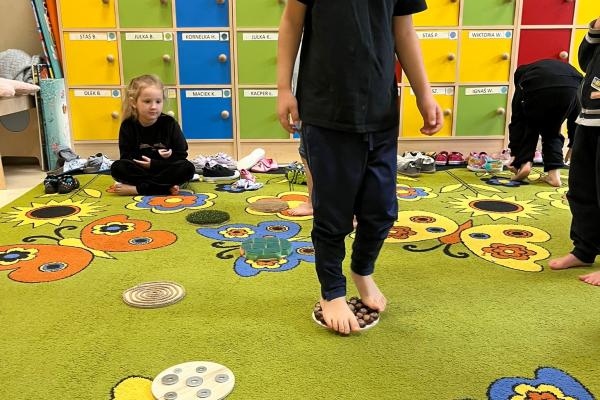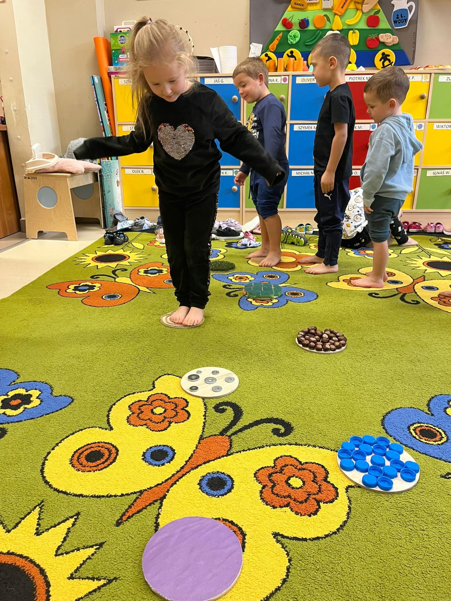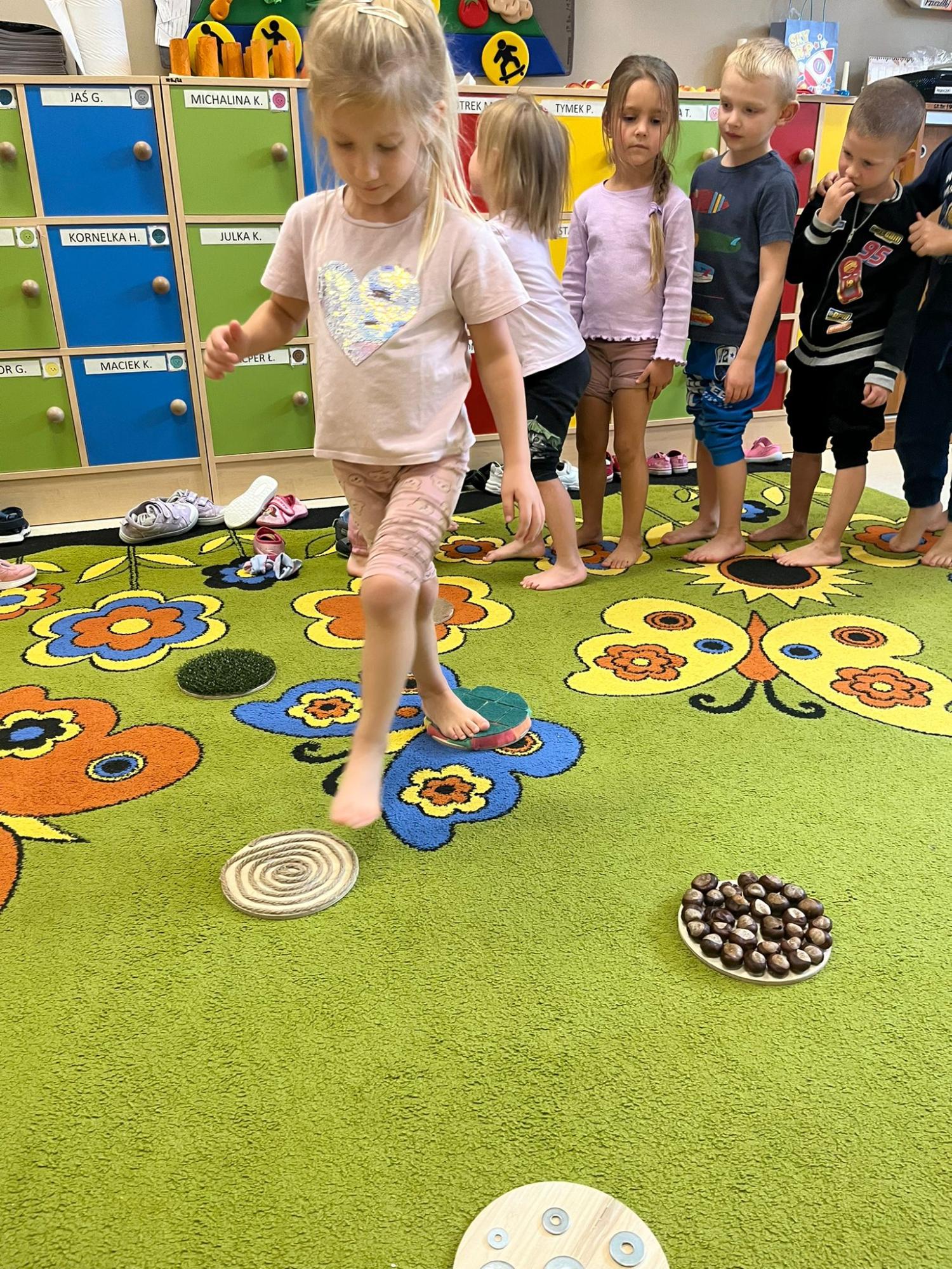 Na przedszkolaków czekała ścieżka sensoryczna, po której mogły przechodzić boso, odkrywając różne faktury – miękkie i szorstkie, chłodne i ciepłe. Dzieci uczestniczyły również w zabawie z piłkami. Każdy krok był nowym doświadczeniem, które nie tylko dostarczało radości, ale też wspierało rozwój równowagi i koordynacji.