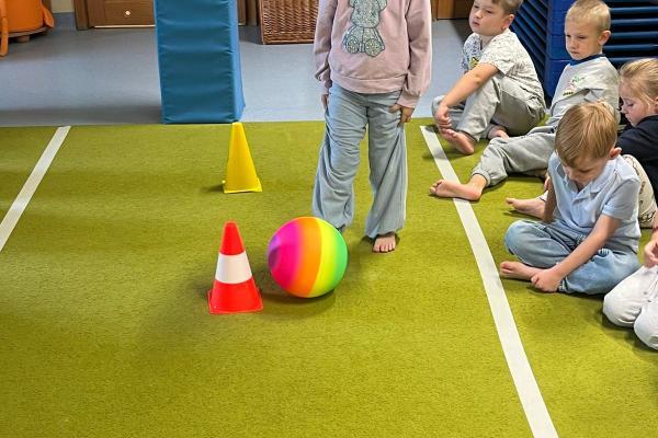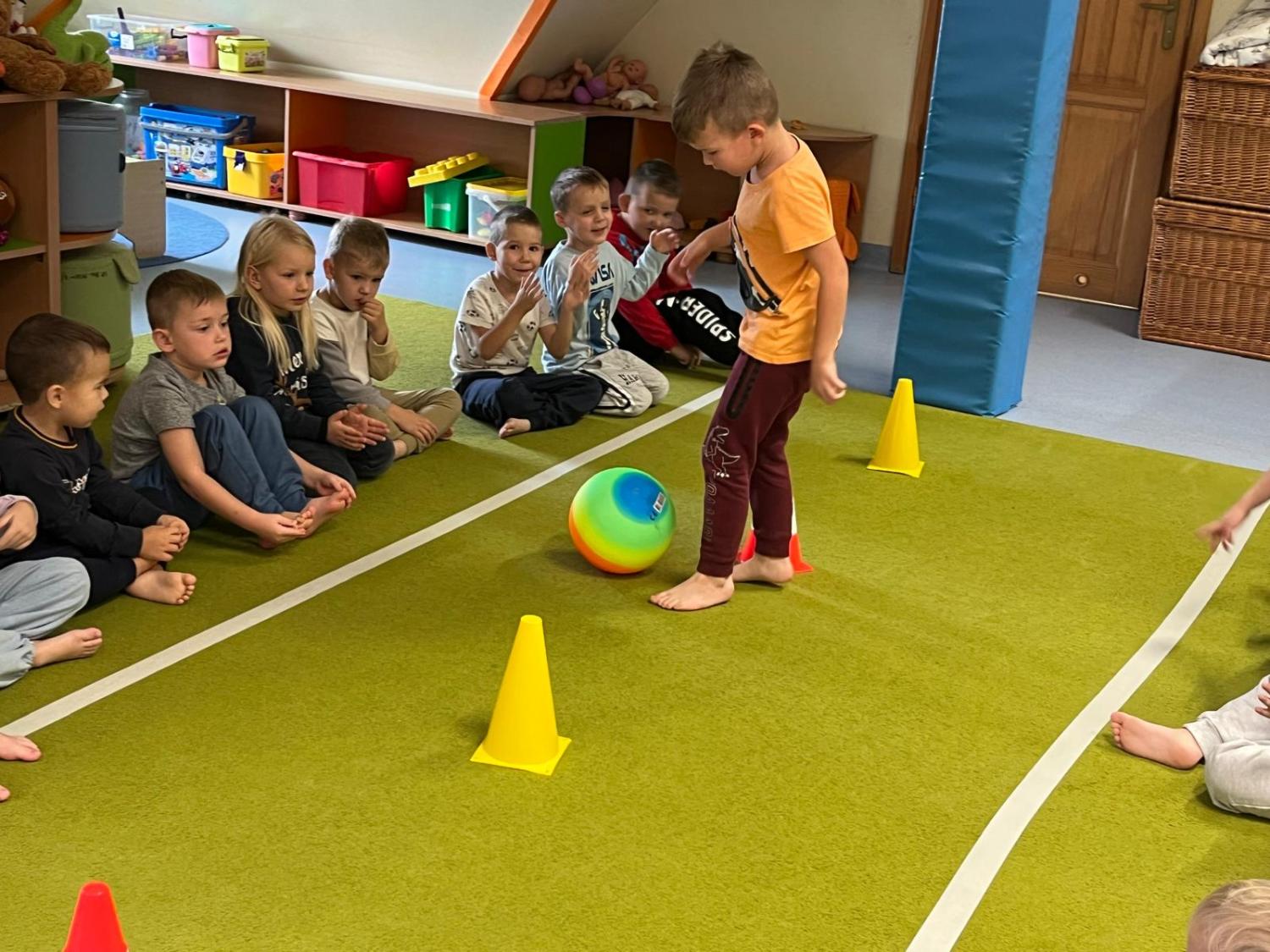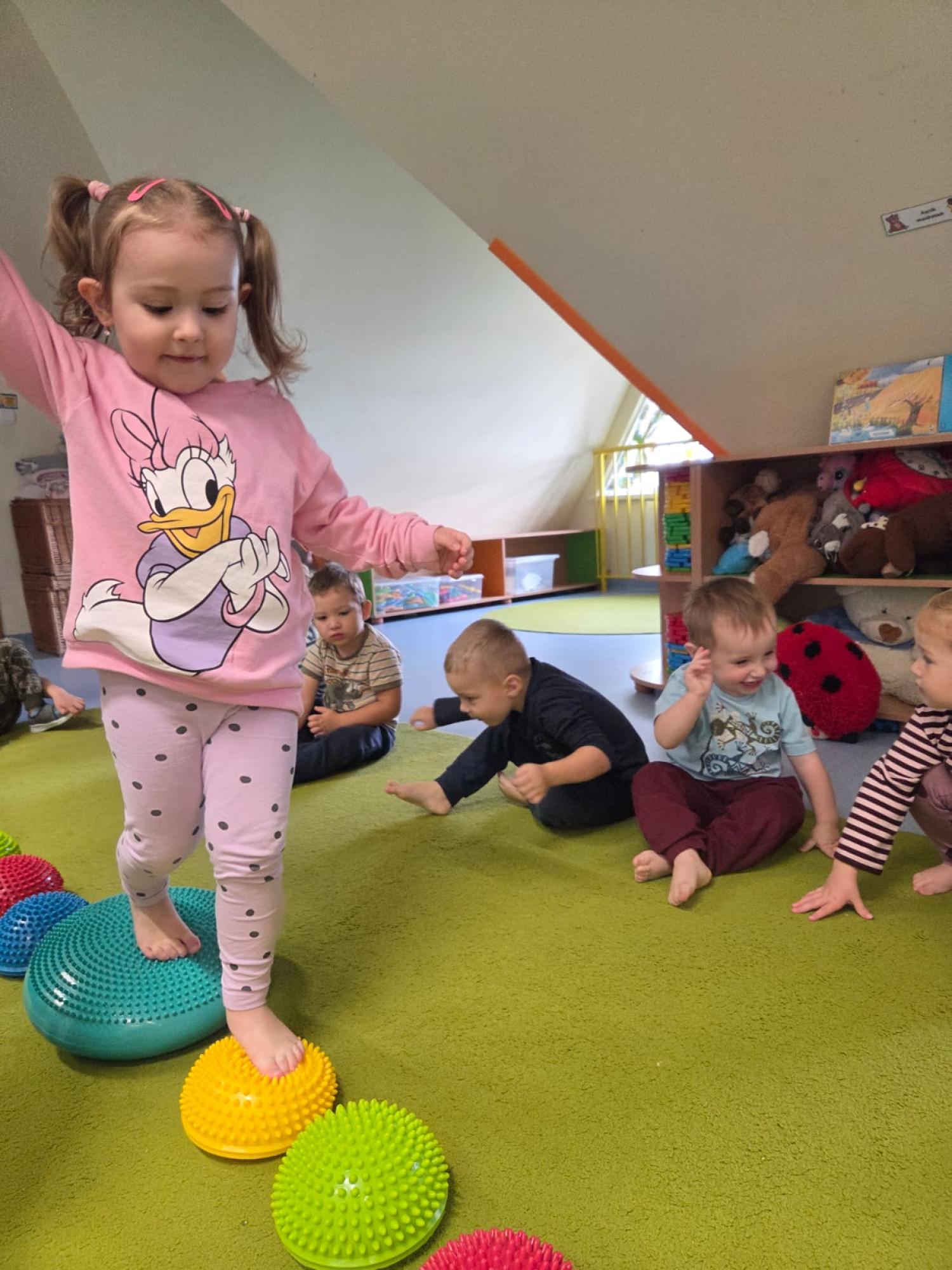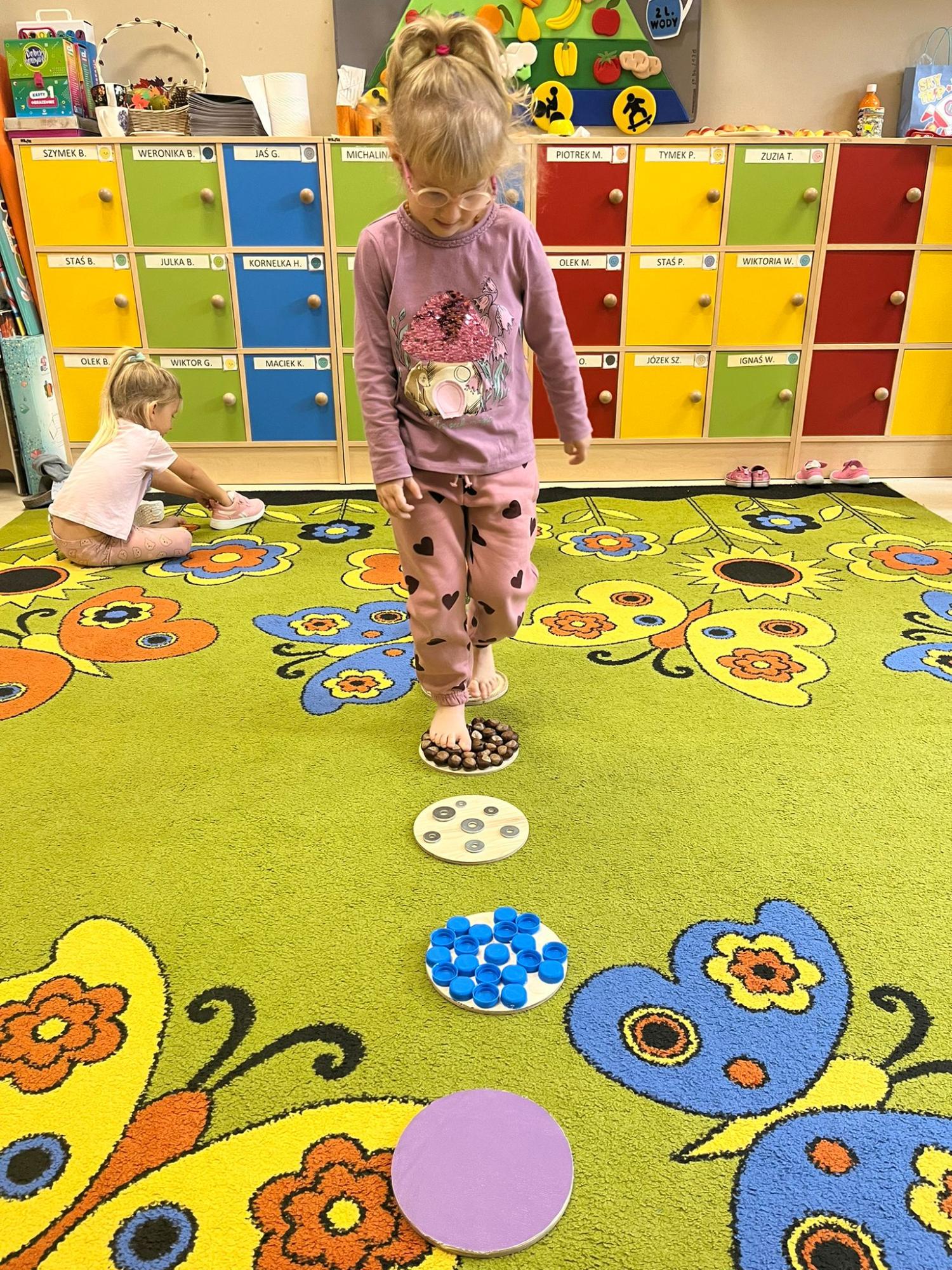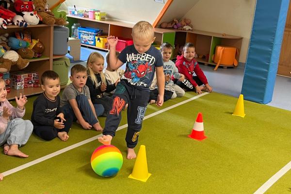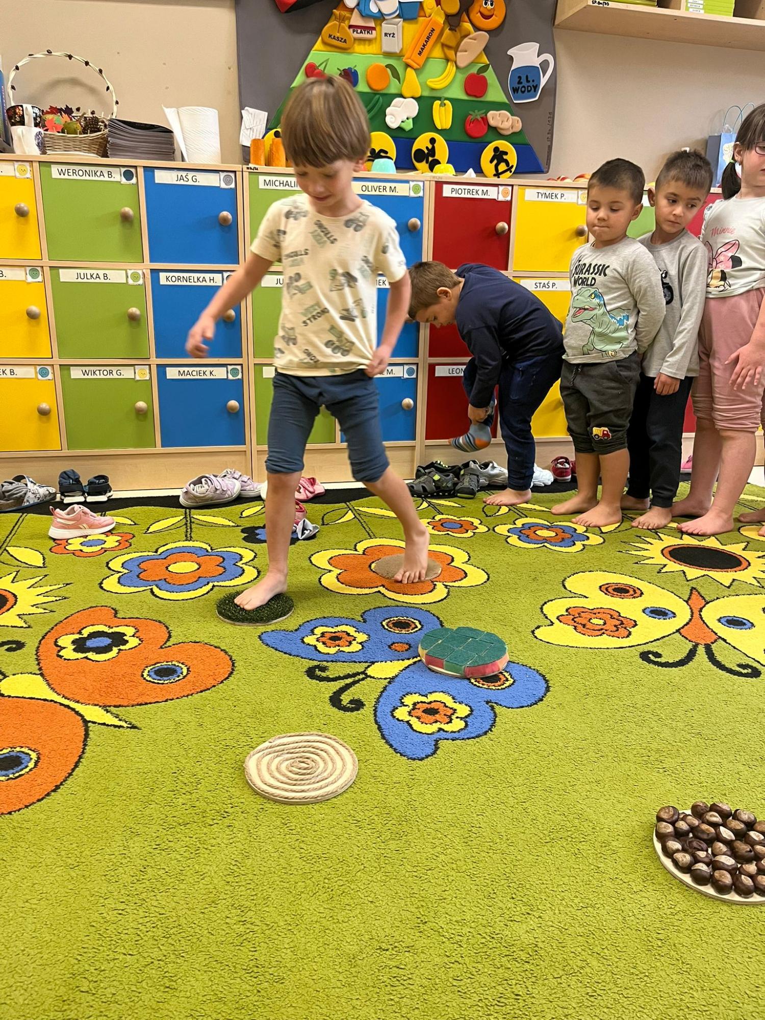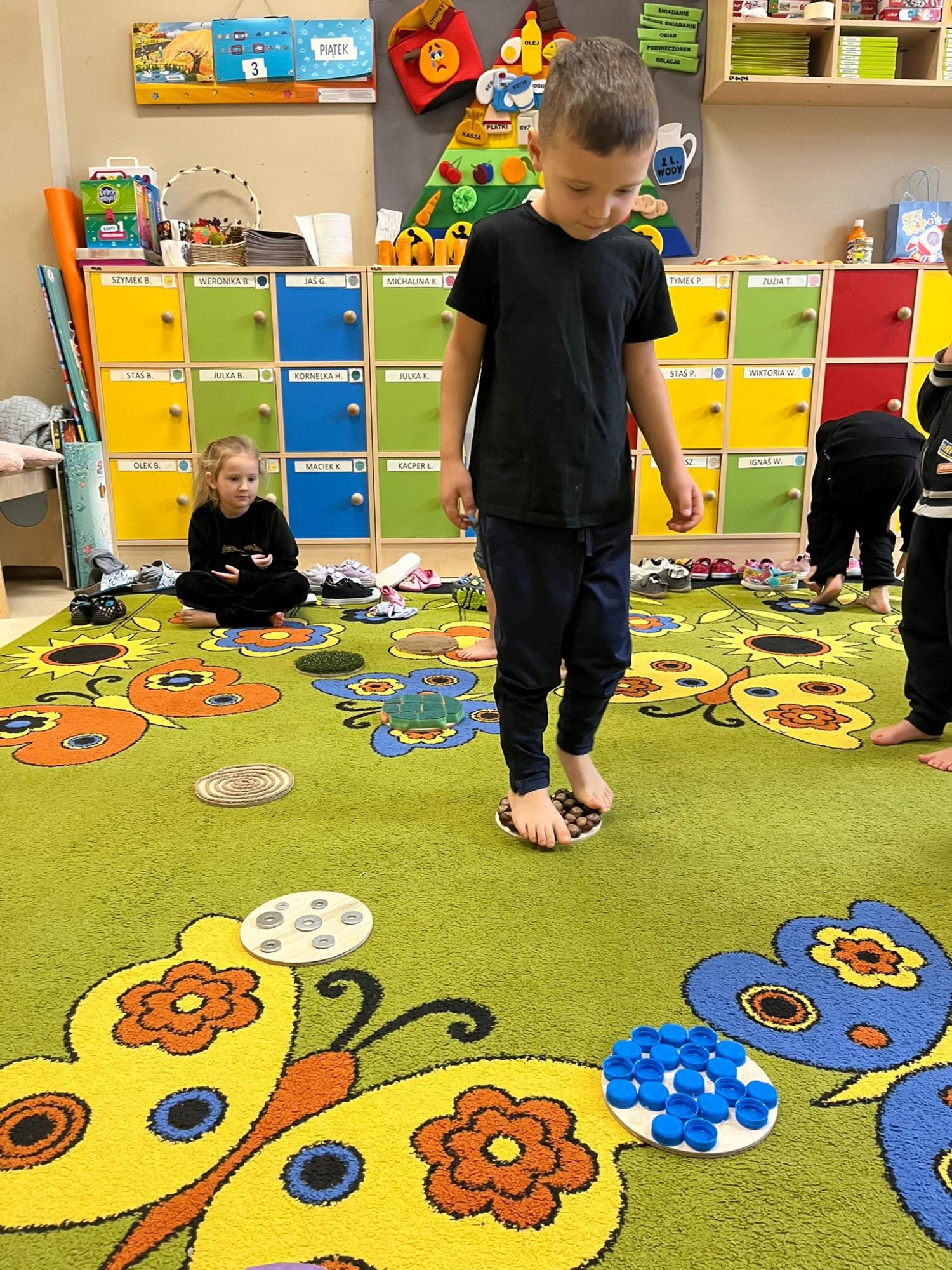 Na przedszkolaków czekała ścieżka sensoryczna, po której mogły przechodzić boso, odkrywając różne faktury – miękkie i szorstkie, chłodne i ciepłe. Dzieci uczestniczyły również w zabawie z piłkami. Każdy krok był nowym doświadczeniem, które nie tylko dostarczało radości, ale też wspierało rozwój równowagi i koordynacji.