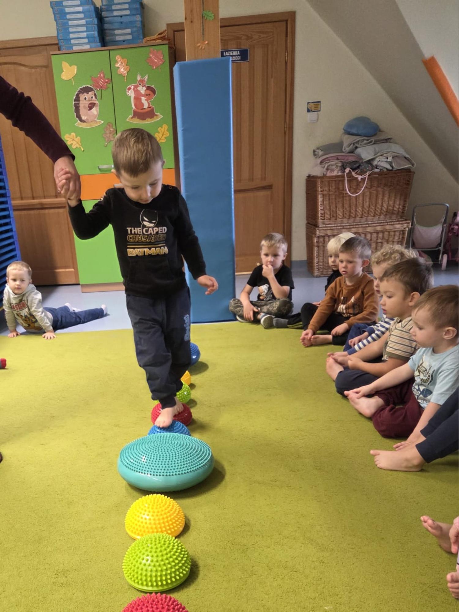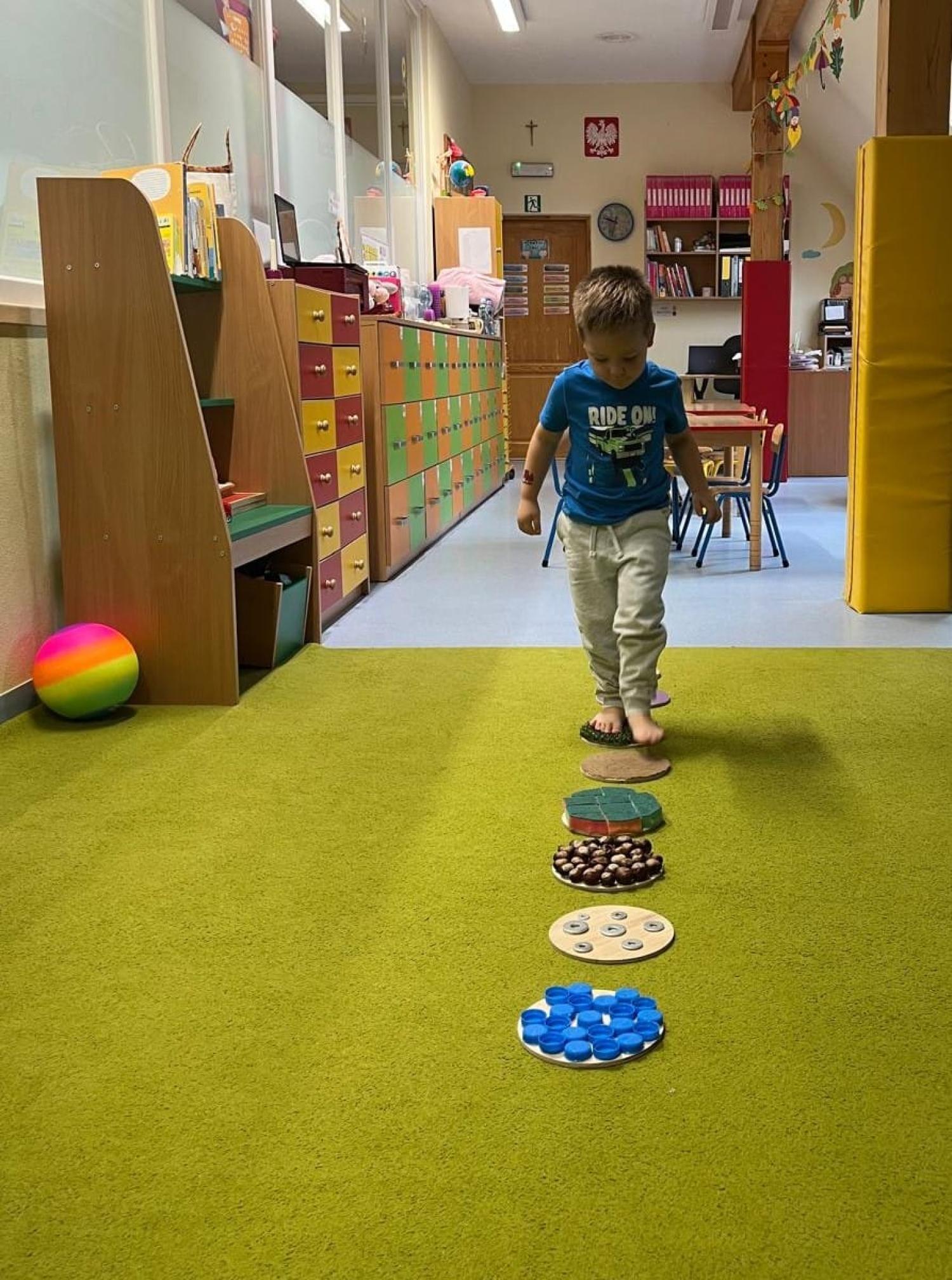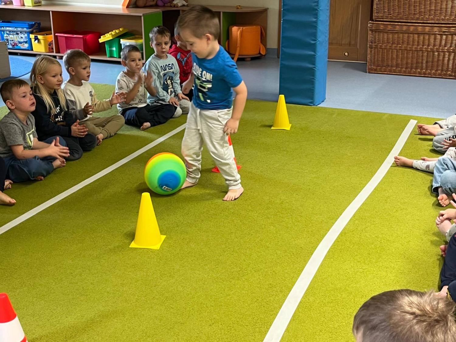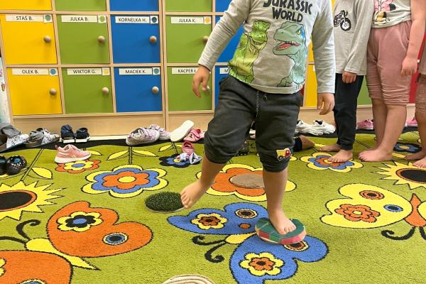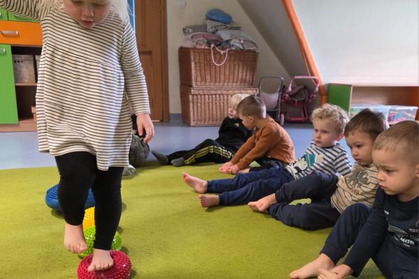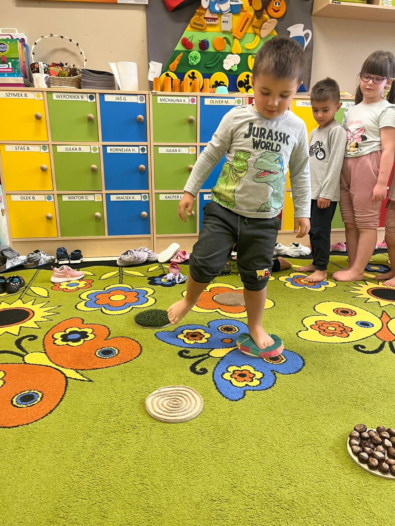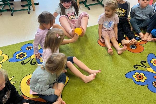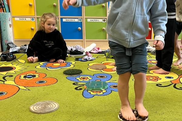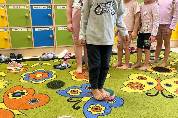 Na przedszkolaków czekała ścieżka sensoryczna, po której mogły przechodzić boso, odkrywając różne faktury – miękkie i szorstkie, chłodne i ciepłe. Dzieci uczestniczyły również w zabawie z piłkami. Każdy krok był nowym doświadczeniem, które nie tylko dostarczało radości, ale też wspierało rozwój równowagi i koordynacji.