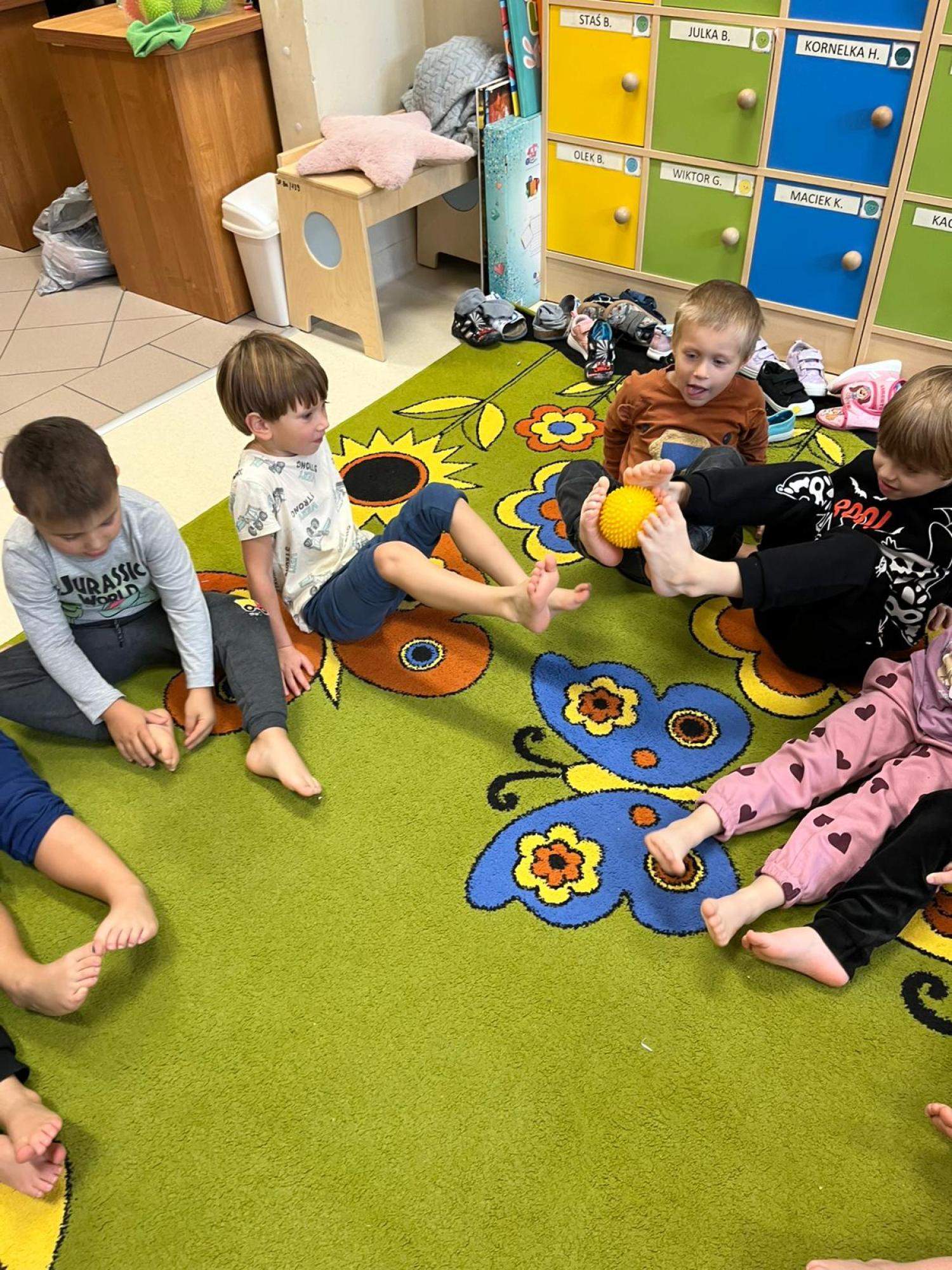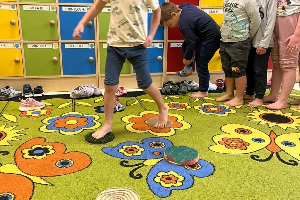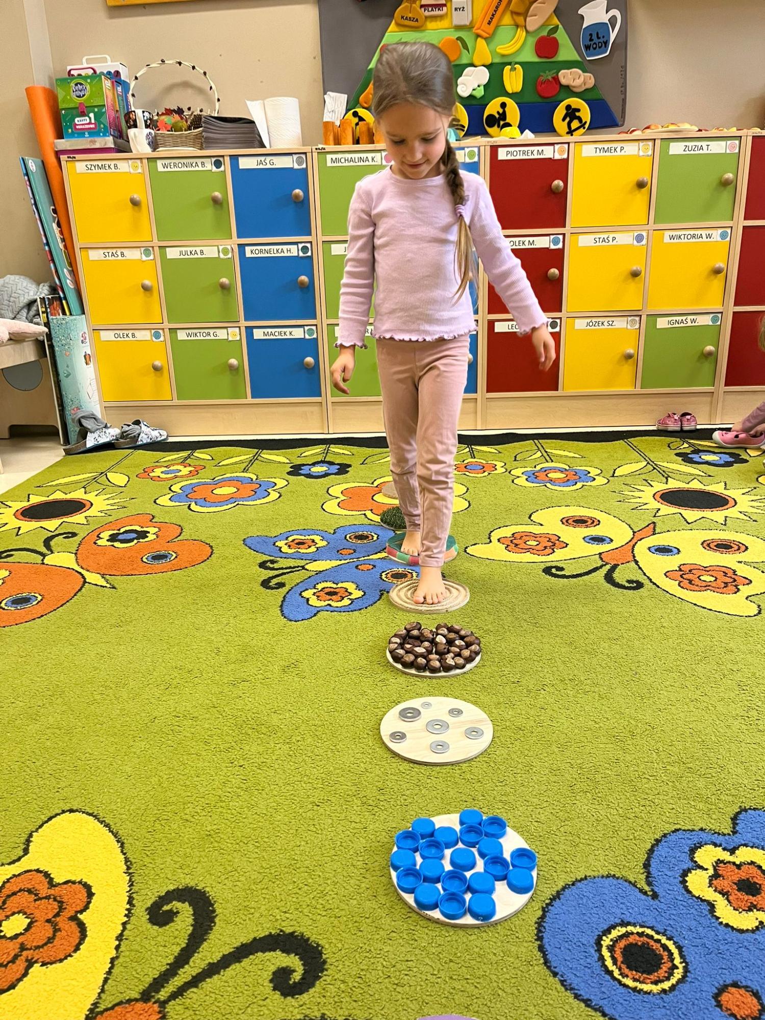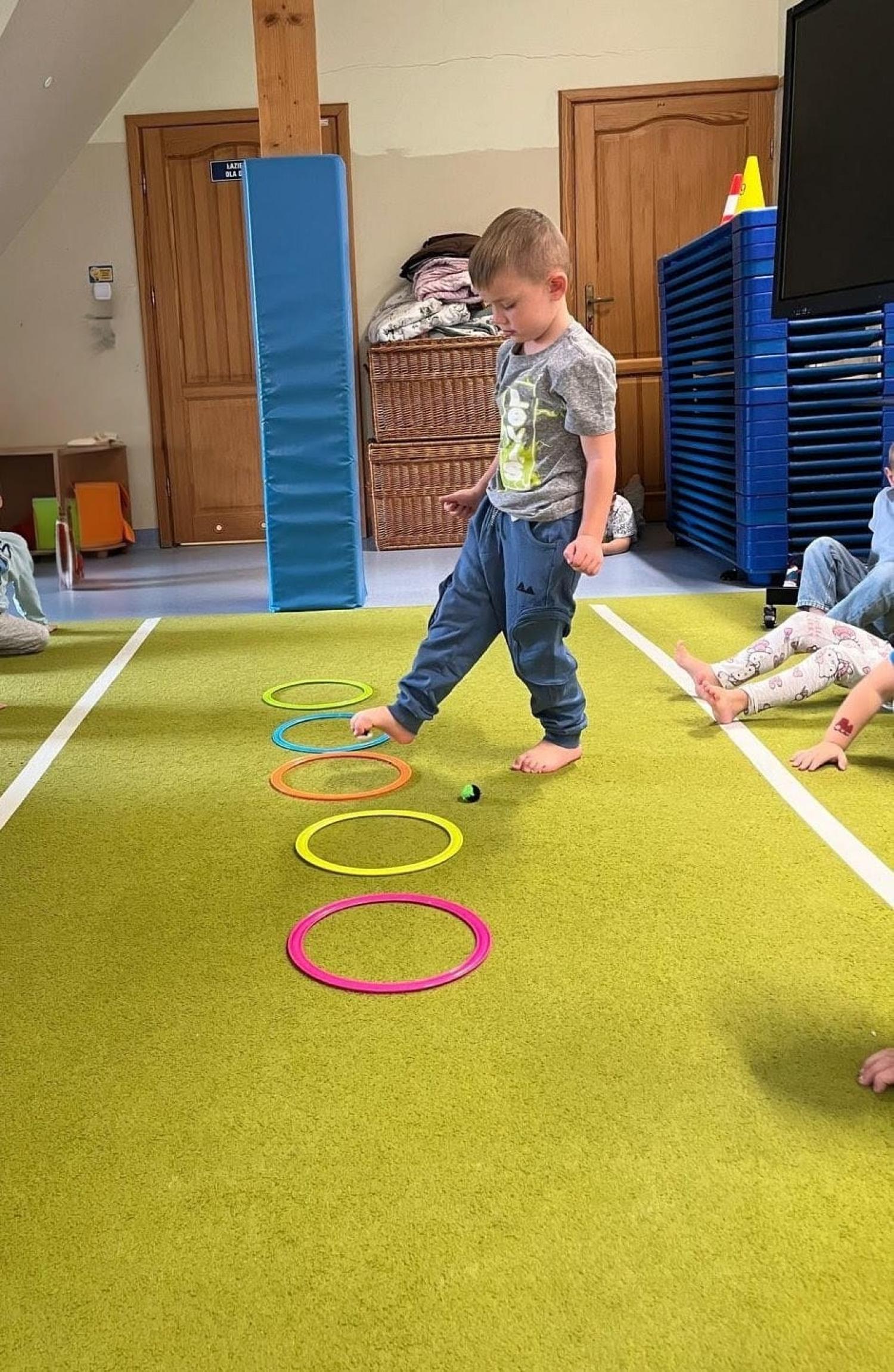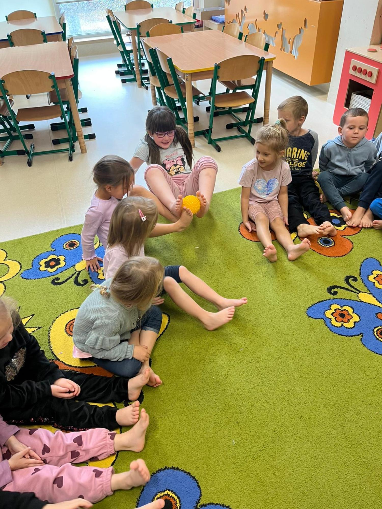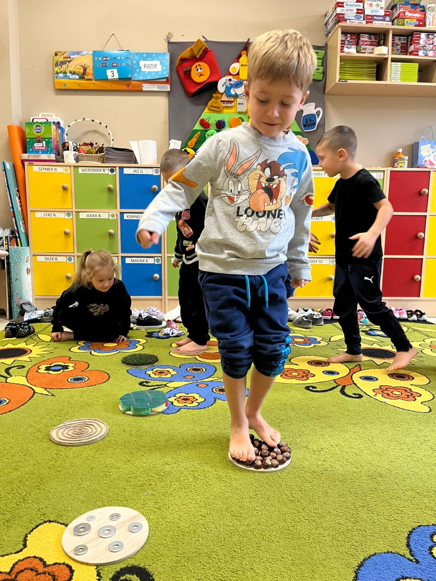 Na przedszkolaków czekała ścieżka sensoryczna, po której mogły przechodzić boso, odkrywając różne faktury – miękkie i szorstkie, chłodne i ciepłe. Dzieci uczestniczyły również w zabawie z piłkami. Każdy krok był nowym doświadczeniem, które nie tylko dostarczało radości, ale też wspierało rozwój równowagi i koordynacji.