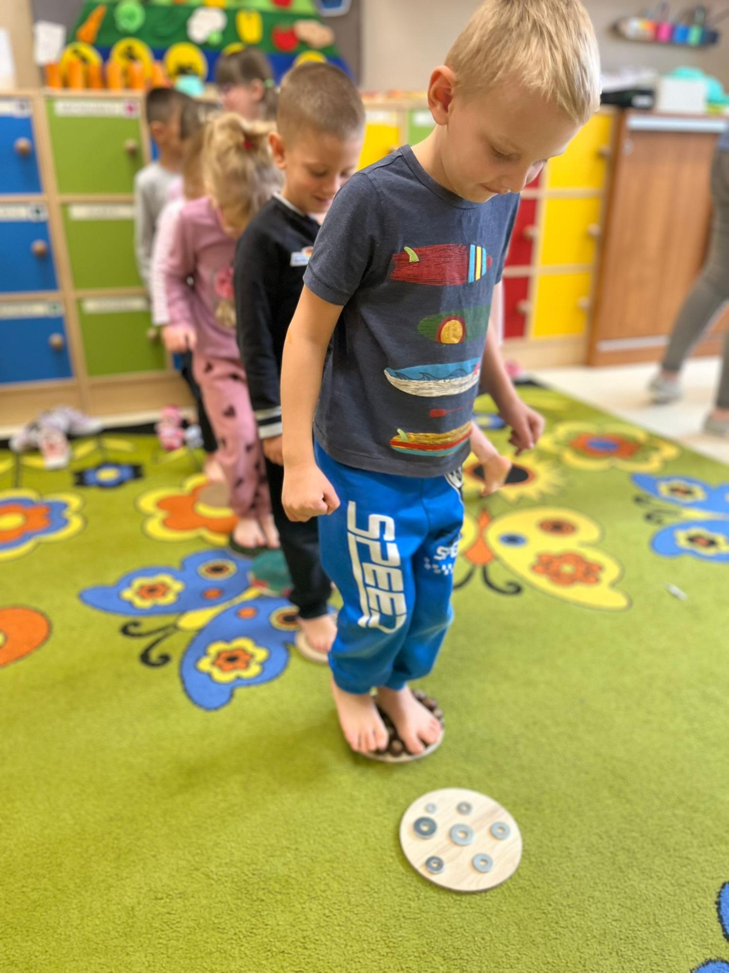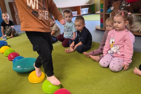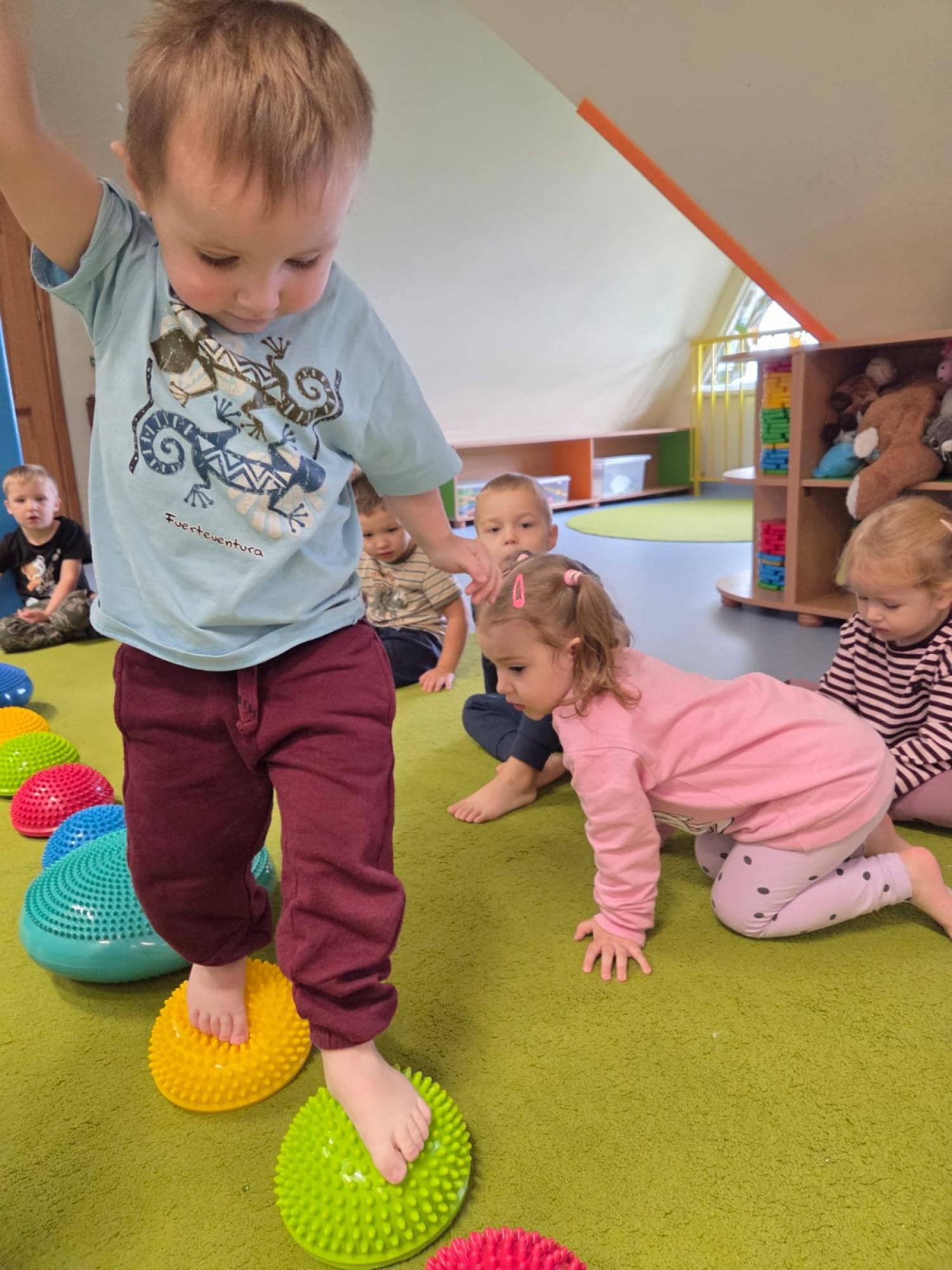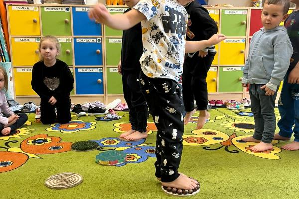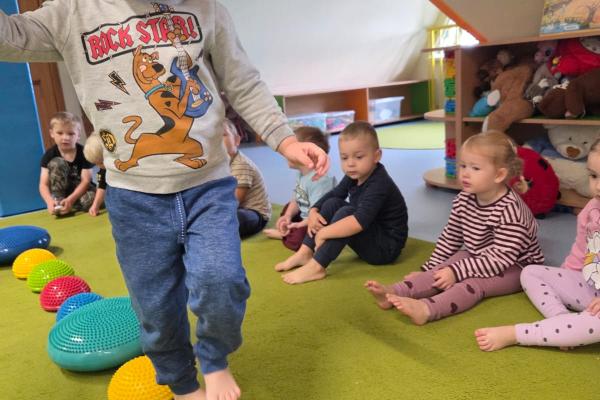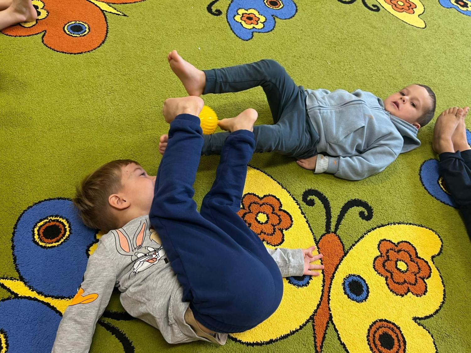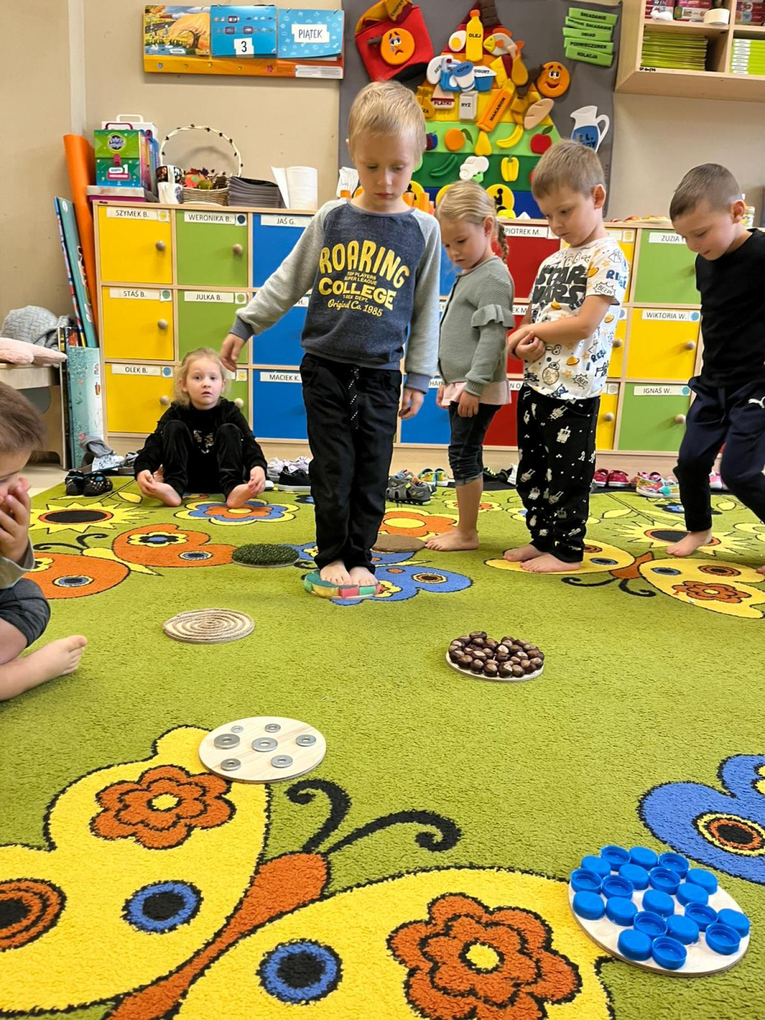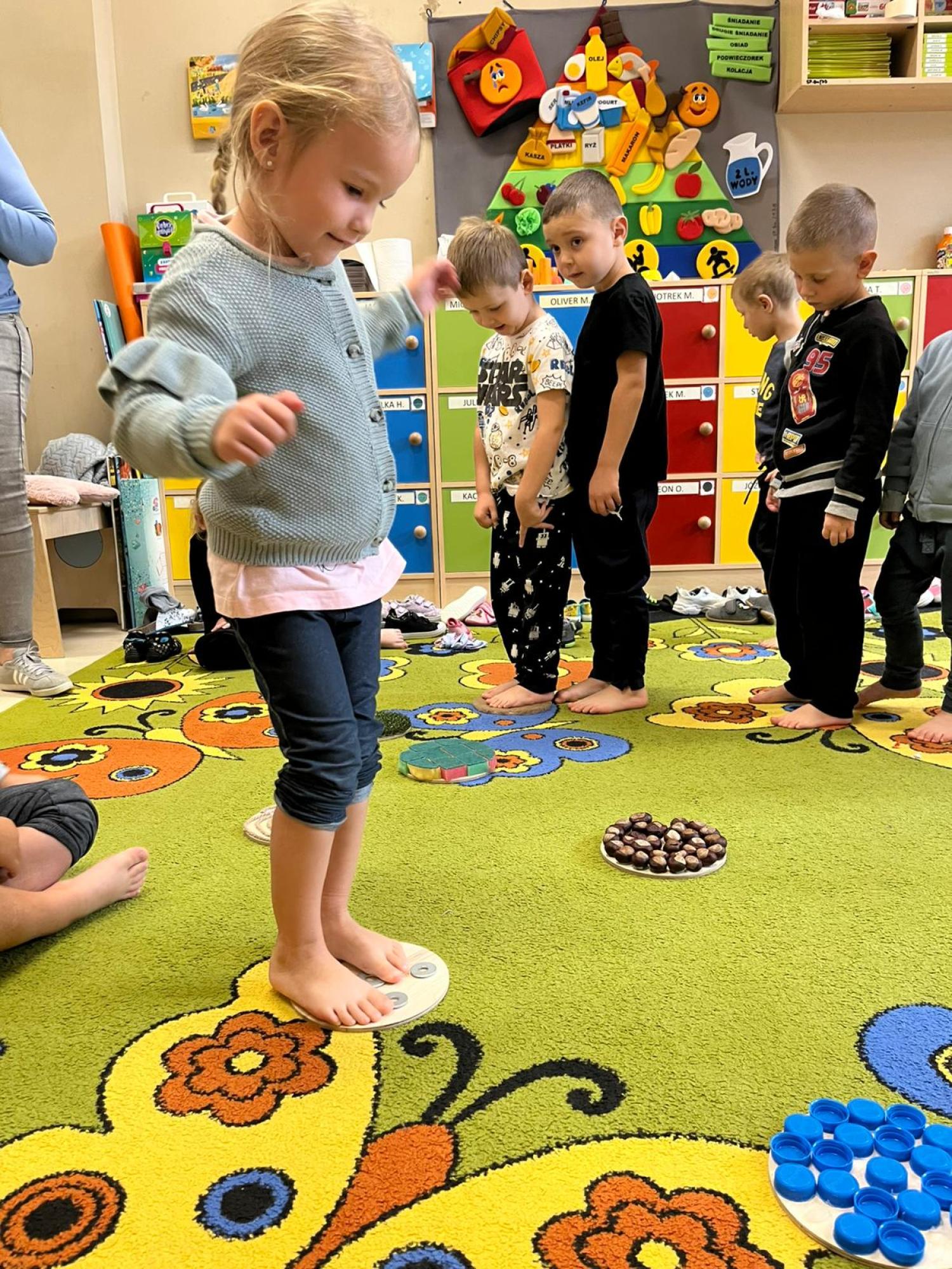 Na przedszkolaków czekała ścieżka sensoryczna, po której mogły przechodzić boso, odkrywając różne faktury – miękkie i szorstkie, chłodne i ciepłe. Dzieci uczestniczyły również w zabawie z piłkami. Każdy krok był nowym doświadczeniem, które nie tylko dostarczało radości, ale też wspierało rozwój równowagi i koordynacji.