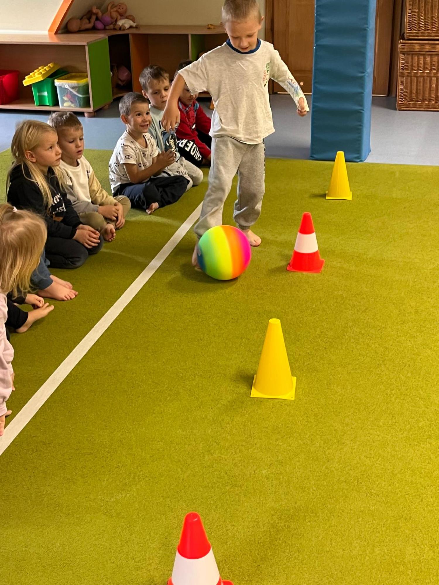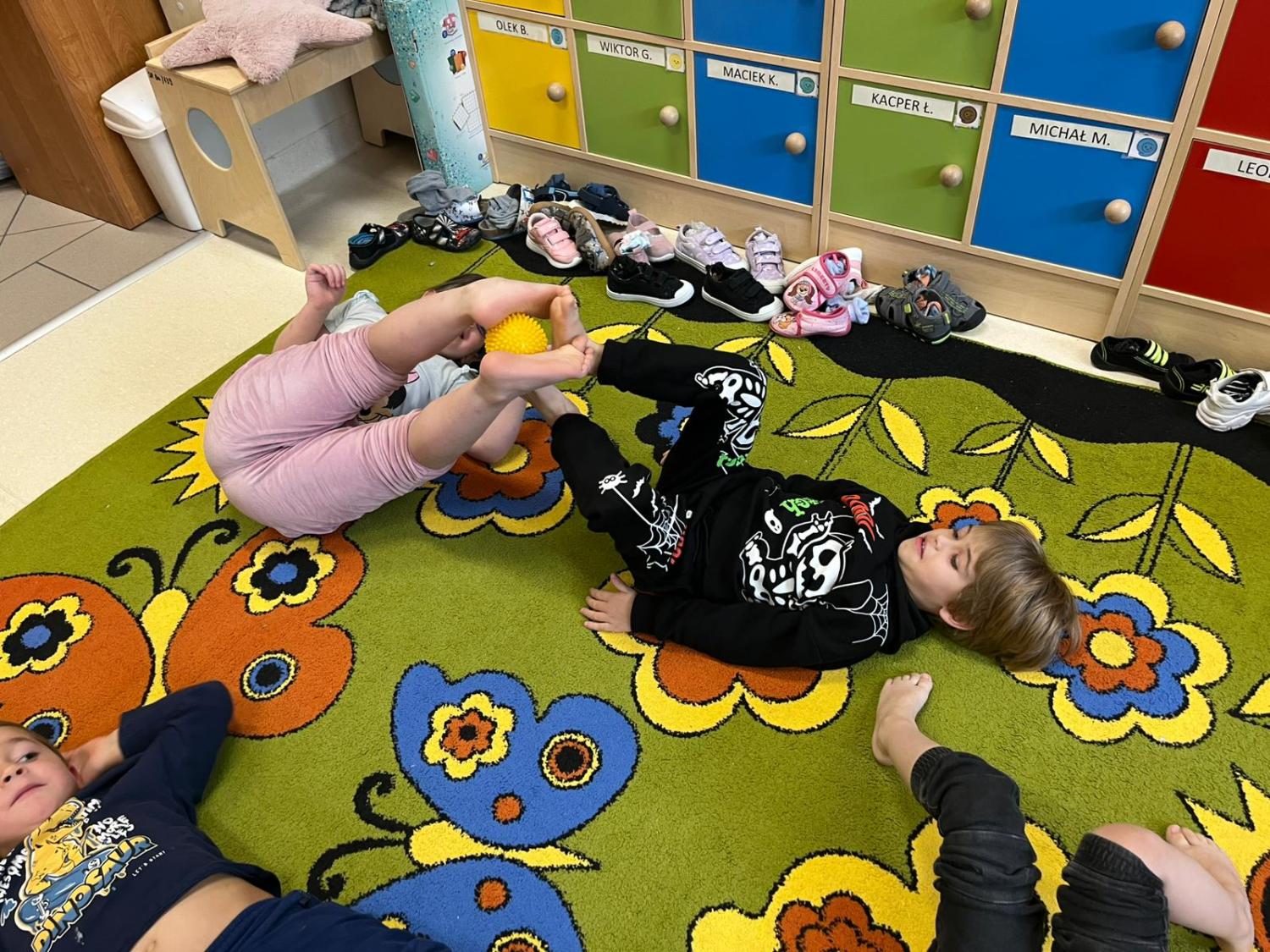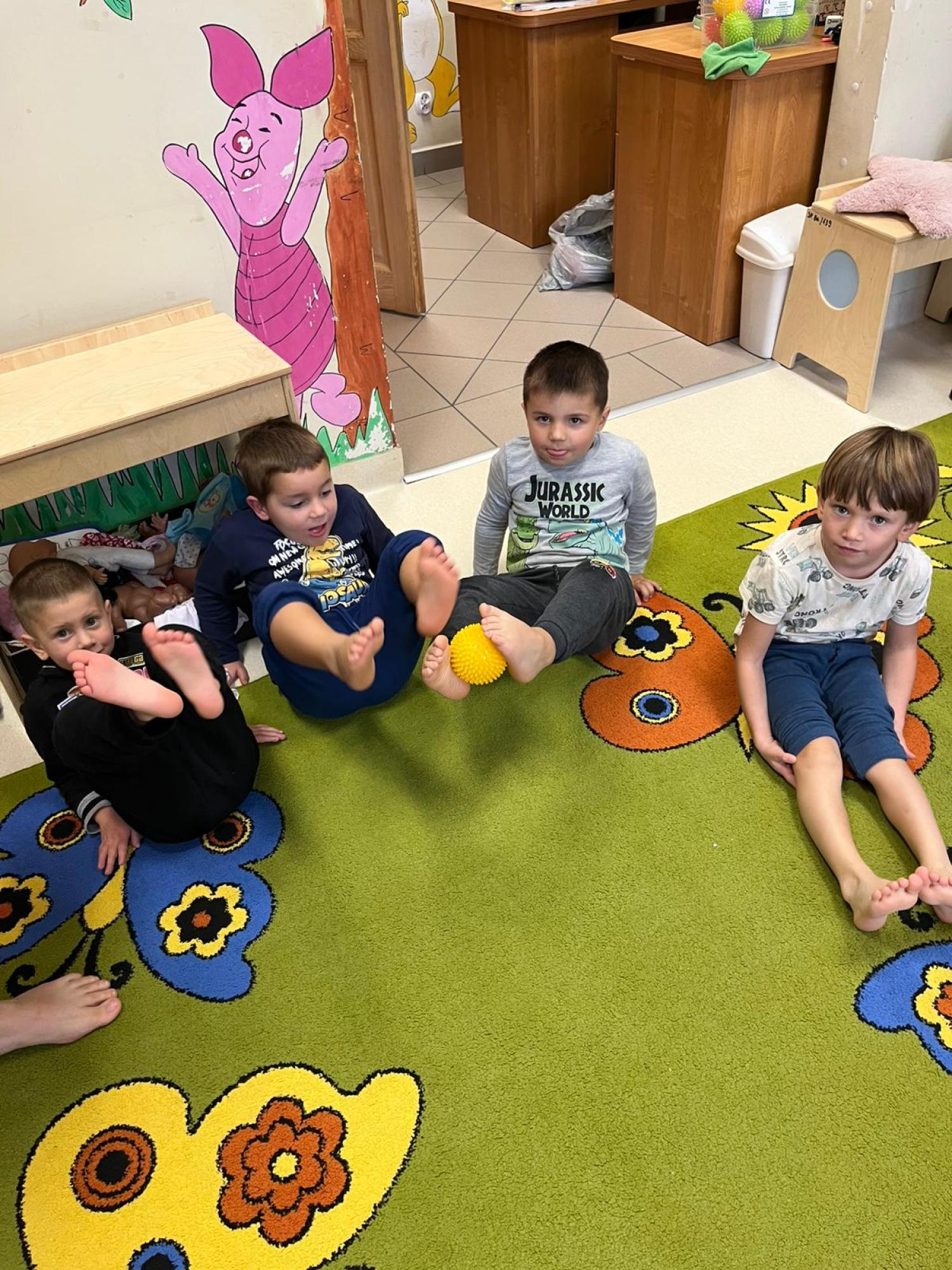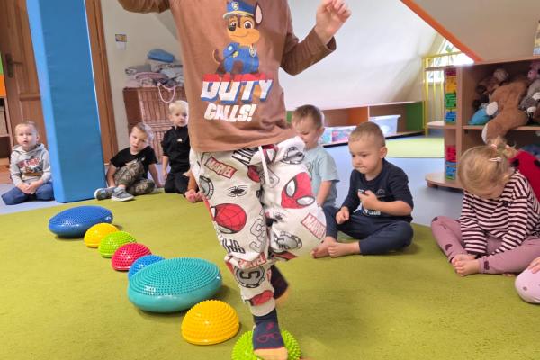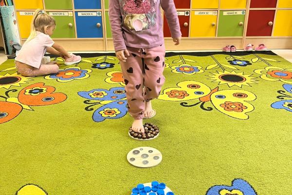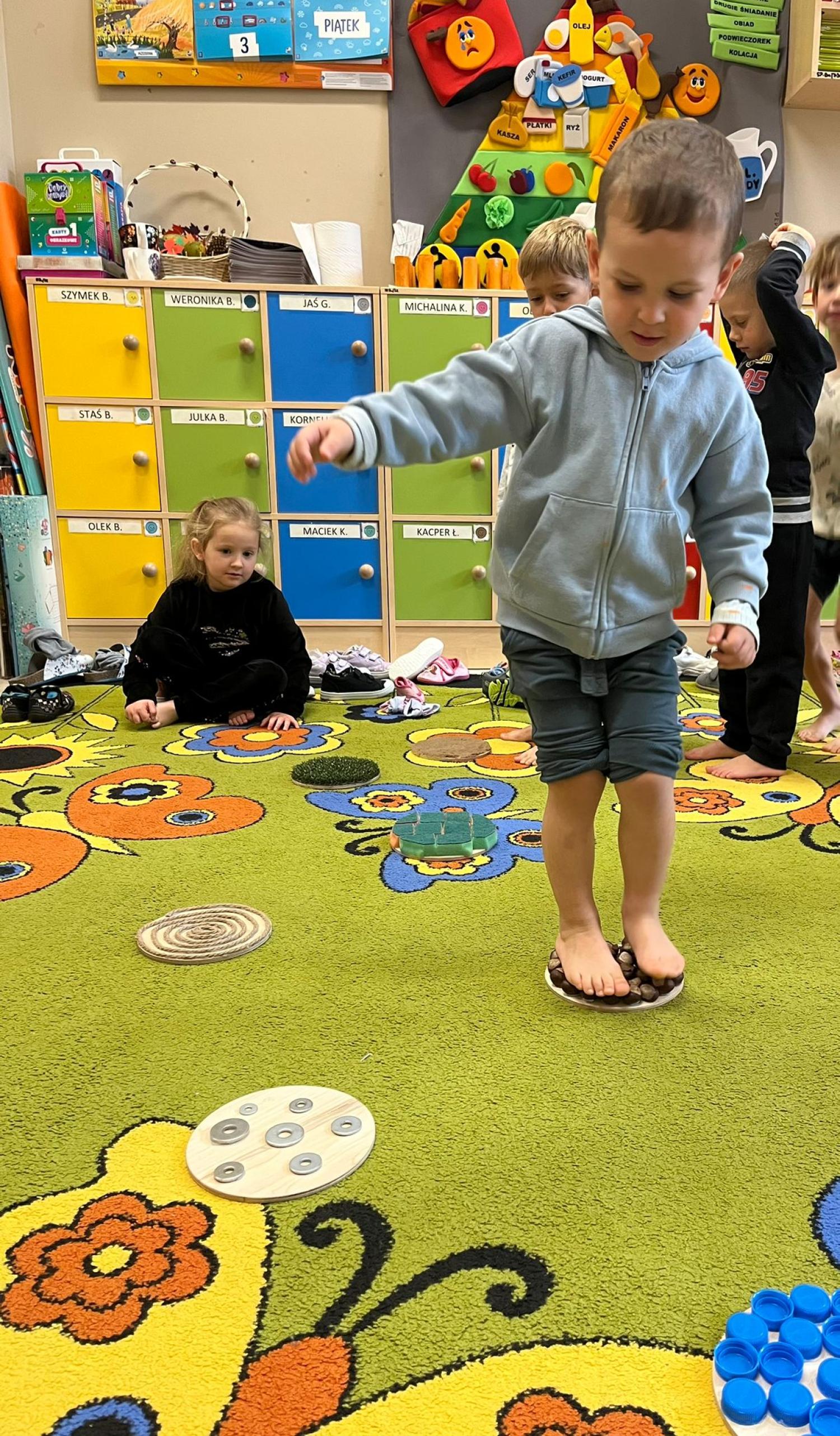 Na przedszkolaków czekała ścieżka sensoryczna, po której mogły przechodzić boso, odkrywając różne faktury – miękkie i szorstkie, chłodne i ciepłe. Dzieci uczestniczyły również w zabawie z piłkami. Każdy krok był nowym doświadczeniem, które nie tylko dostarczało radości, ale też wspierało rozwój równowagi i koordynacji.