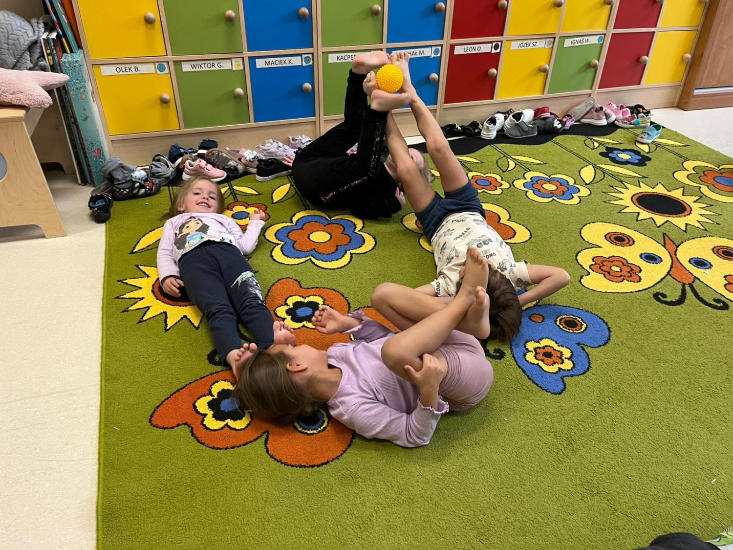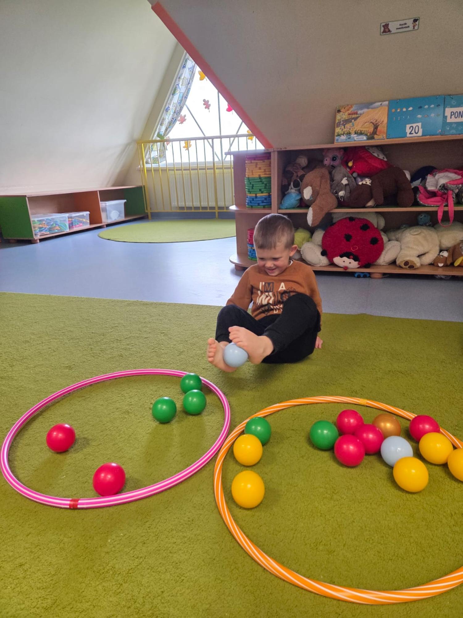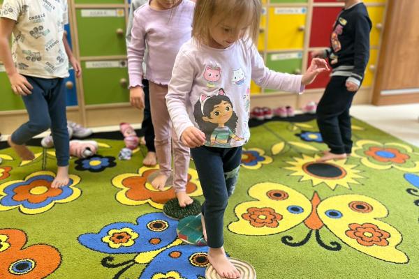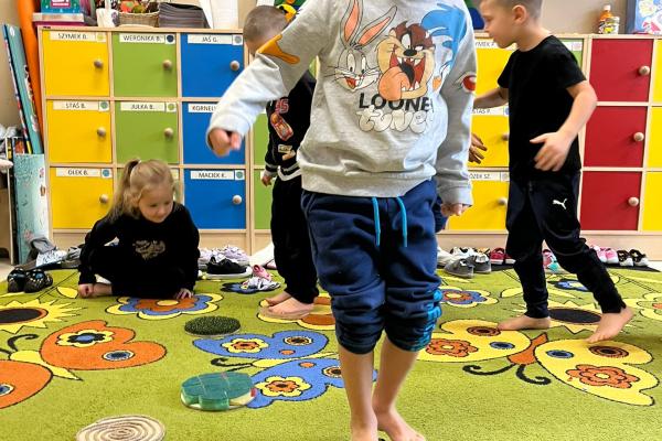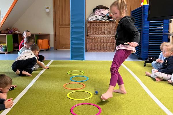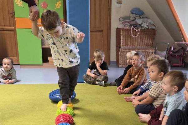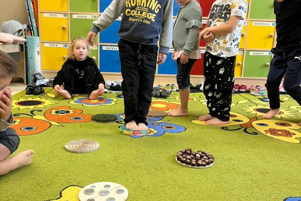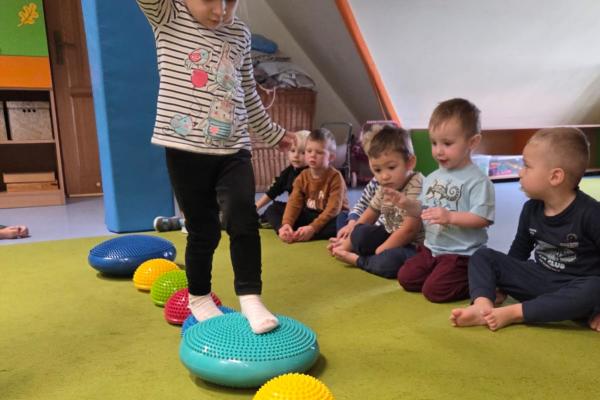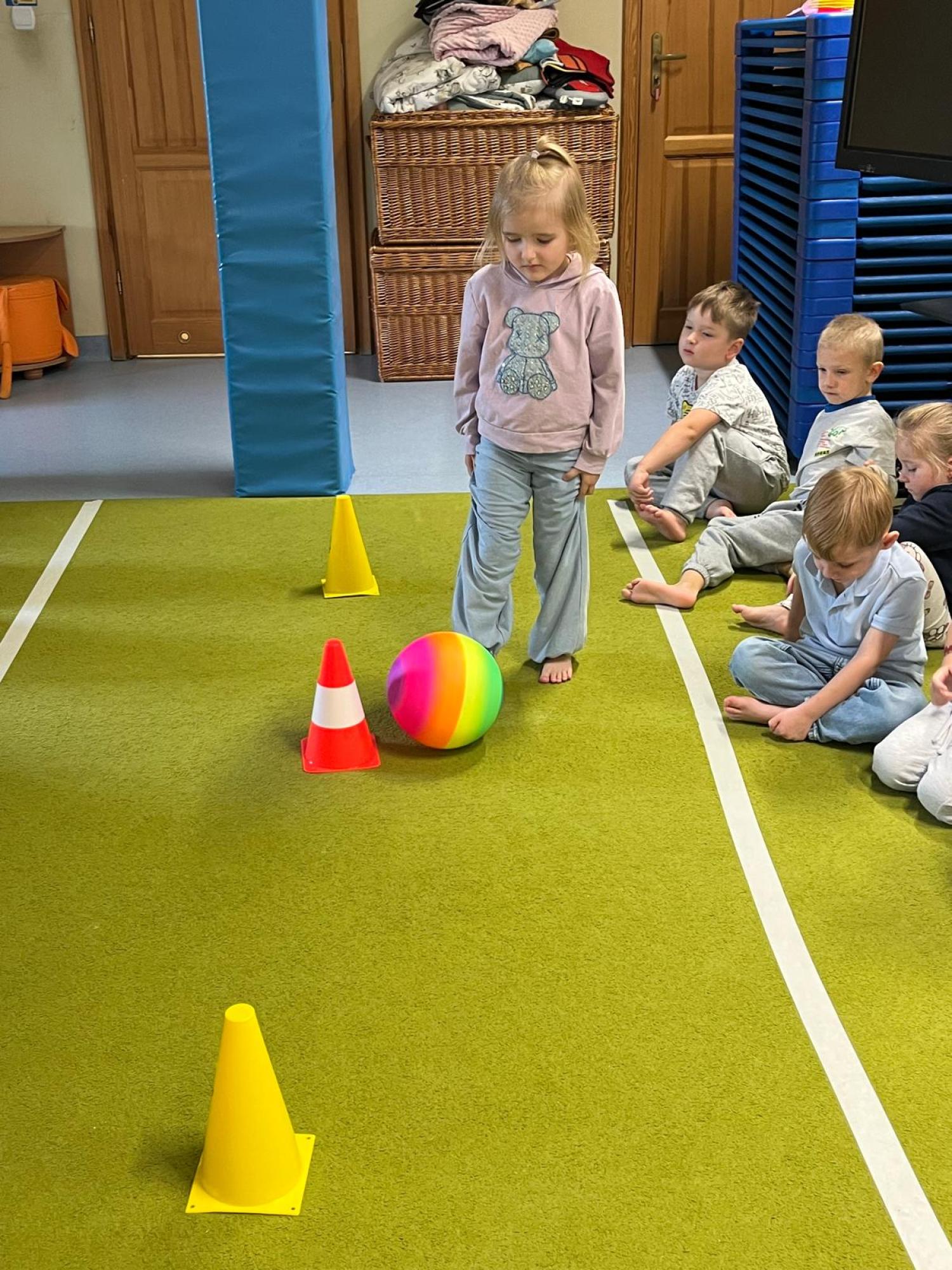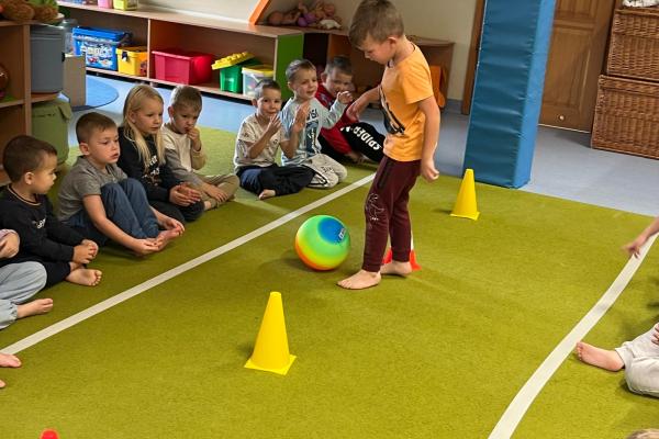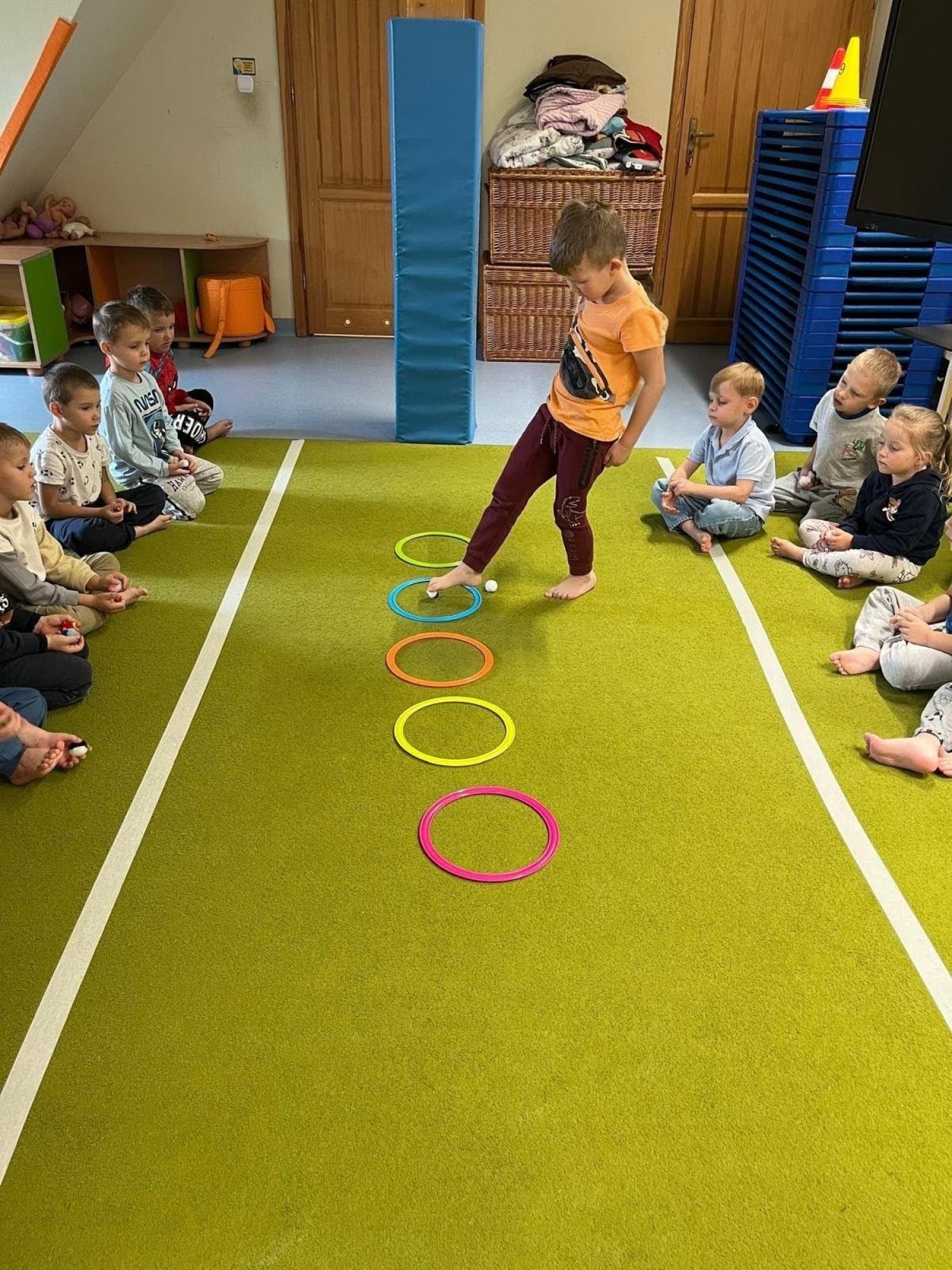 Na przedszkolaków czekała ścieżka sensoryczna, po której mogły przechodzić boso, odkrywając różne faktury – miękkie i szorstkie, chłodne i ciepłe. Dzieci uczestniczyły również w zabawie z piłkami. Każdy krok był nowym doświadczeniem, które nie tylko dostarczało radości, ale też wspierało rozwój równowagi i koordynacji.