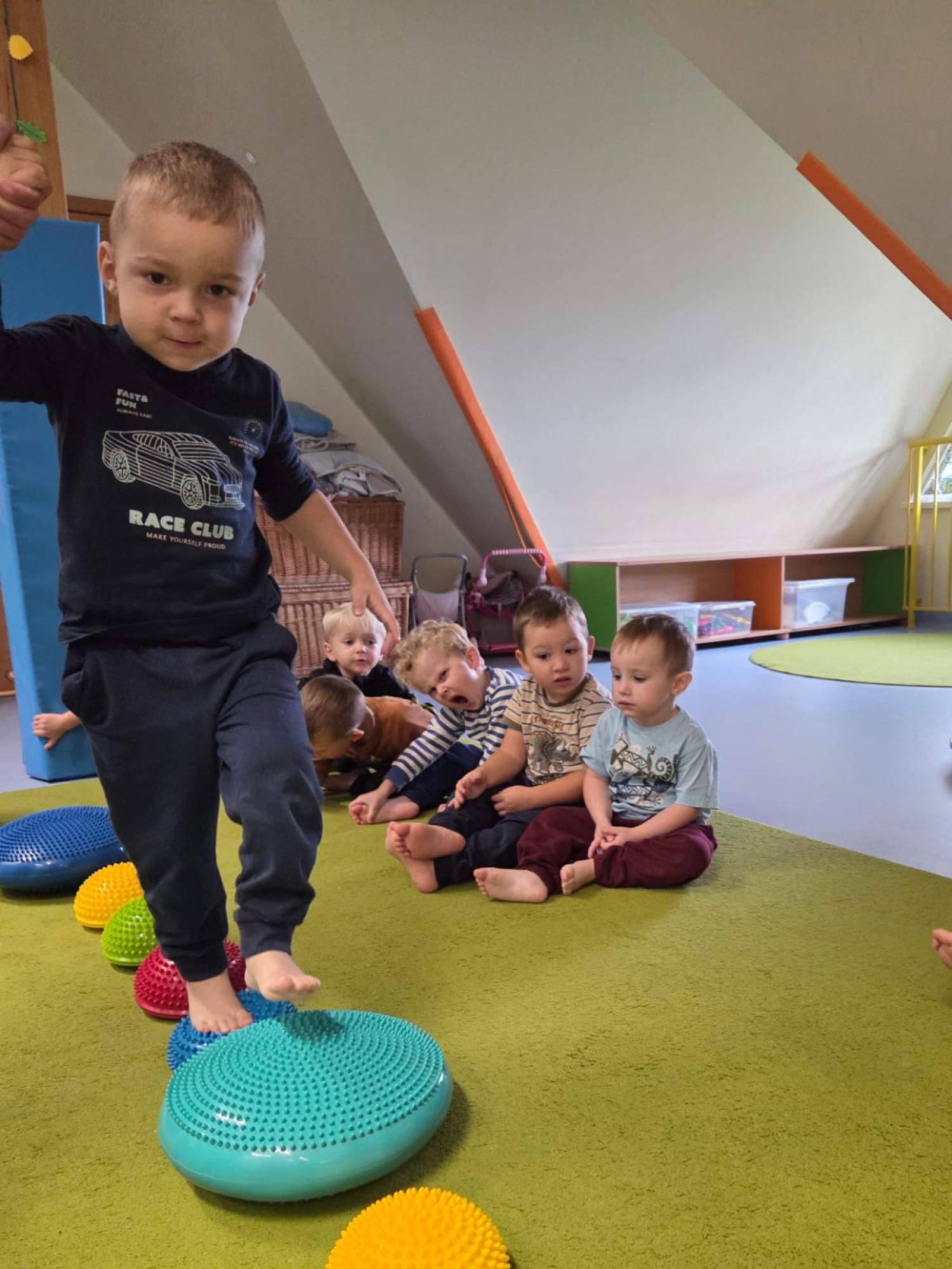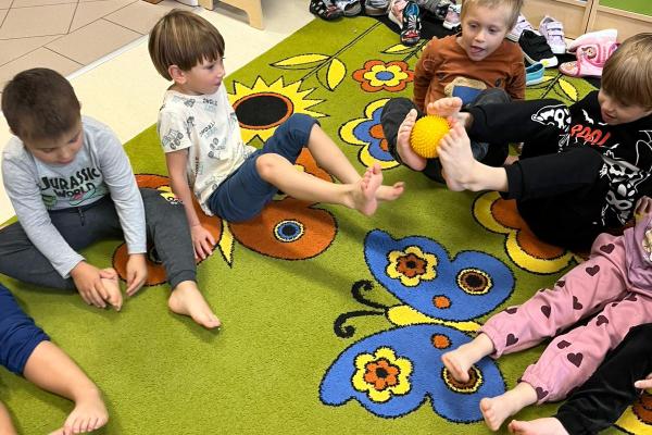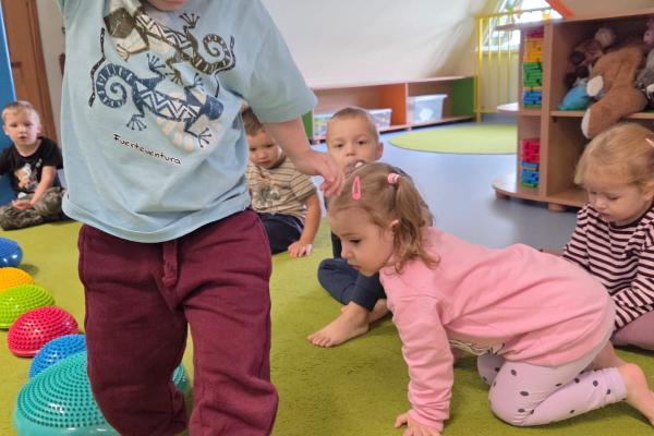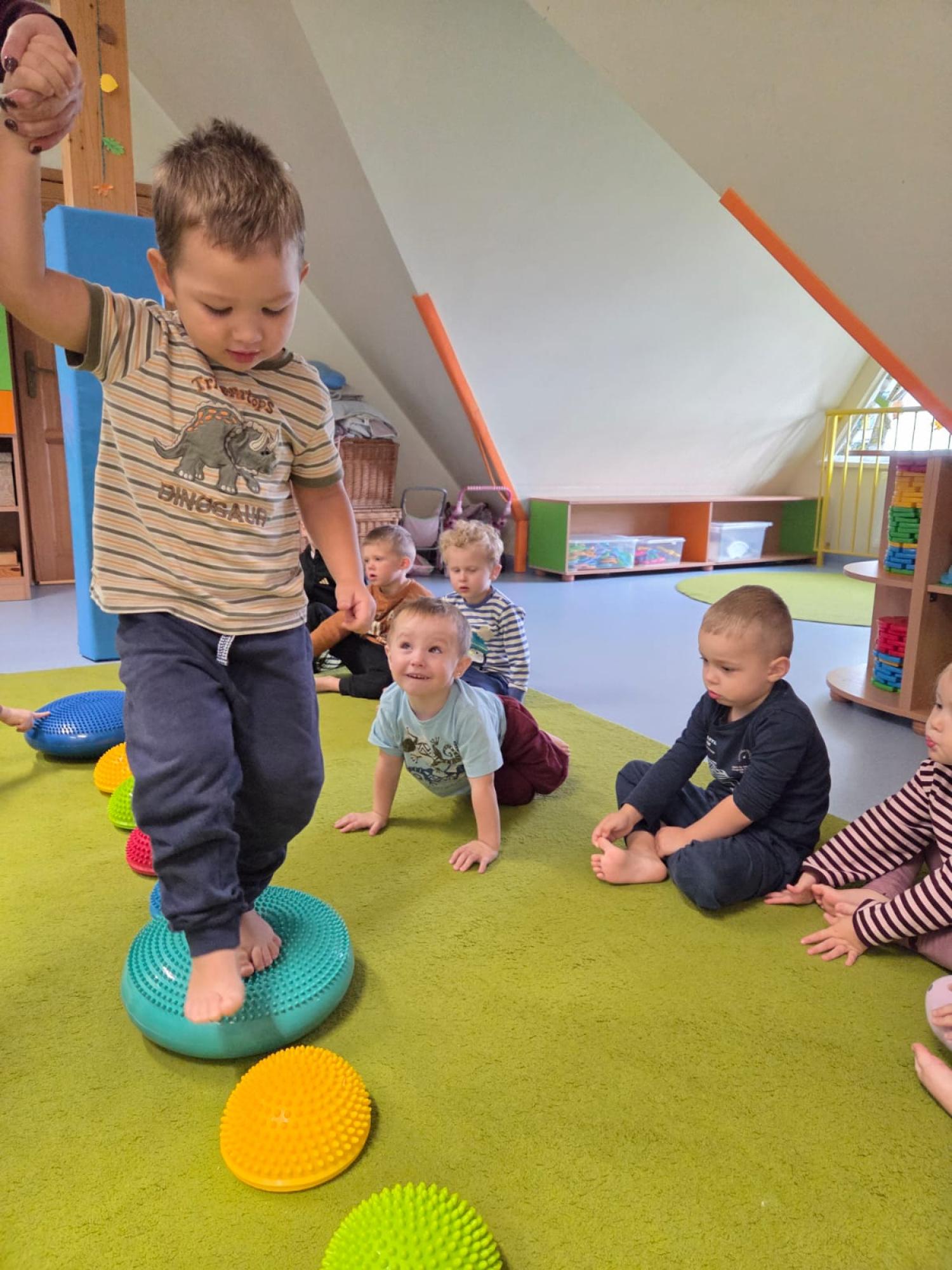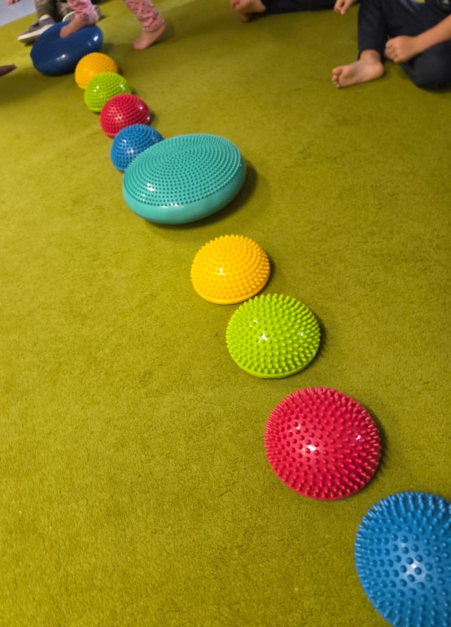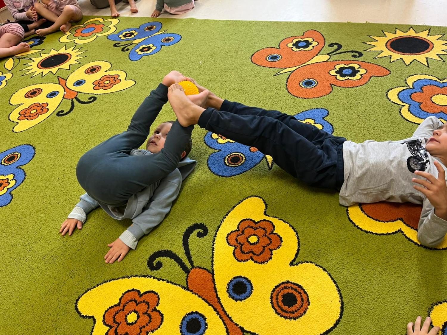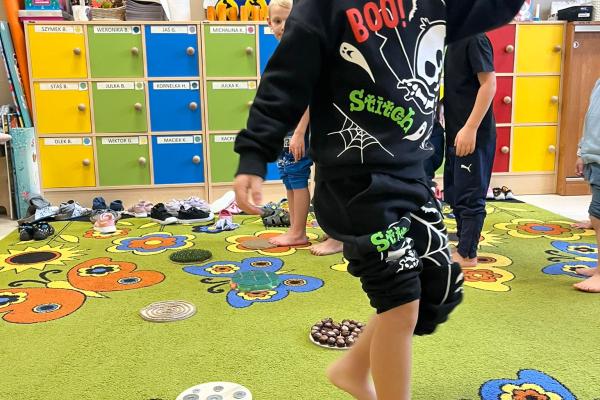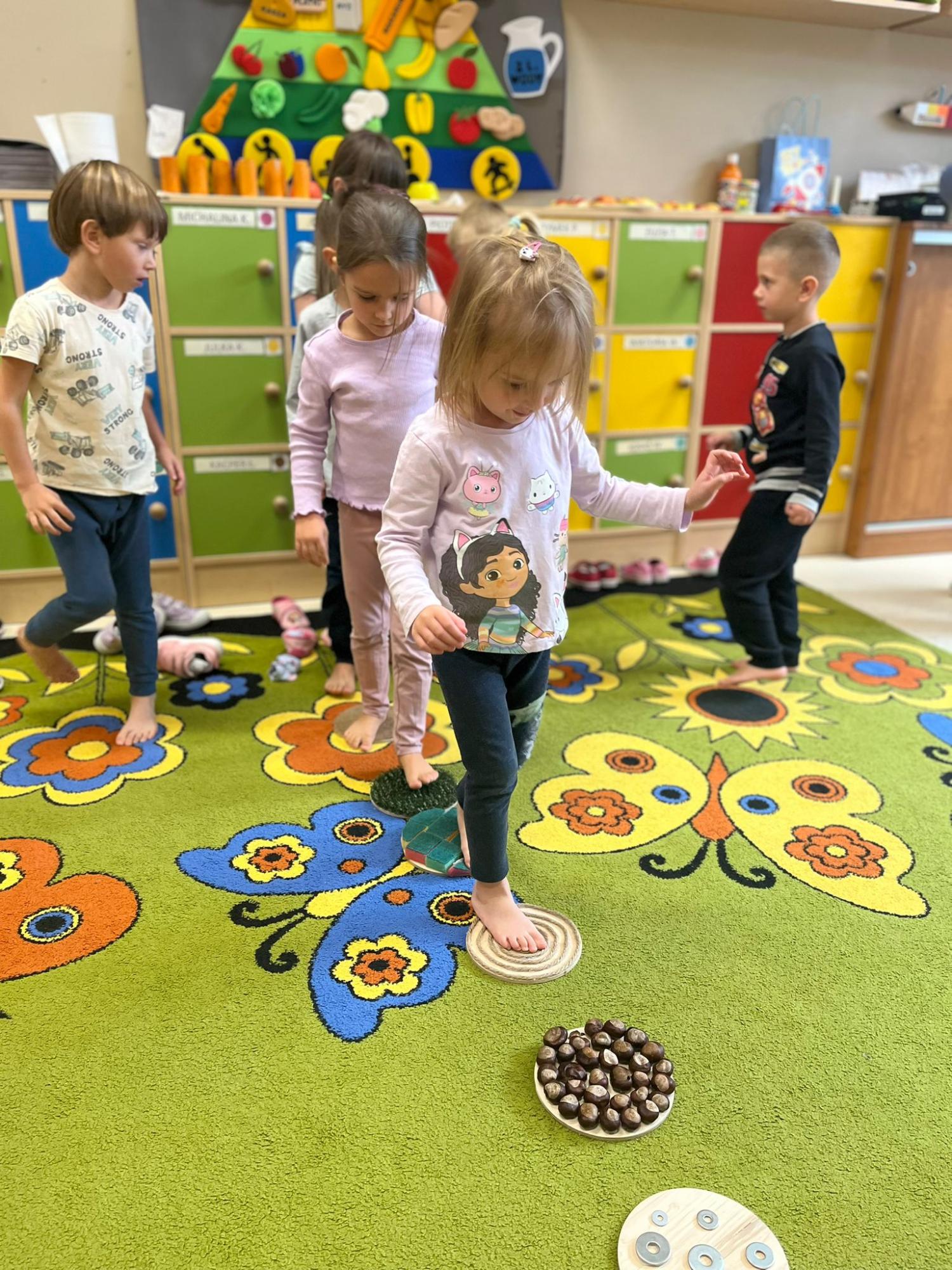 Na przedszkolaków czekała ścieżka sensoryczna, po której mogły przechodzić boso, odkrywając różne faktury – miękkie i szorstkie, chłodne i ciepłe. Dzieci uczestniczyły również w zabawie z piłkami. Każdy krok był nowym doświadczeniem, które nie tylko dostarczało radości, ale też wspierało rozwój równowagi i koordynacji.
