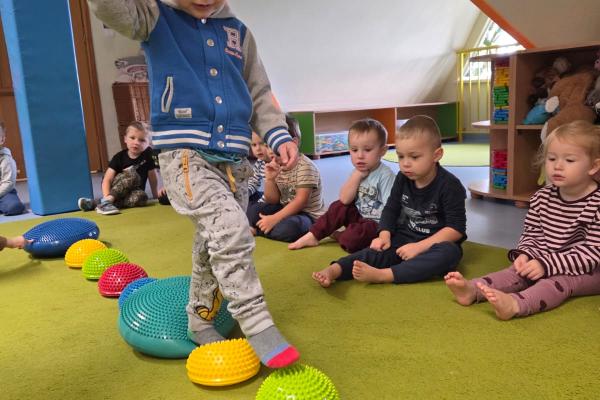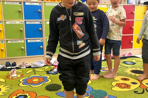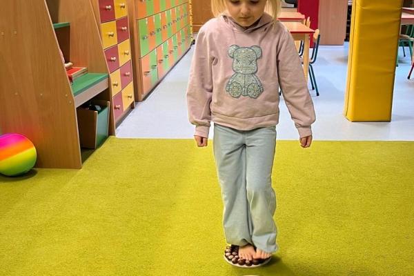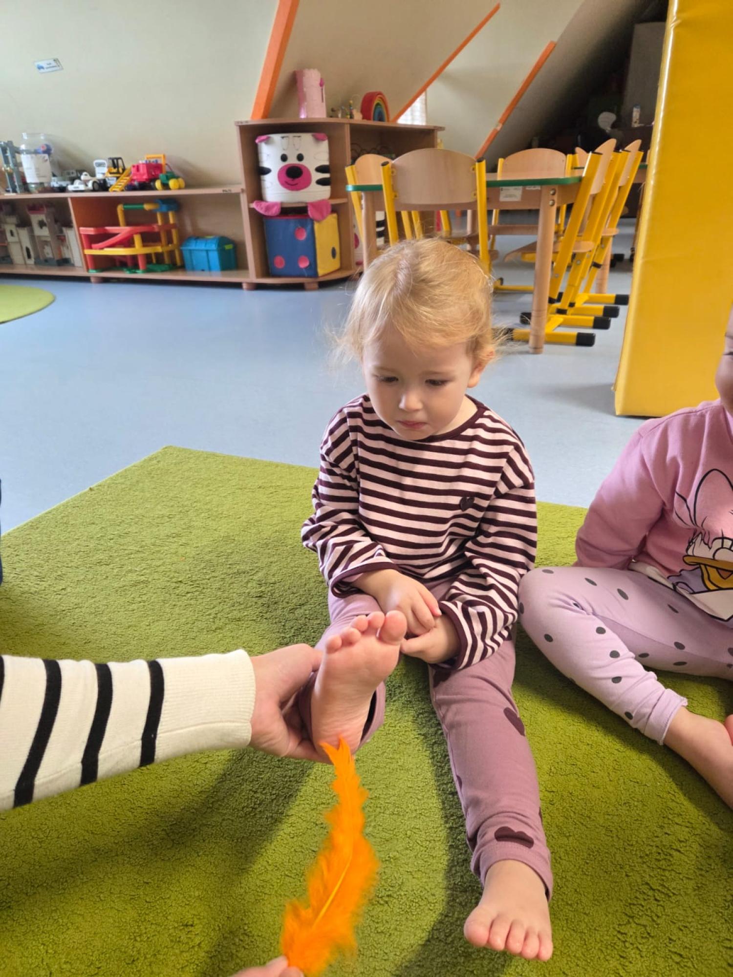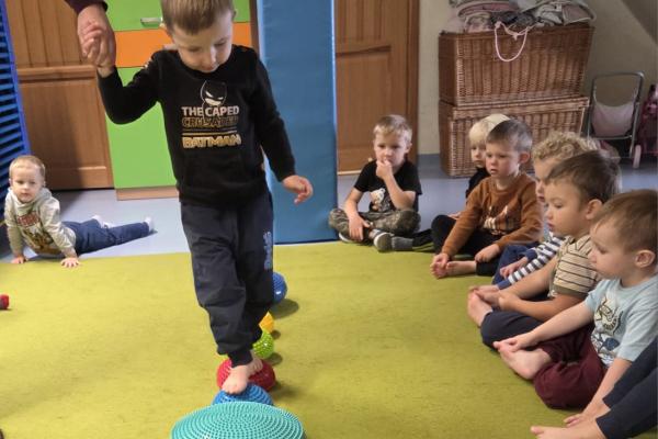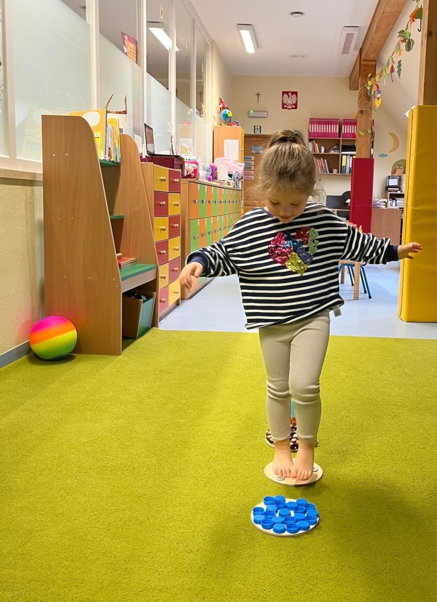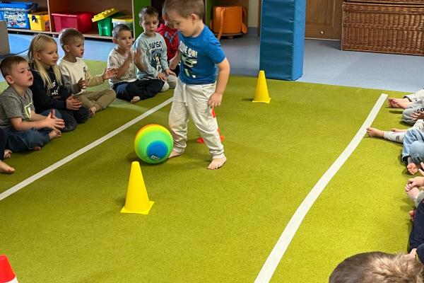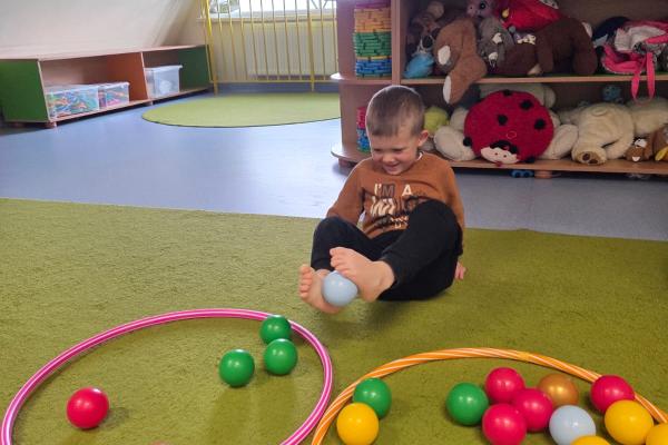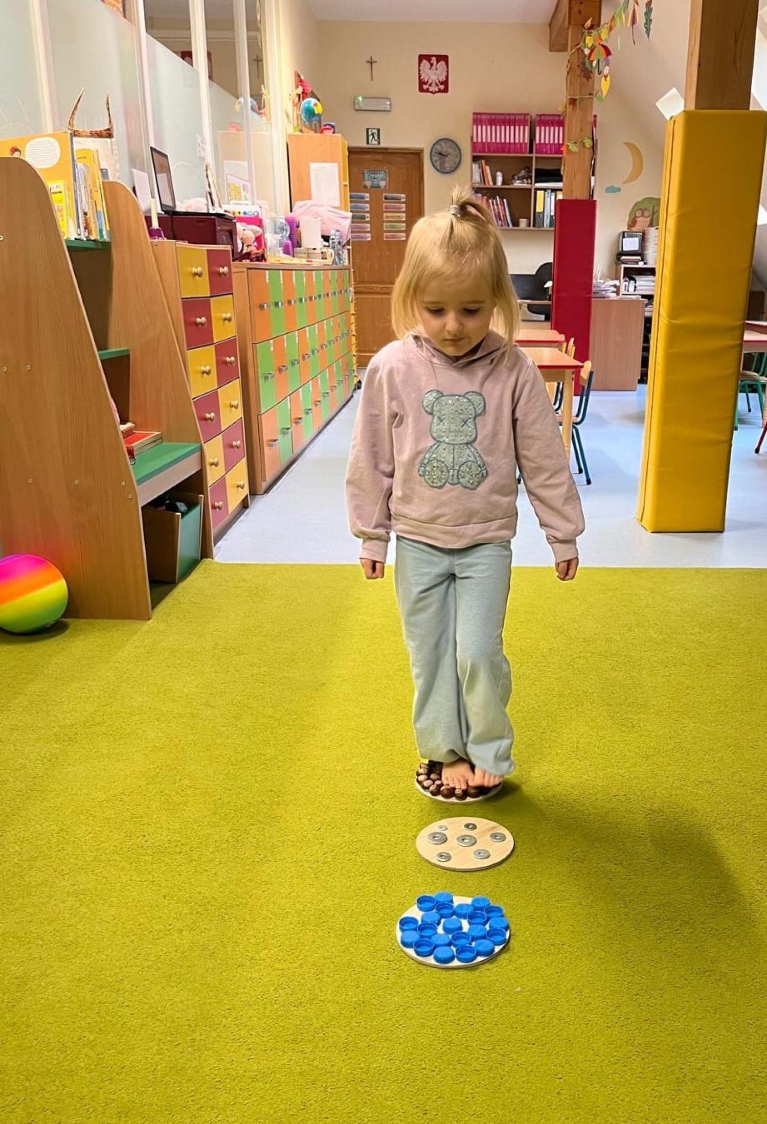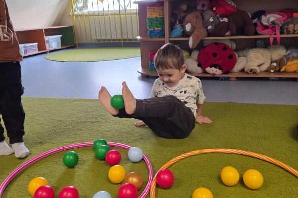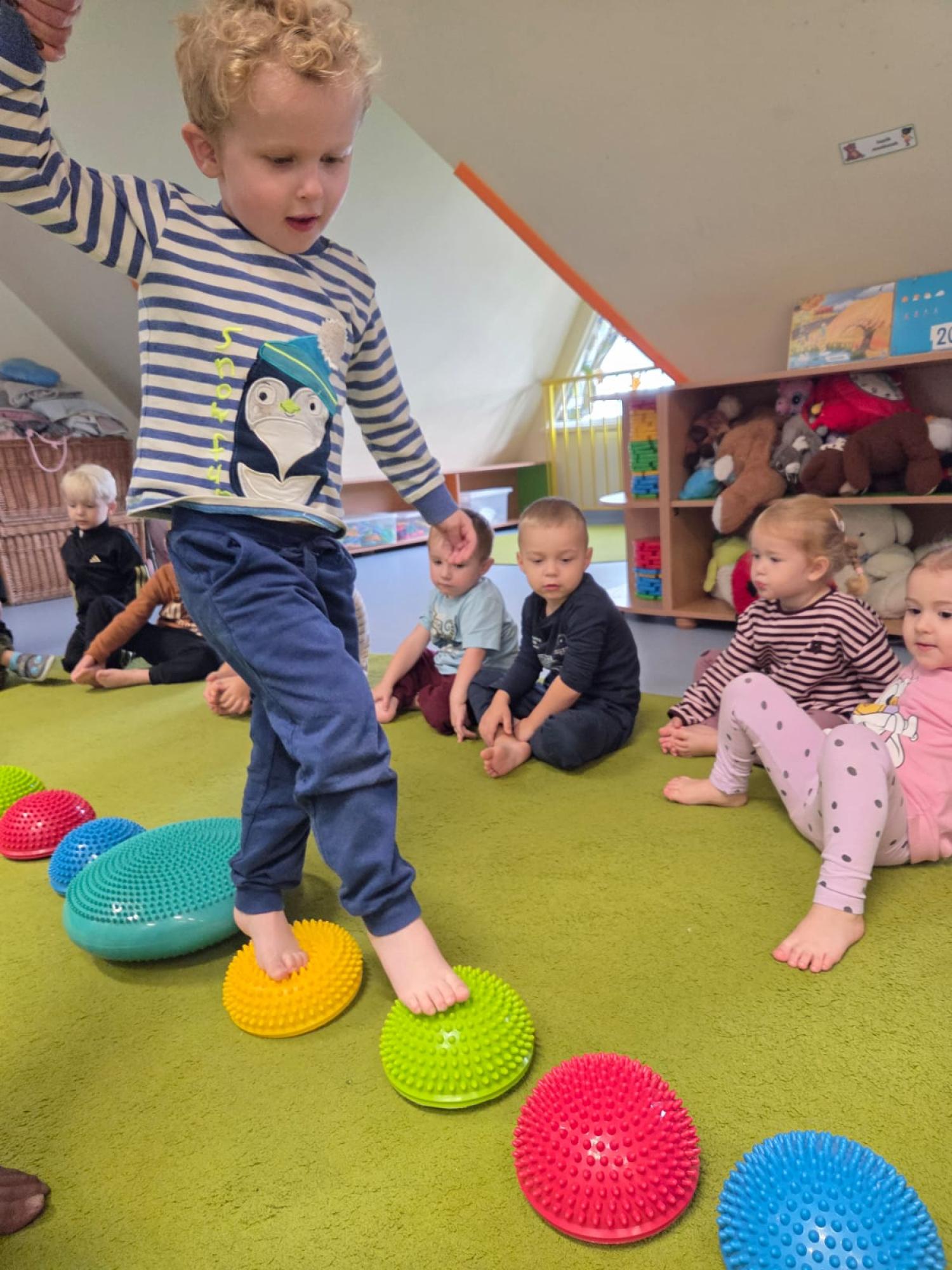 Na przedszkolaków czekała ścieżka sensoryczna, po której mogły przechodzić boso, odkrywając różne faktury – miękkie i szorstkie, chłodne i ciepłe. Dzieci uczestniczyły również w zabawie z piłkami. Każdy krok był nowym doświadczeniem, które nie tylko dostarczało radości, ale też wspierało rozwój równowagi i koordynacji.