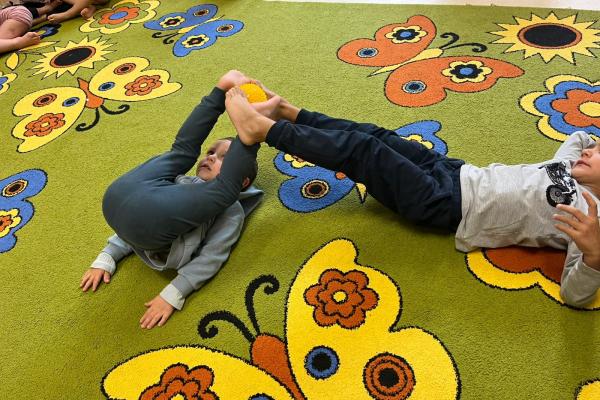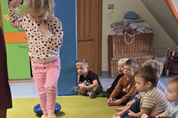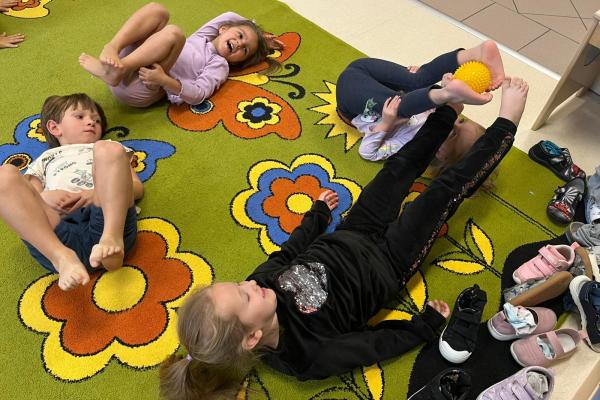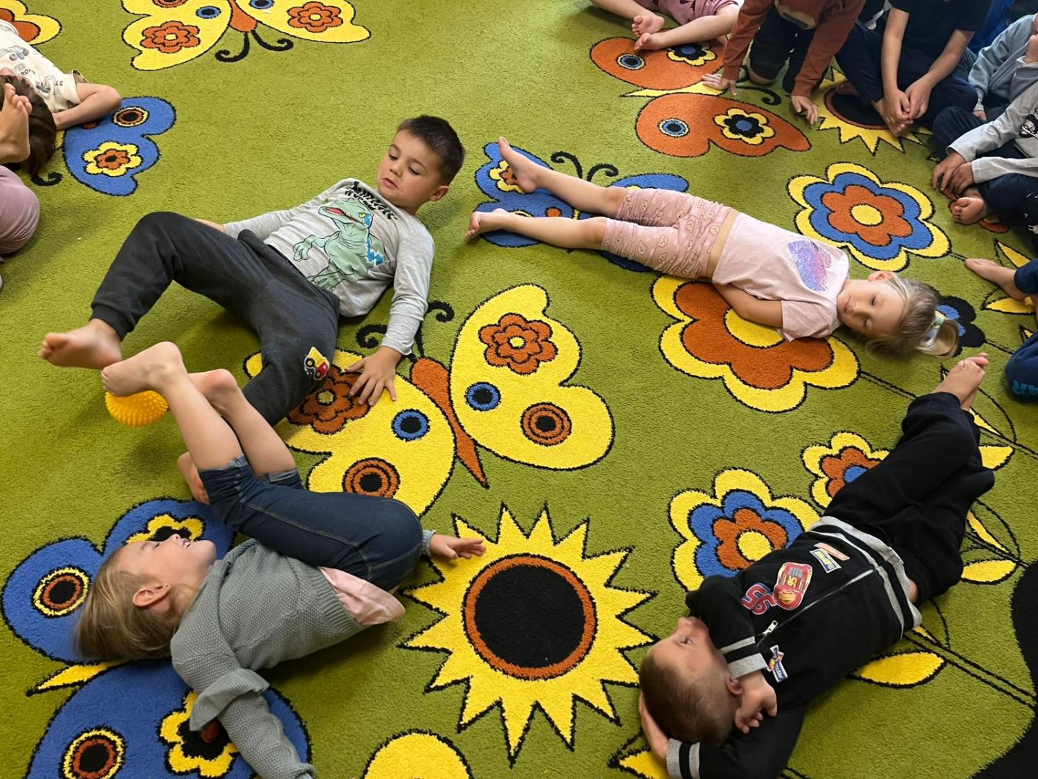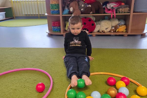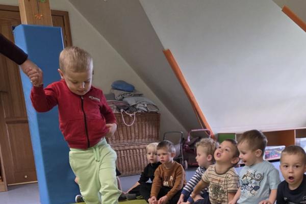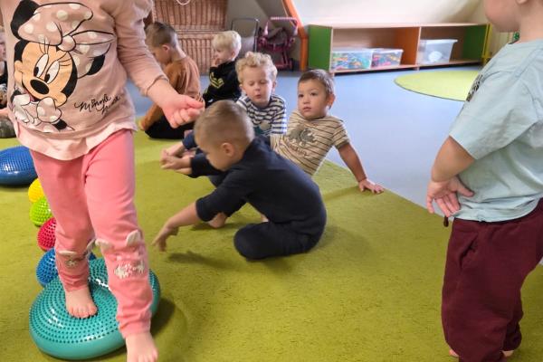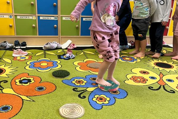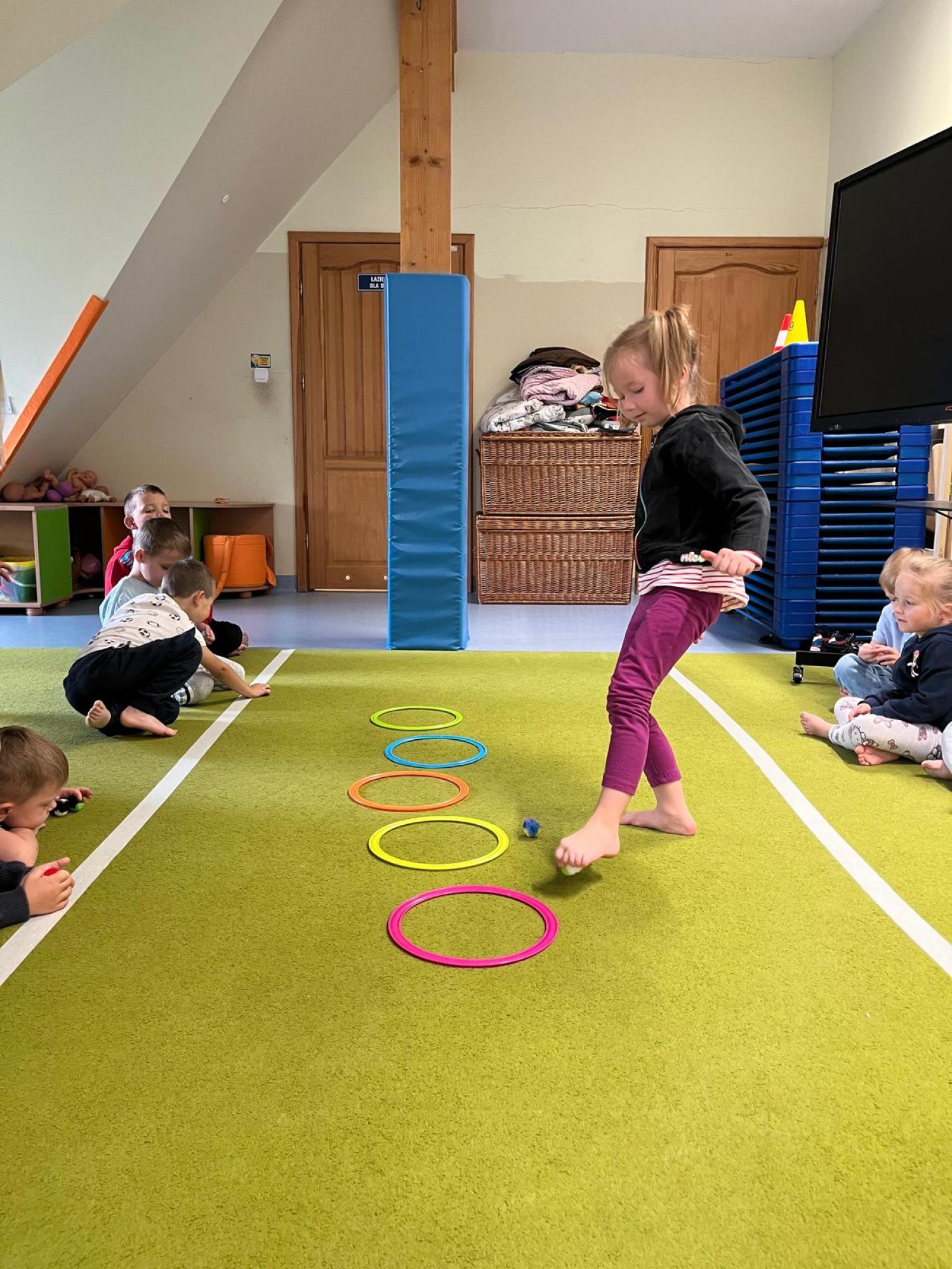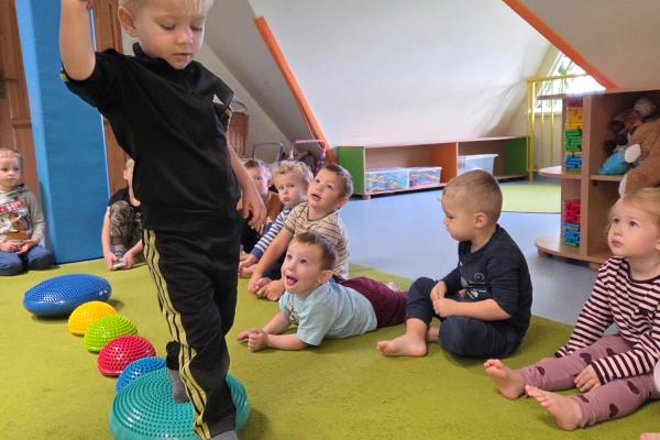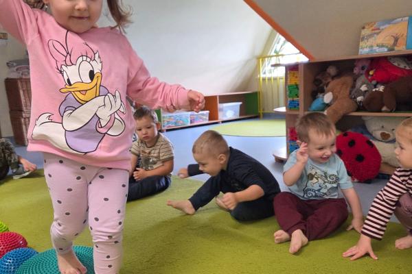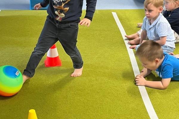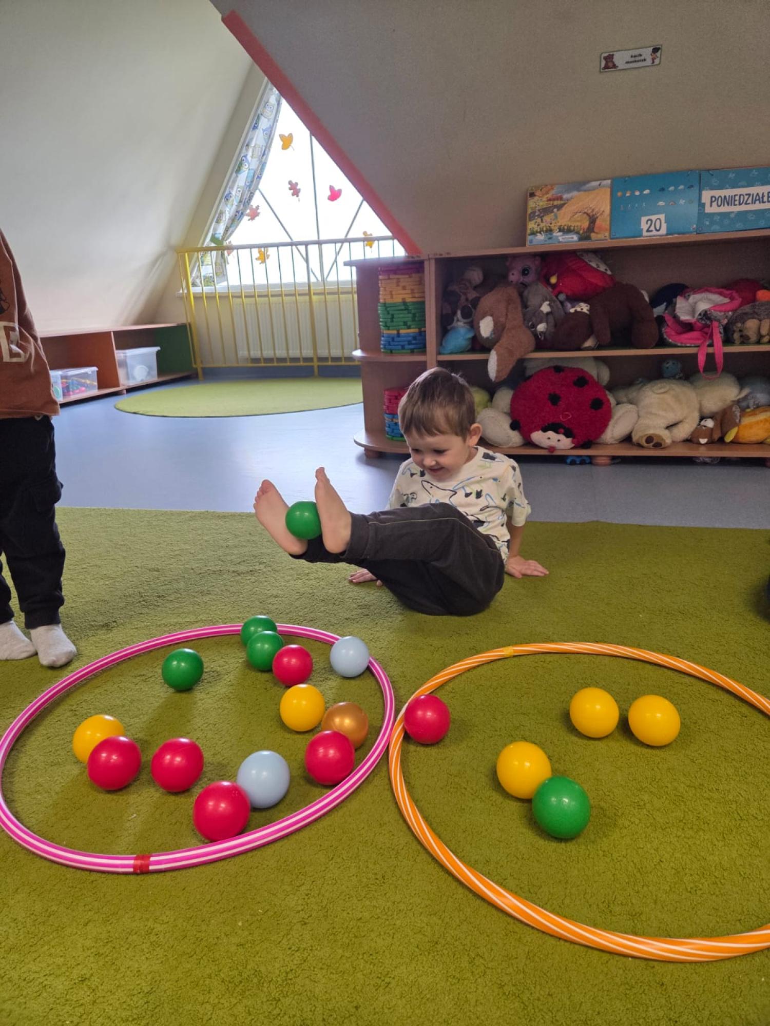Na przedszkolaków czekała ścieżka sensoryczna, po której mogły przechodzić boso, odkrywając różne faktury – miękkie i szorstkie, chłodne i ciepłe. Dzieci uczestniczyły również w zabawie z piłkami. Każdy krok był nowym doświadczeniem, które nie tylko dostarczało radości, ale też wspierało rozwój równowagi i koordynacji.